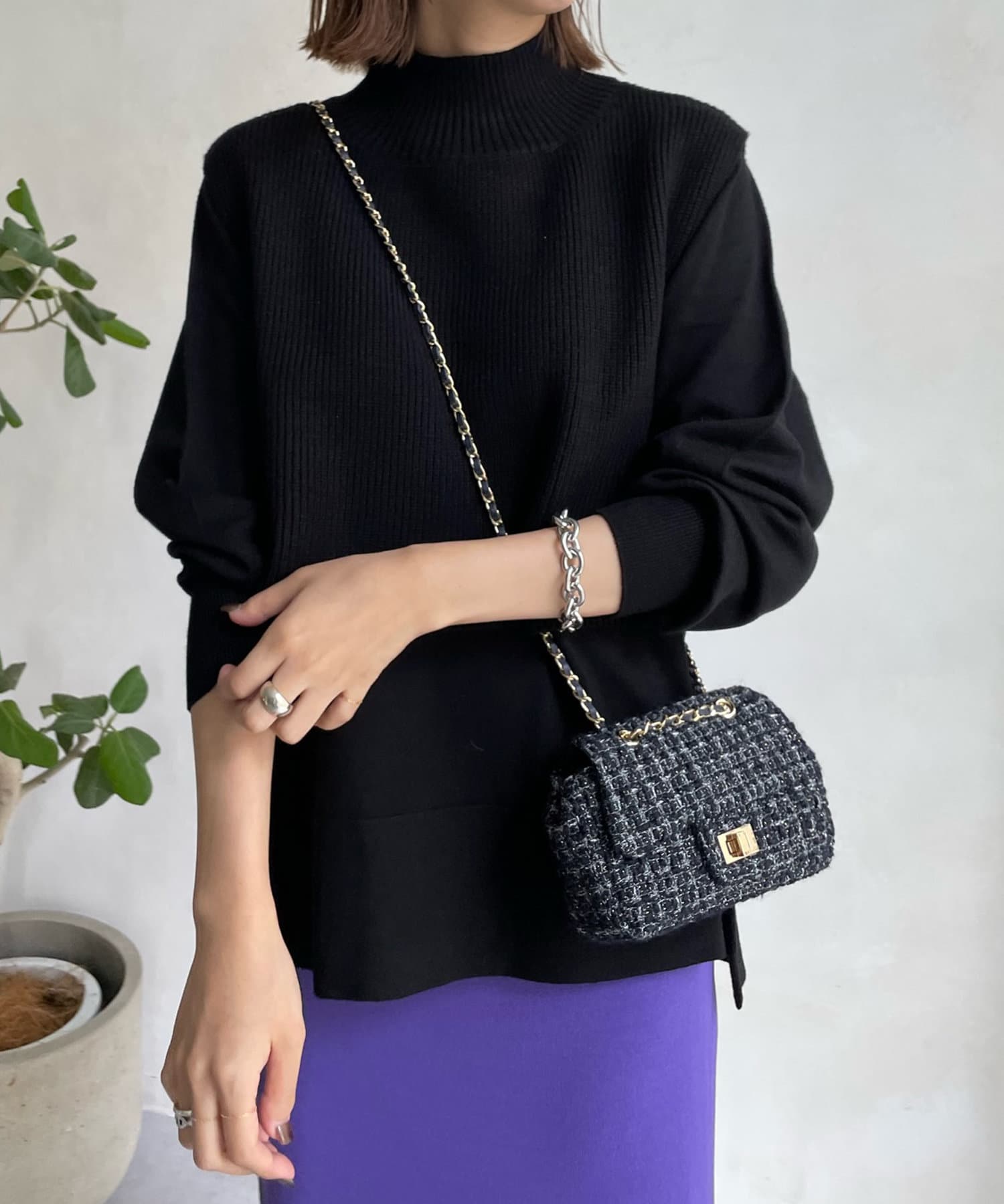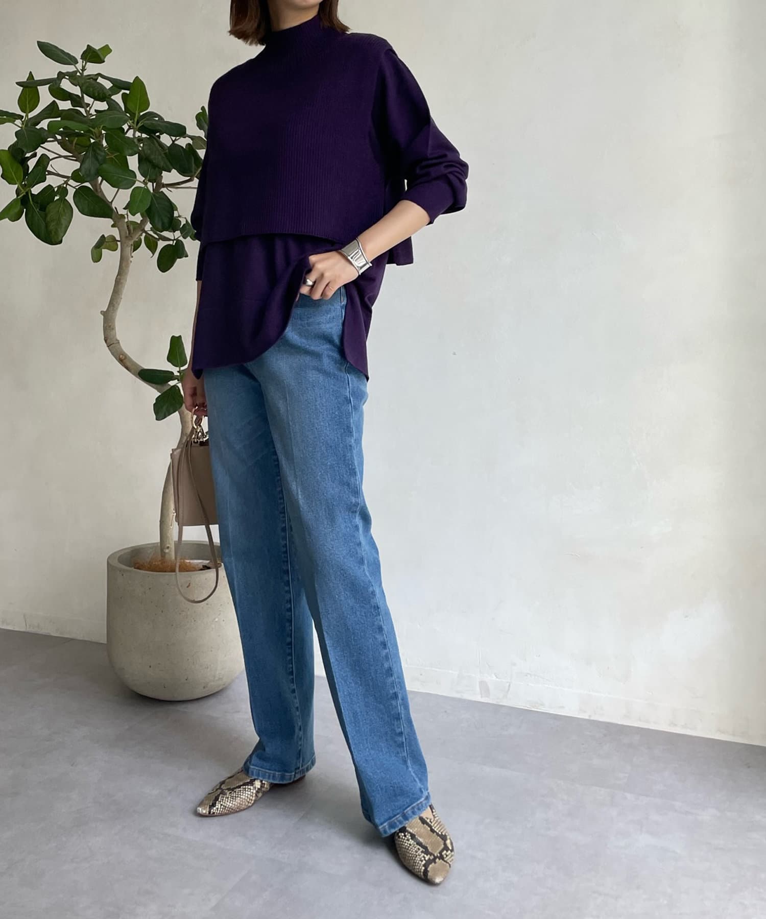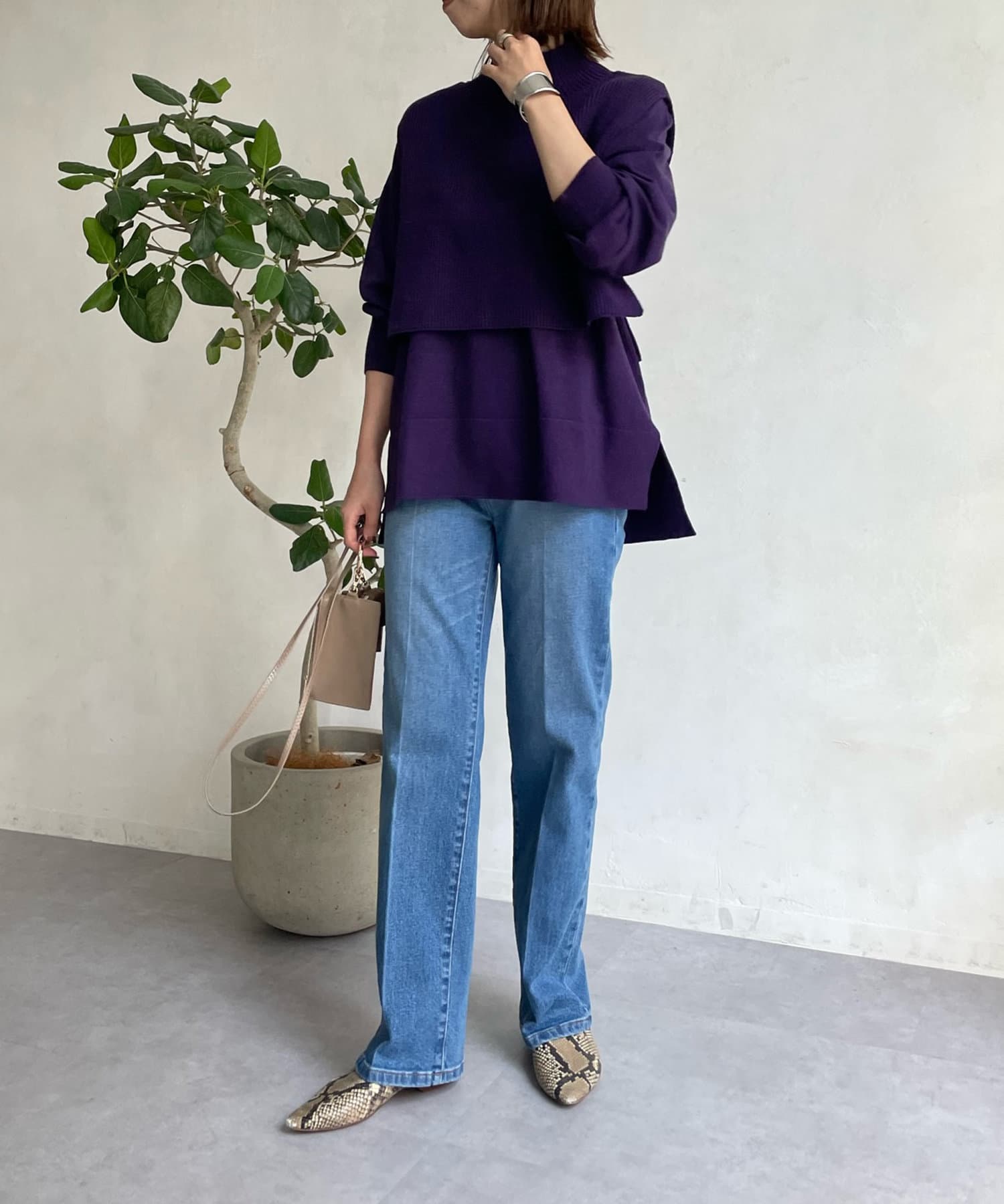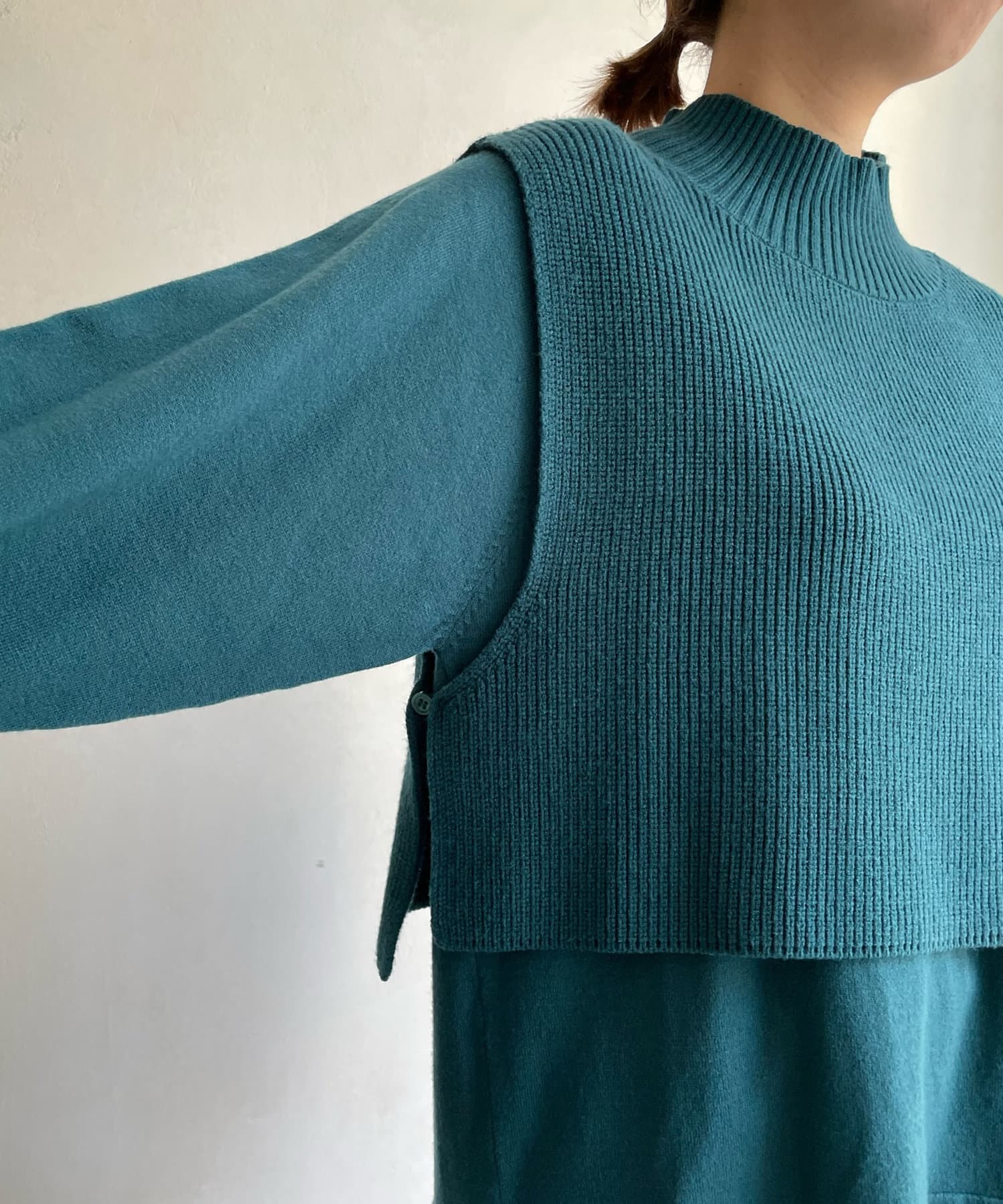 ハイゲージのシンプルニットに編地と長さの違うややハイネックのベストの組み合わせがとってもおしゃれ!