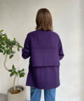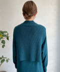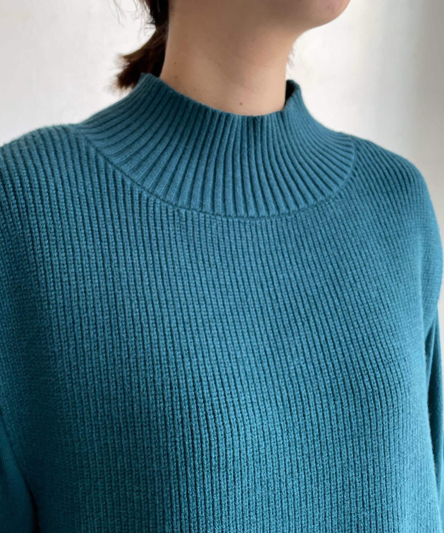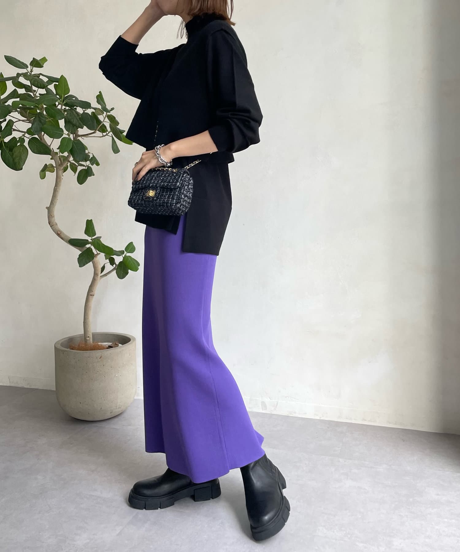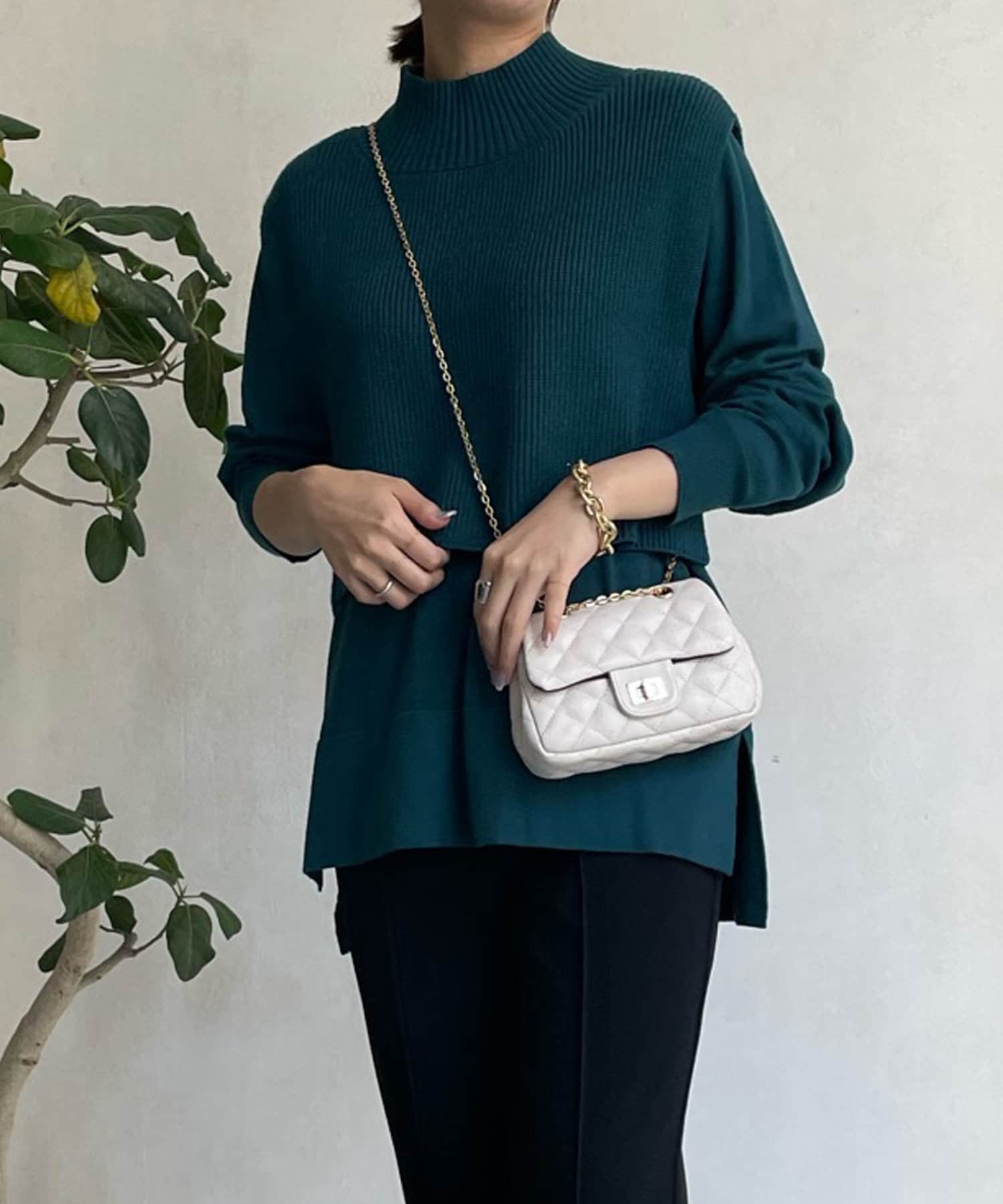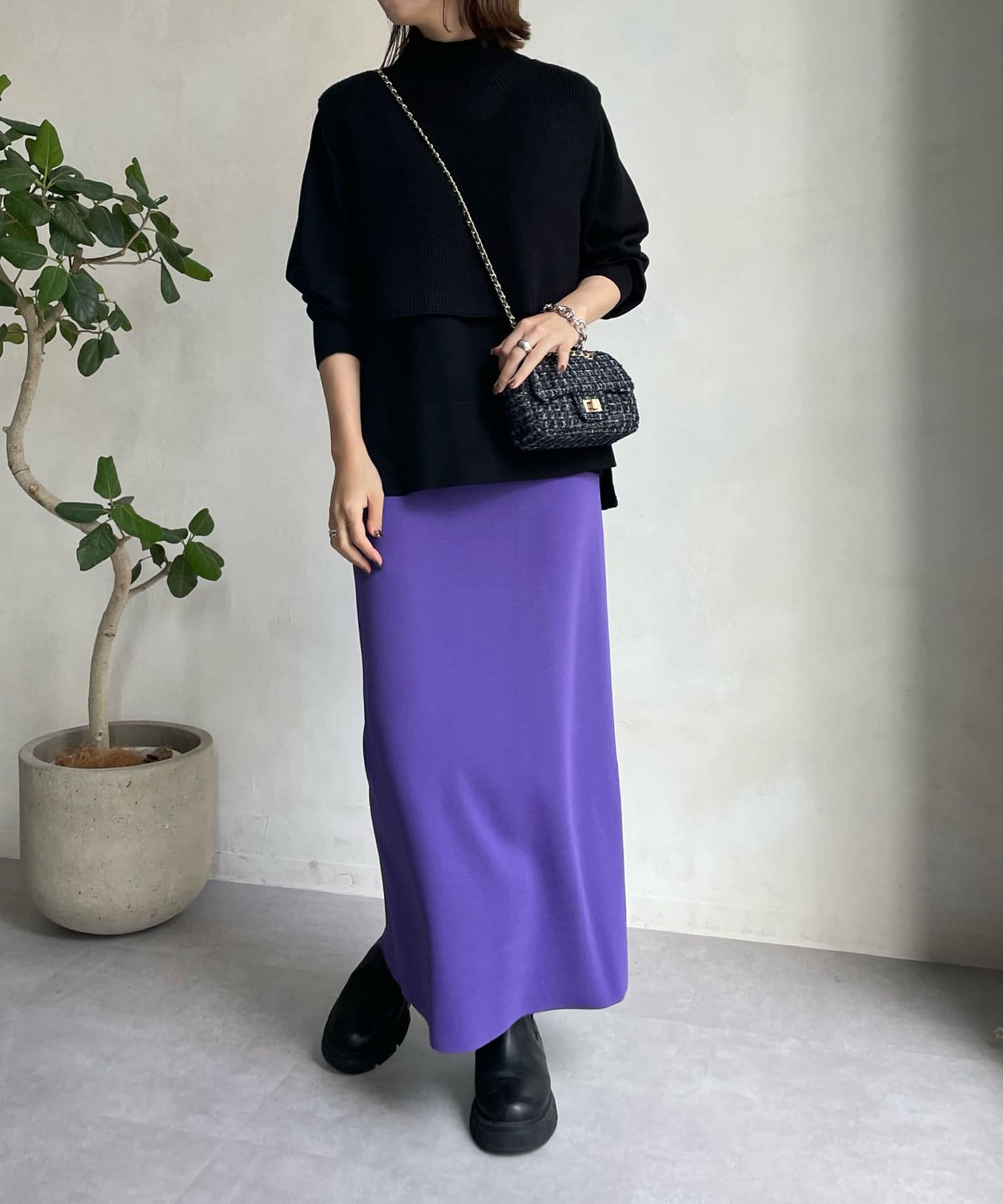 ハイゲージのシンプルニットに編地と長さの違うややハイネックのベストの組み合わせがとってもおしゃれ!
