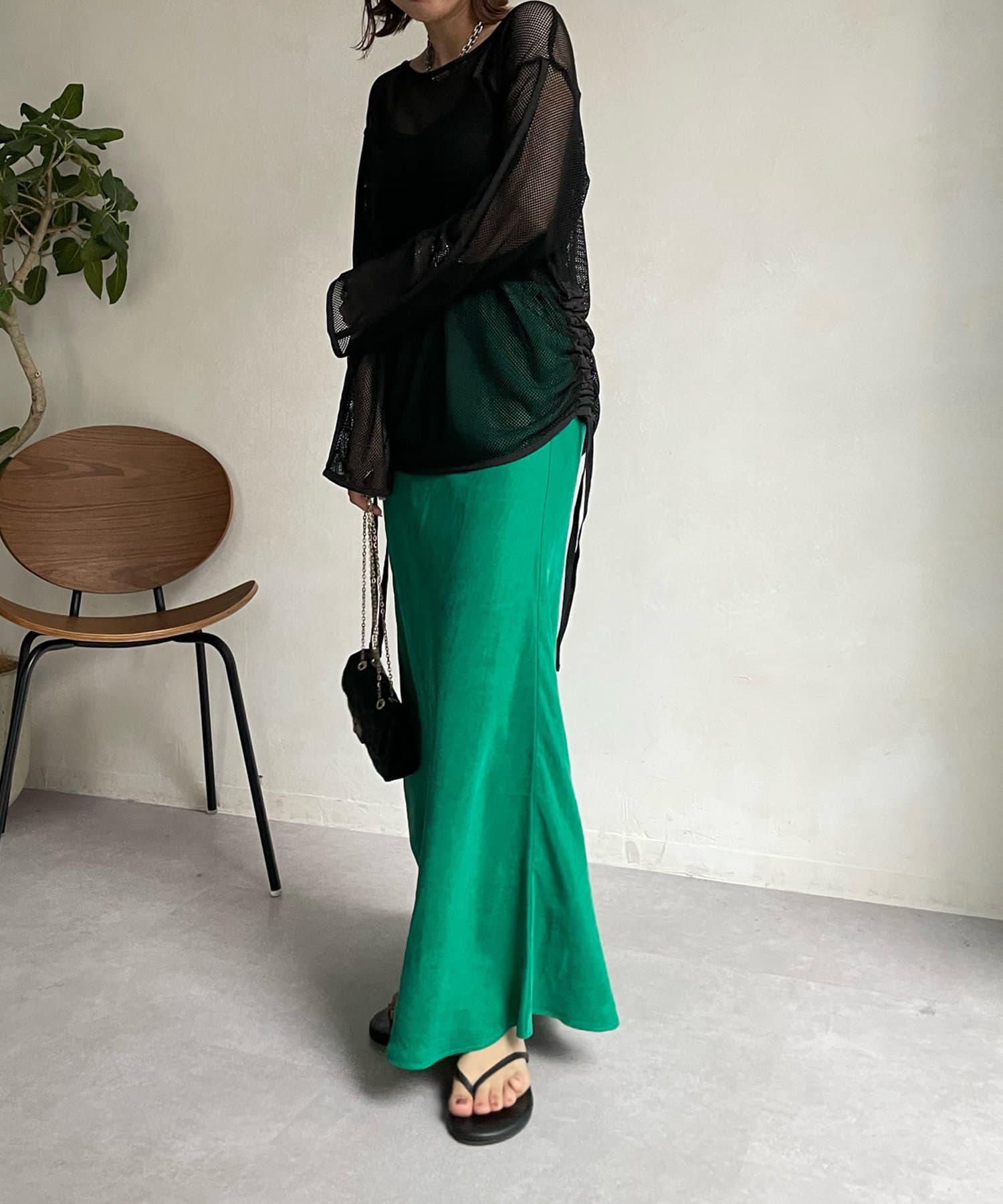 紐を引っ張りお好みでシャーリングデザインを出せ、丈も調整可能!