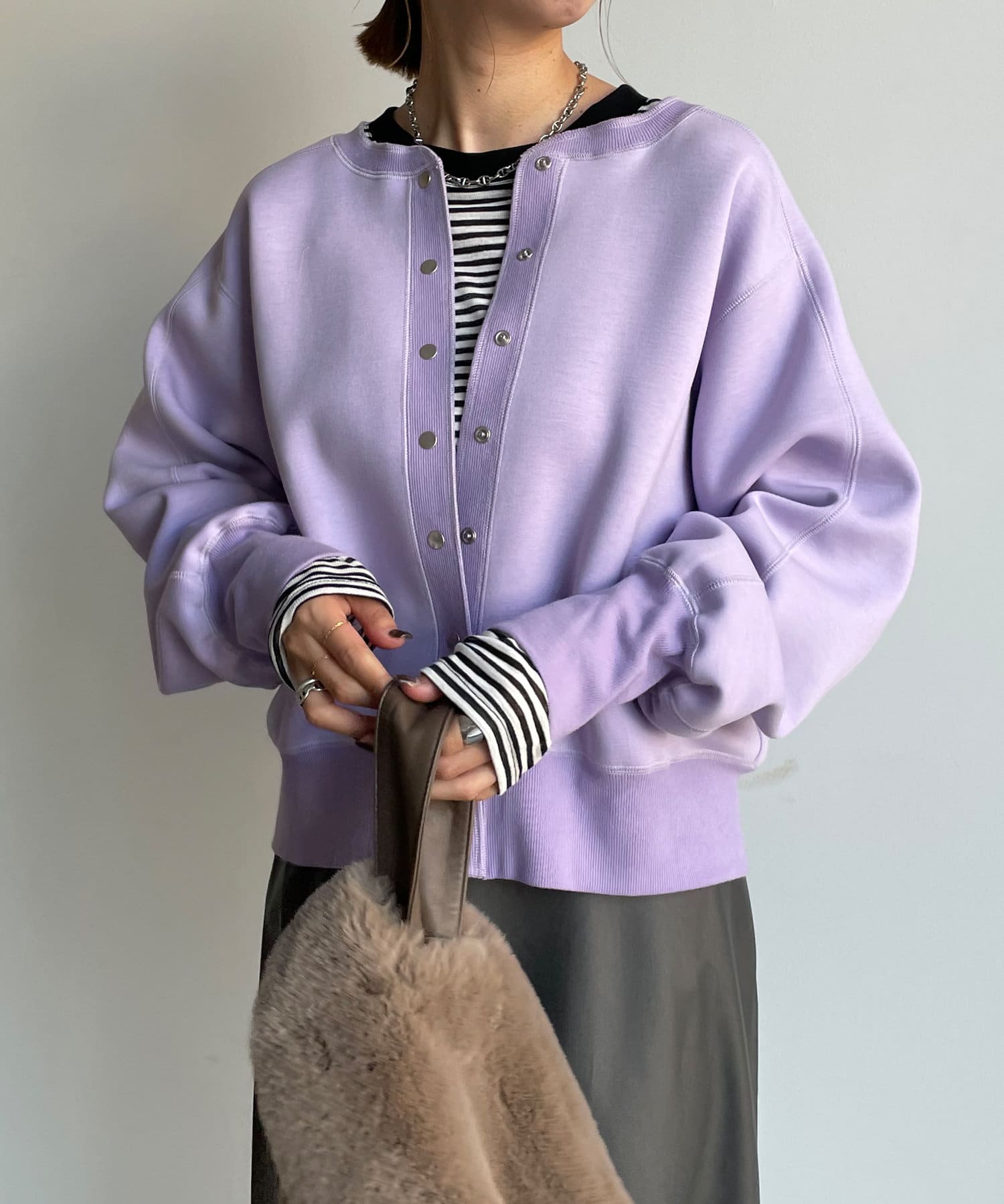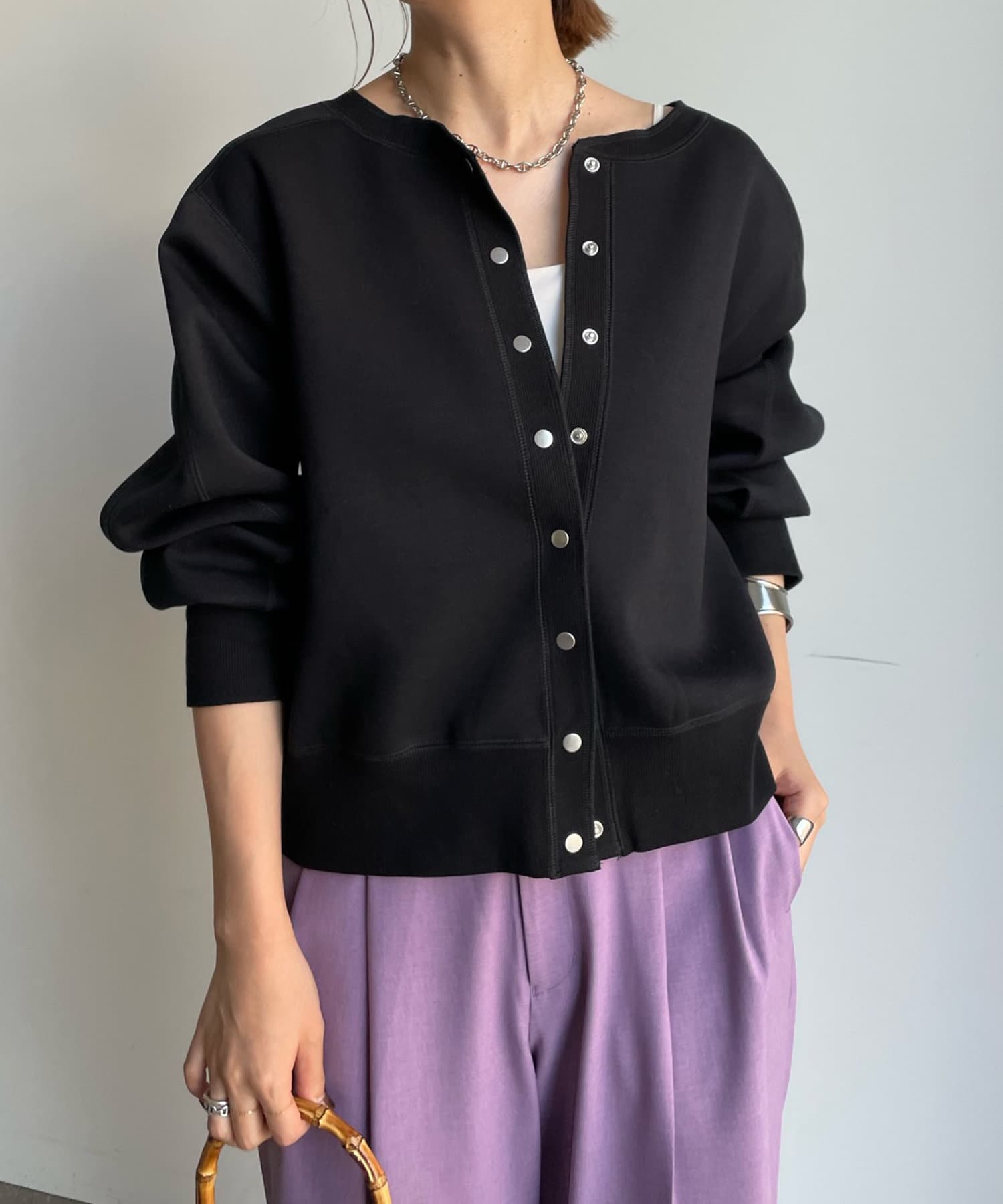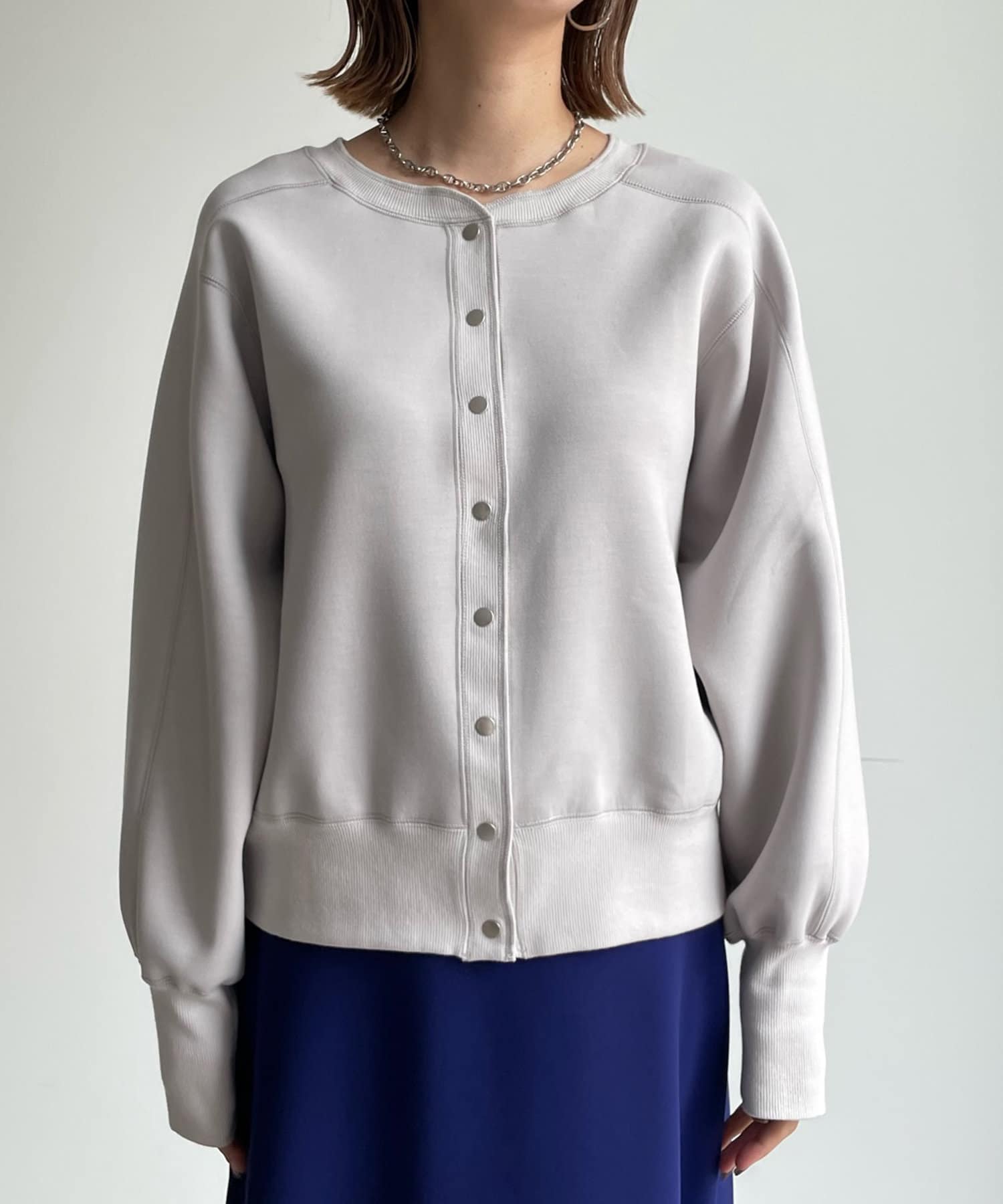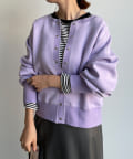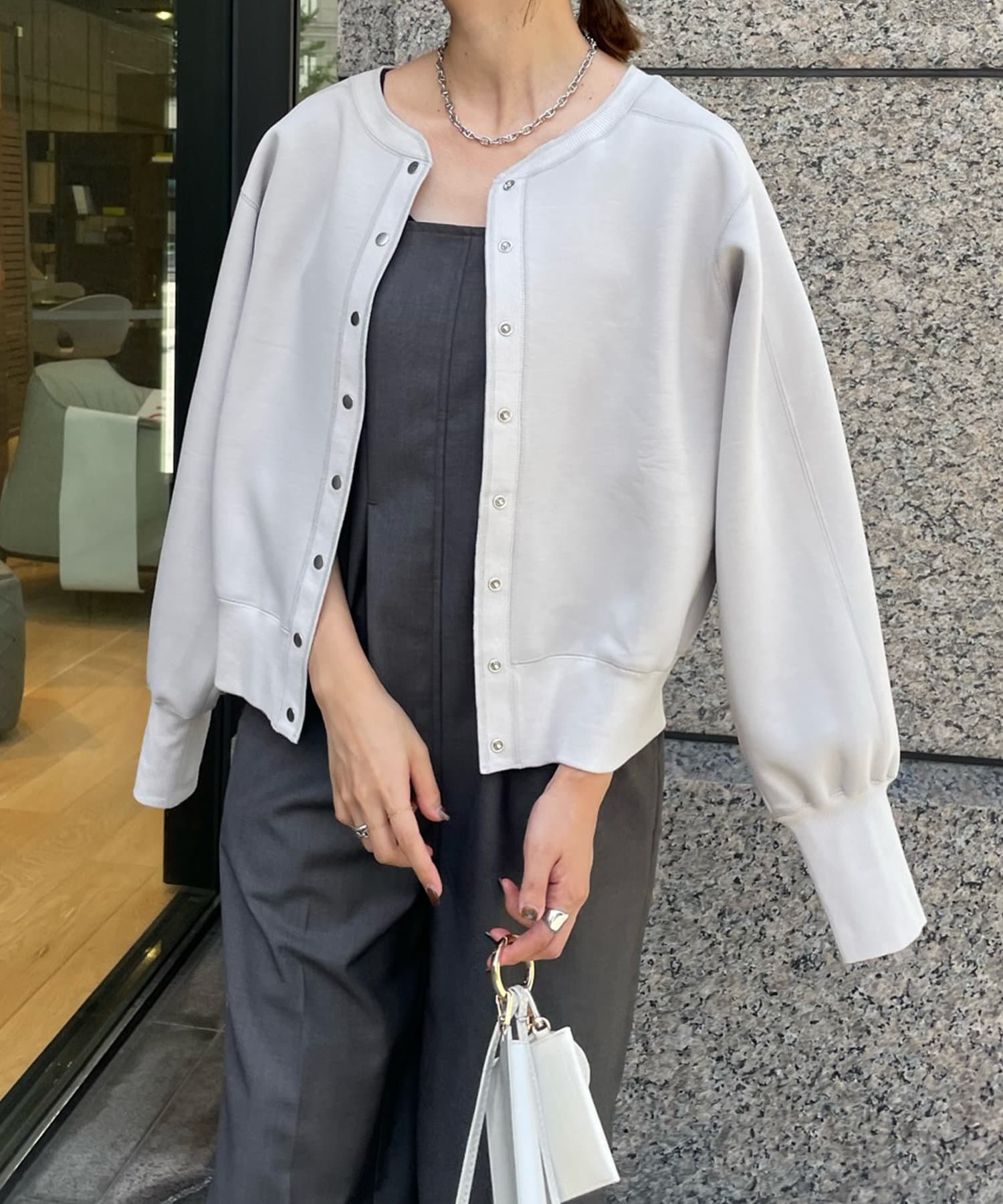 ブルゾンの様なカジュアルなディティールに、シルバーのドットボタンが控えめなワンポイントとなってくれるカーディガン。