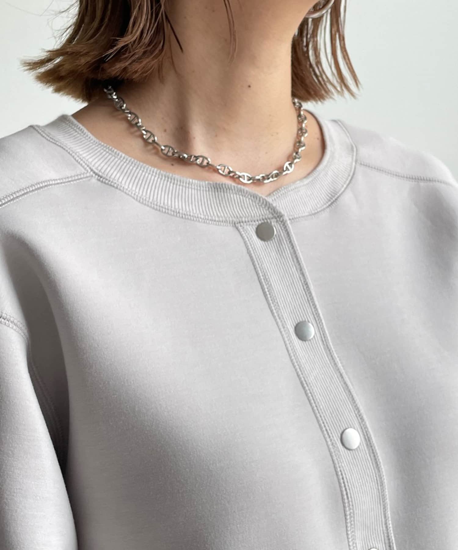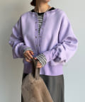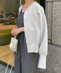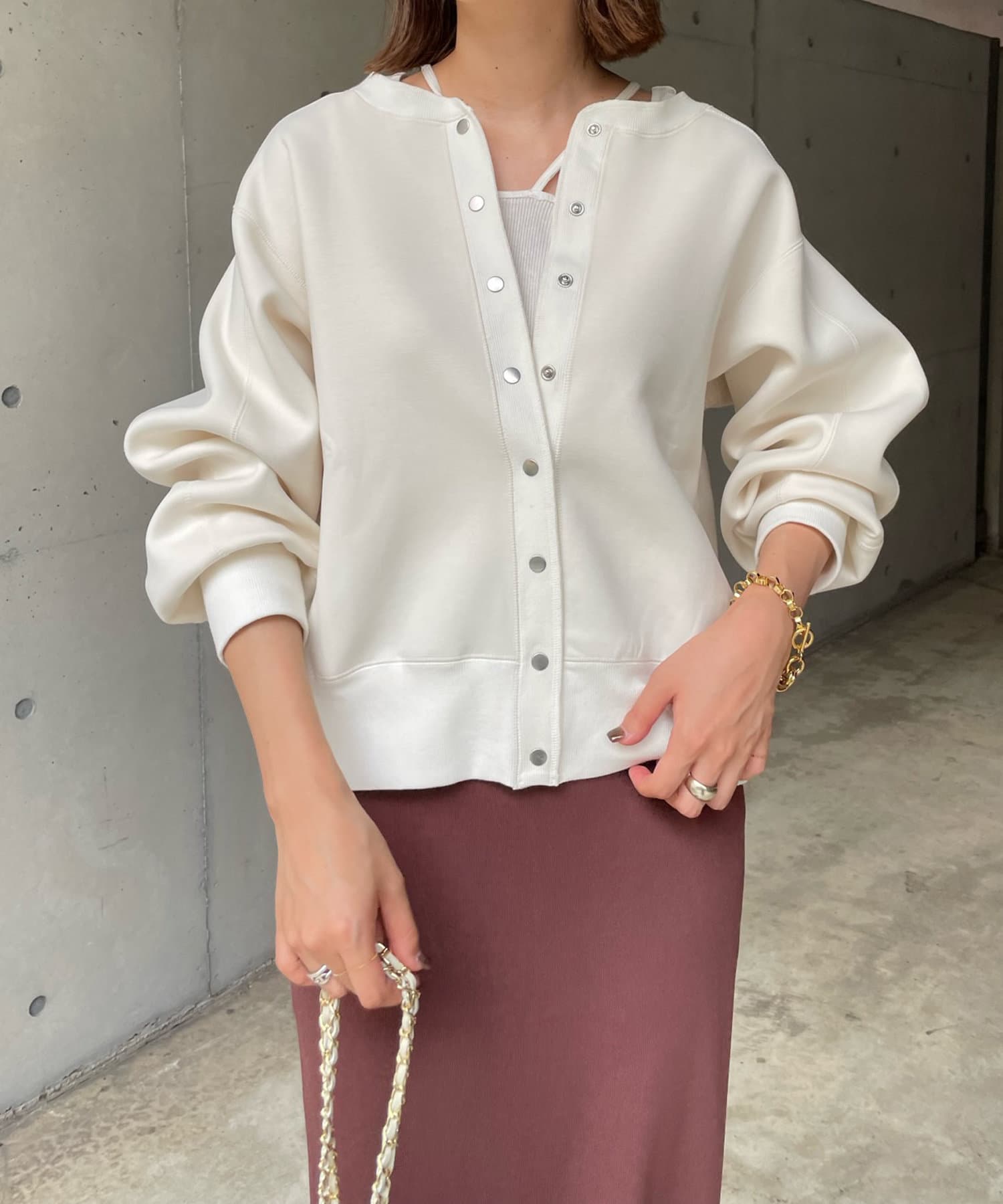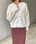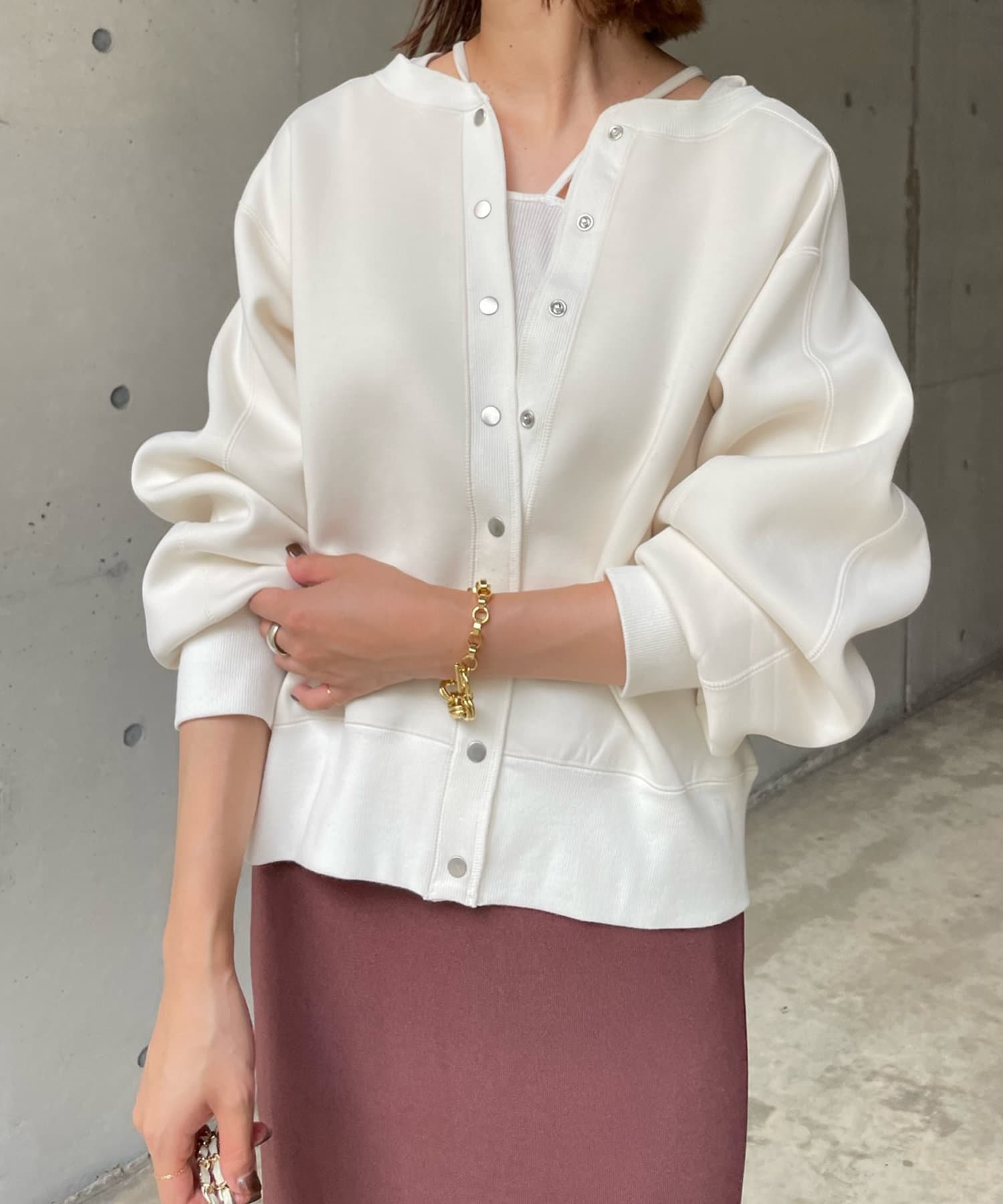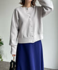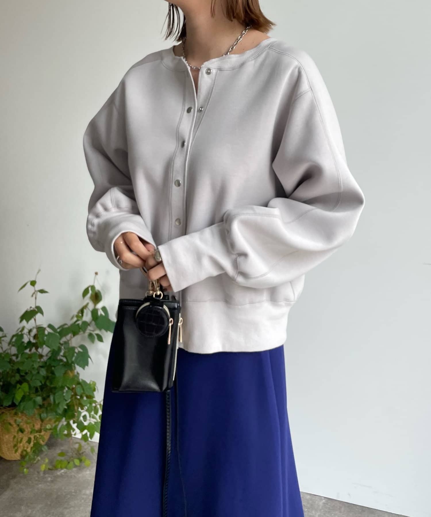 ブルゾンの様なカジュアルなディティールに、シルバーのドットボタンが控えめなワンポイントとなってくれるカーディガン。