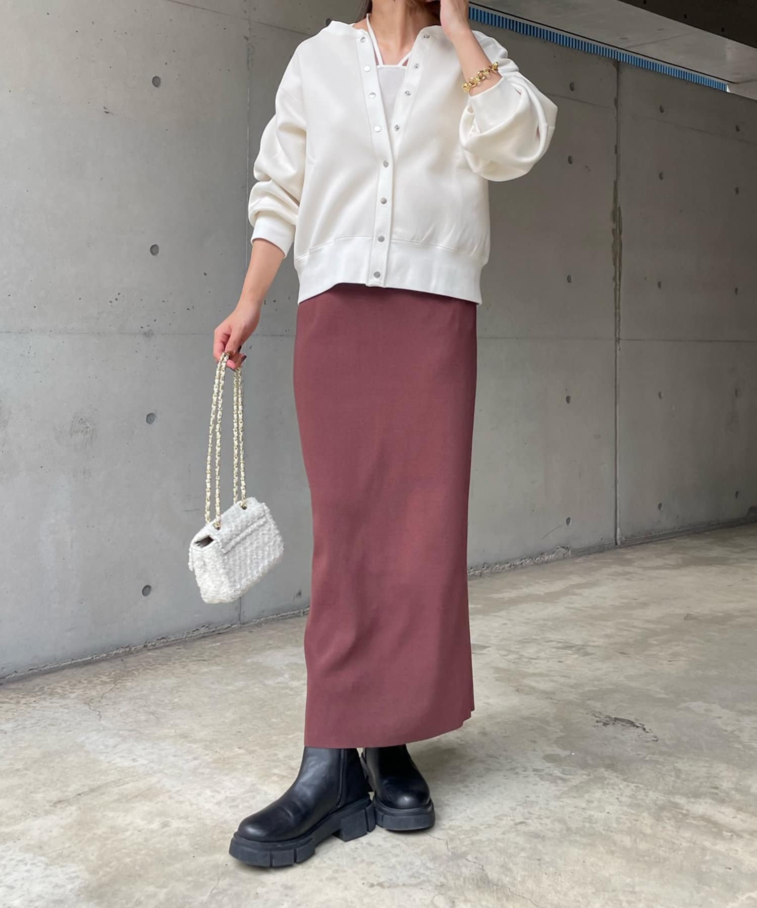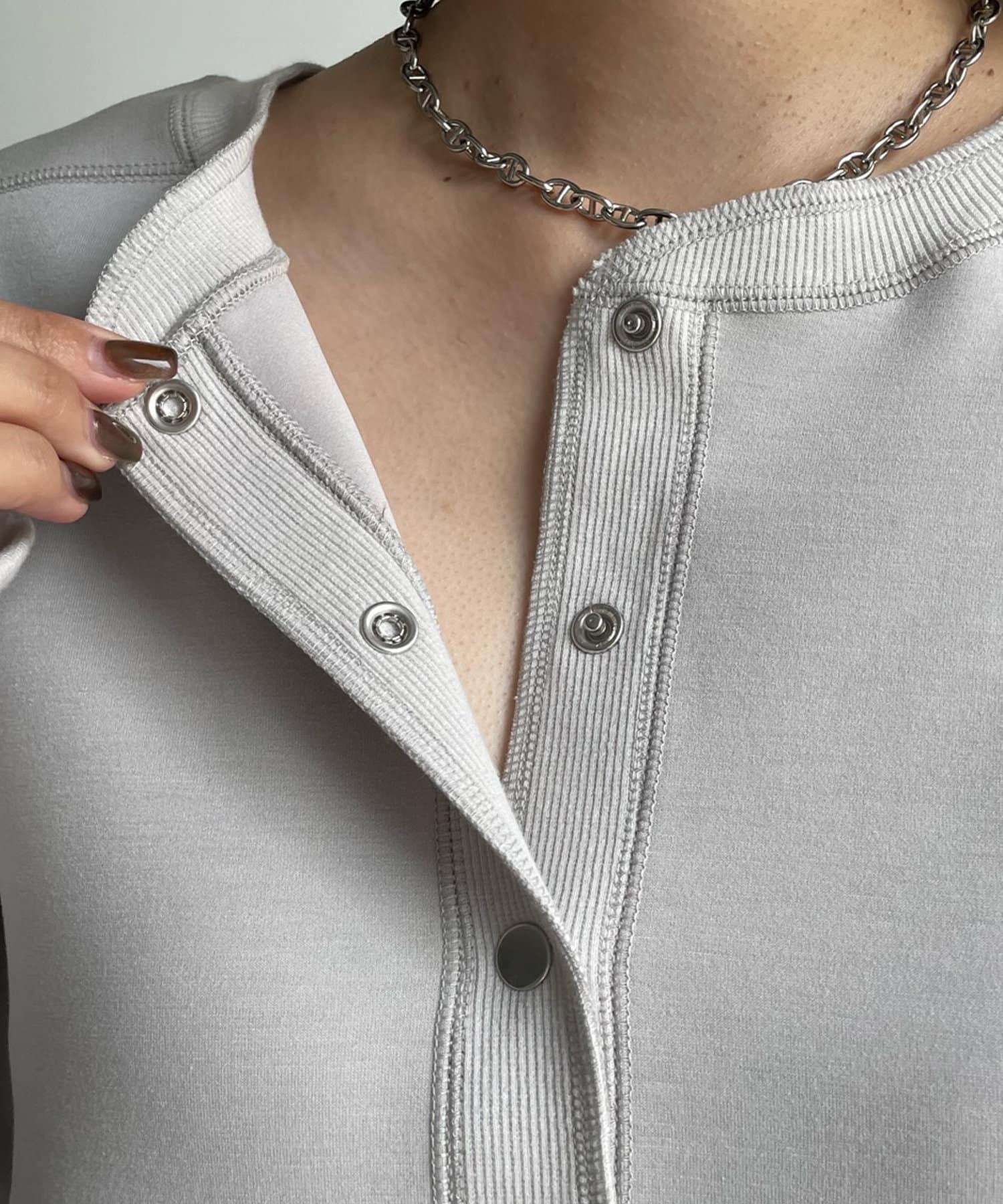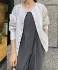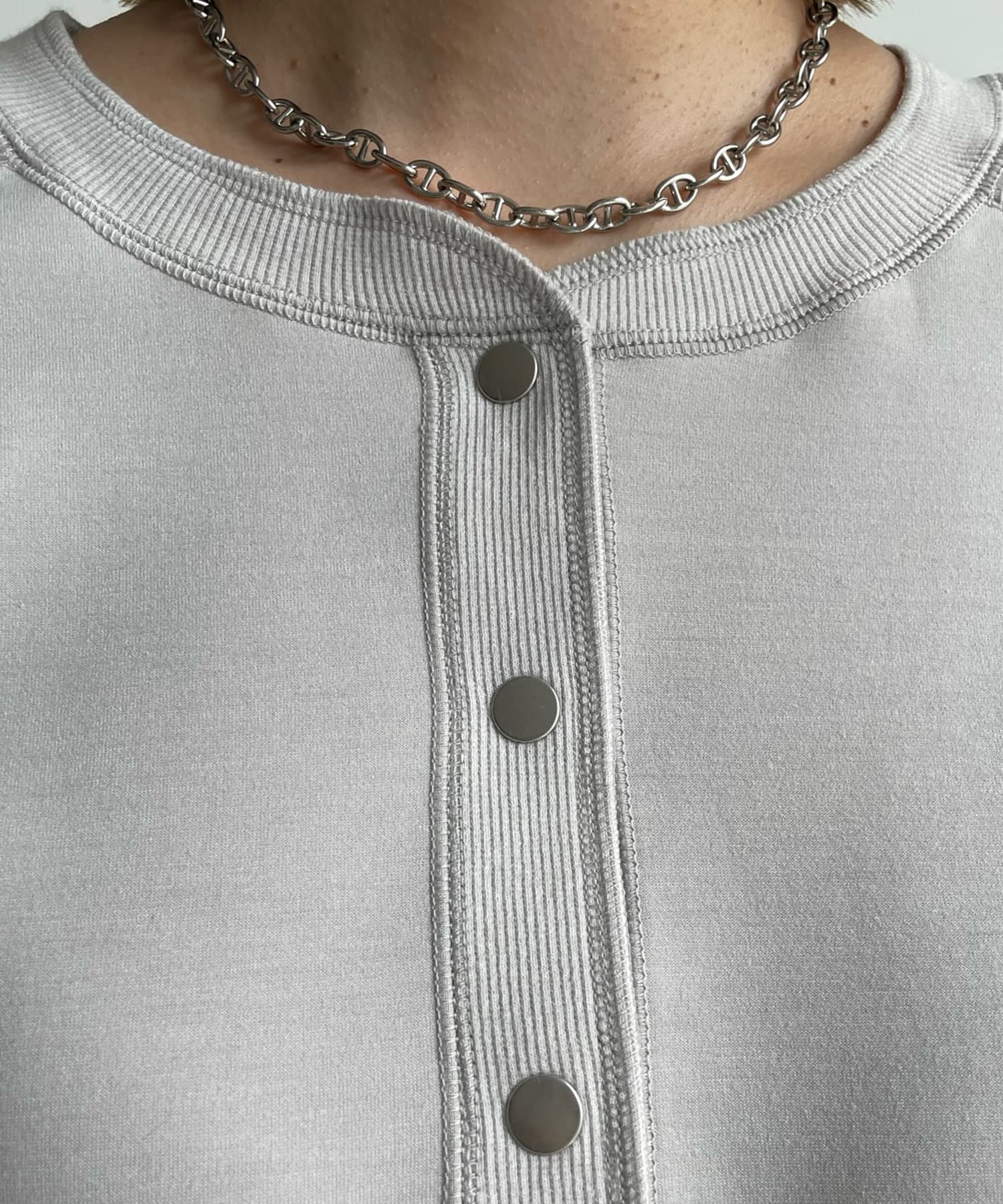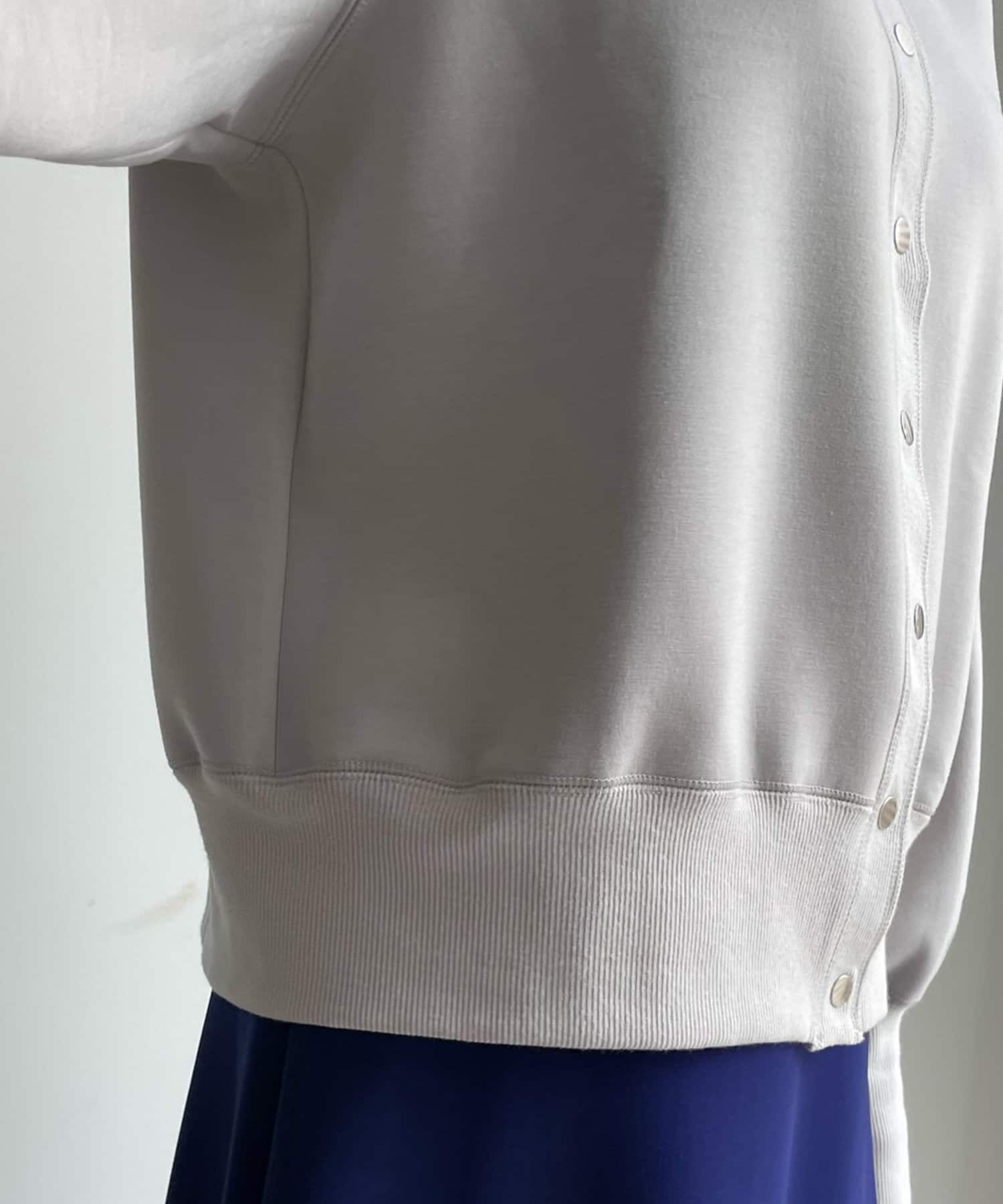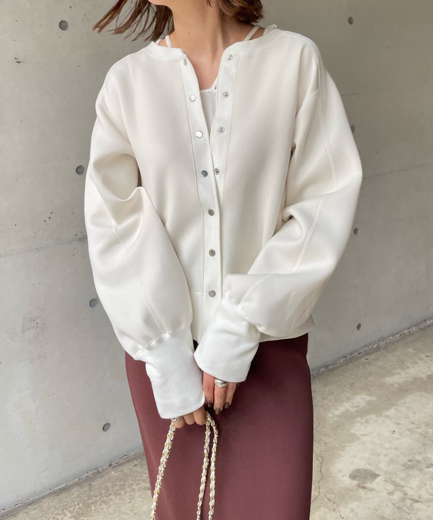 ブルゾンの様なカジュアルなディティールに、シルバーのドットボタンが控えめなワンポイントとなってくれるカーディガン。