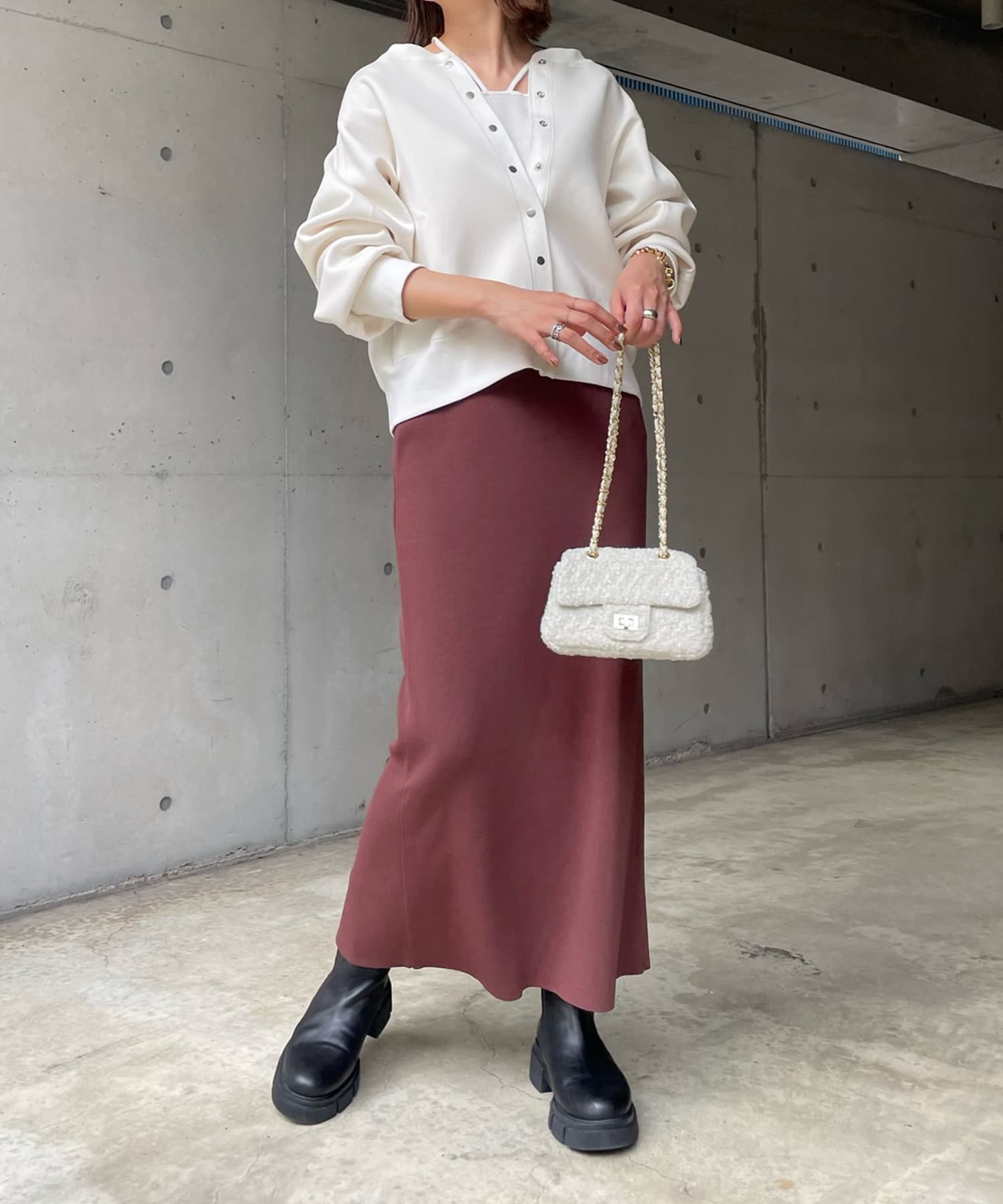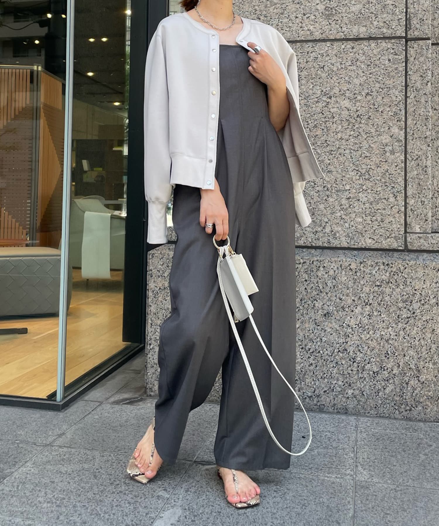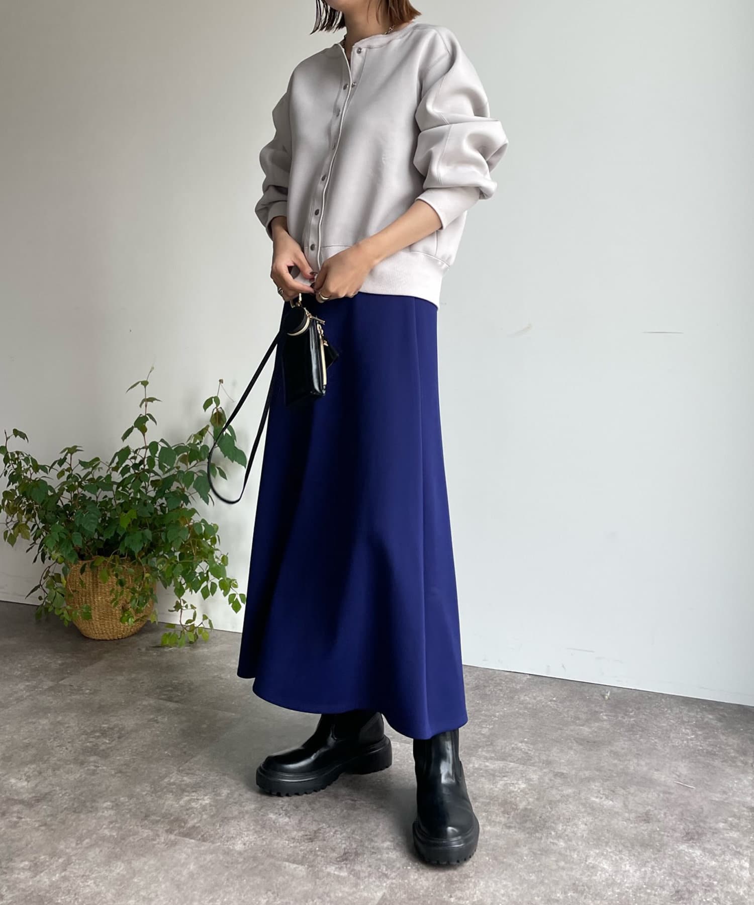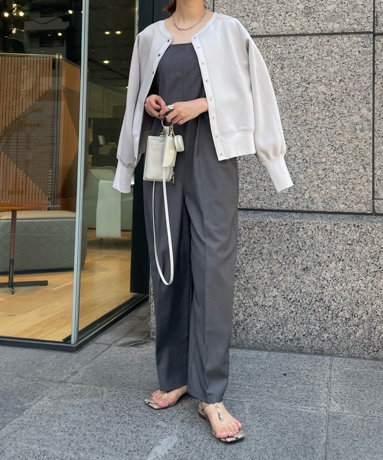 ブルゾンの様なカジュアルなディティールに、シルバーのドットボタンが控えめなワンポイントとなってくれるカーディガン。