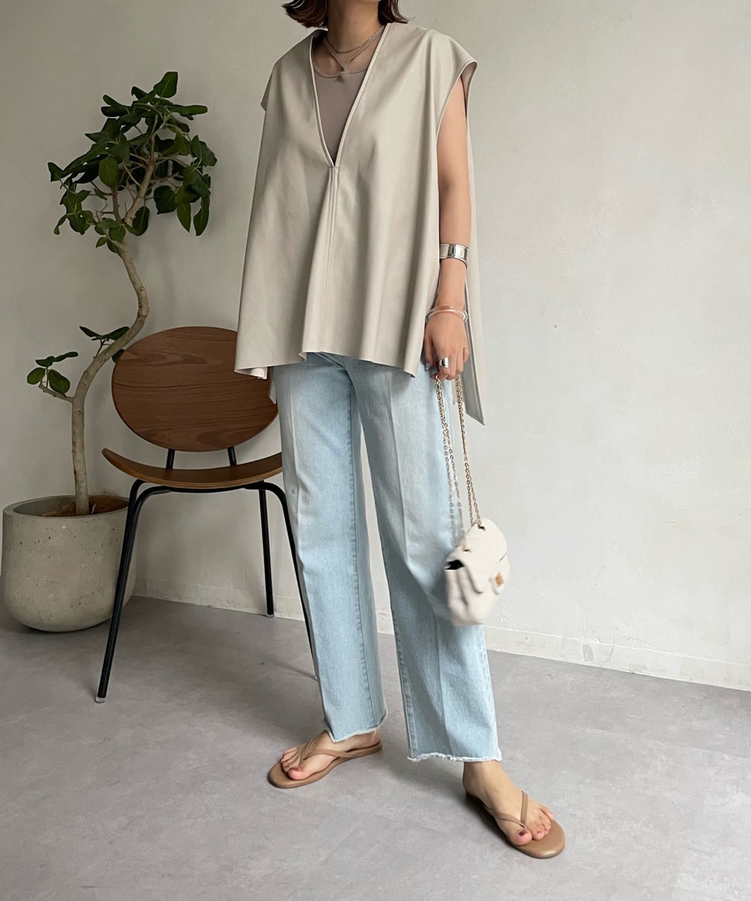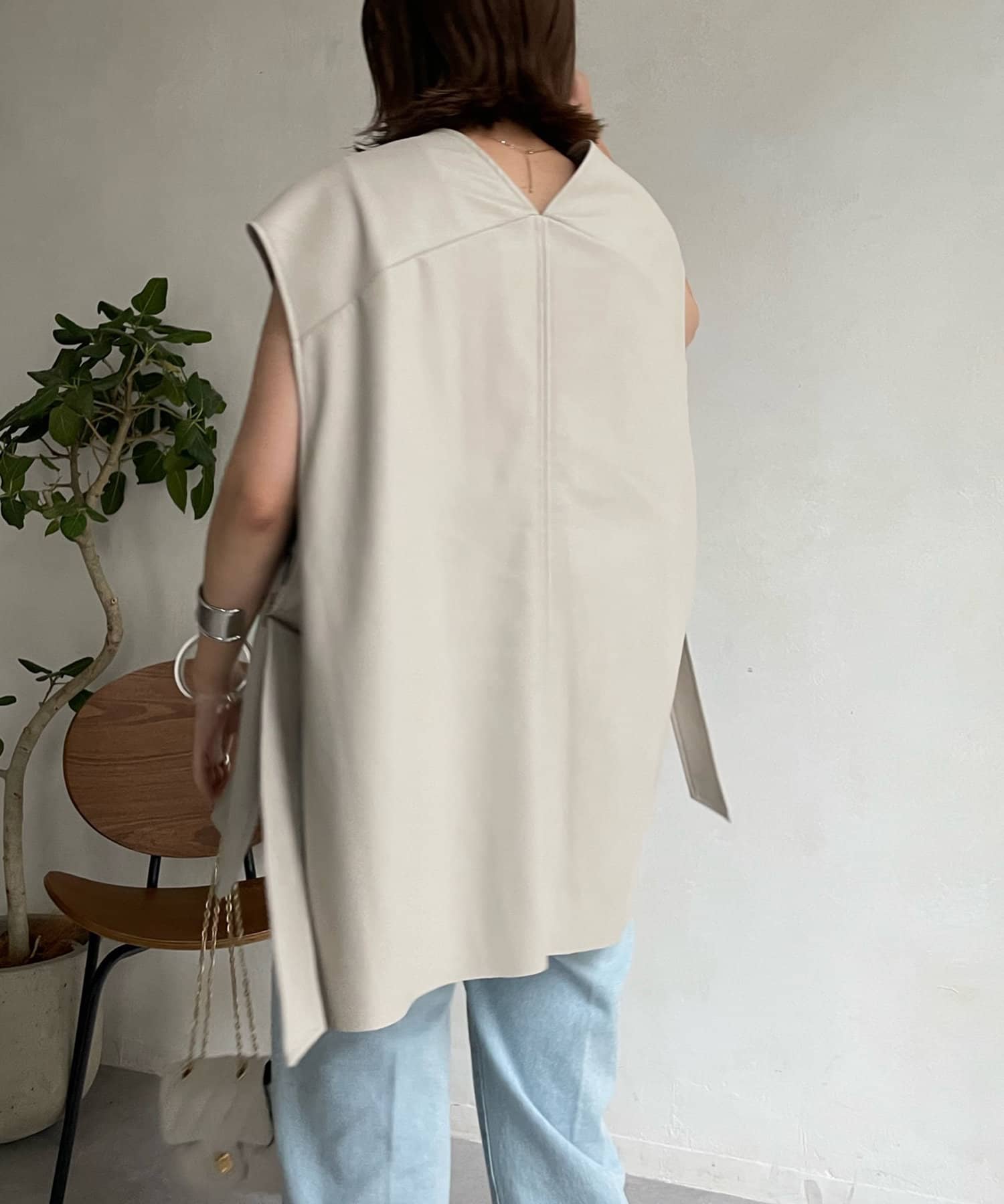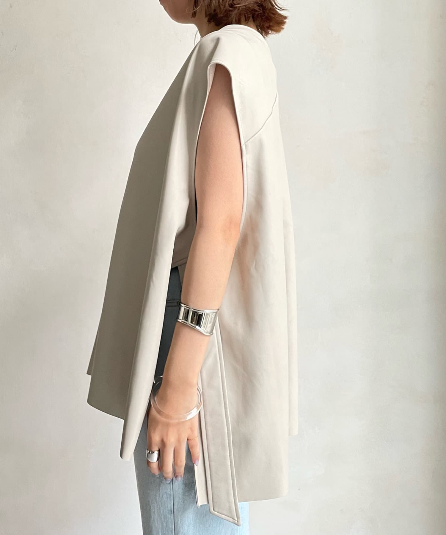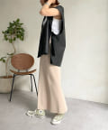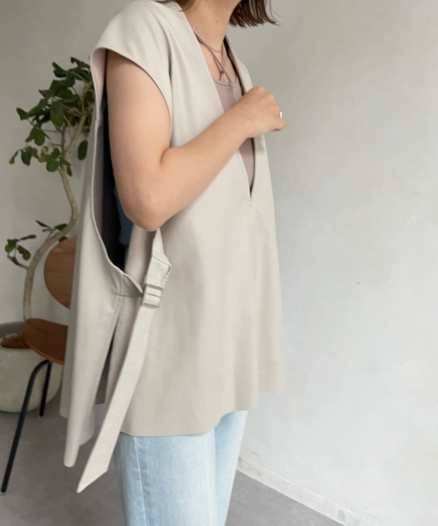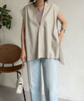 マニッシュな印象ですが、前後Vネックでサイドベルト下もスリットになっており、抜け感あるデザインが女性らしさ◎