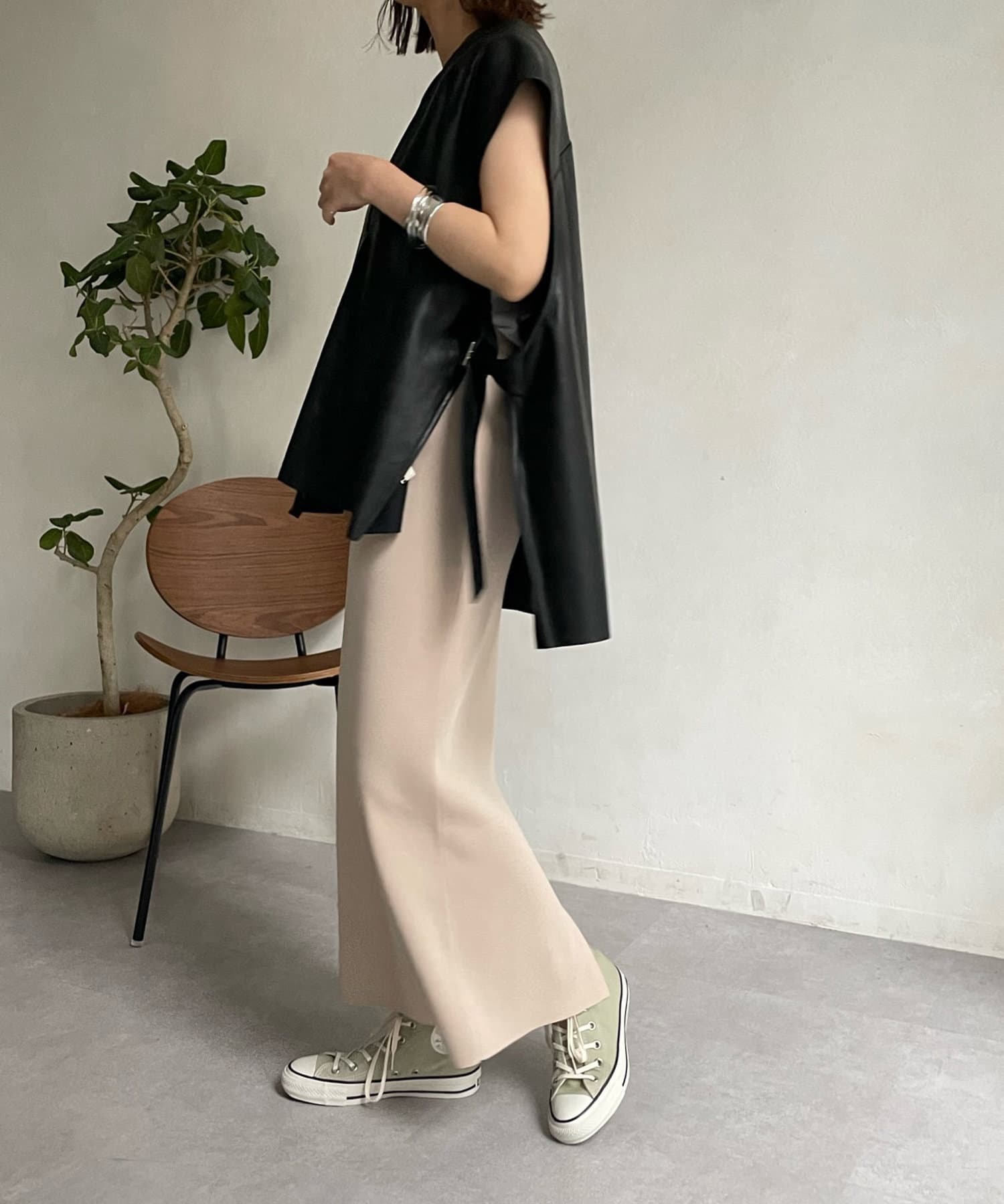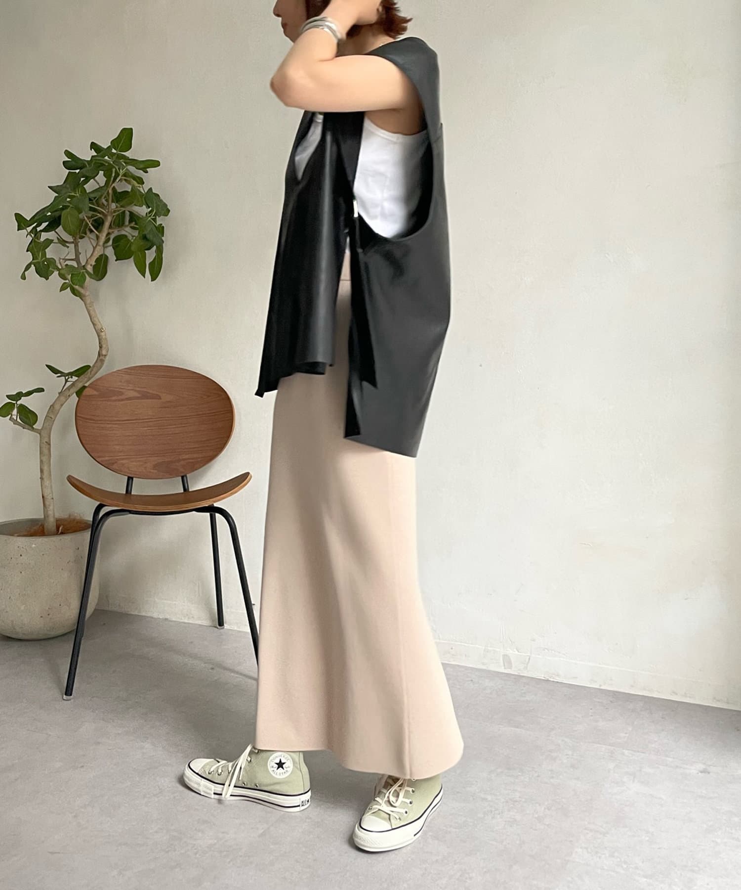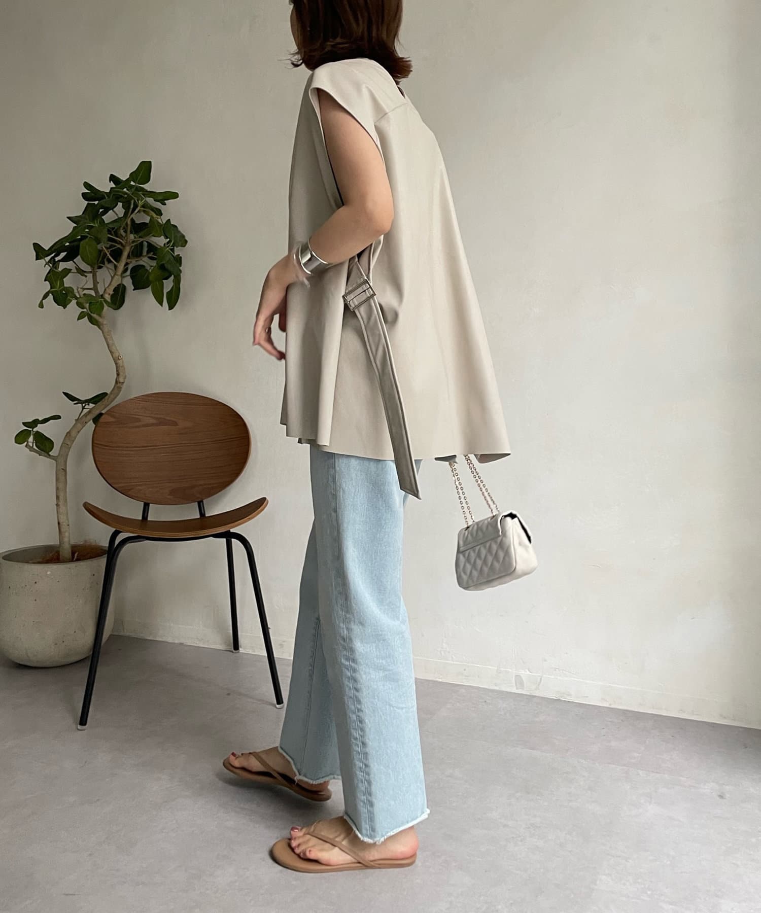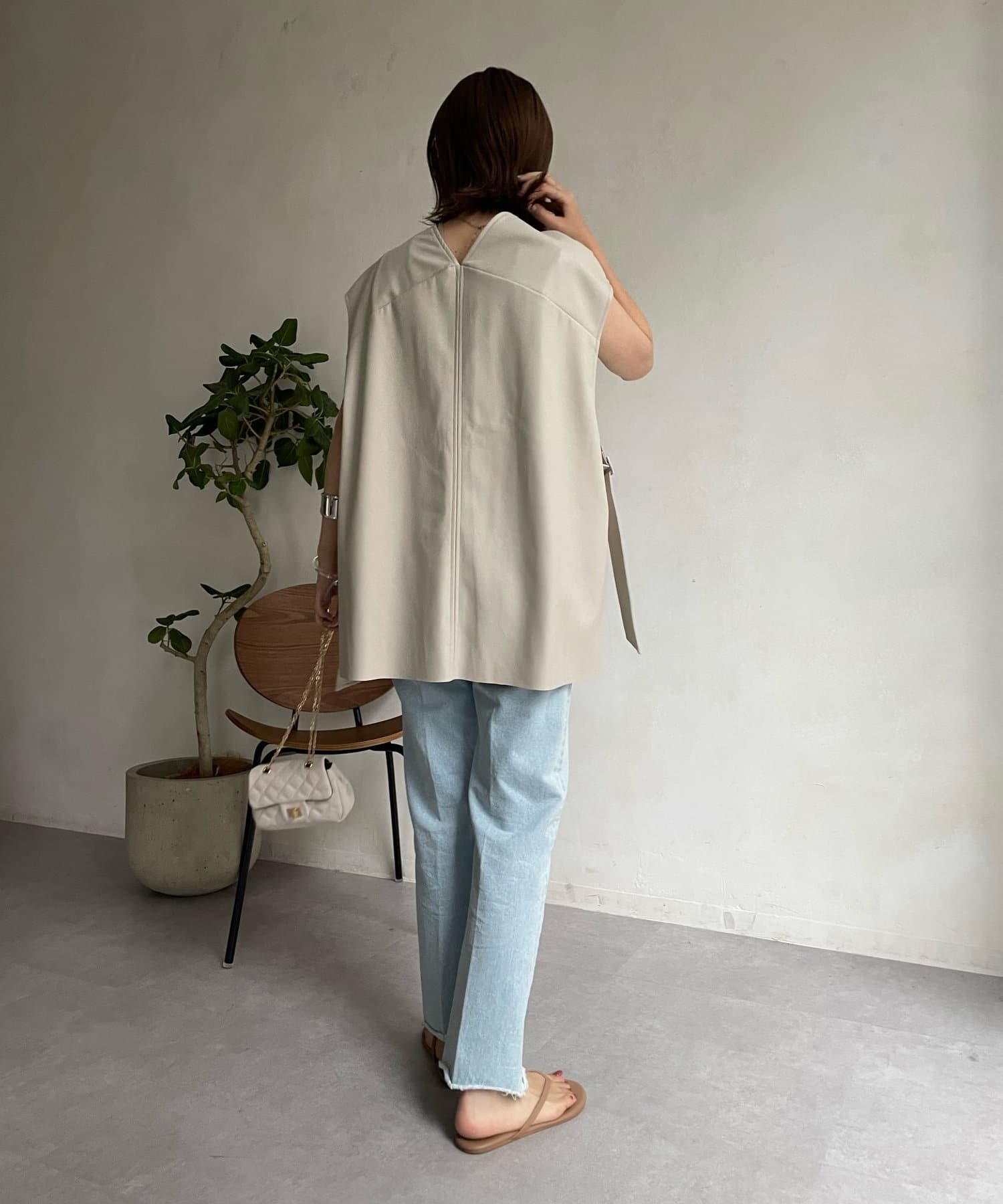 マニッシュな印象ですが、前後Vネックでサイドベルト下もスリットになっており、抜け感あるデザインが女性らしさ◎