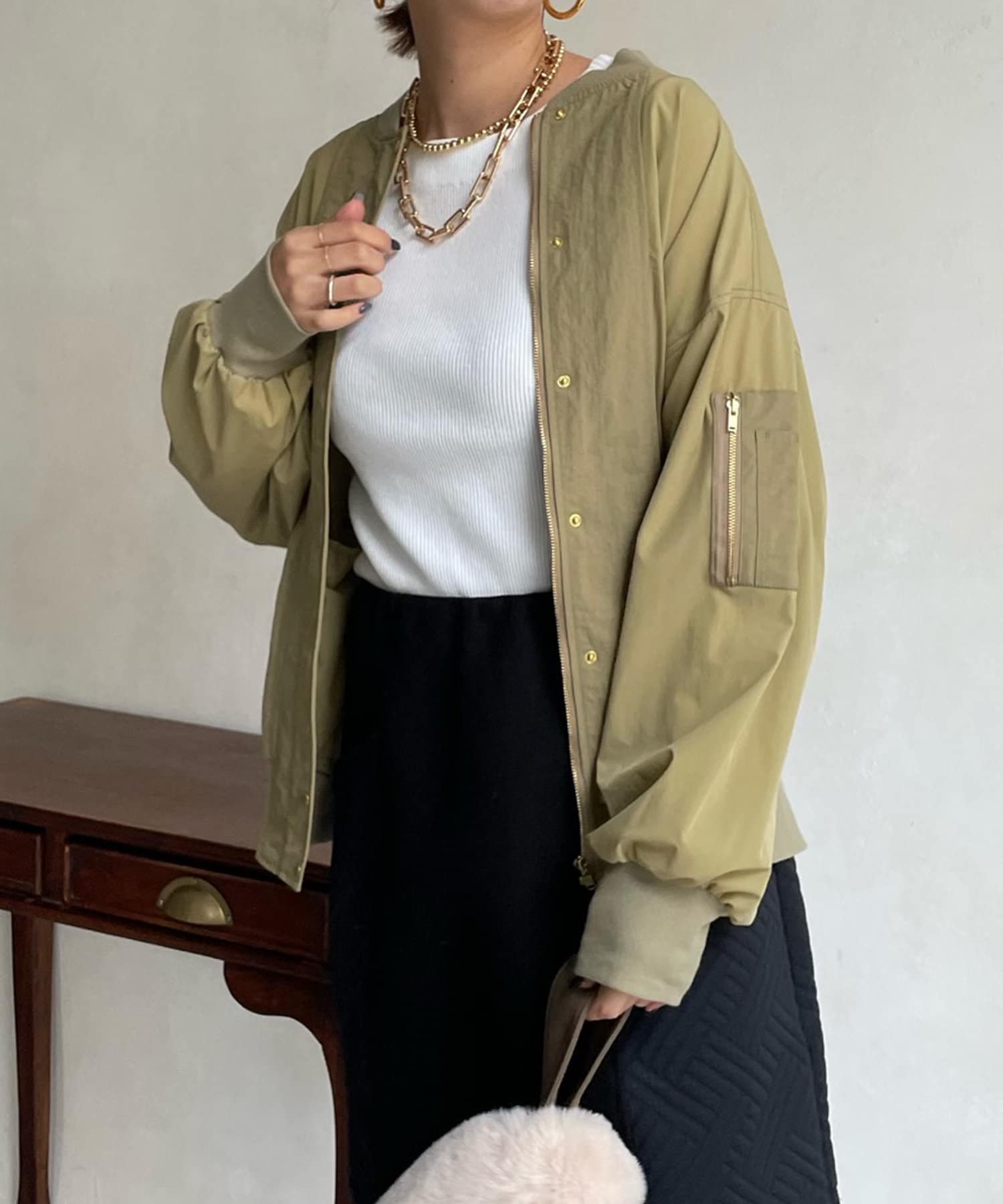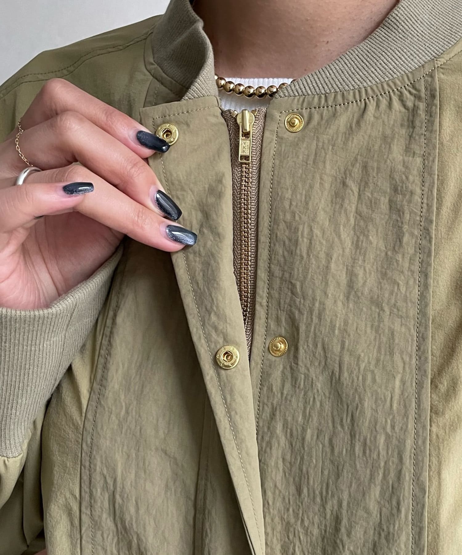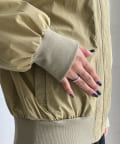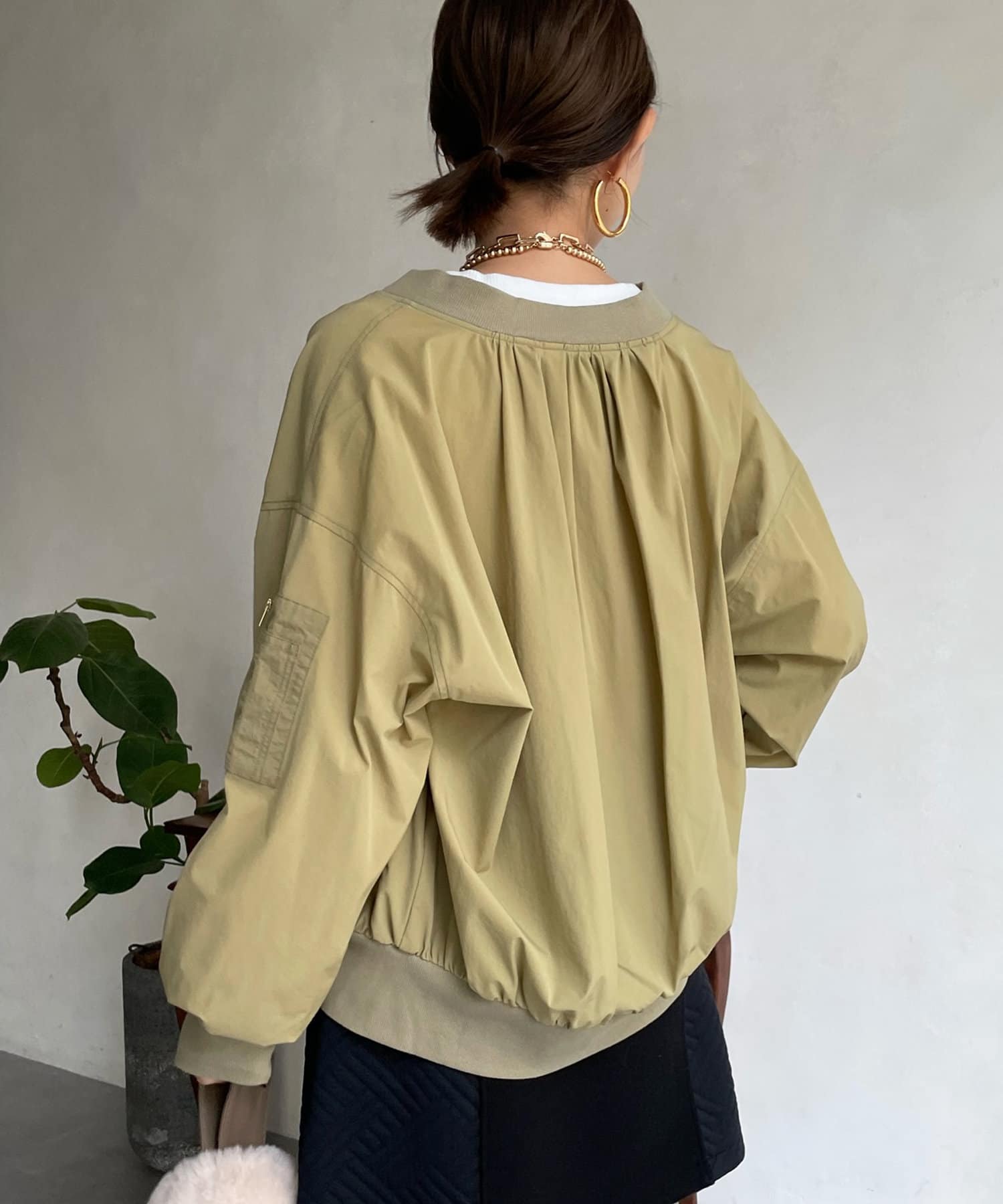 MA-1のカジュアルさをベースに、きらっとゴールドのボタン部分やバックネック部分のギャザーデザインで女性らしさをプラスします。