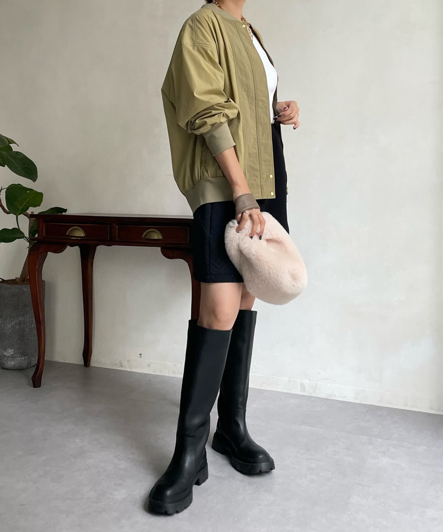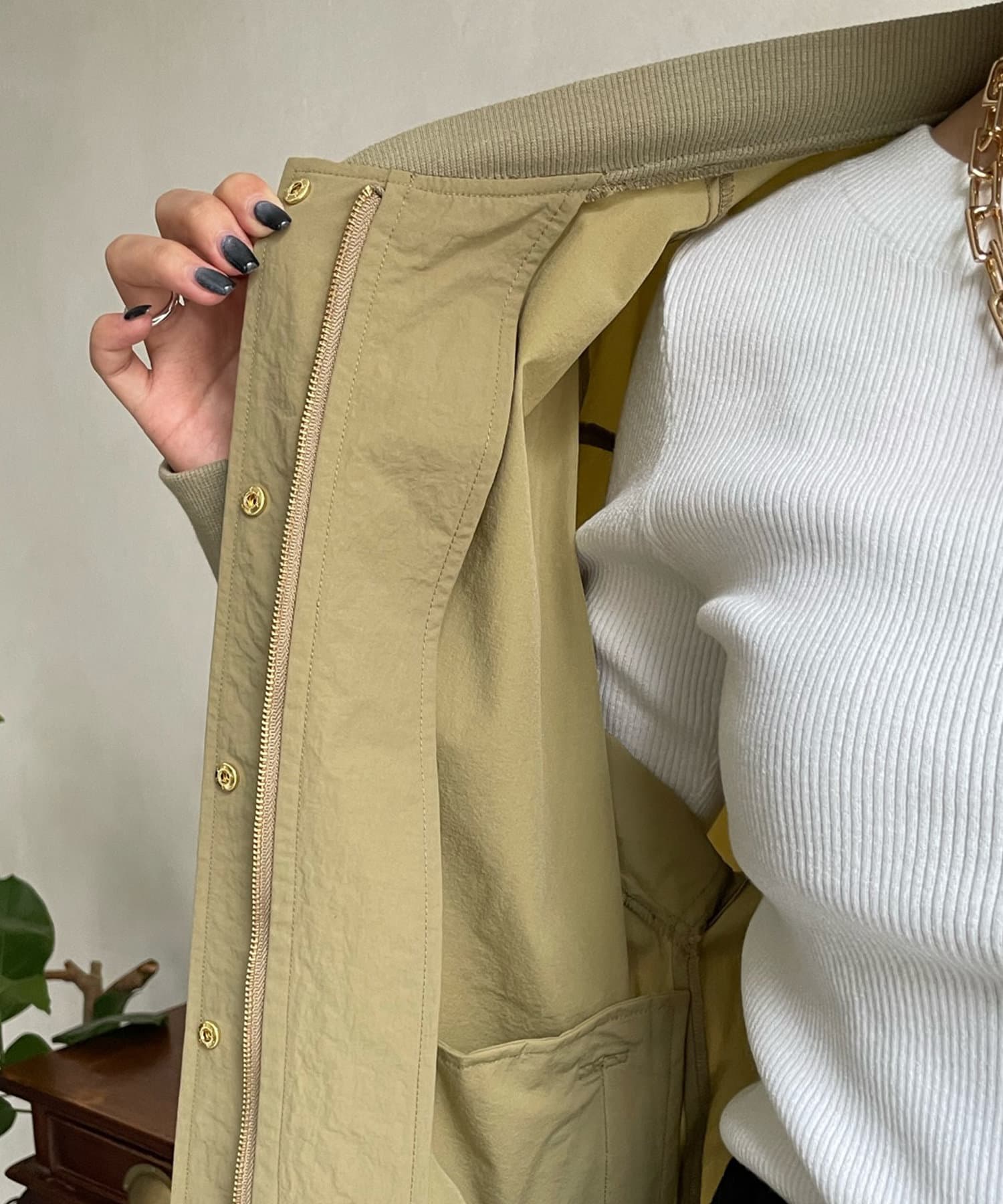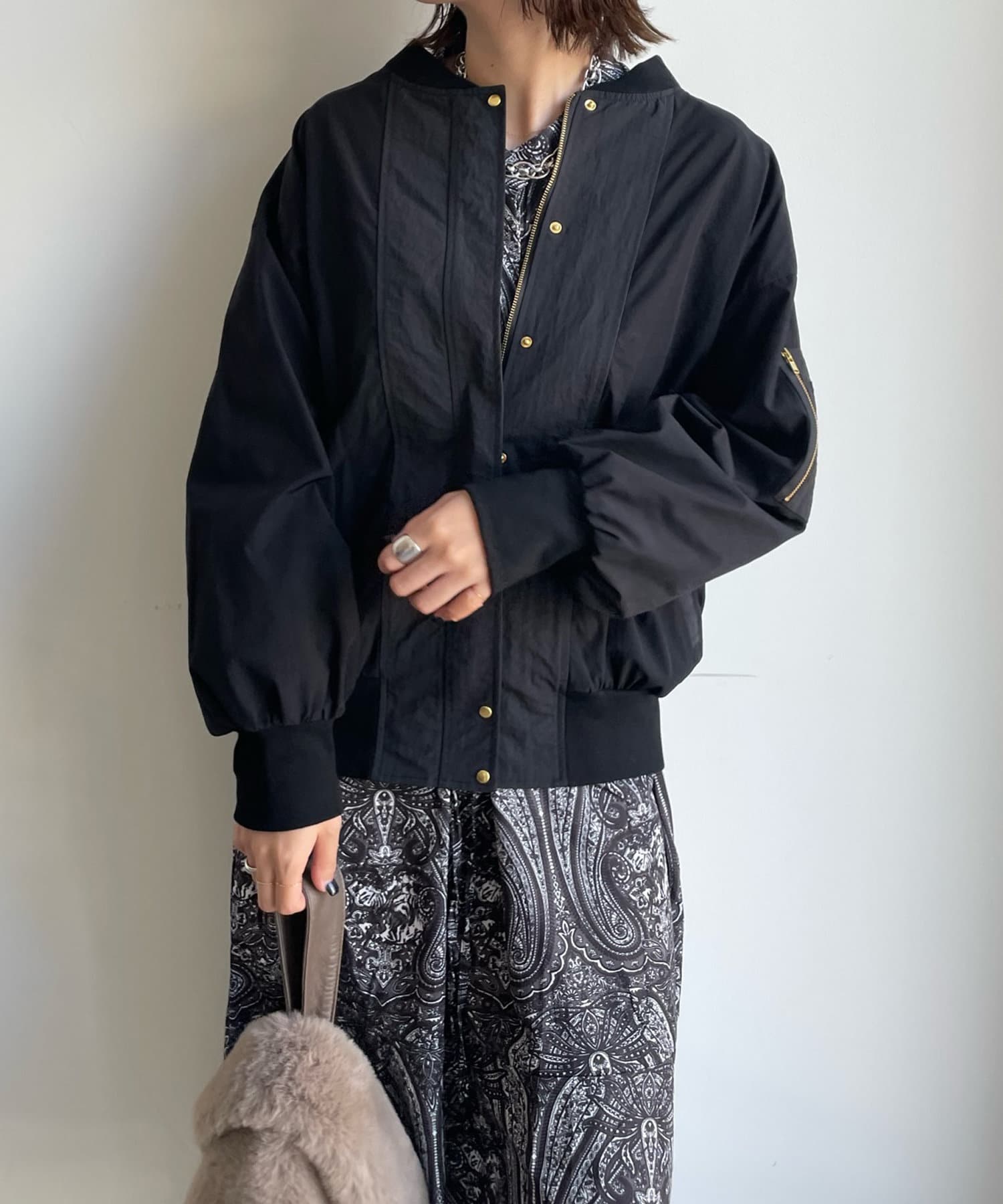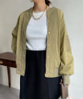 MA-1のカジュアルさをベースに、きらっとゴールドのボタン部分やバックネック部分のギャザーデザインで女性らしさをプラスします。