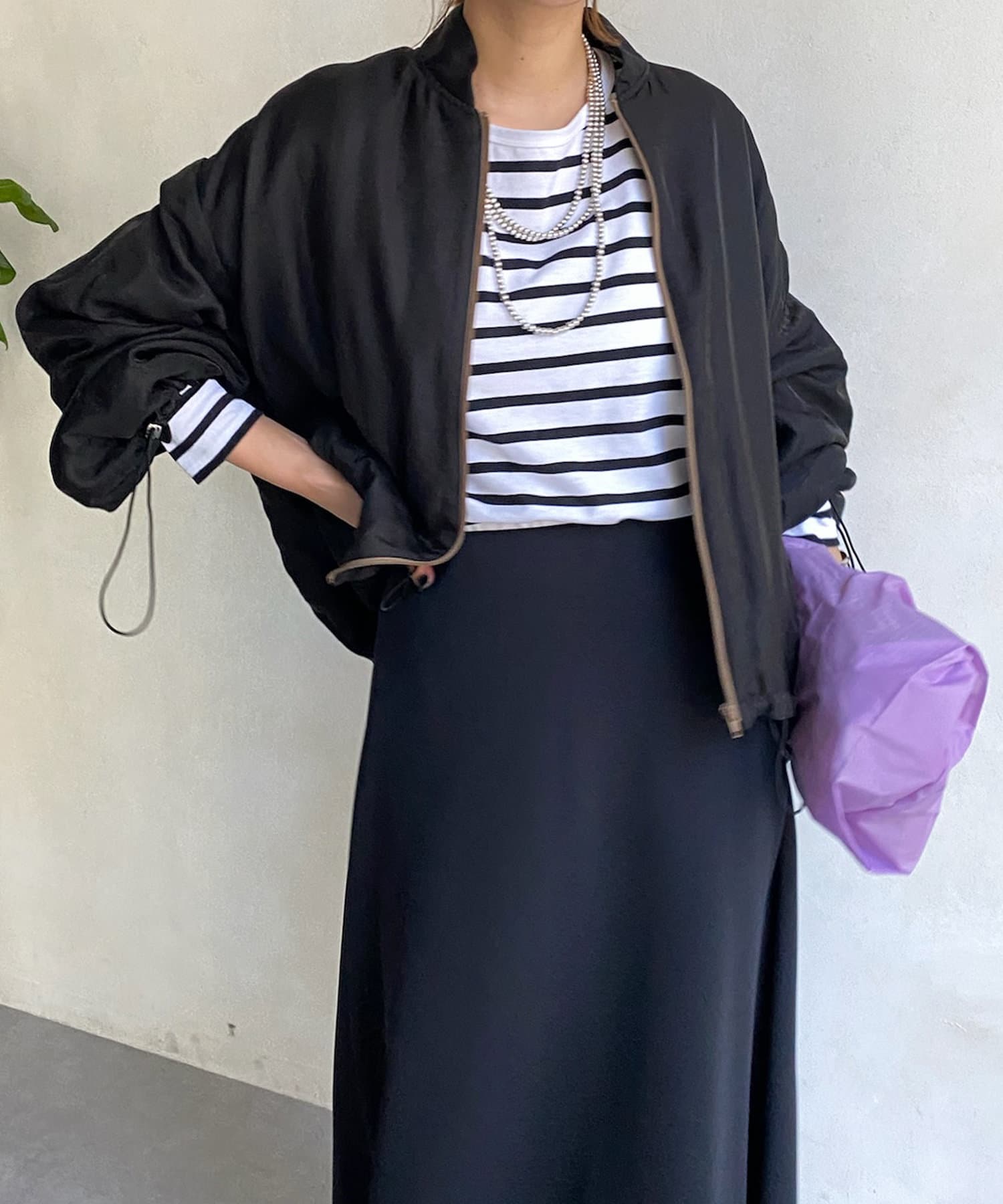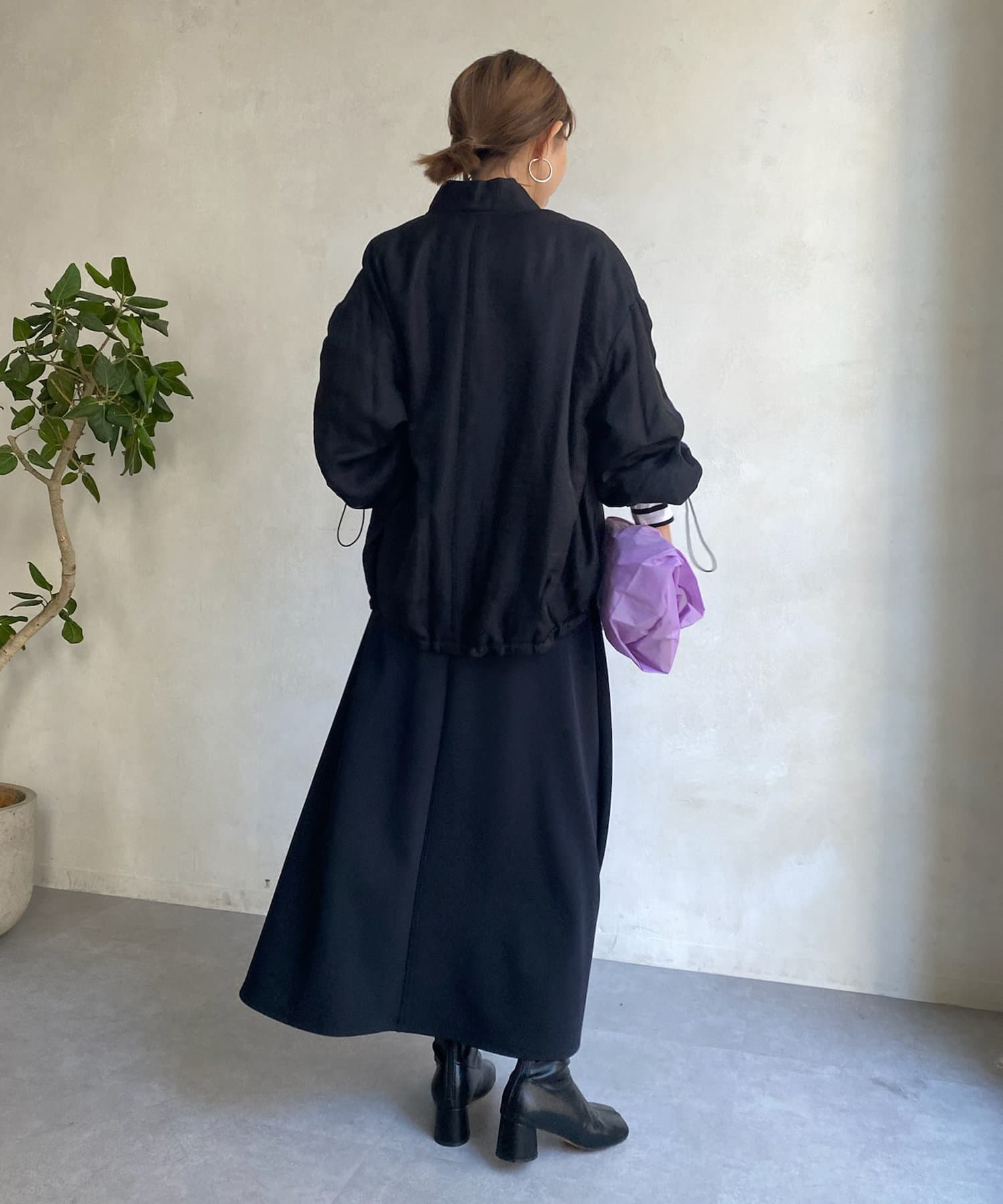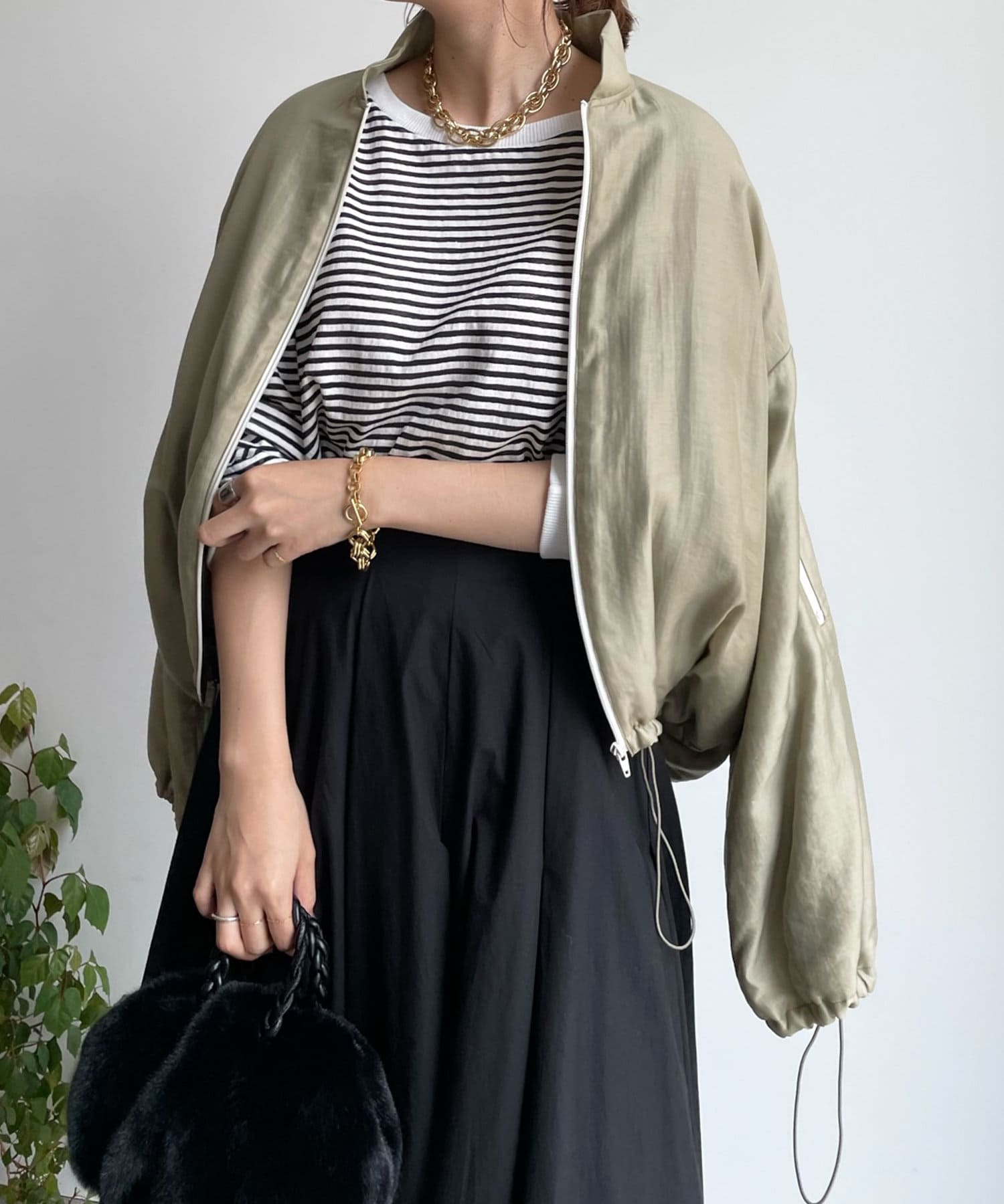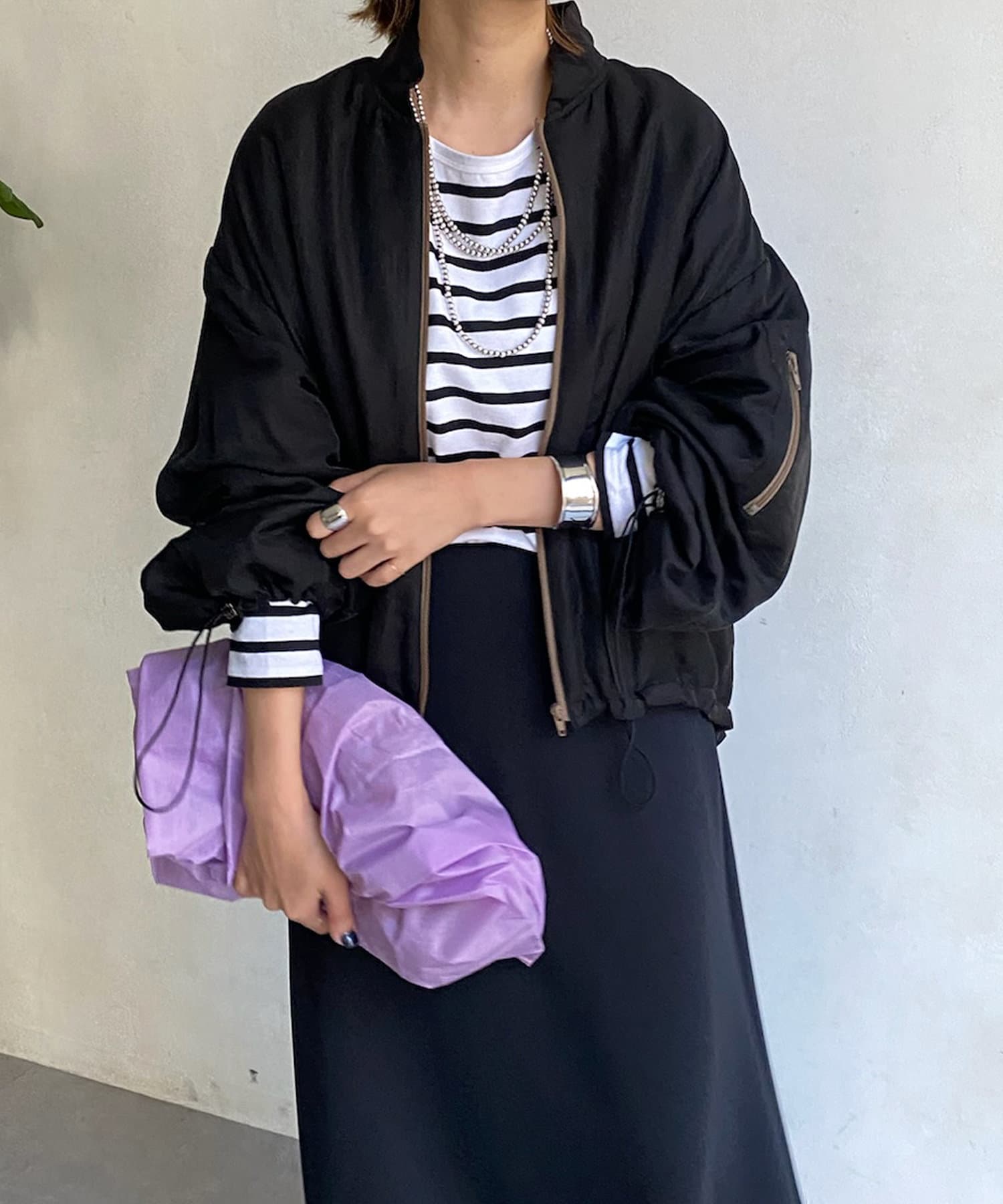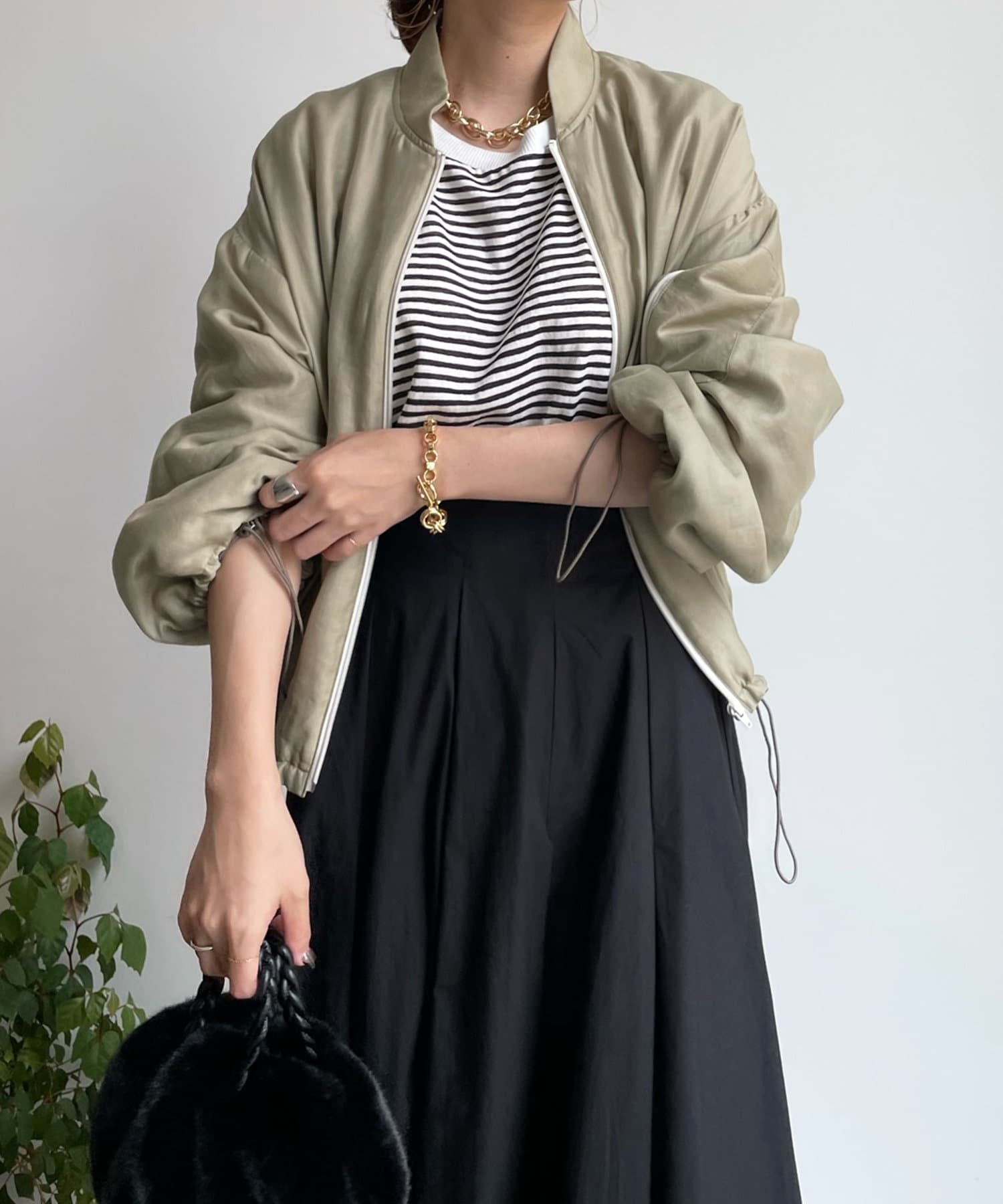 トレンドのMA-1のディティールをベースに、袖口&裾ドロストのデザインを加えることで、丸みを帯びたシルエットにアレンジが可能。女性らしさをプラスできるポイントですよ。