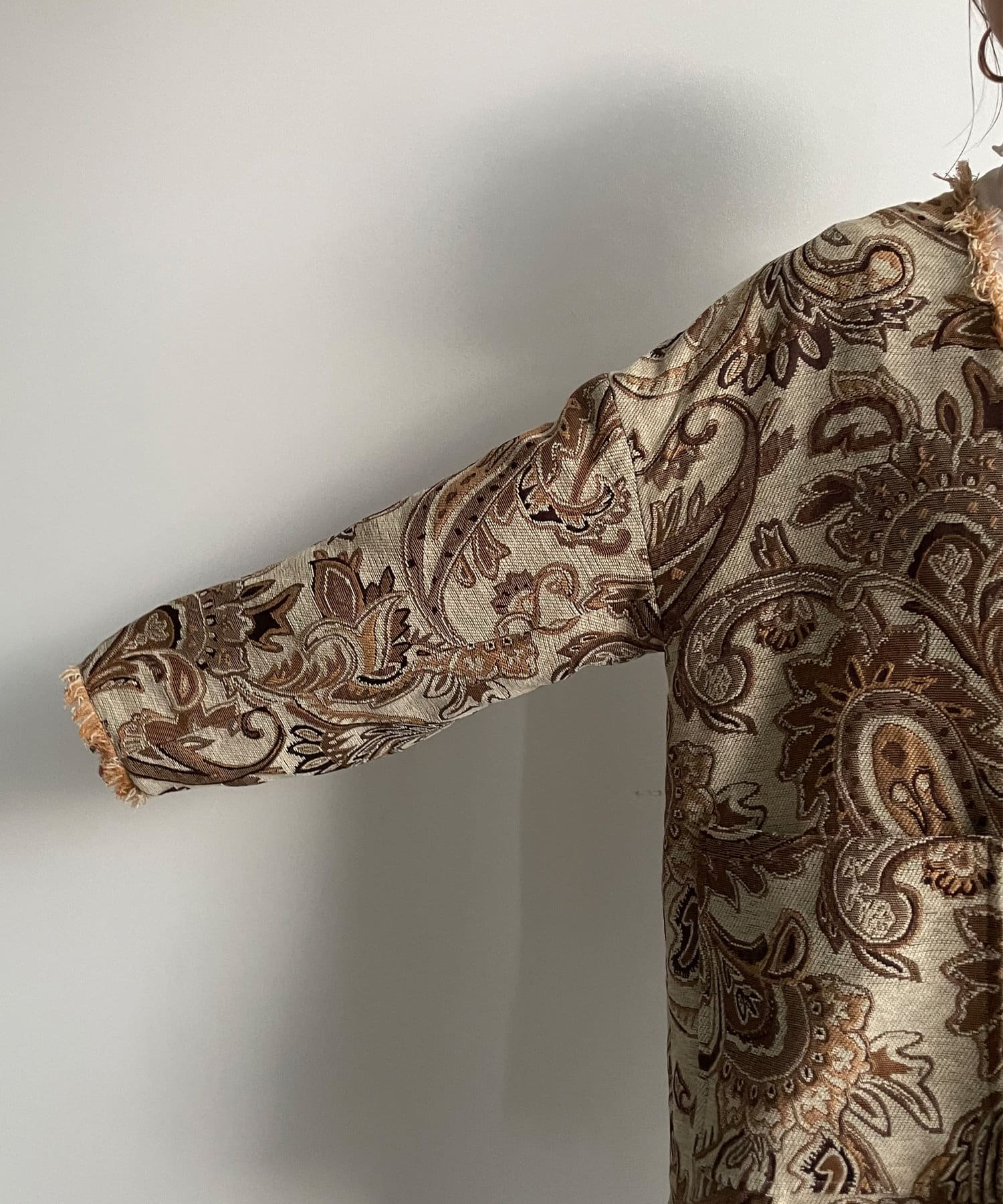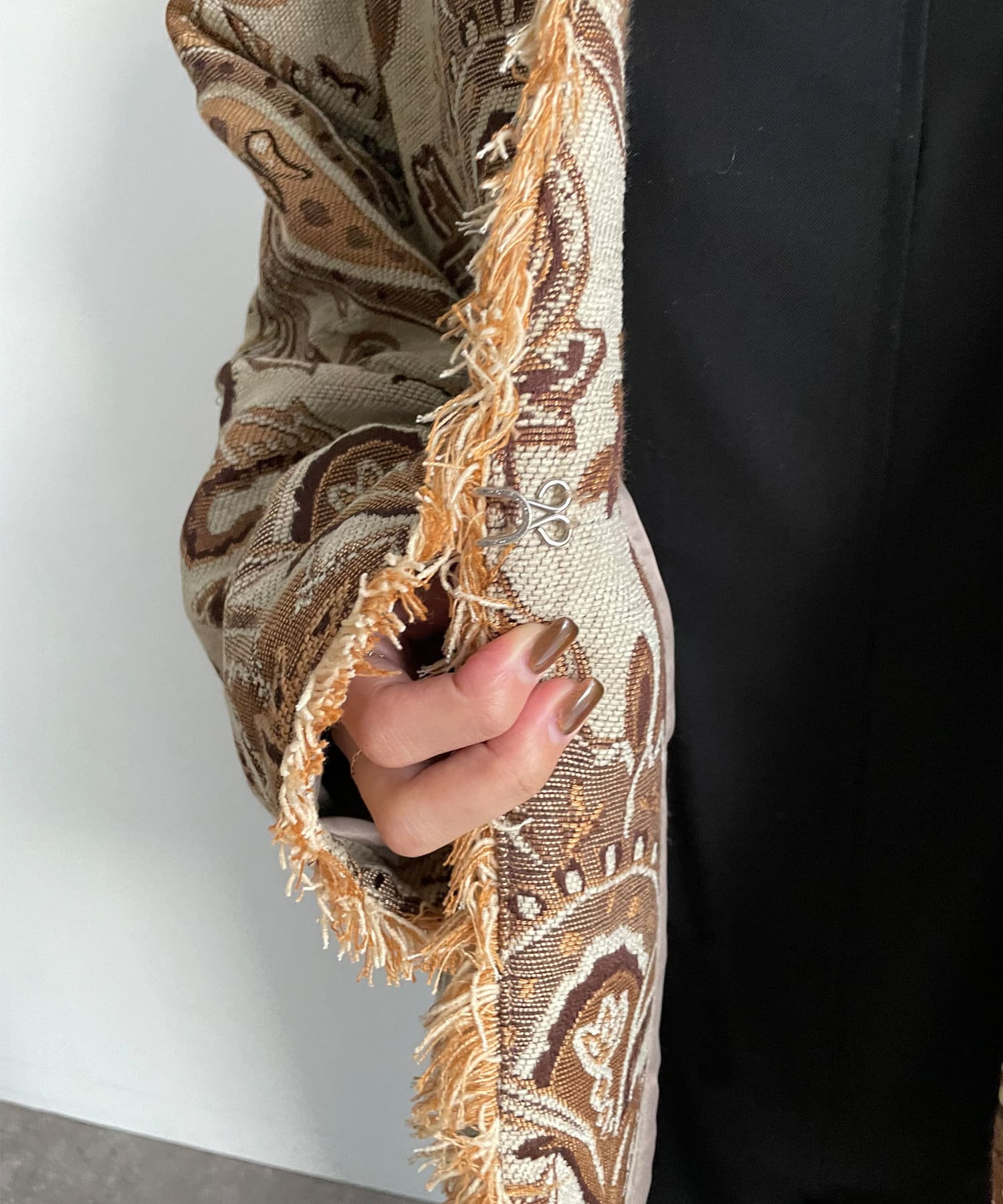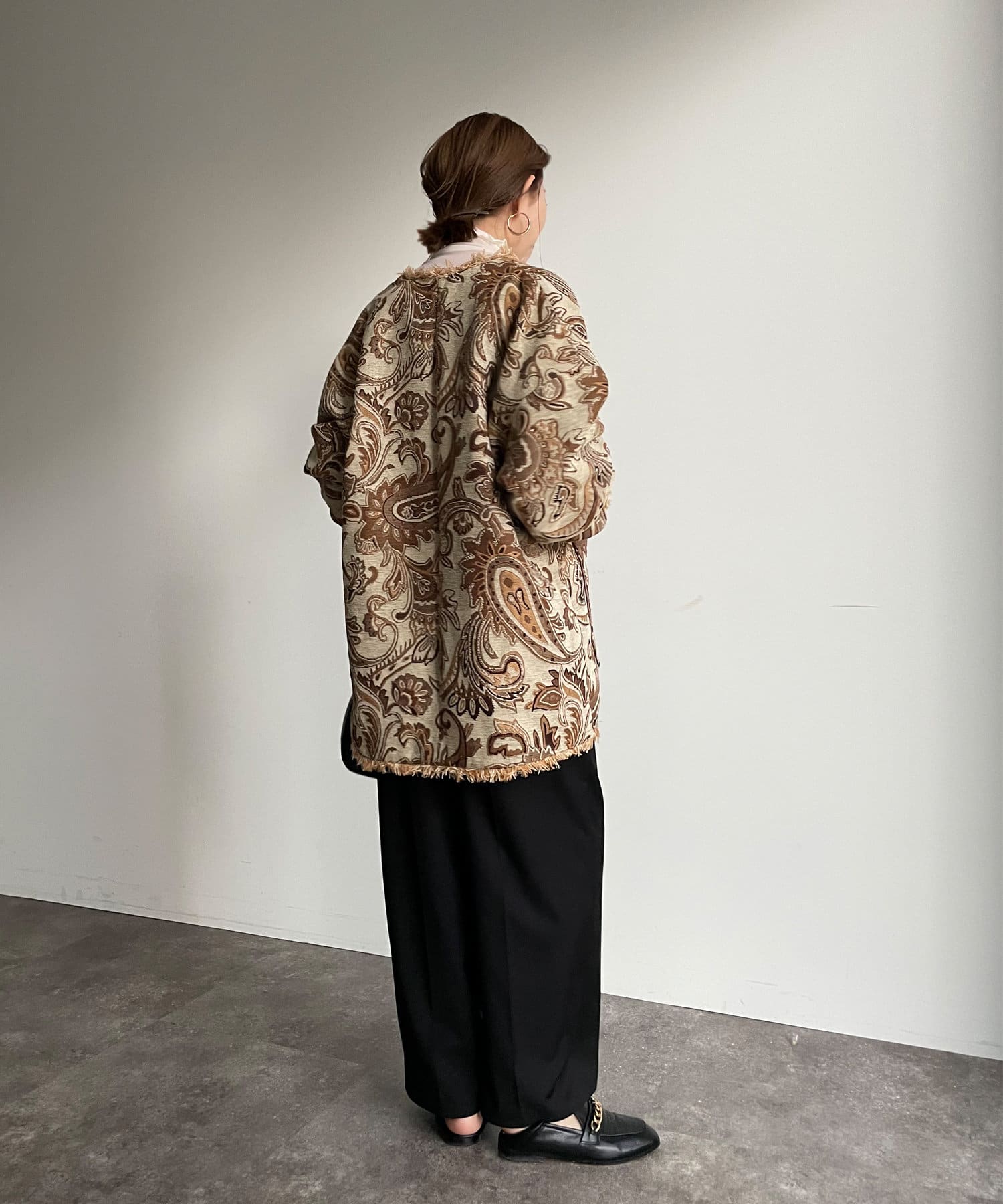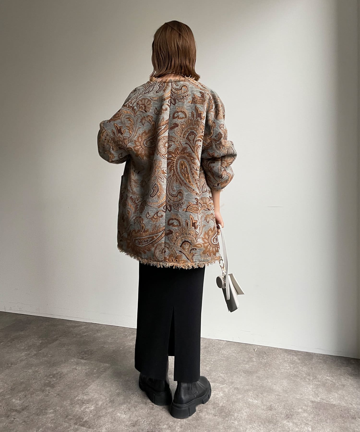 コーディネートを華やかにしてくれるゴブラン柄のコート。
