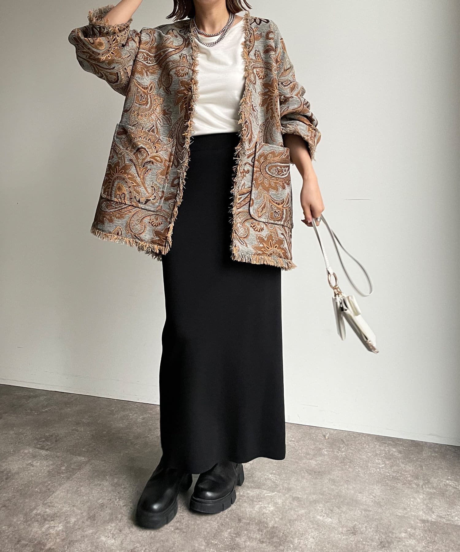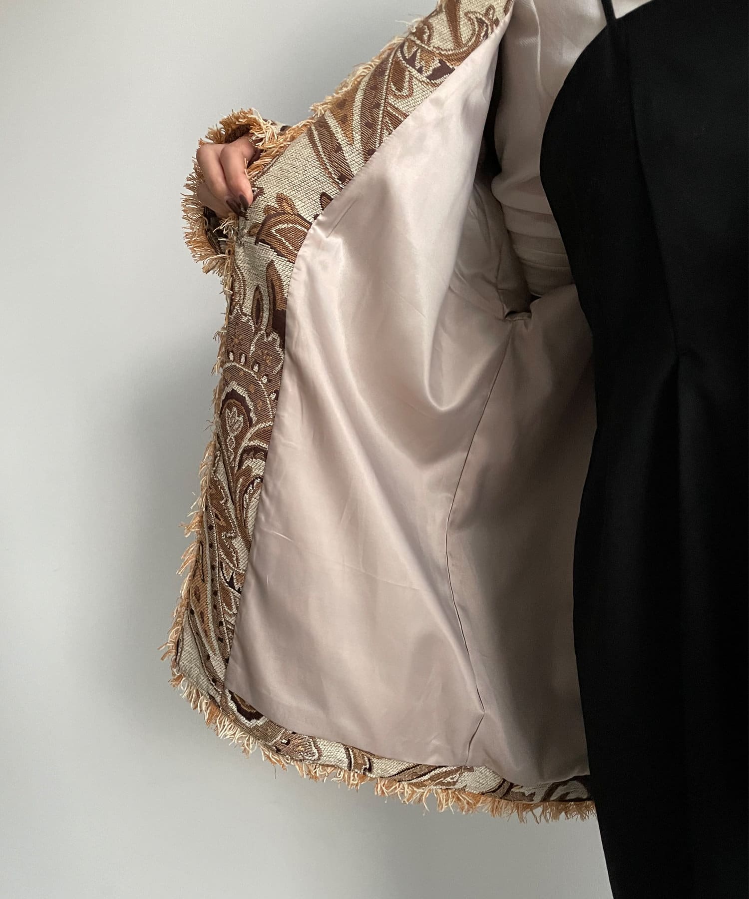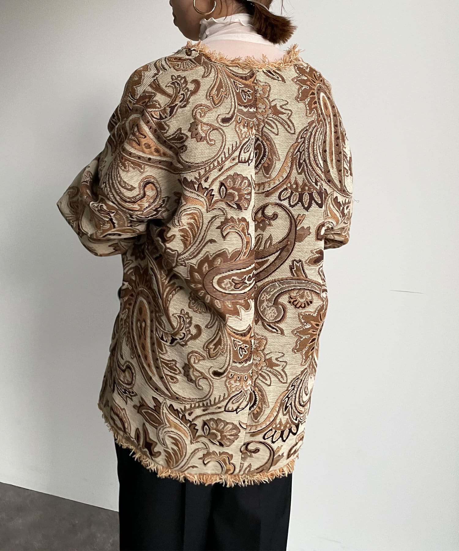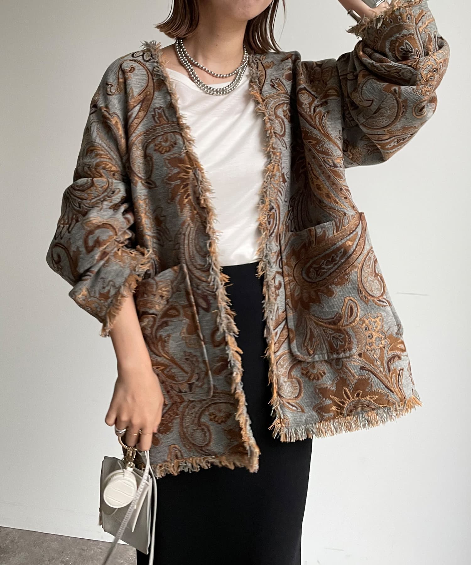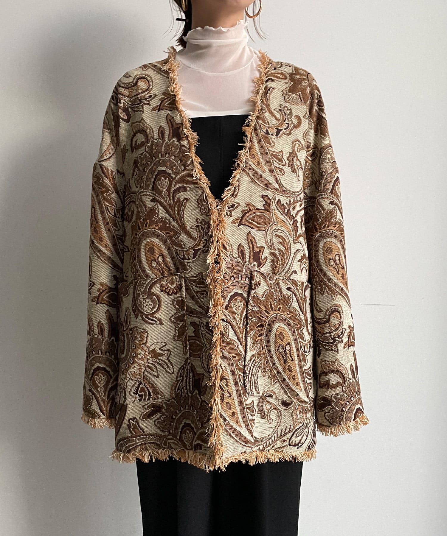 コーディネートを華やかにしてくれるゴブラン柄のコート。