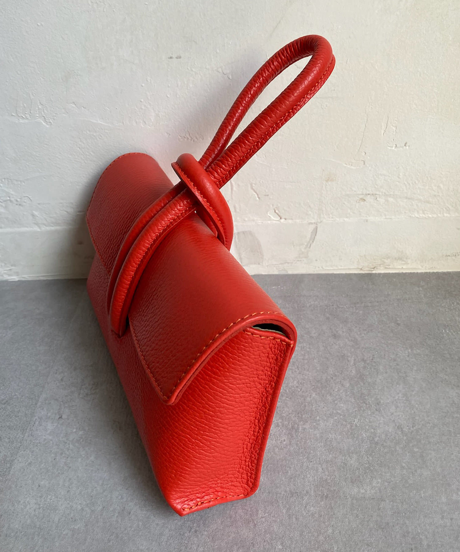 四角くコンパクトなフォルムでループになったハンドルがモダンなバッグ。