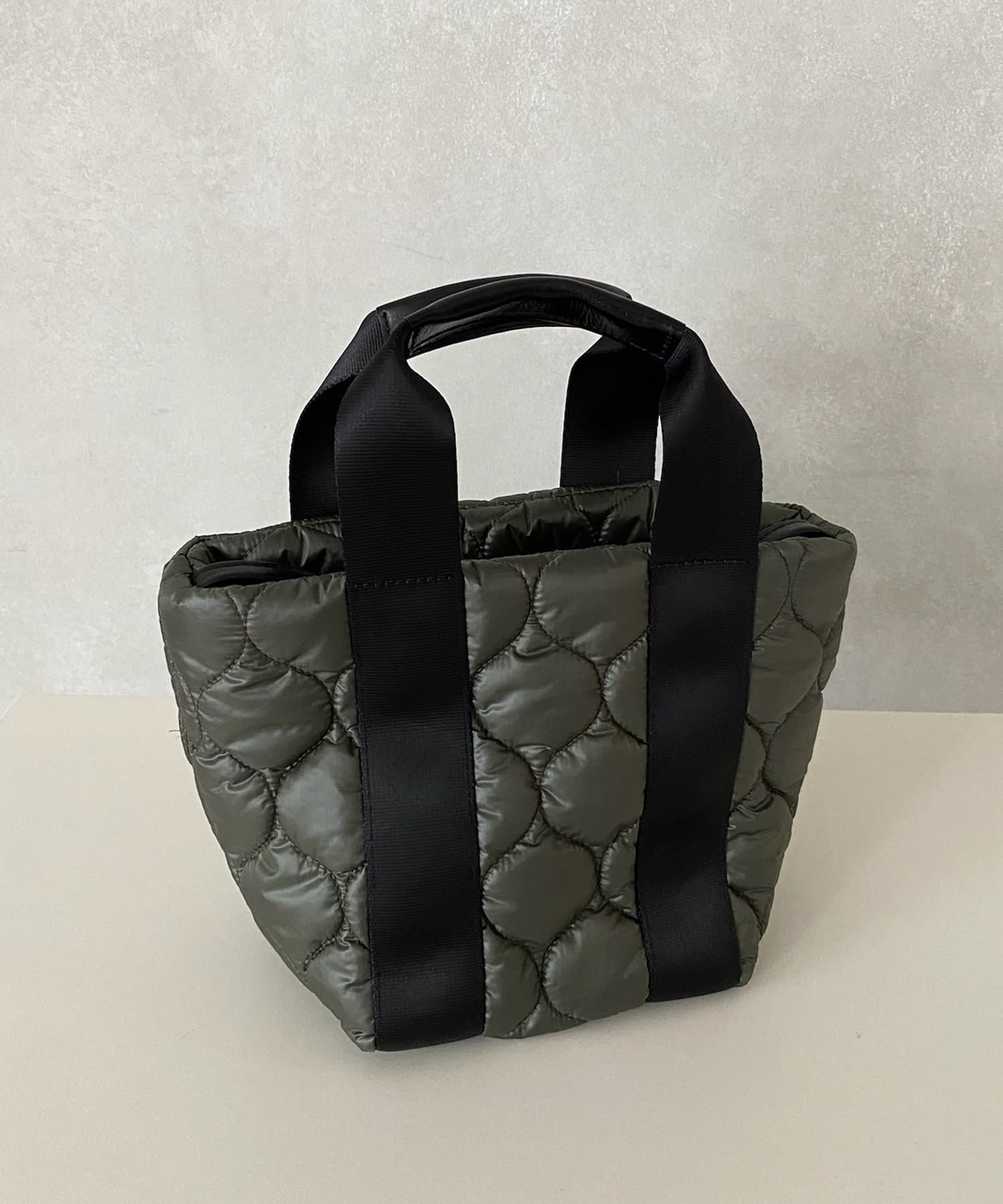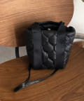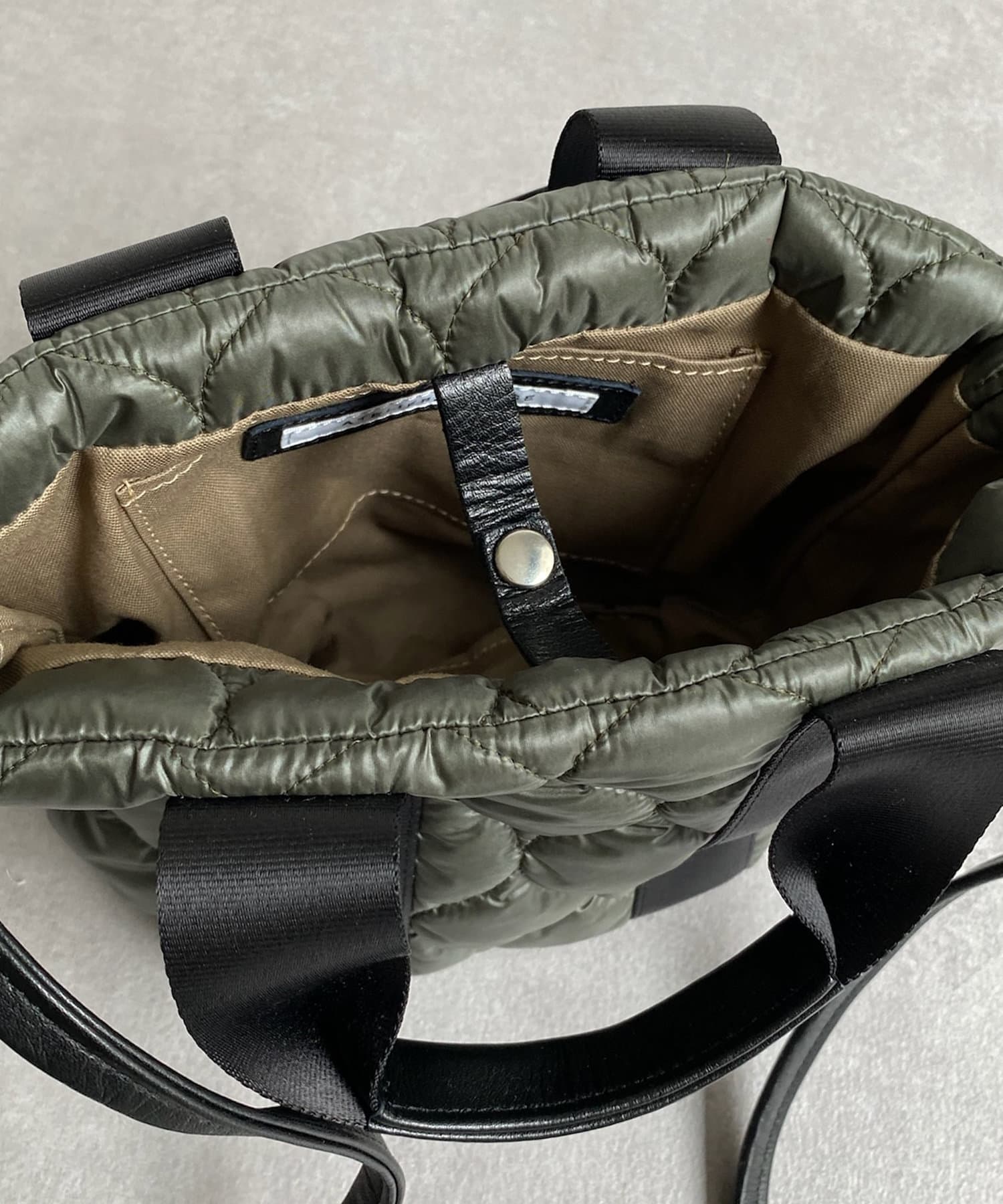 無地なデザインながらも、キルティングの素材感がスタイリングの完成度をぐっと高め、本革のショルダー紐が上品さをプラスしてくれるポイントに。