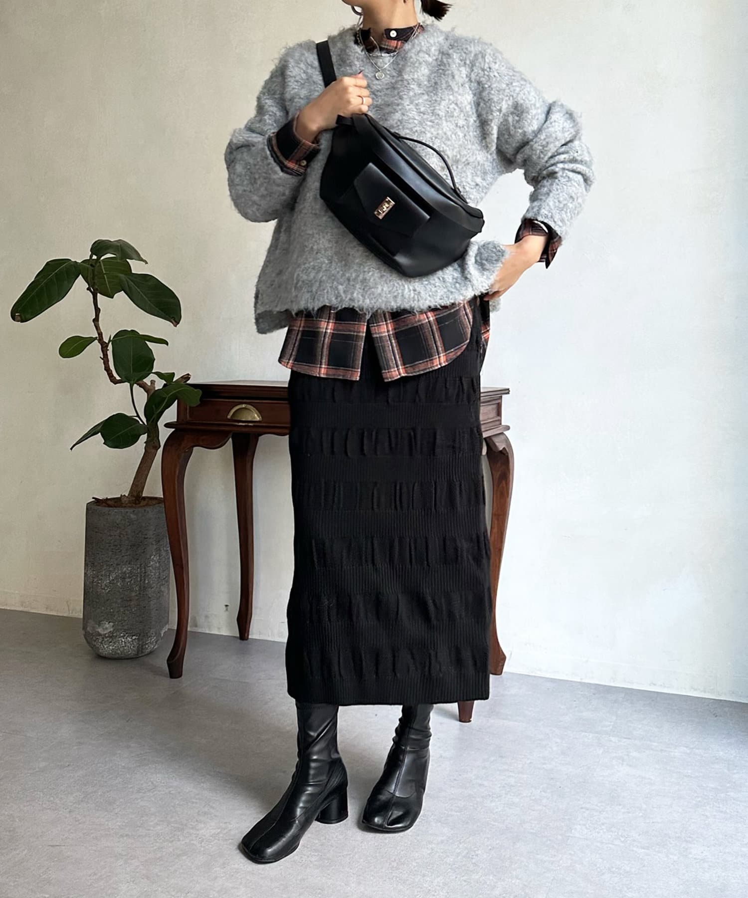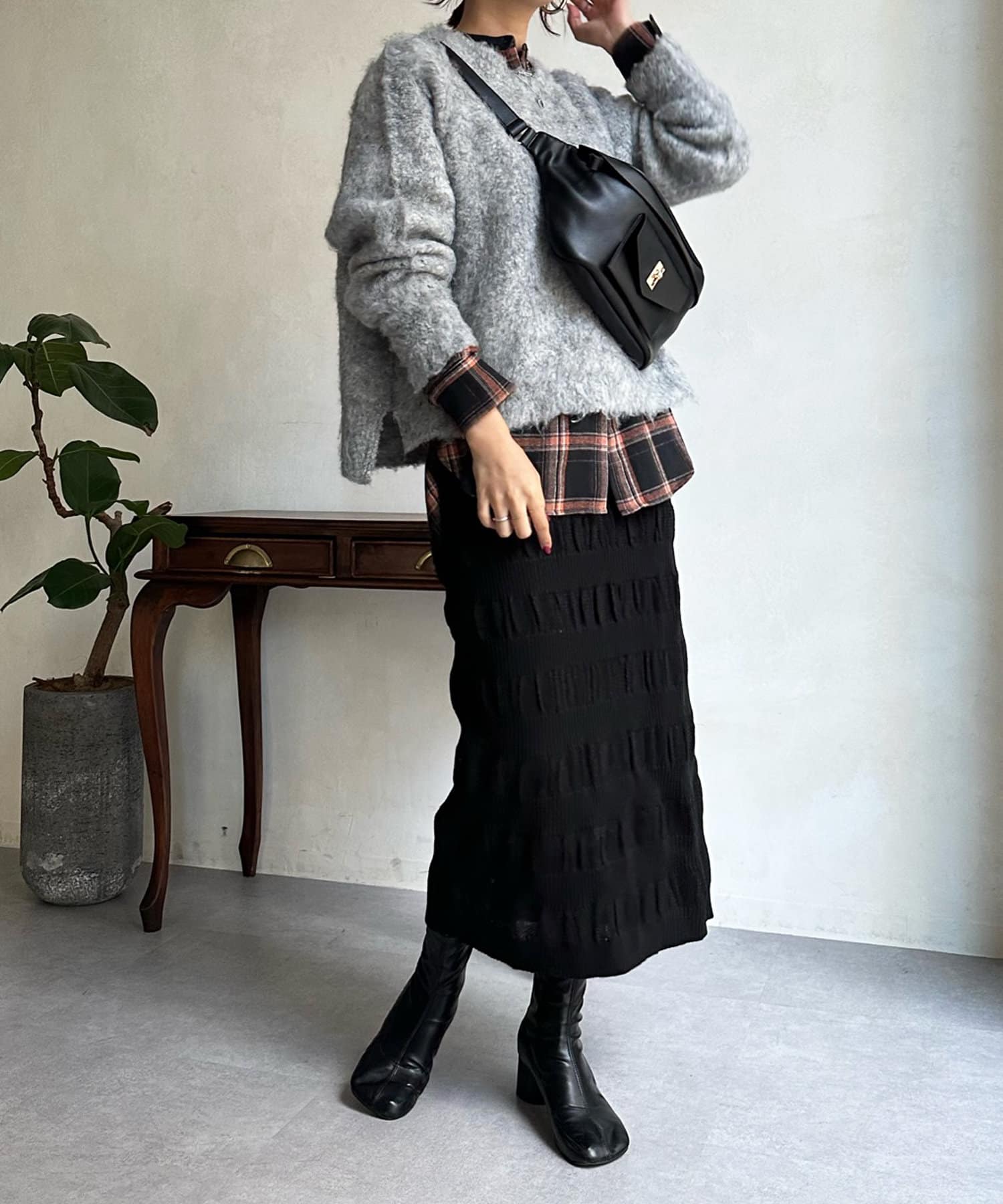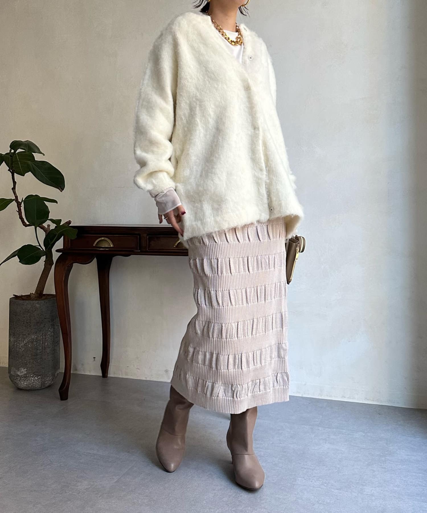 表情感のある生地感が、シンプルなスタイリングのサマ見えポイントとなってくれます。