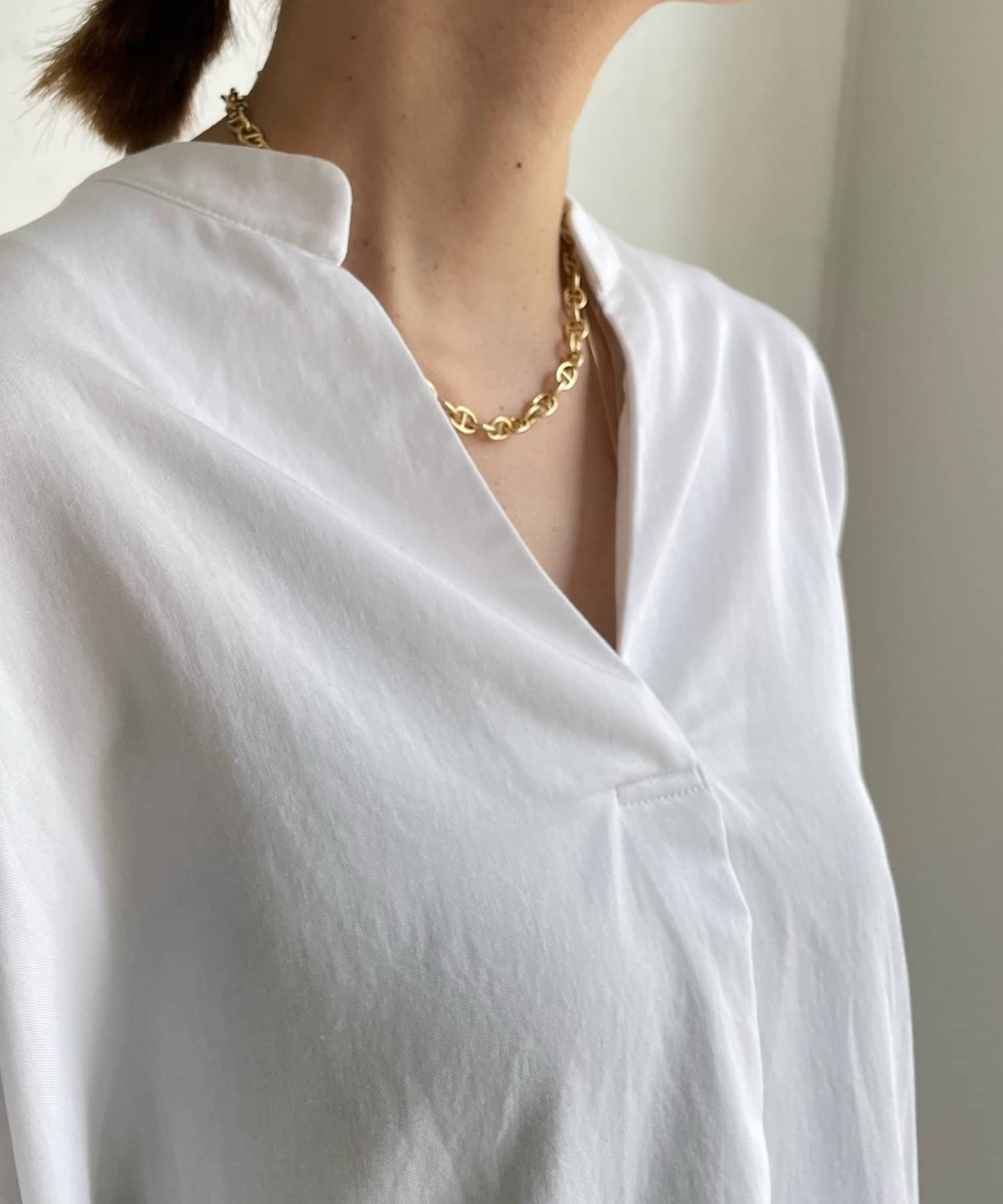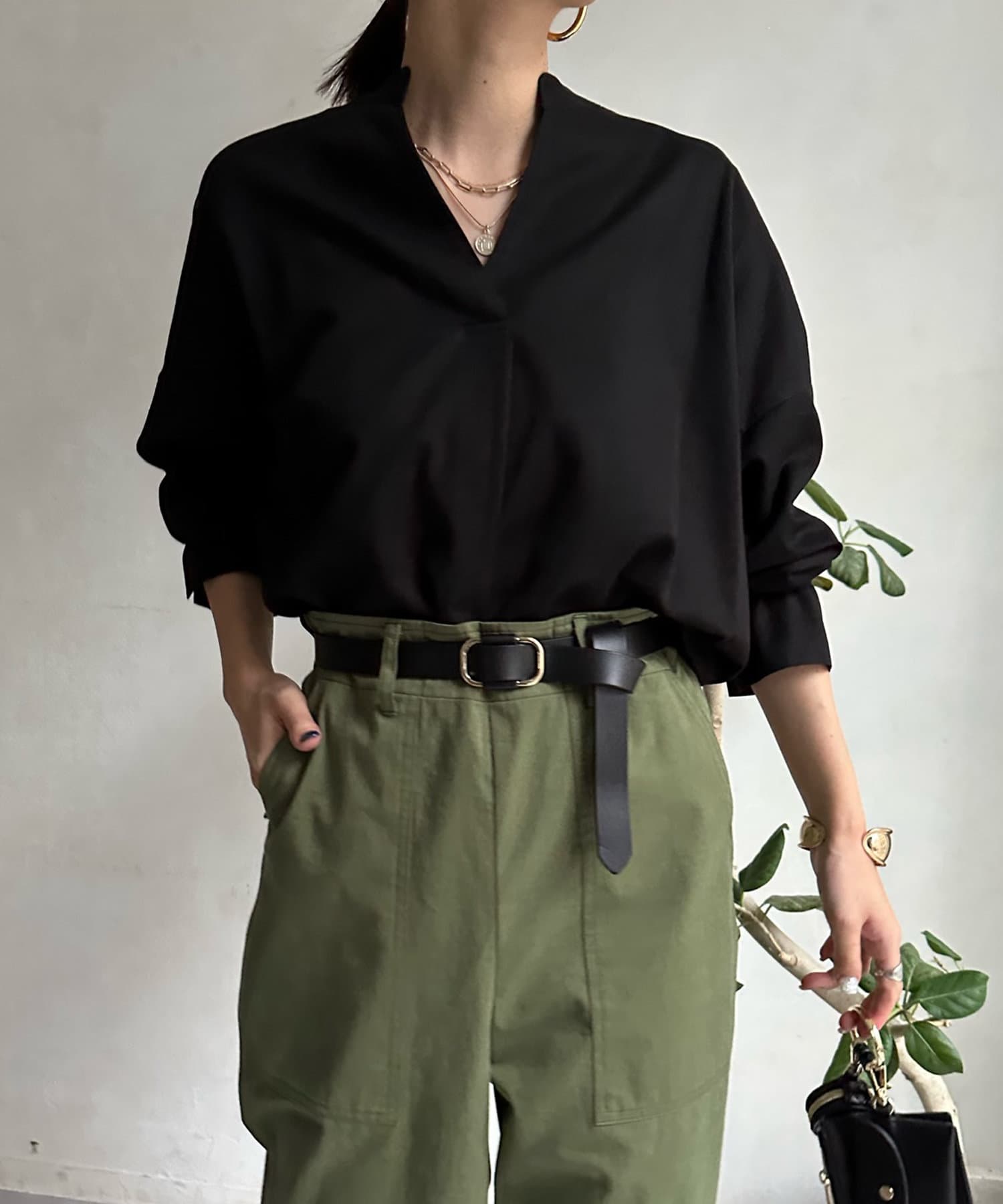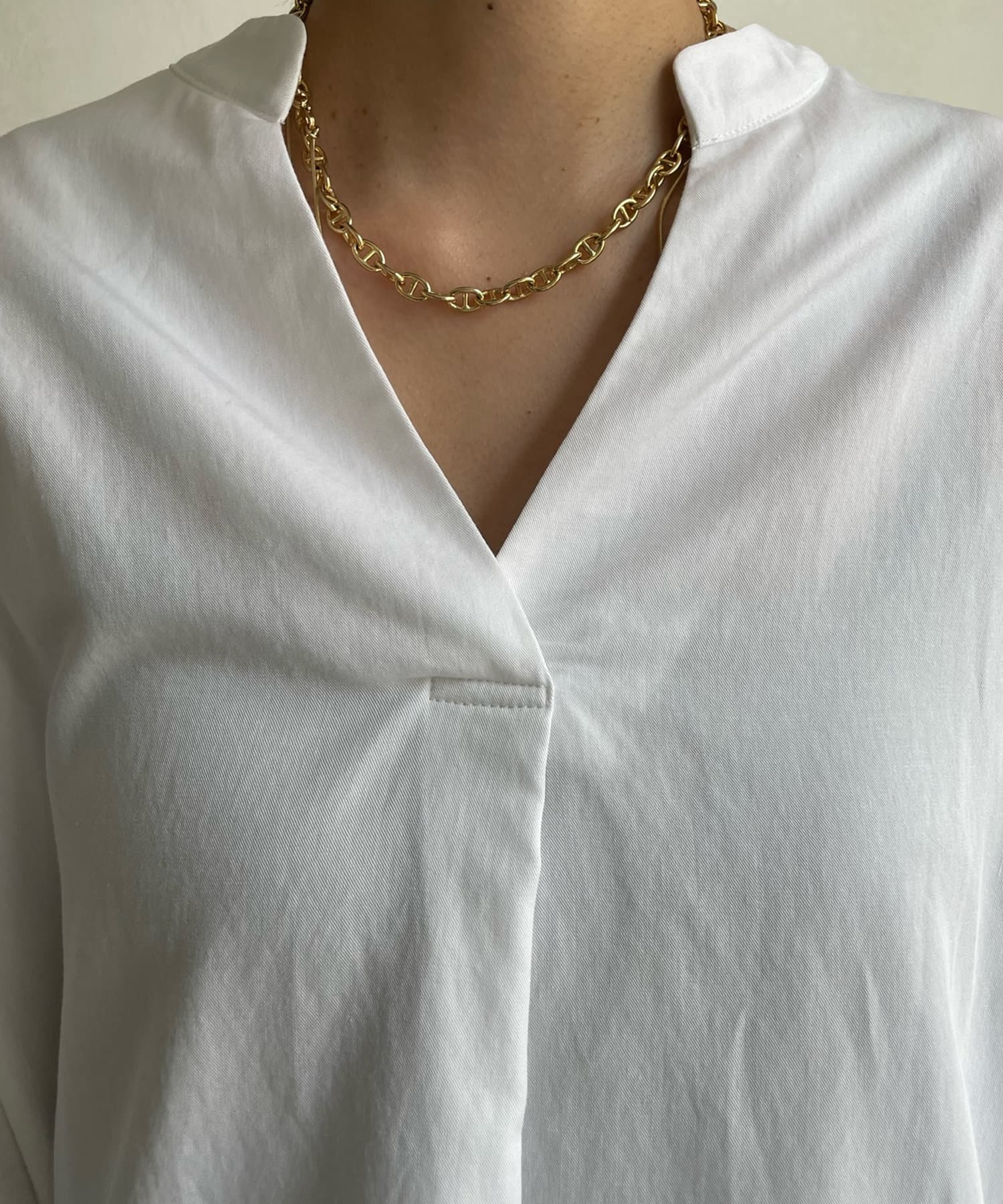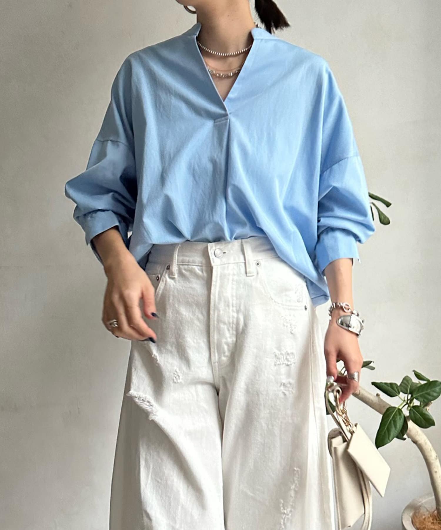 首元のスキッパーデザインは大人な雰囲気を醸し、ショートネックレスなどとも相性抜群。ぜひお手持ちのお気に入りアクセサリー合わせでお楽しみください。