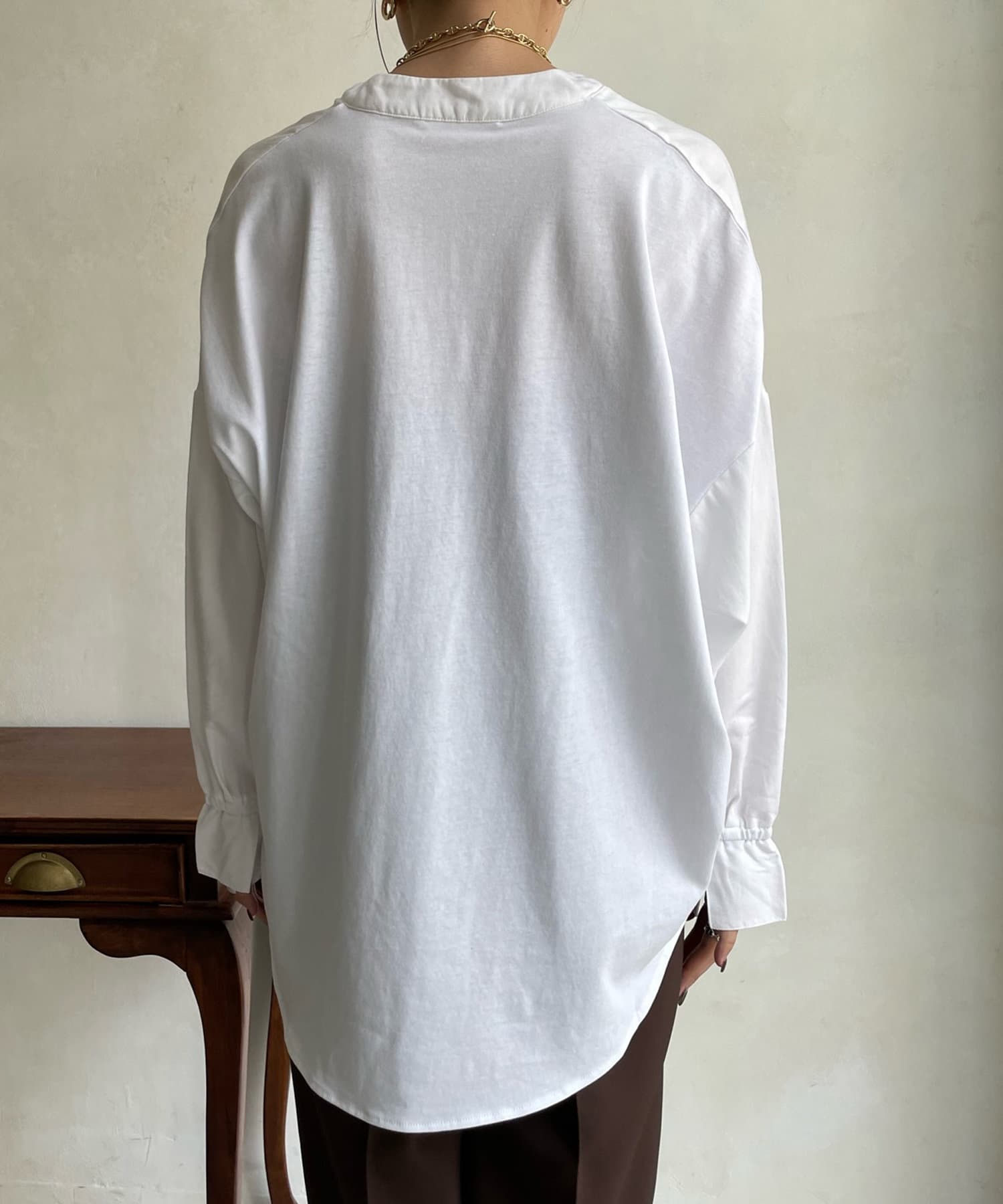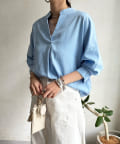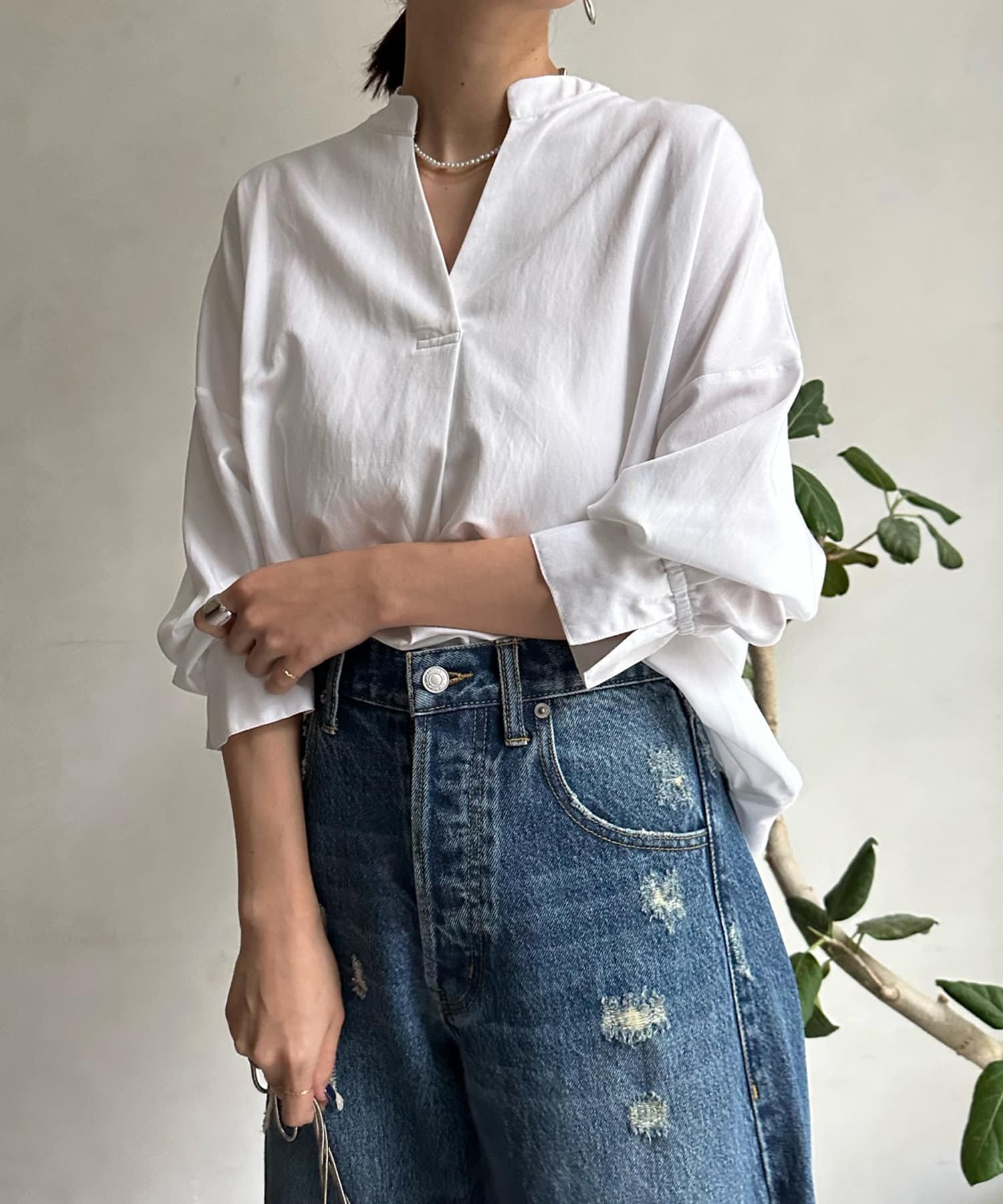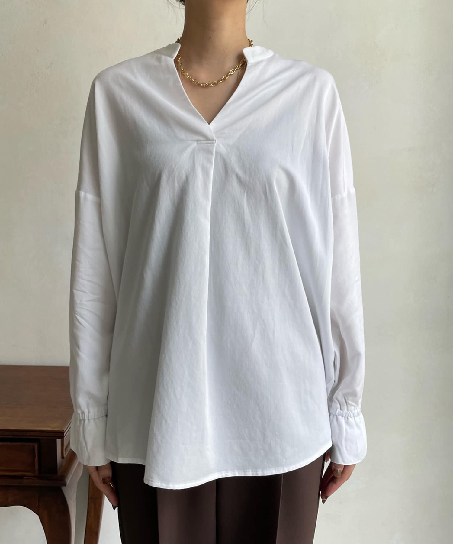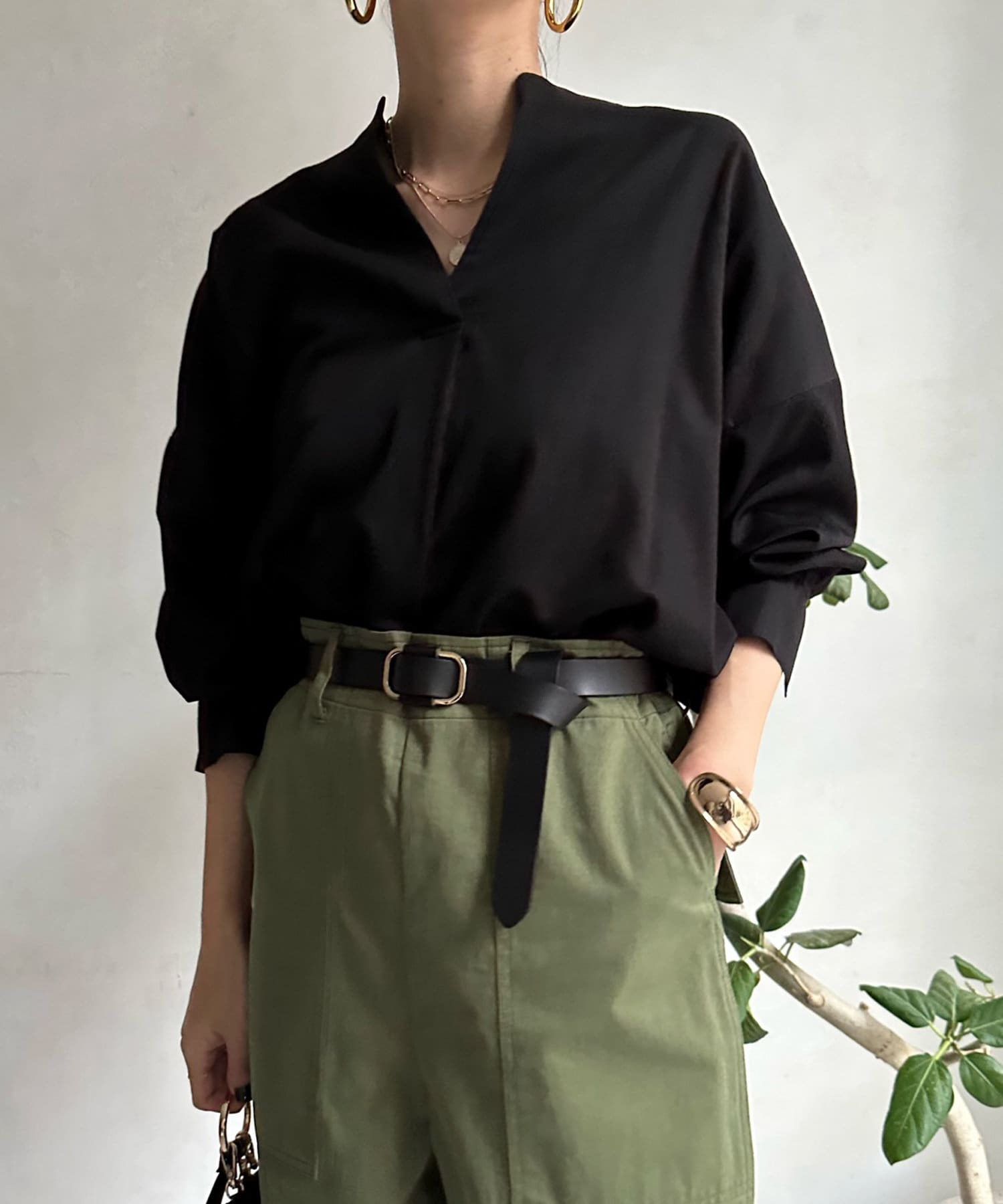 首元のスキッパーデザインは大人な雰囲気を醸し、ショートネックレスなどとも相性抜群。ぜひお手持ちのお気に入りアクセサリー合わせでお楽しみください。