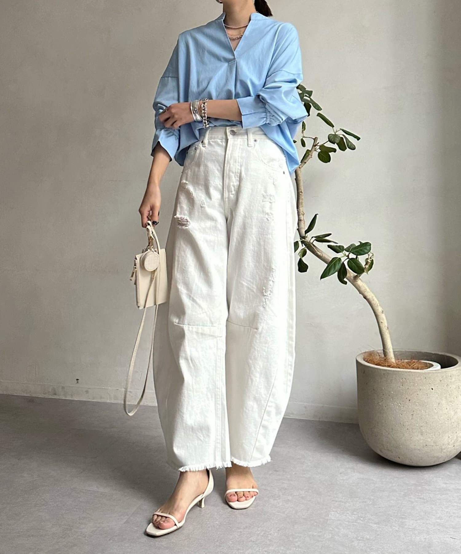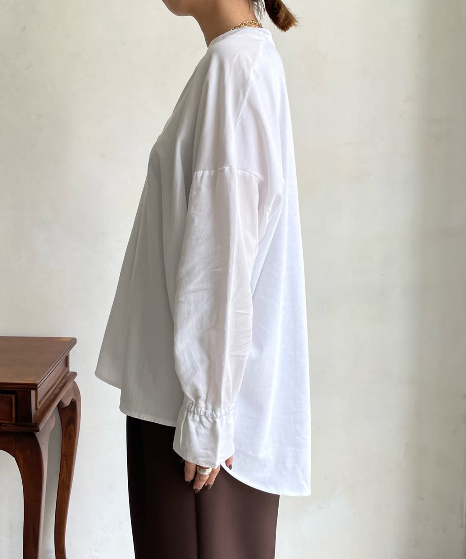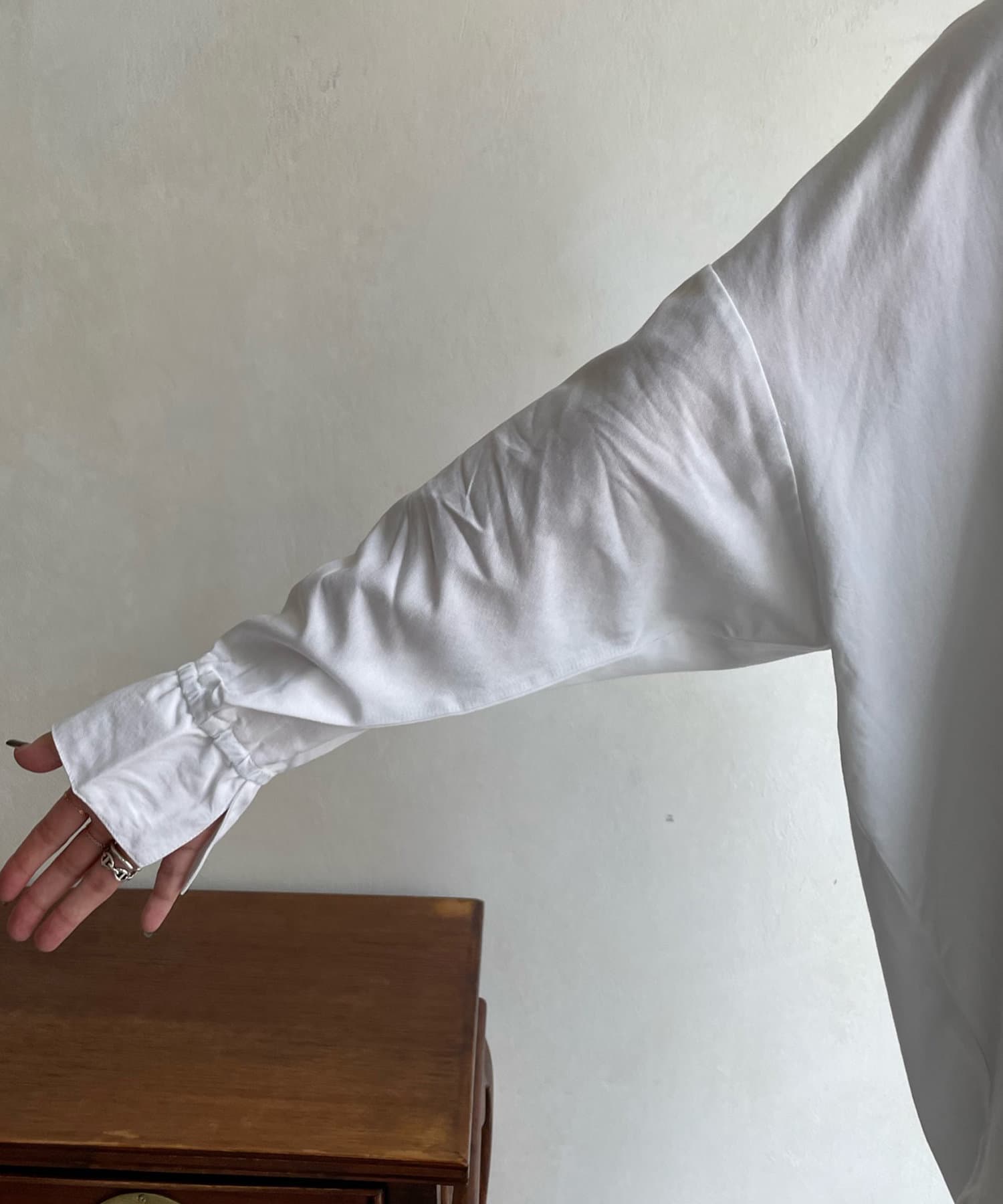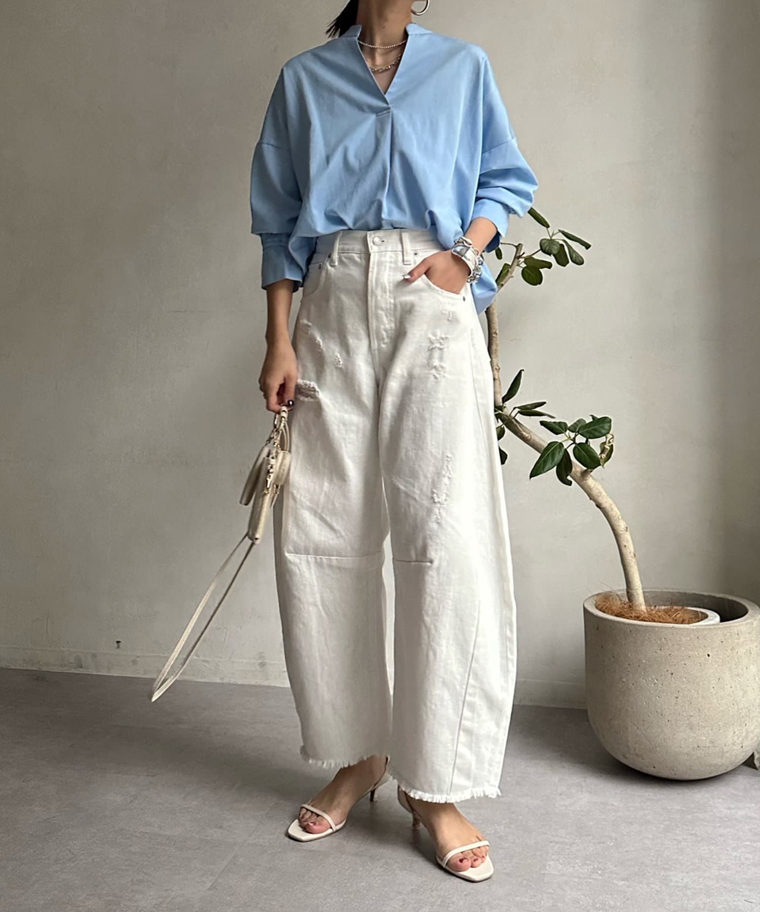 首元のスキッパーデザインは大人な雰囲気を醸し、ショートネックレスなどとも相性抜群。ぜひお手持ちのお気に入りアクセサリー合わせでお楽しみください。