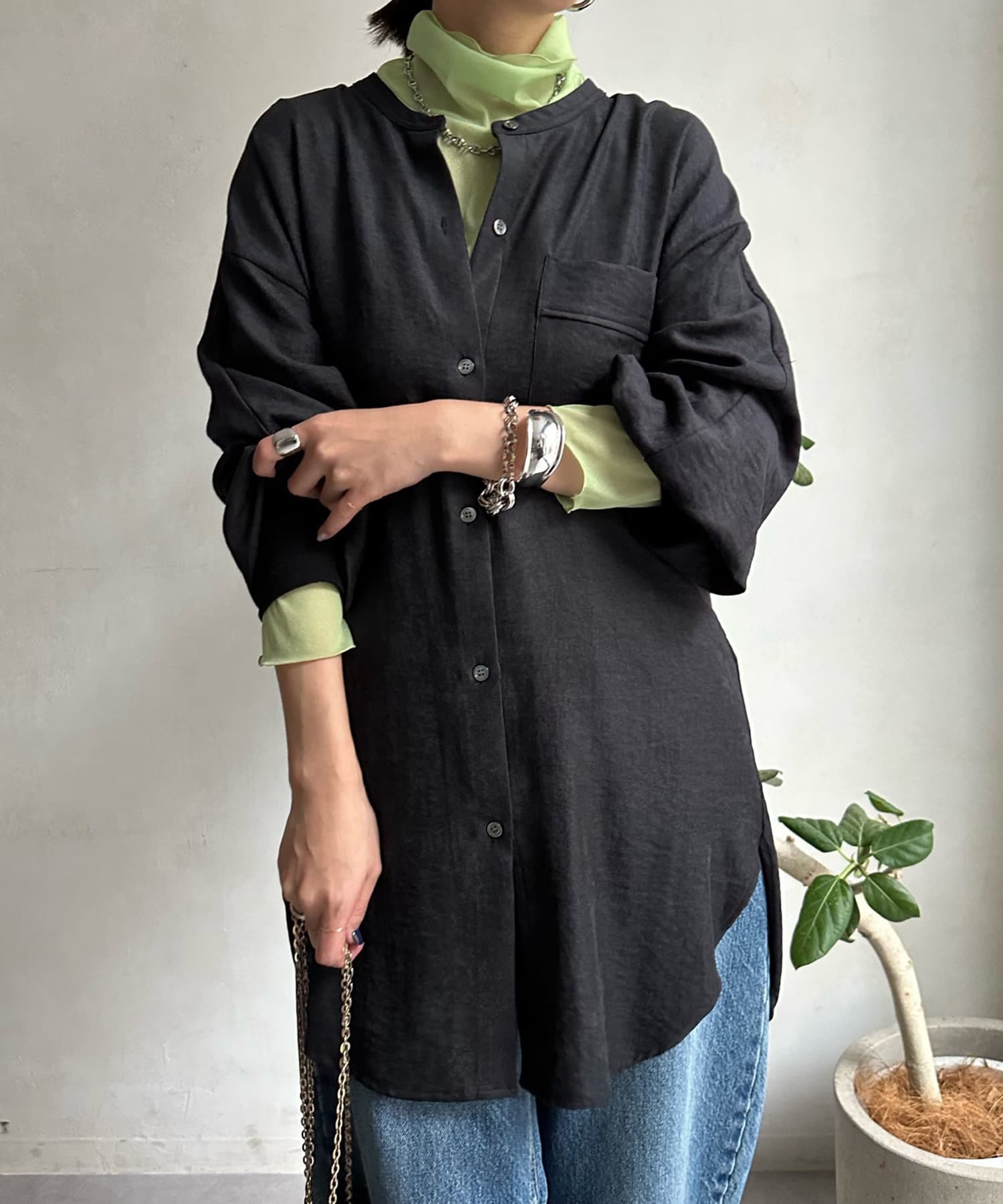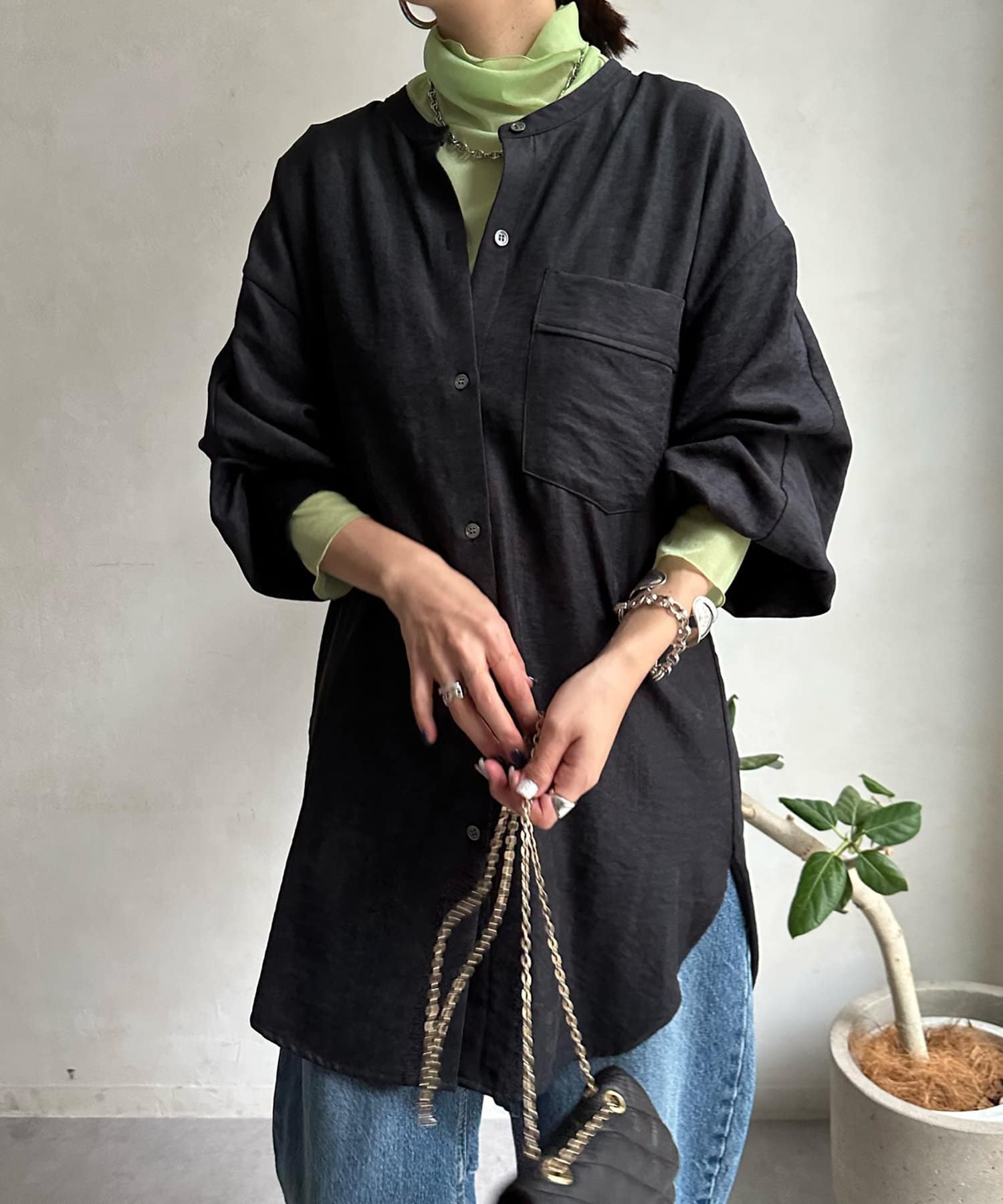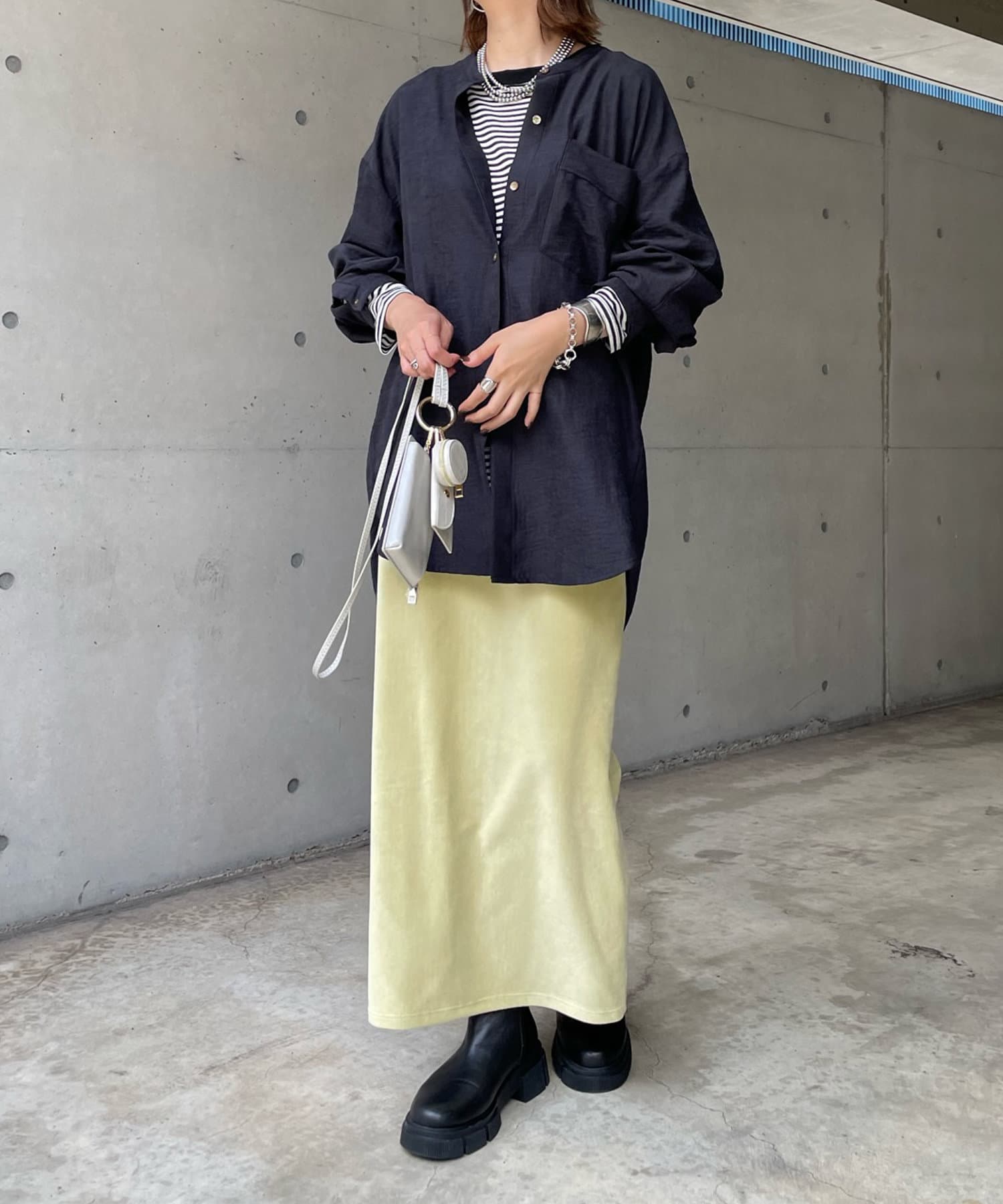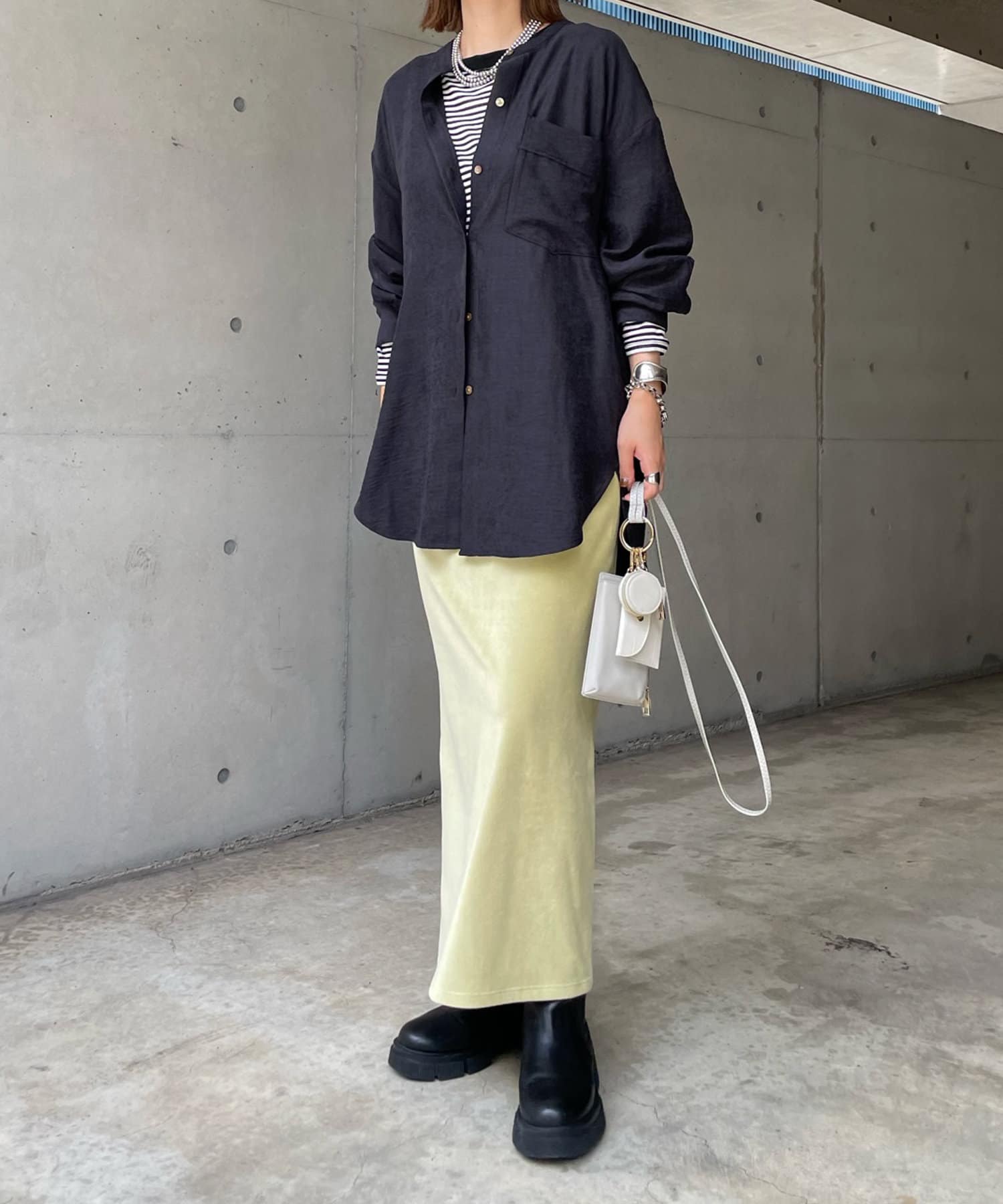 シルエットはゆるっとラフに着られるサイズ感のため、インナーを重ねたレイヤードコーデがおすすめです◎