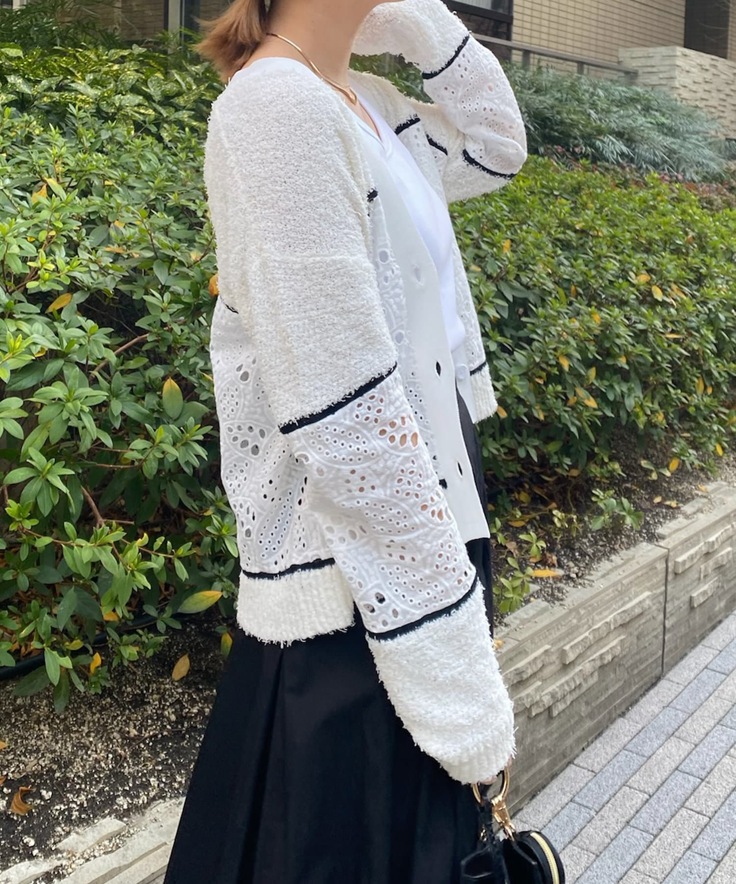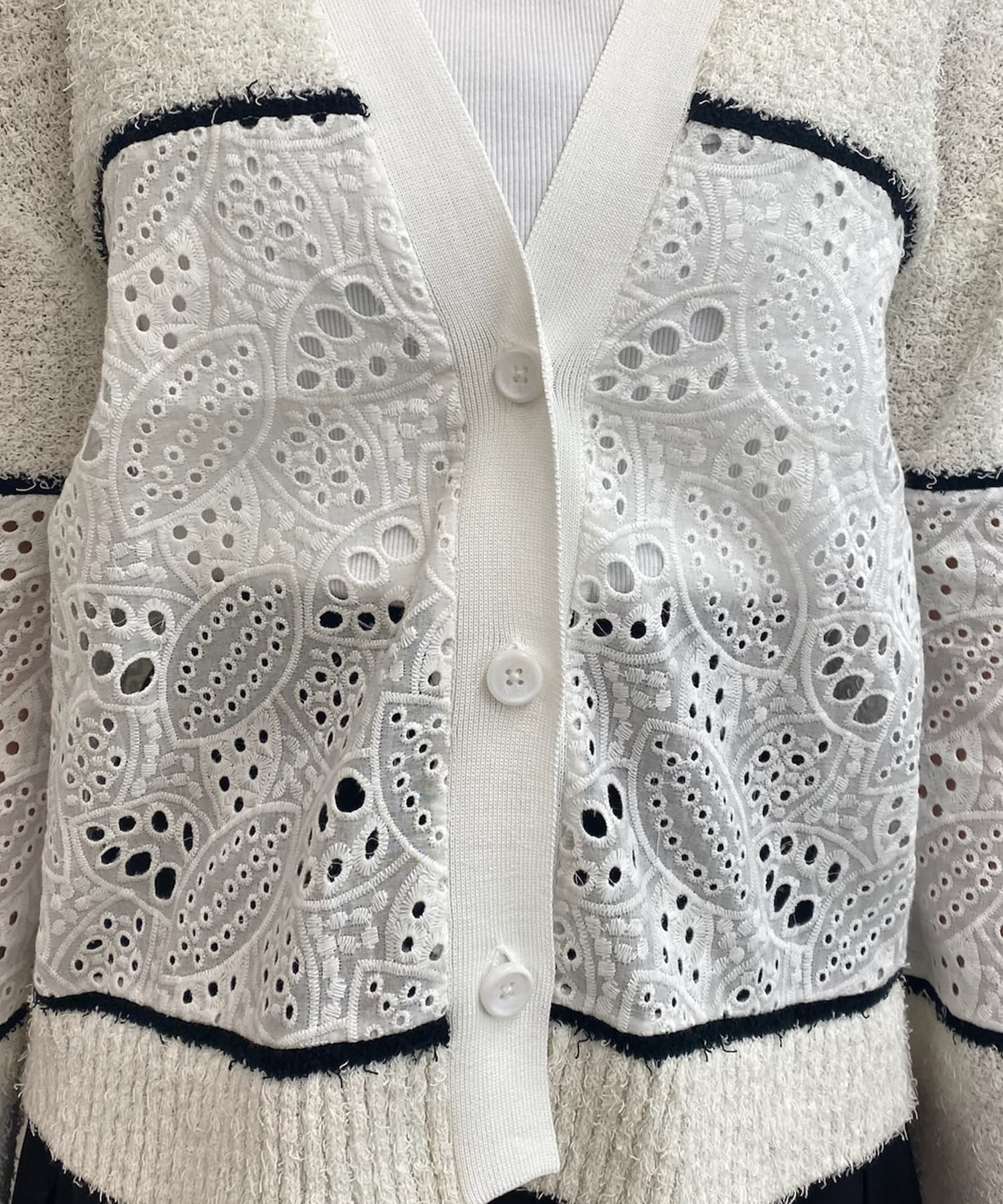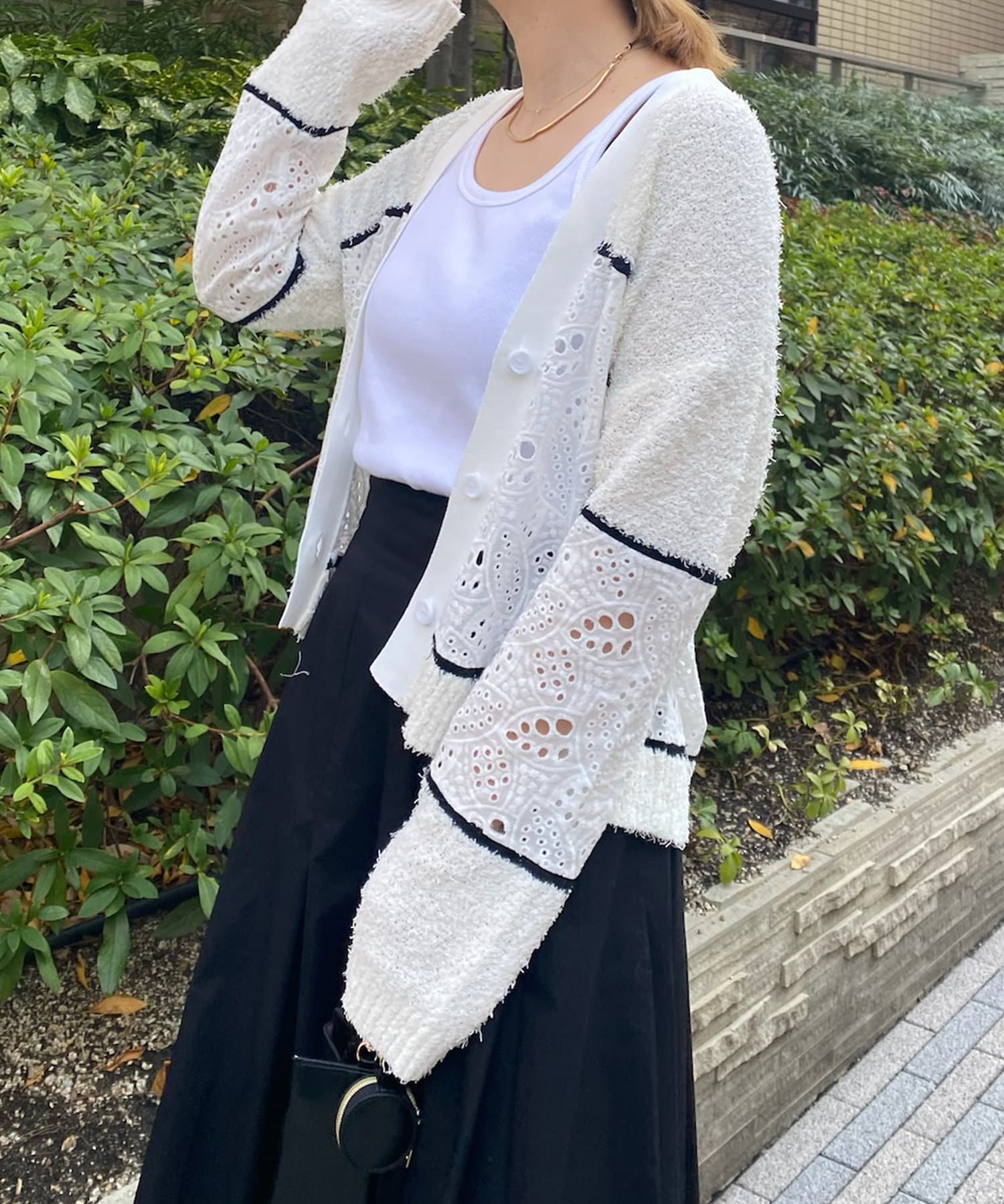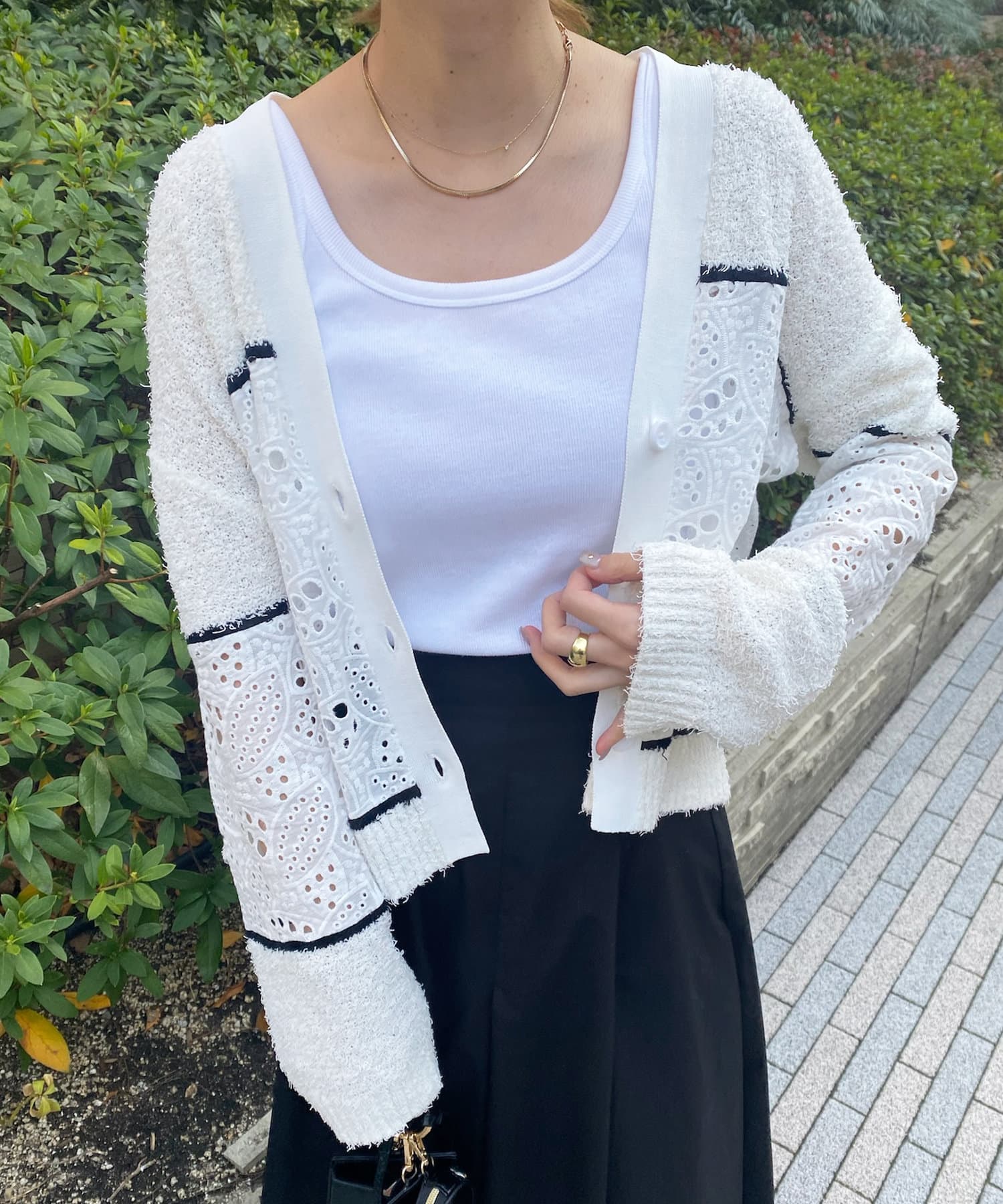 ナチュラルな雰囲気漂うコットンレースに切り替えたデザインがポイントのカーディガン。