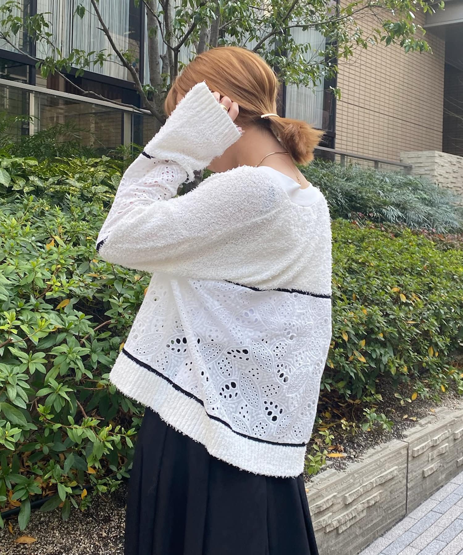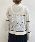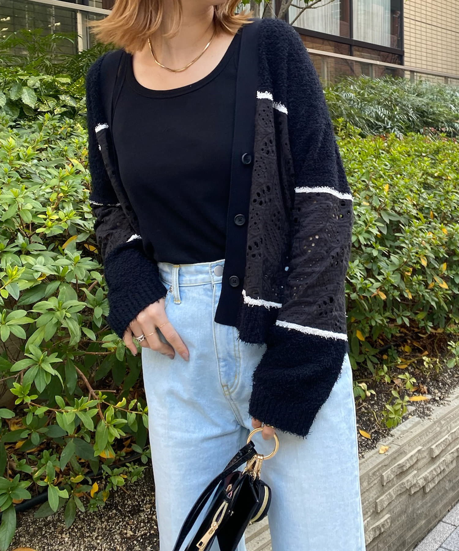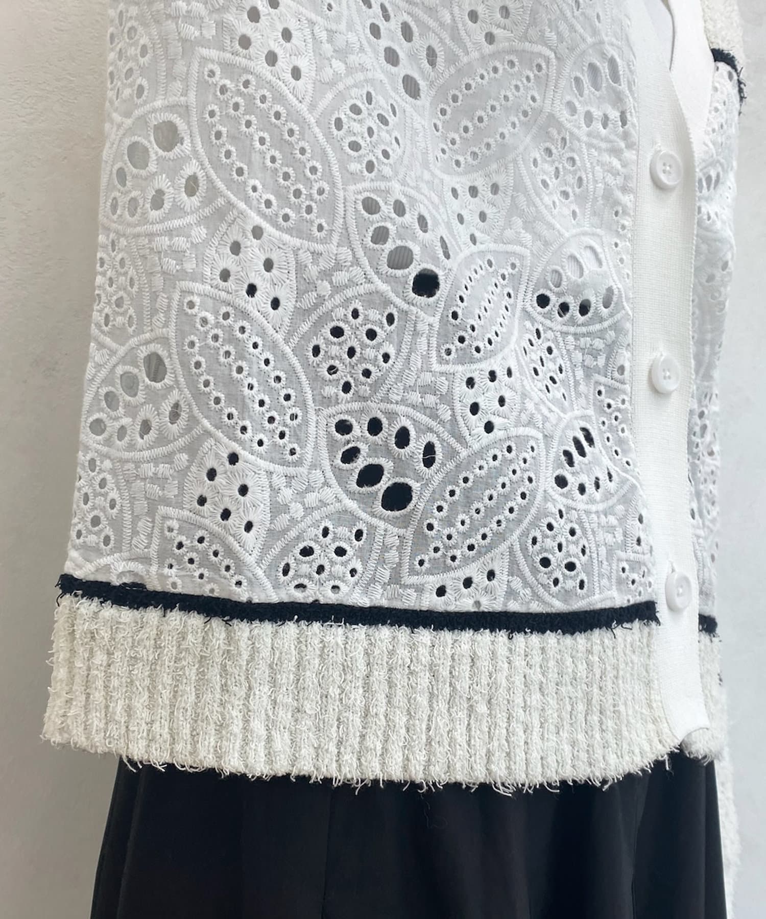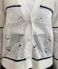ナチュラルな雰囲気漂うコットンレースに切り替えたデザインがポイントのカーディガン。