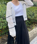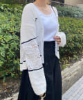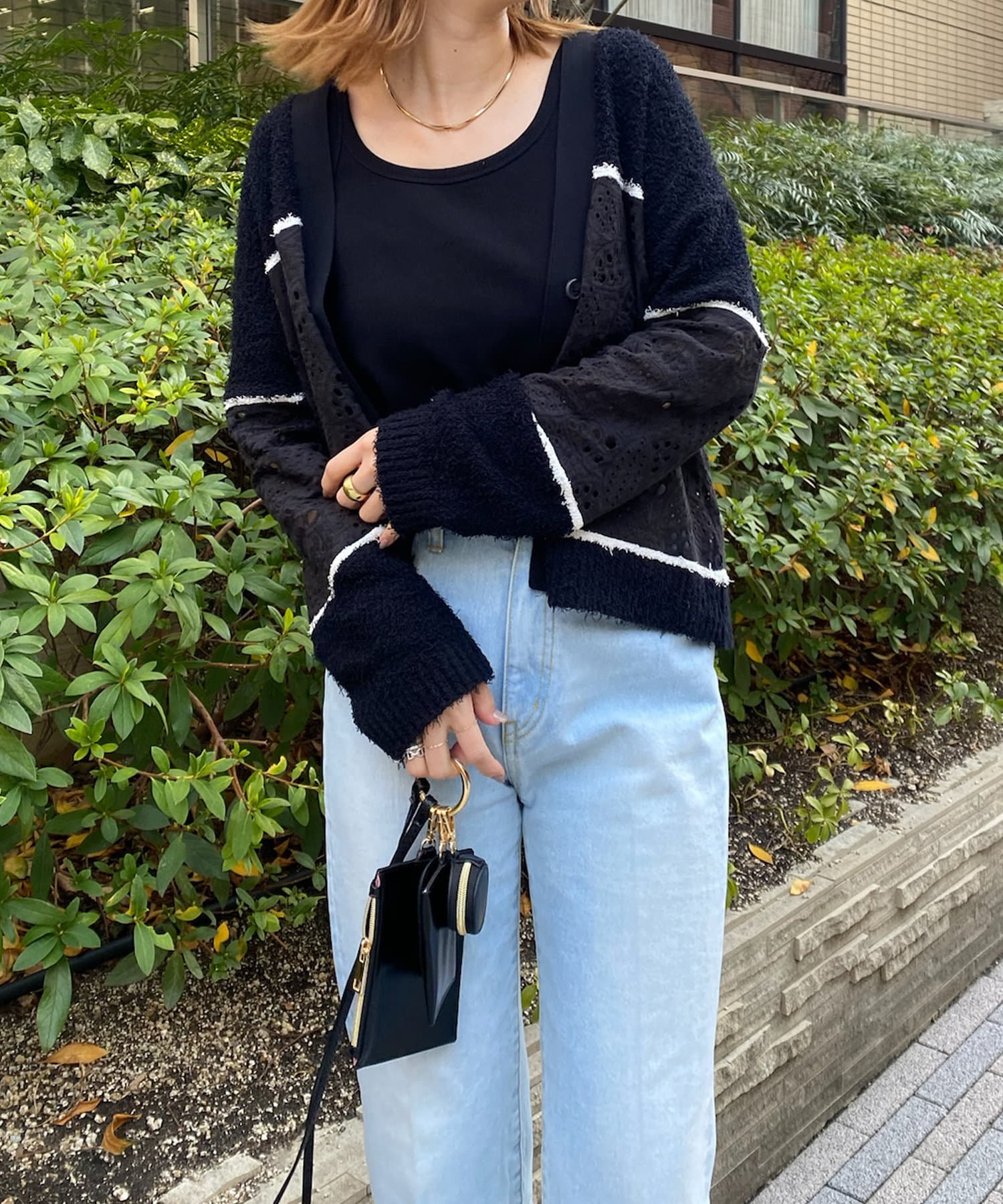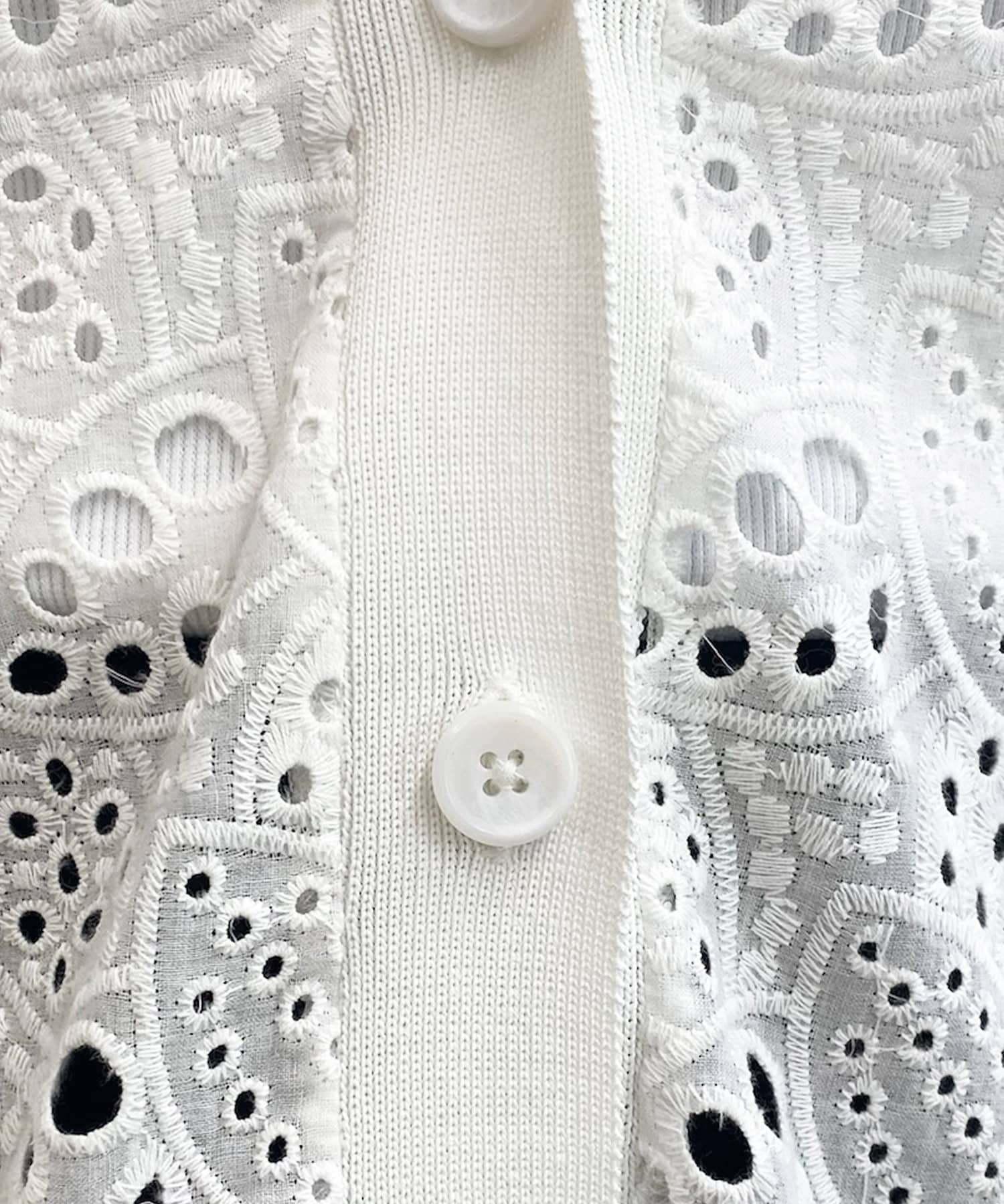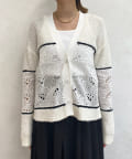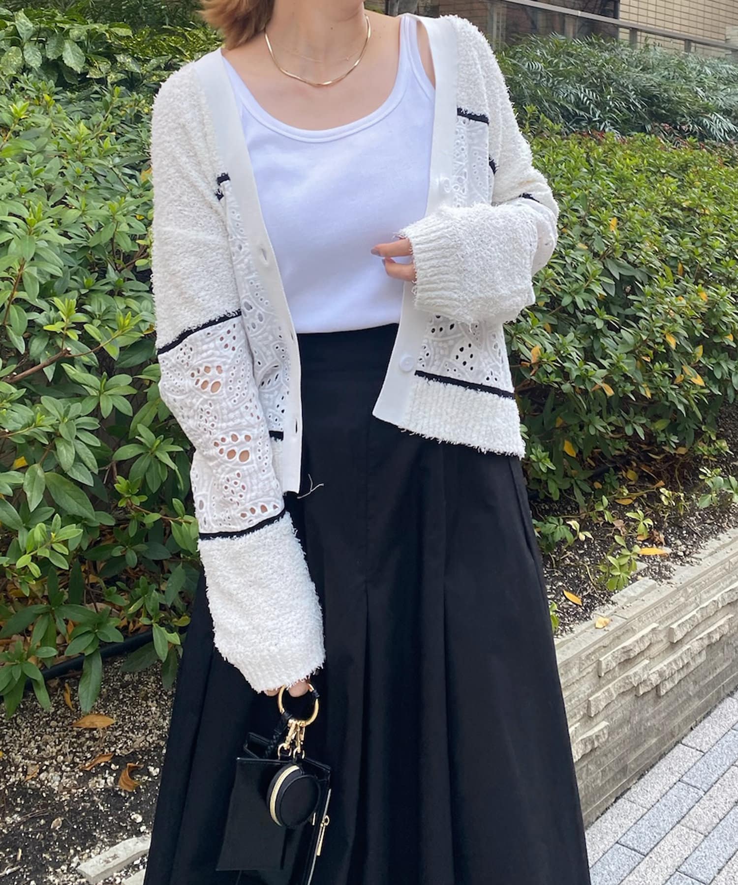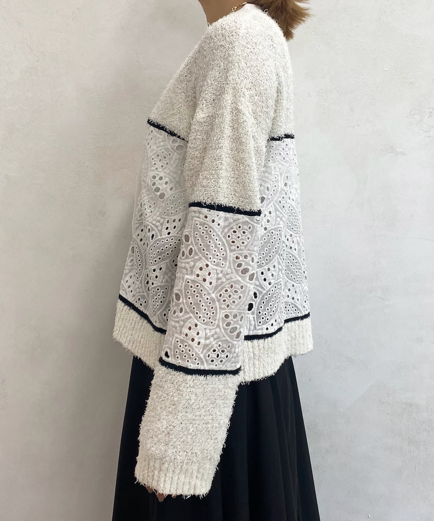 ナチュラルな雰囲気漂うコットンレースに切り替えたデザインがポイントのカーディガン。