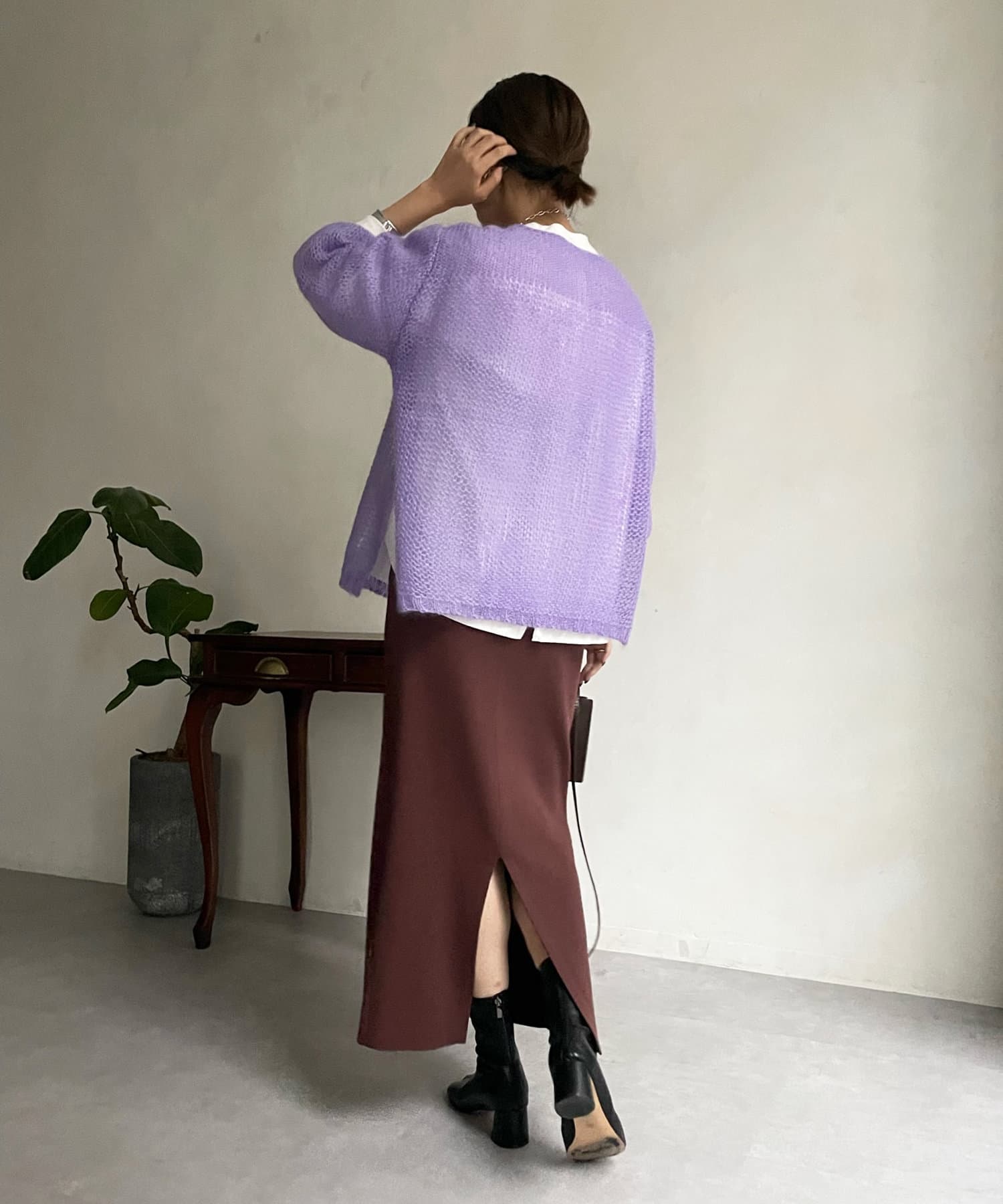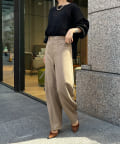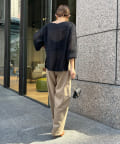 ネックラインはボートネックに仕上げ、サイドの裾にはスリットをオン。抜け感の出る仕様に仕上げました。