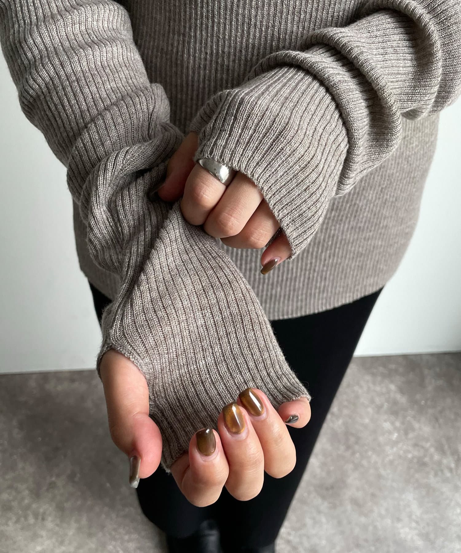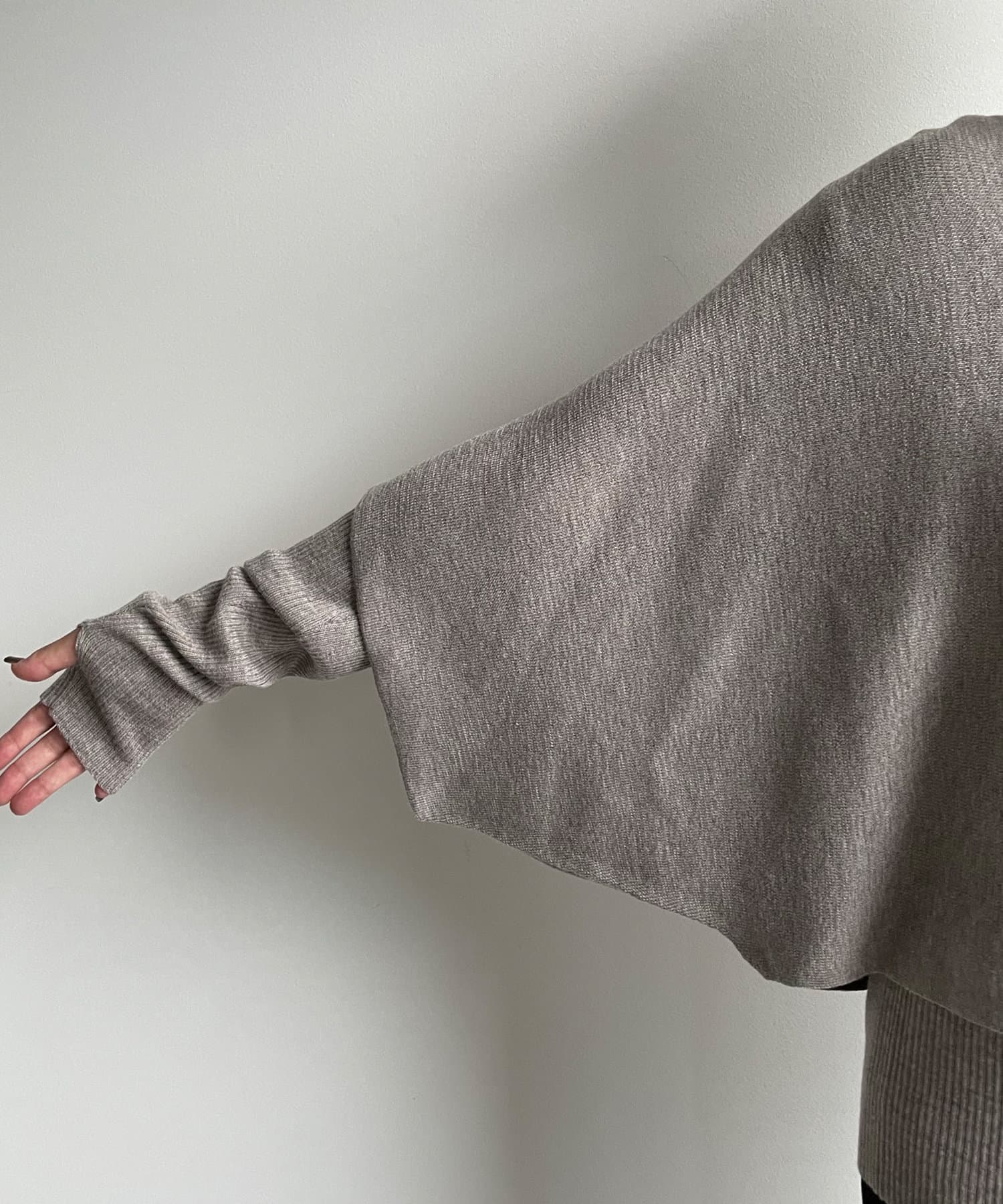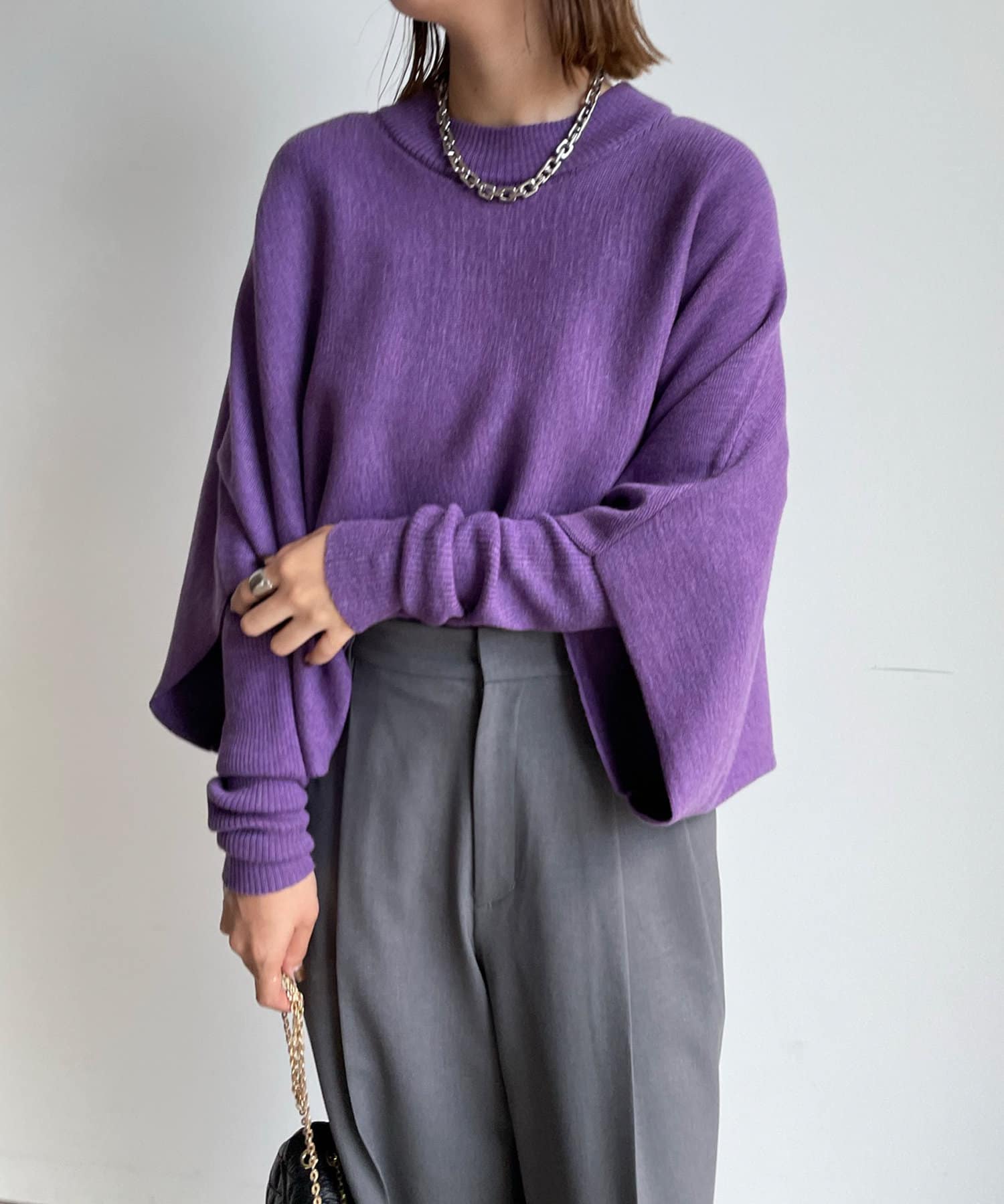 ポンチョニットはコンパクトな丈感が、リブニットはフィンガーホールのある長めの袖デザインが今っぽいトレンド感も◎