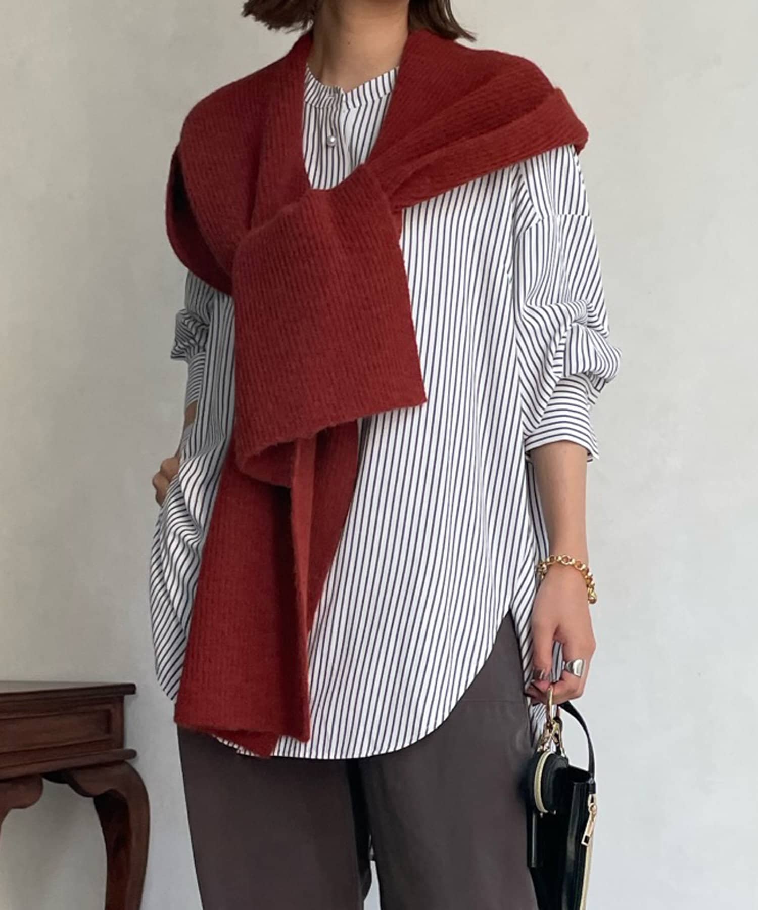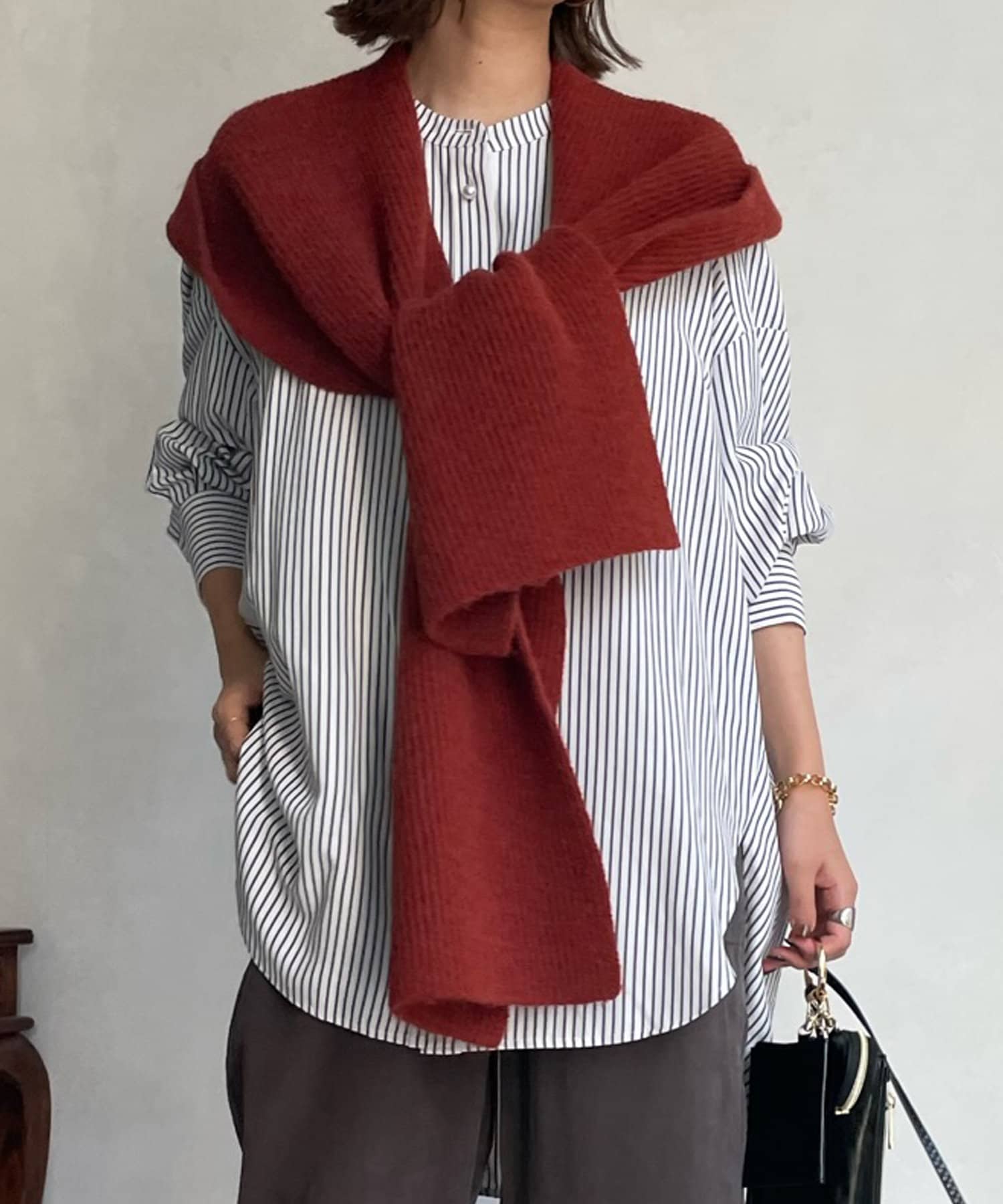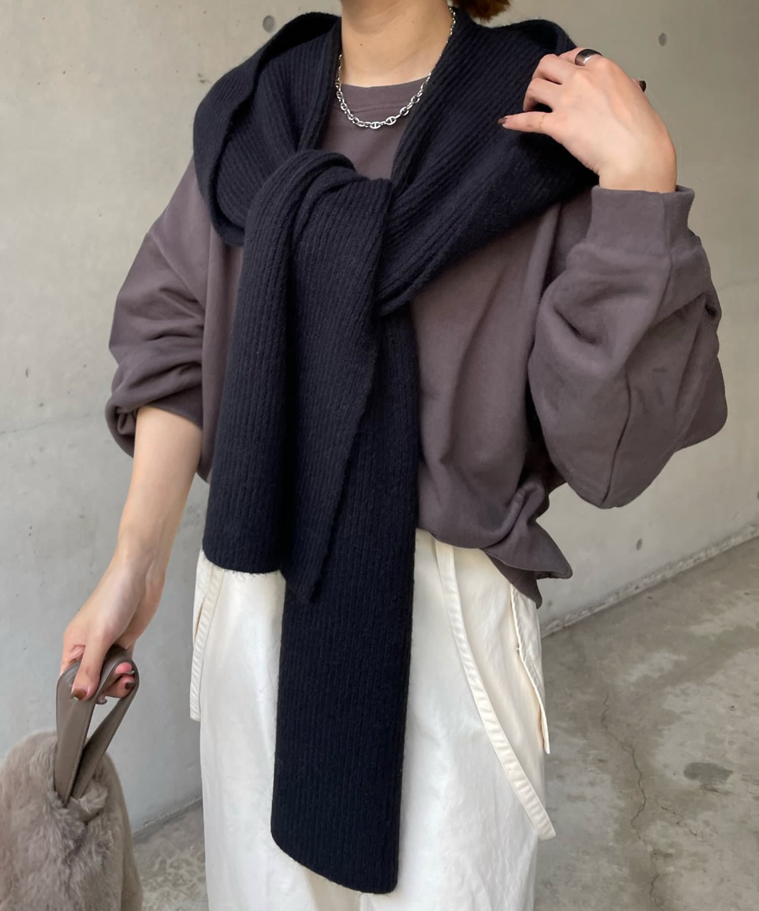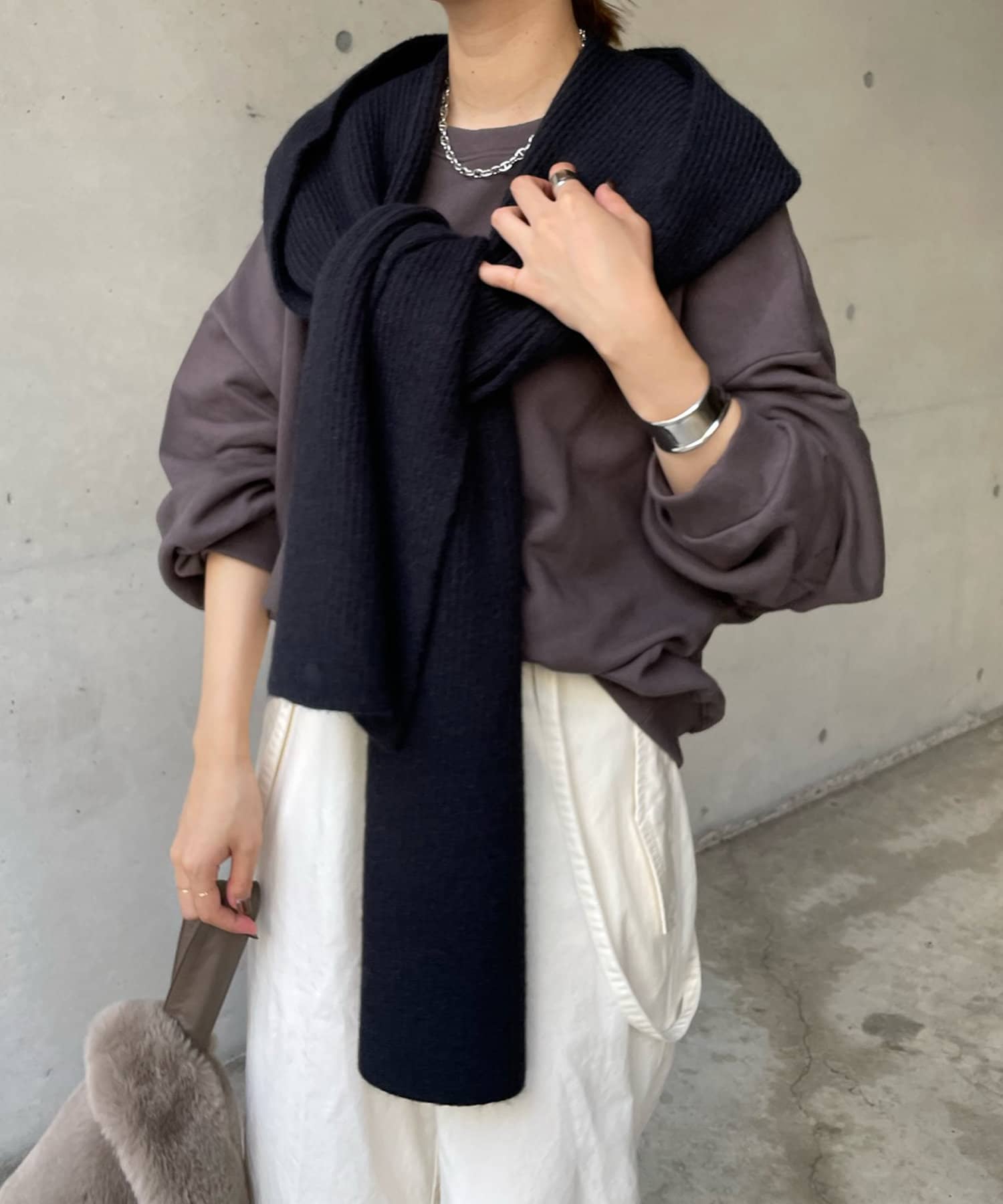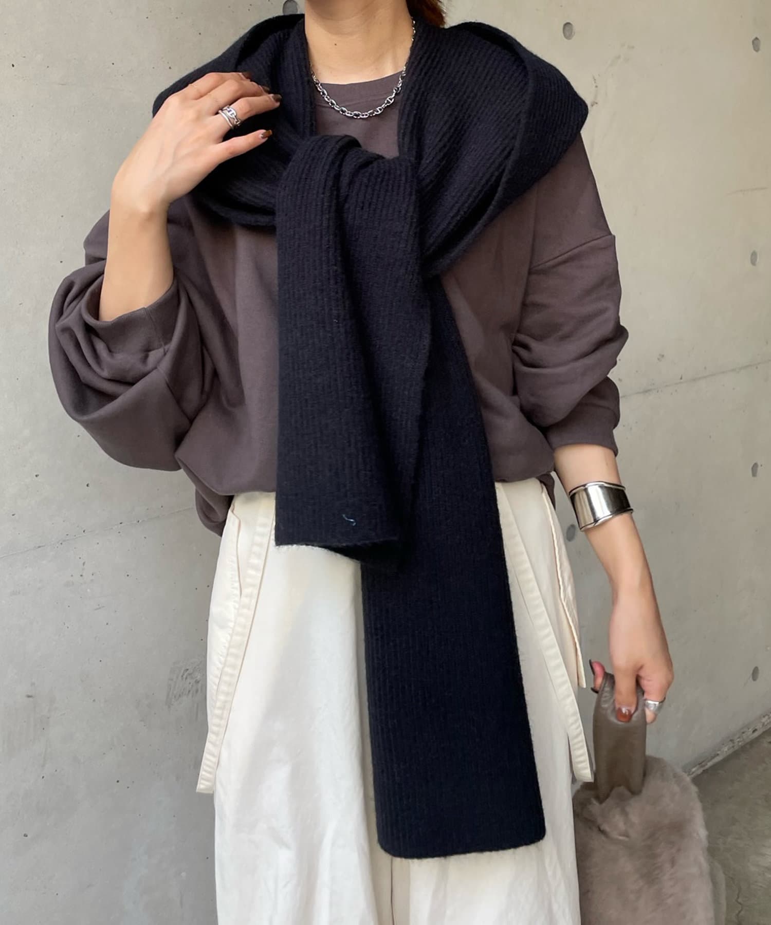 アウター合わせはもちろん、スウェットやシャツとカジュアルに合わせるのもおすすめですよ。