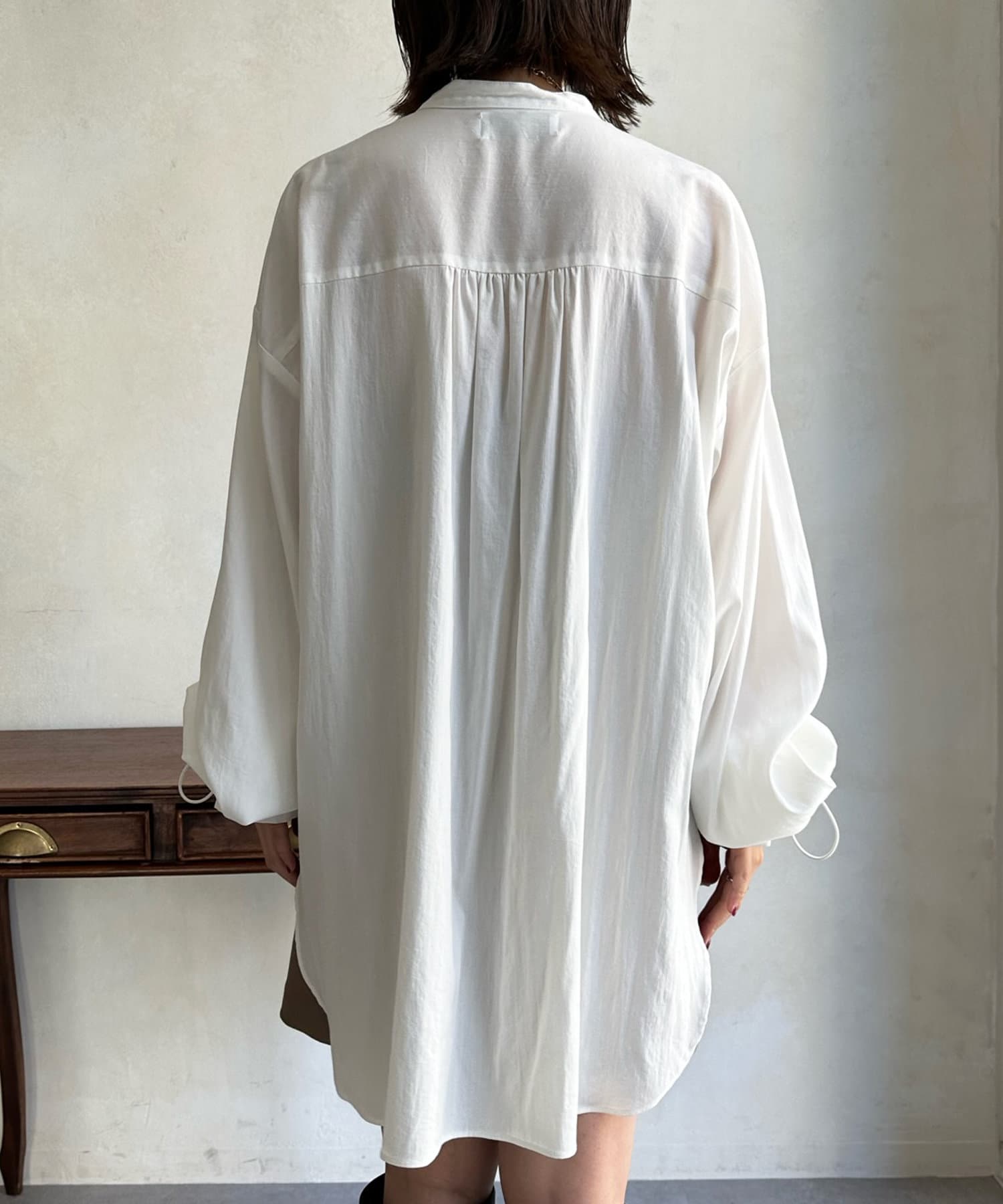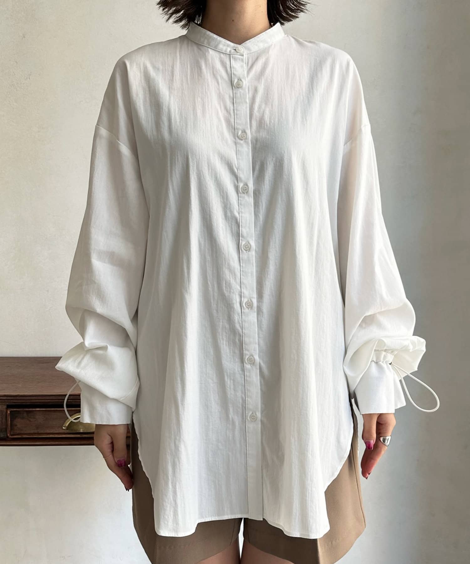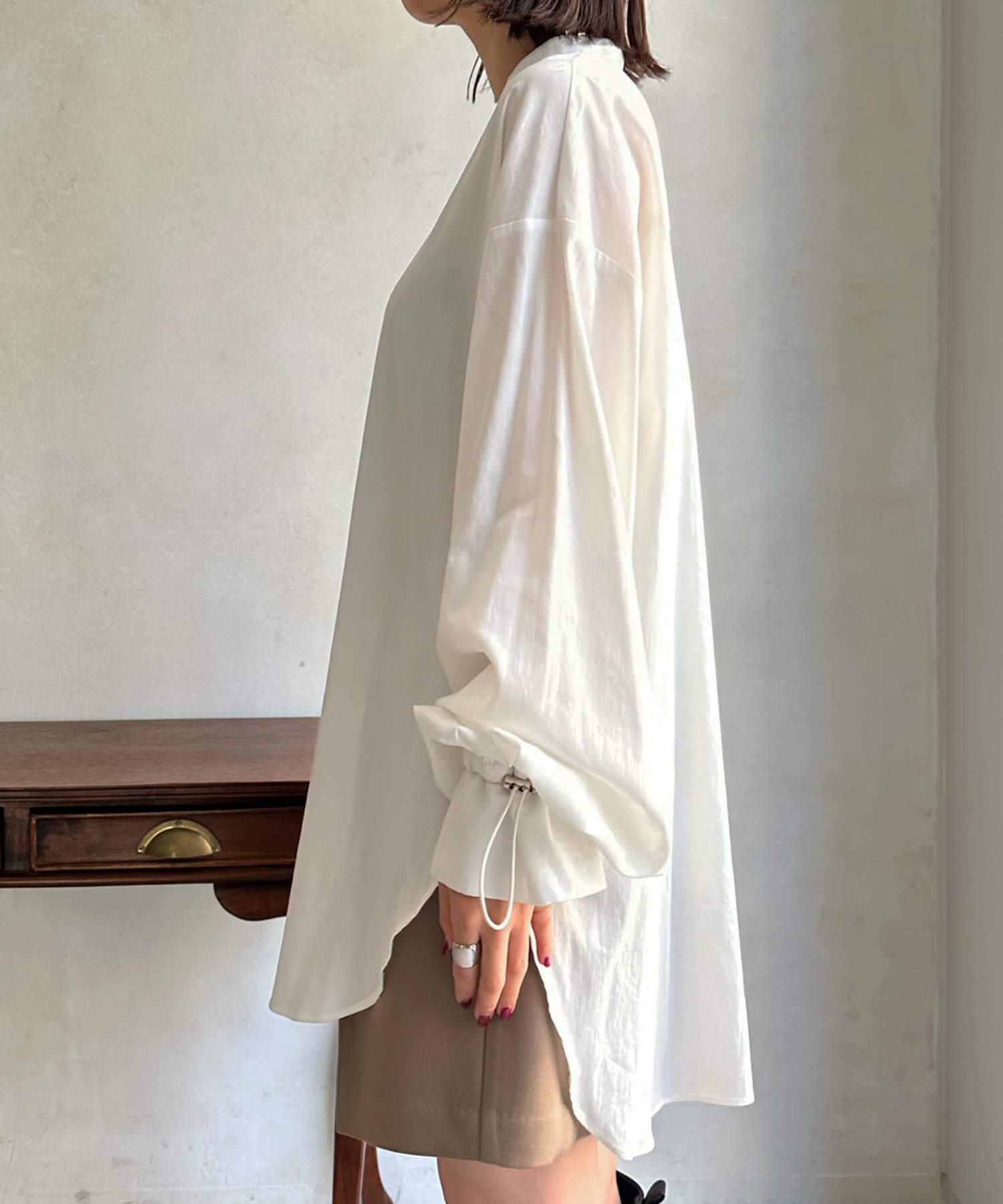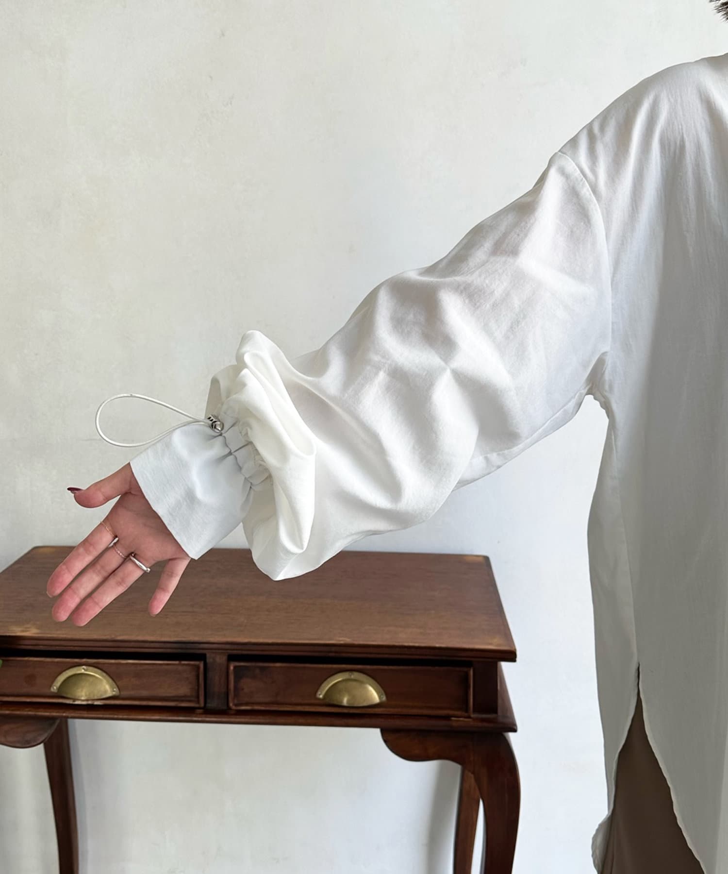 袖口にドロストコードのデザインをプラスし、メリハリのある袖シルエットがポイントのブラウス。