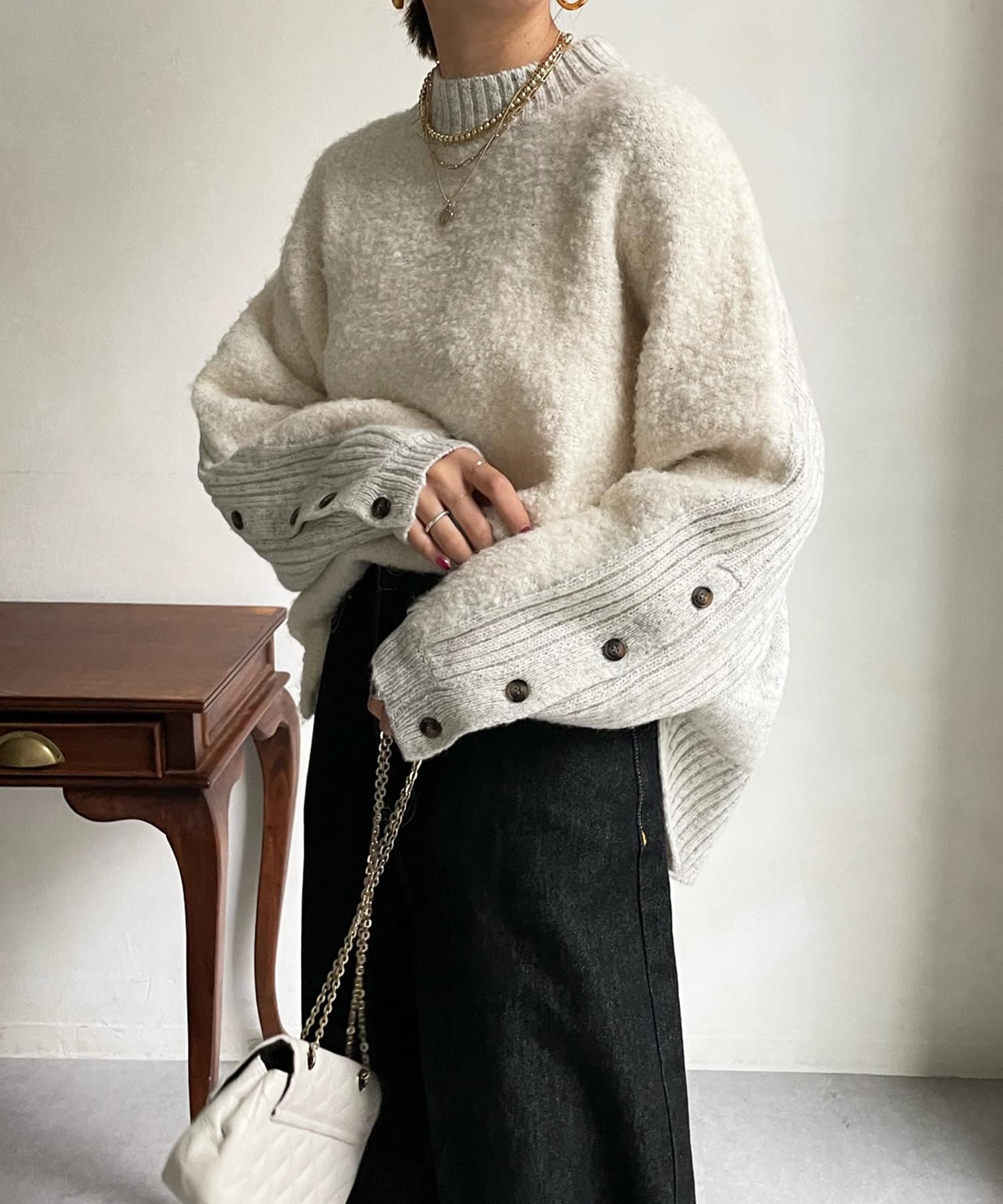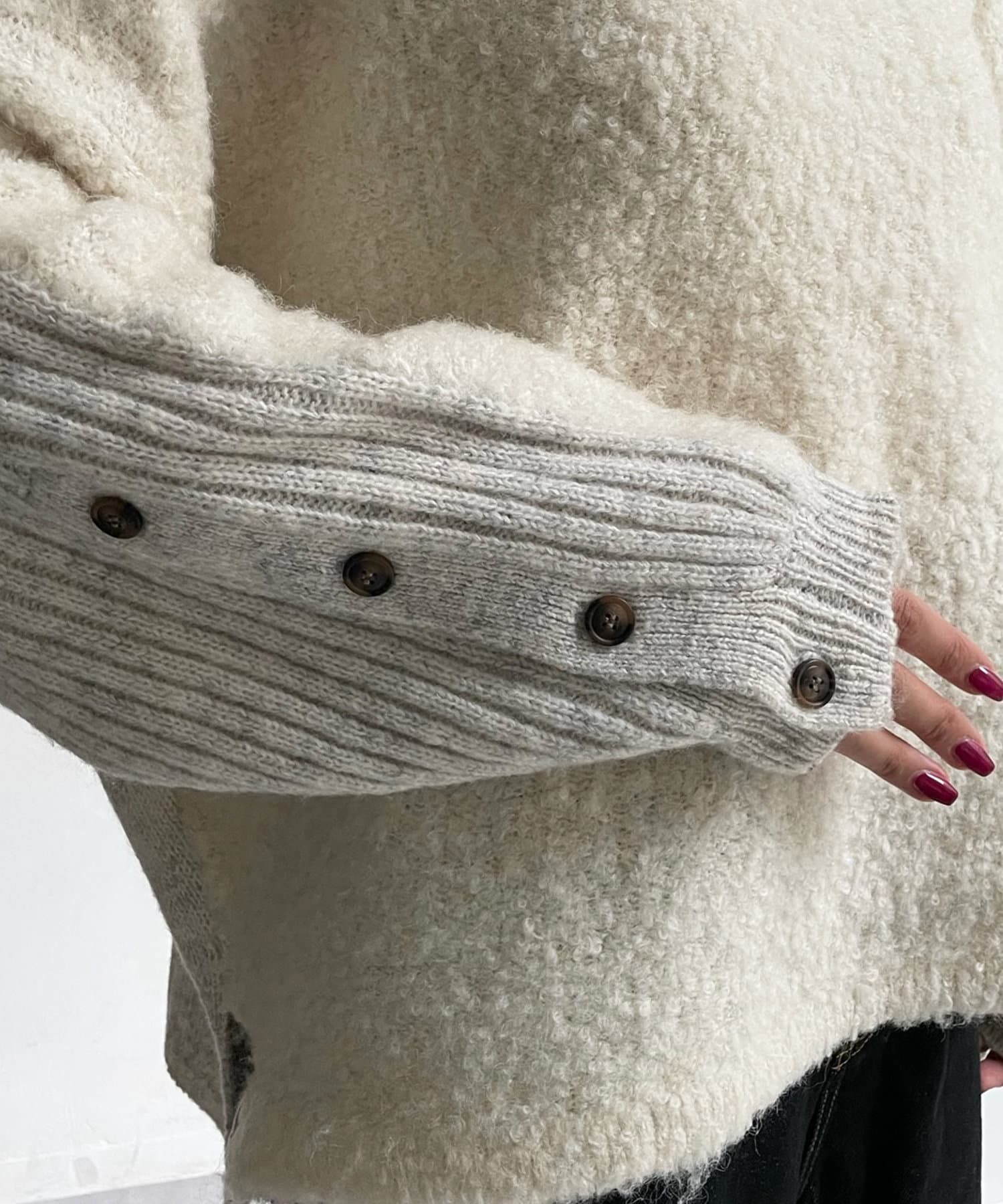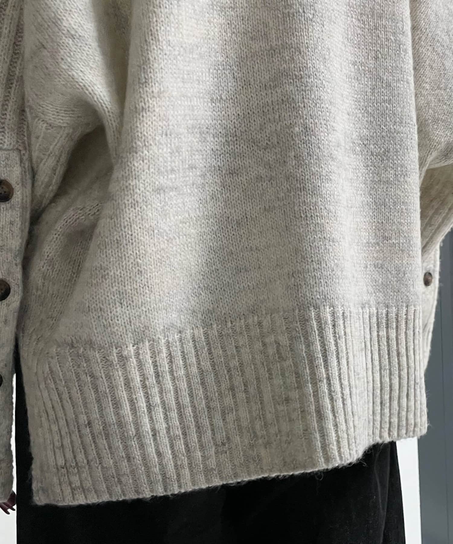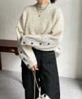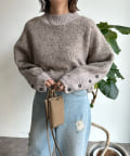 前後で切り替えた編み地と、袖口のボタンデザインが遊び心のある1着です。