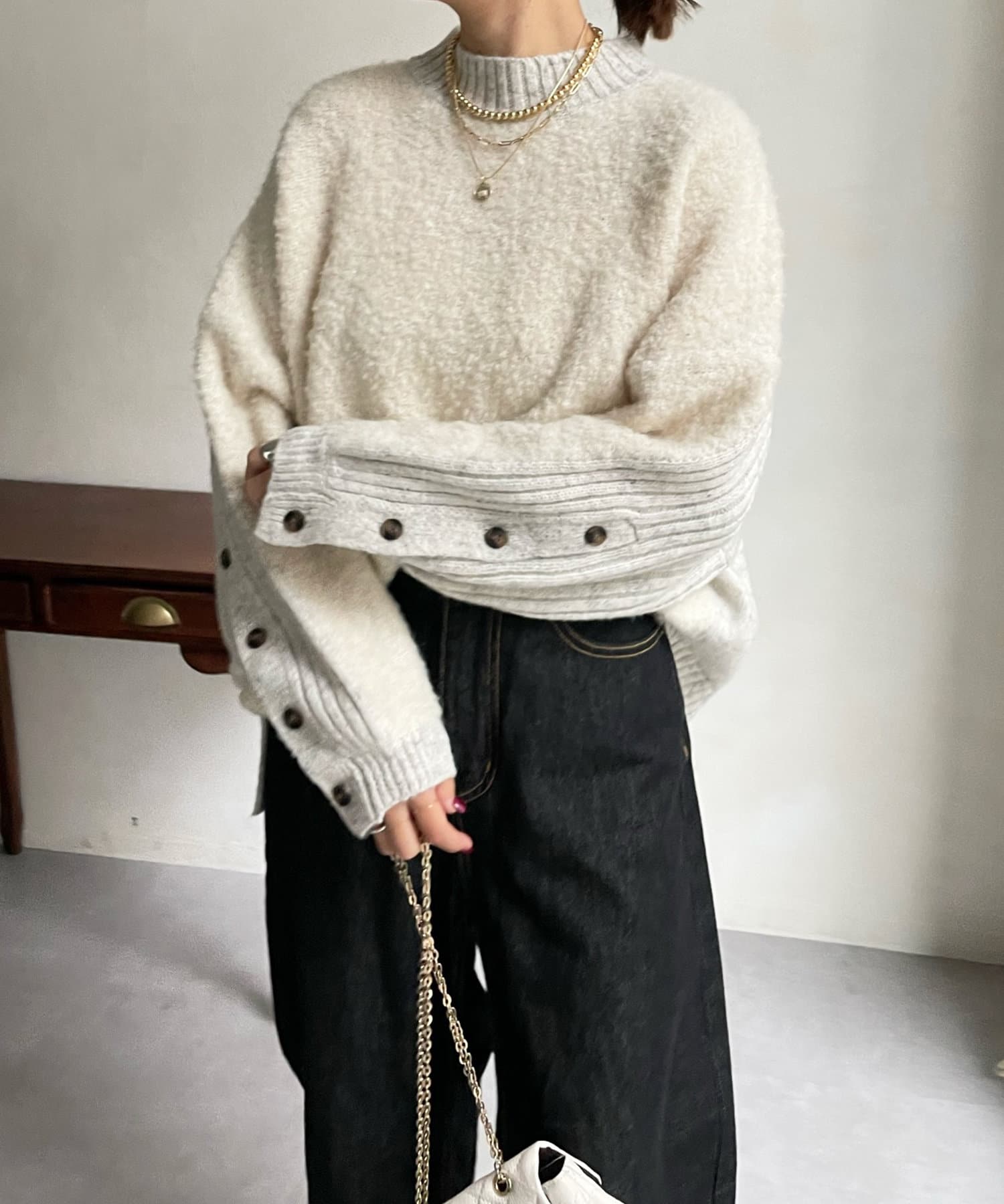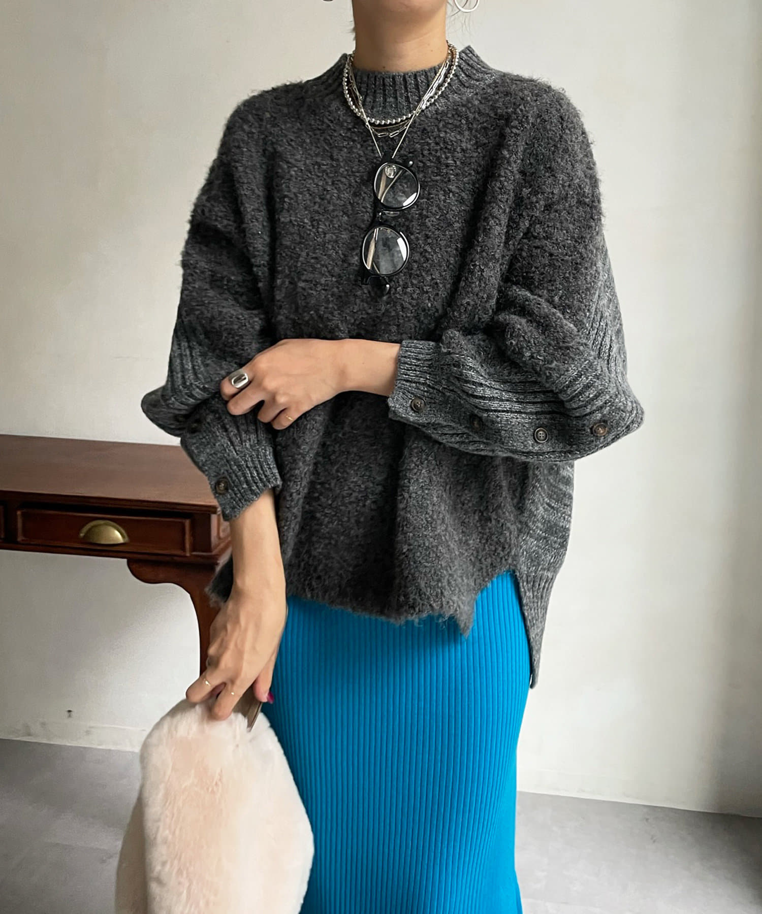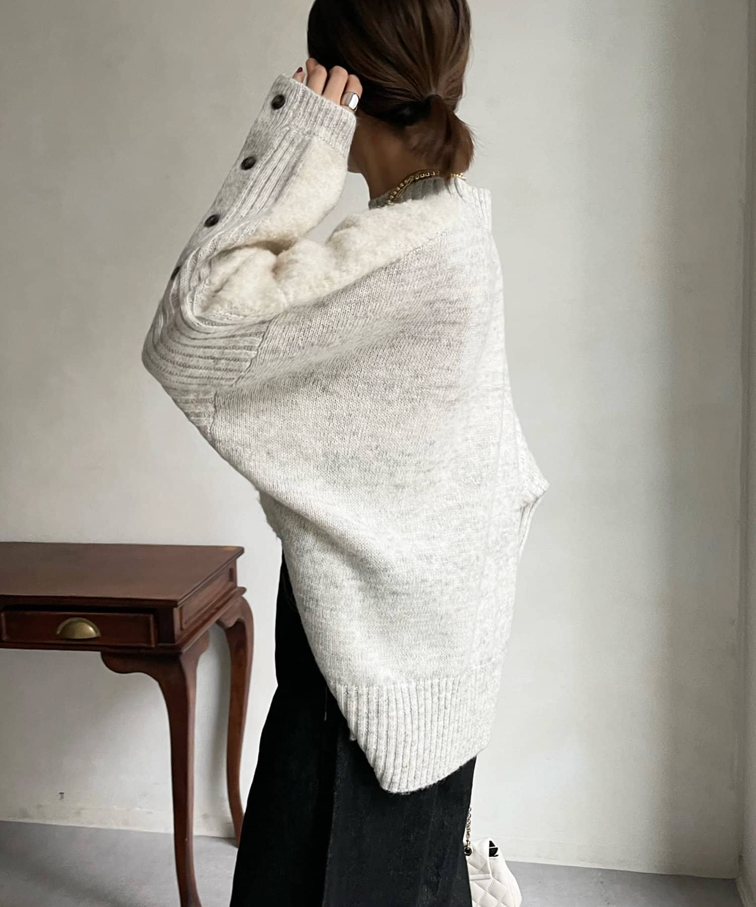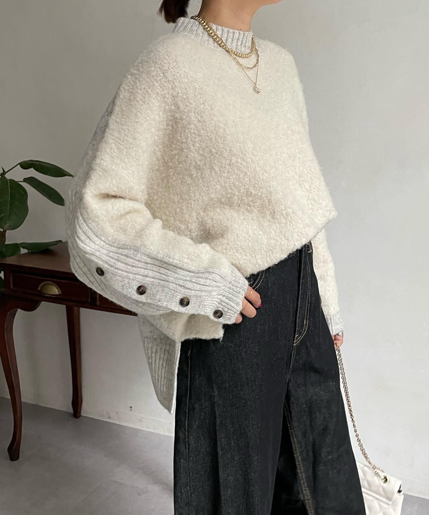 前後で切り替えた編み地と、袖口のボタンデザインが遊び心のある1着です。