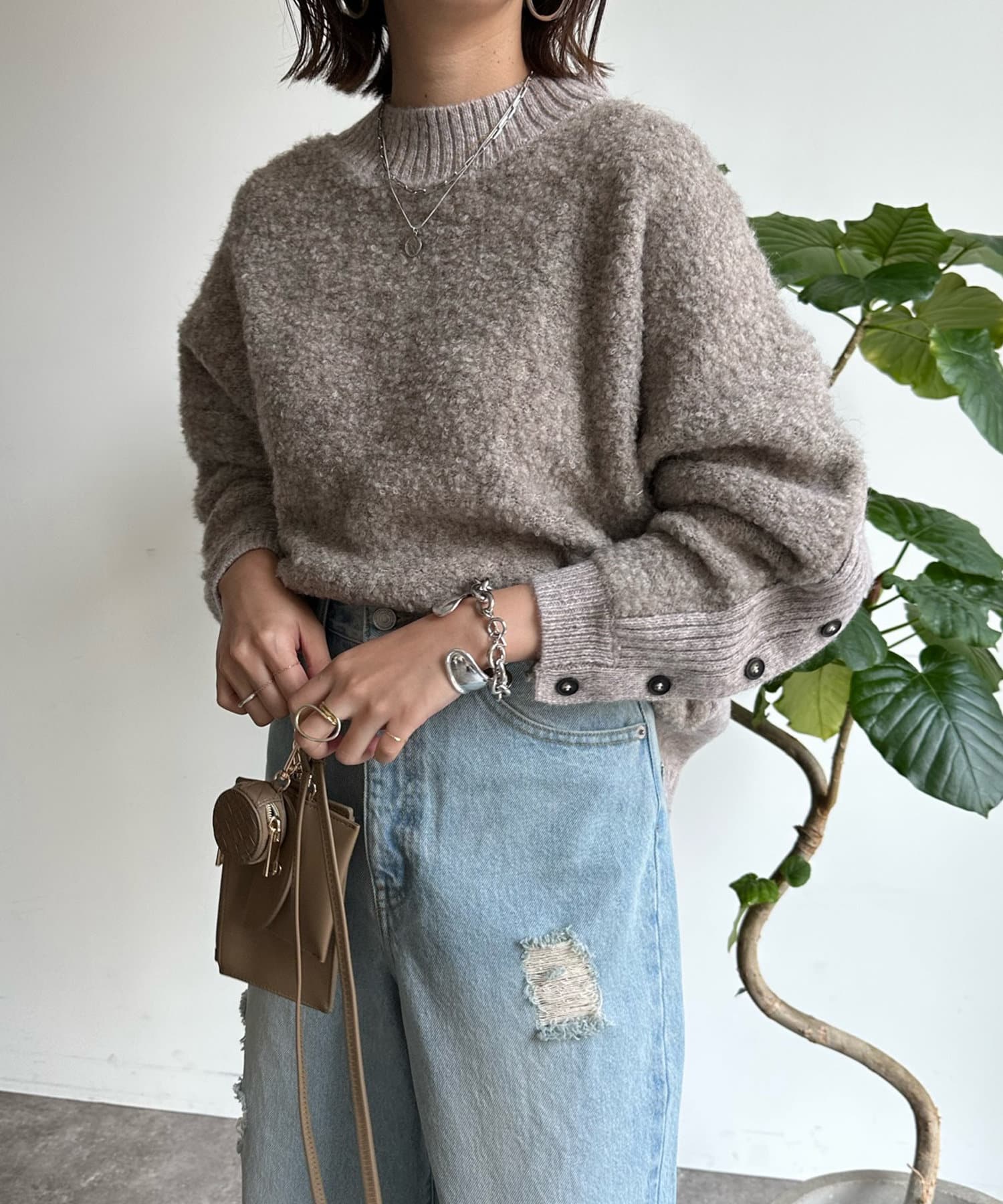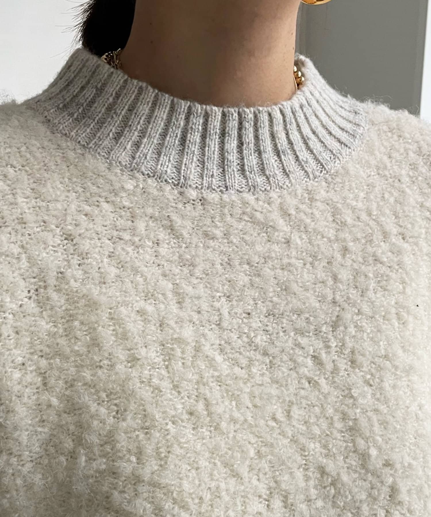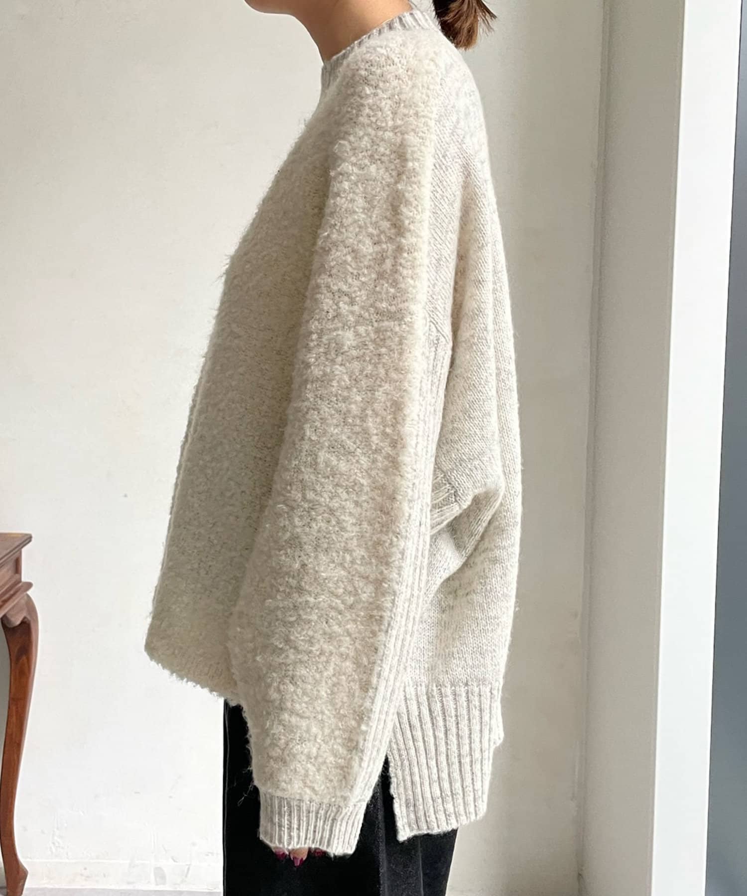 生地の表面に凹凸のある表情が愛おしい、リングヤーン素材のドルマンニット。