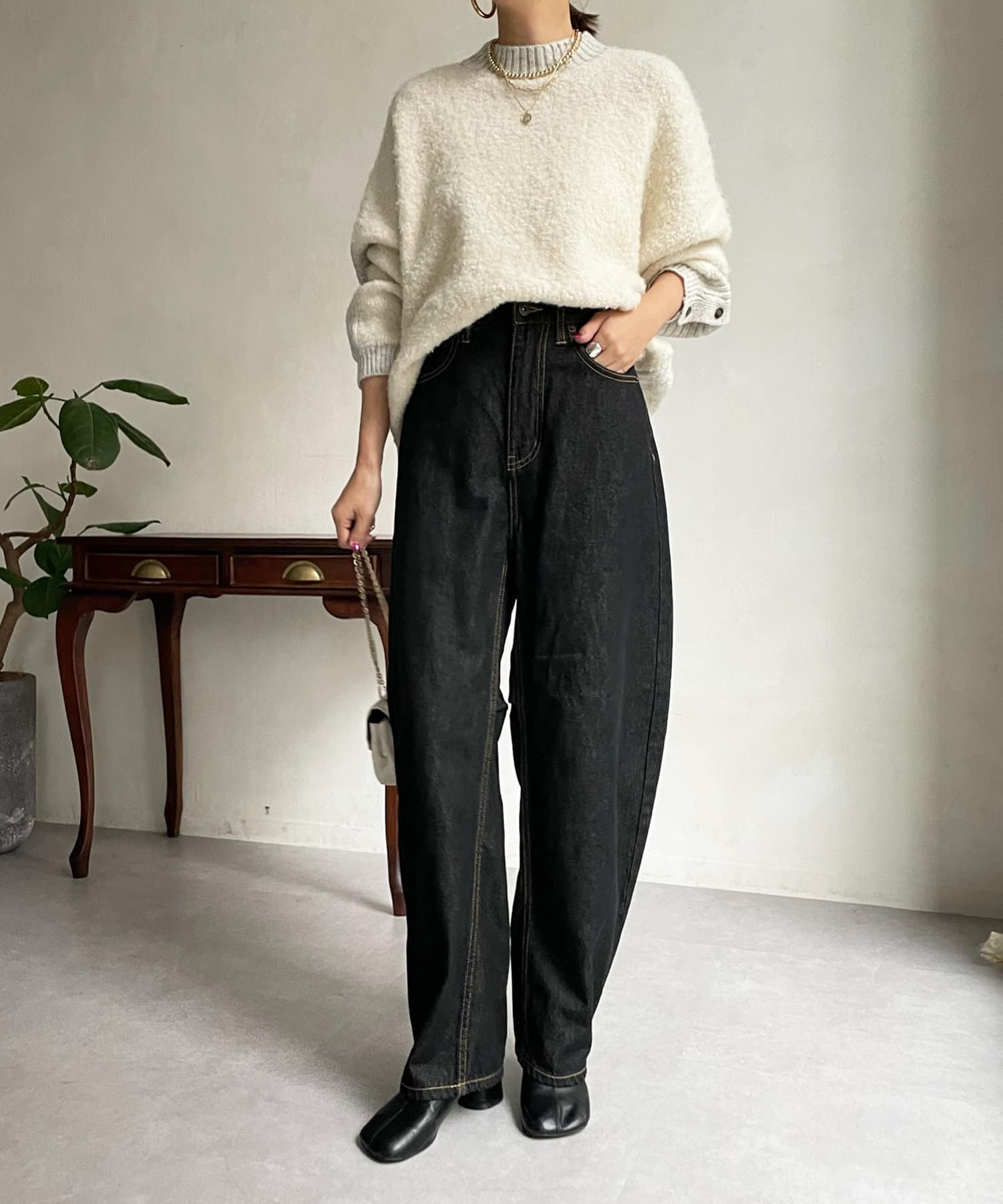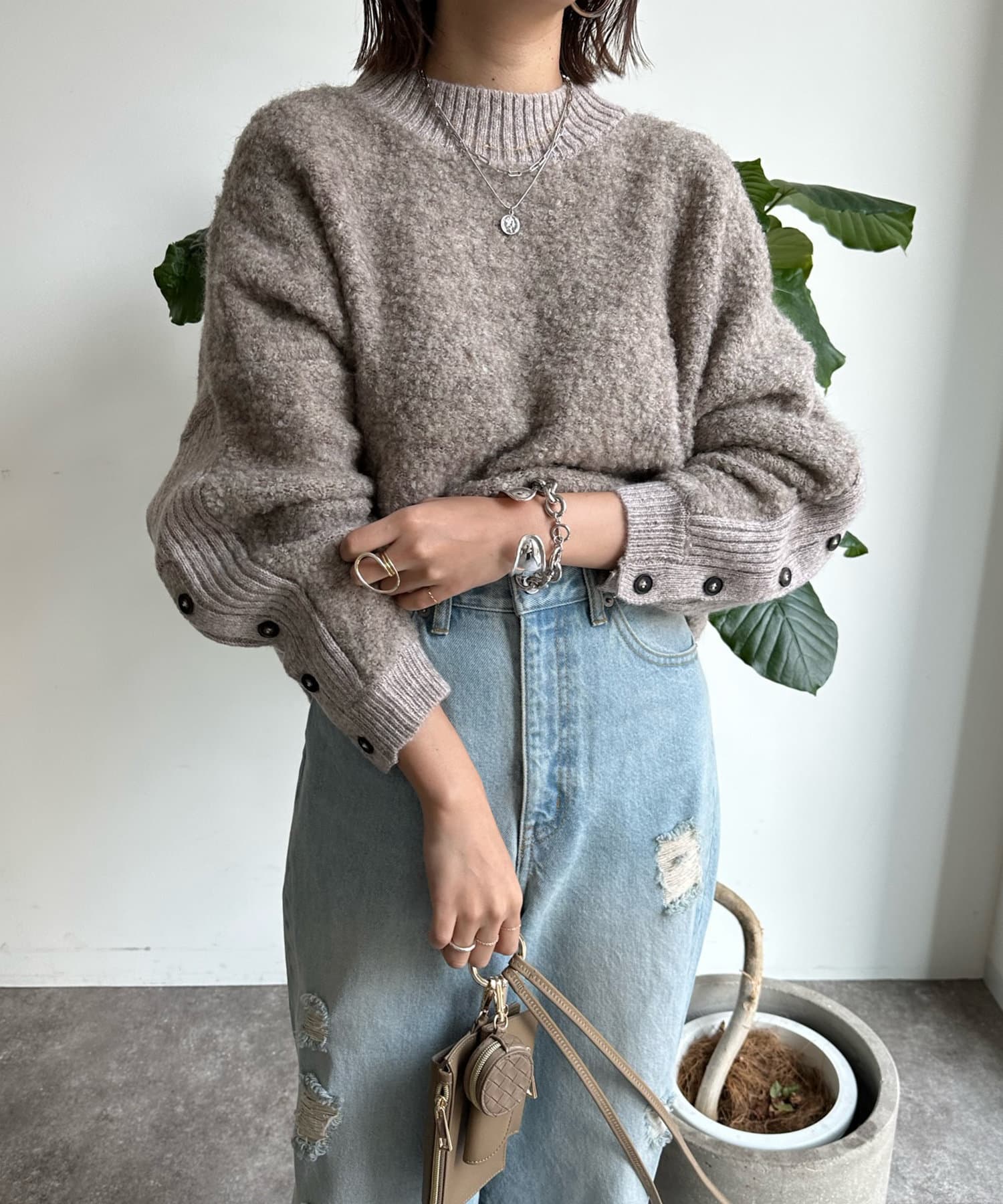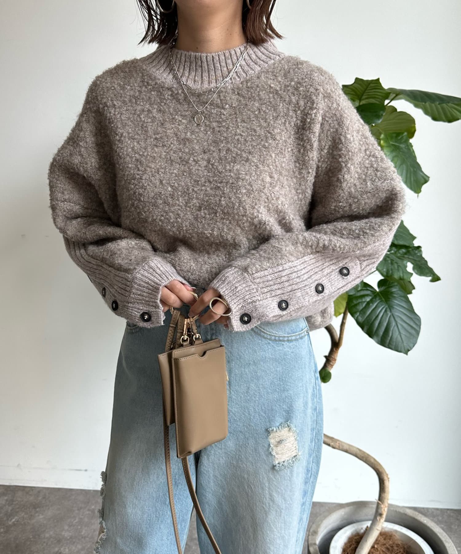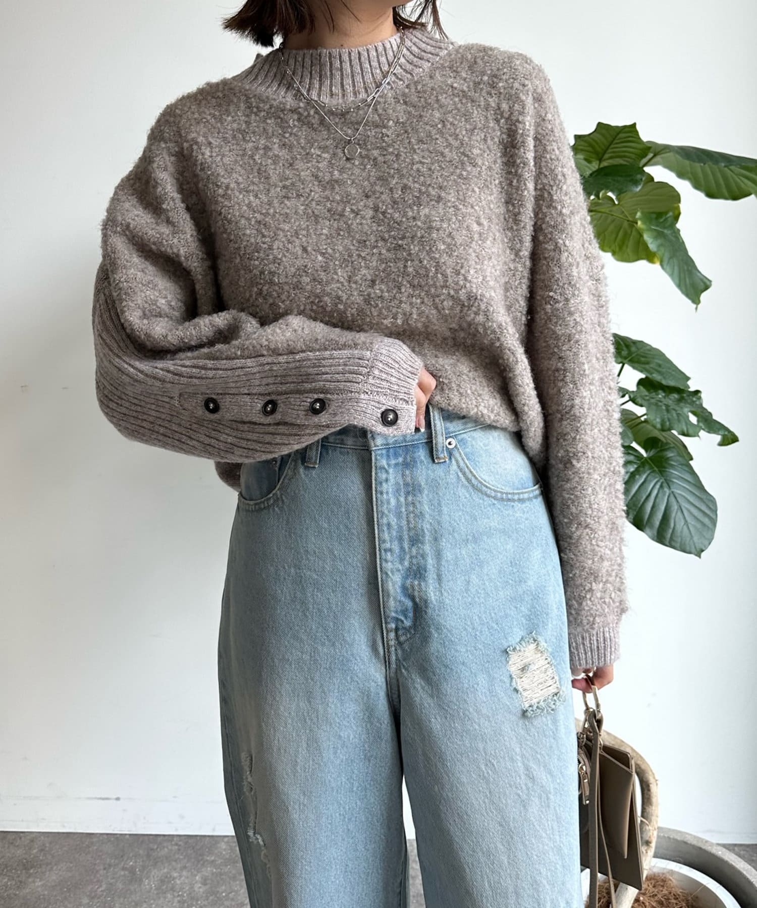 生地の表面に凹凸のある表情が愛おしい、リングヤーン素材のドルマンニット。