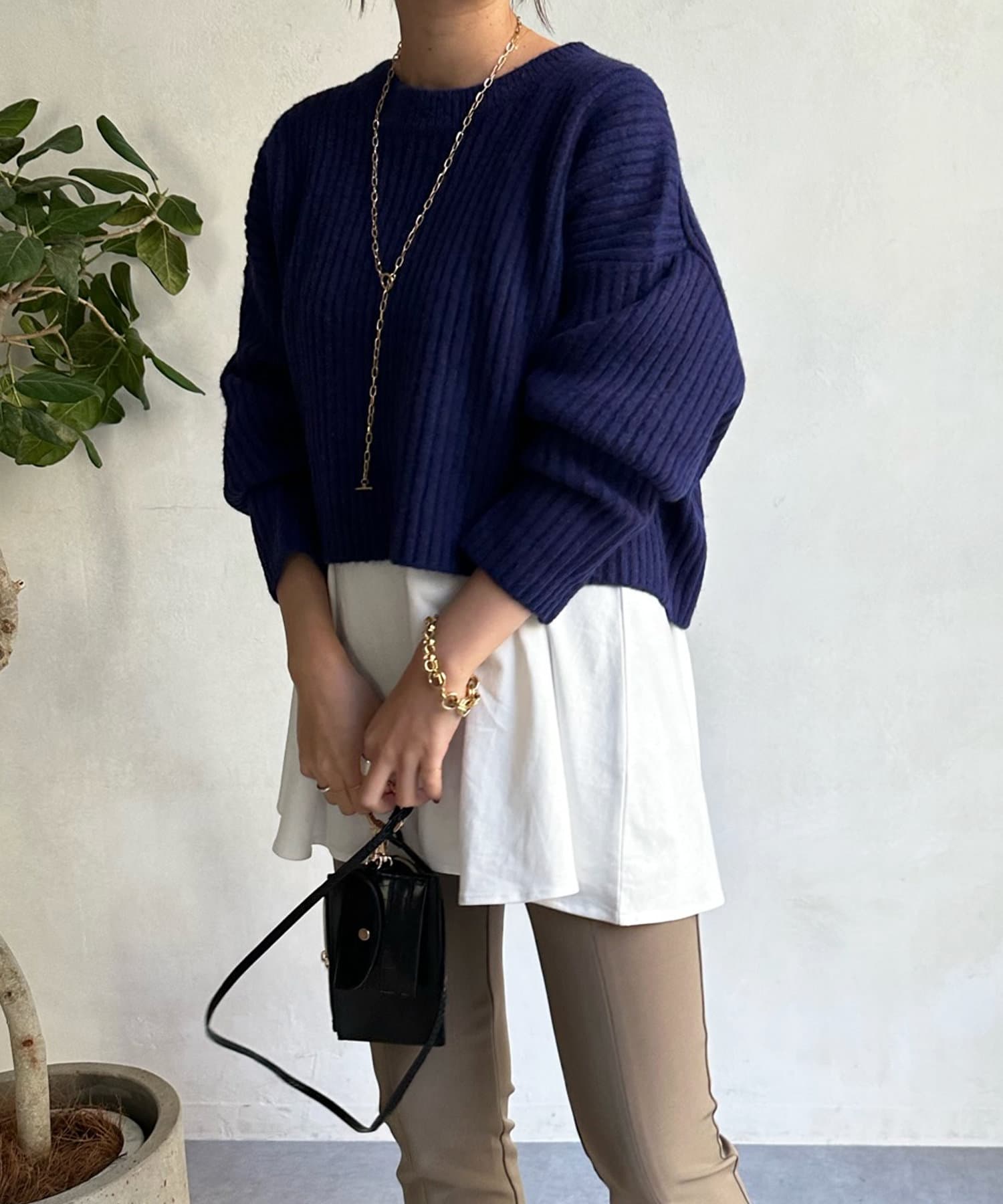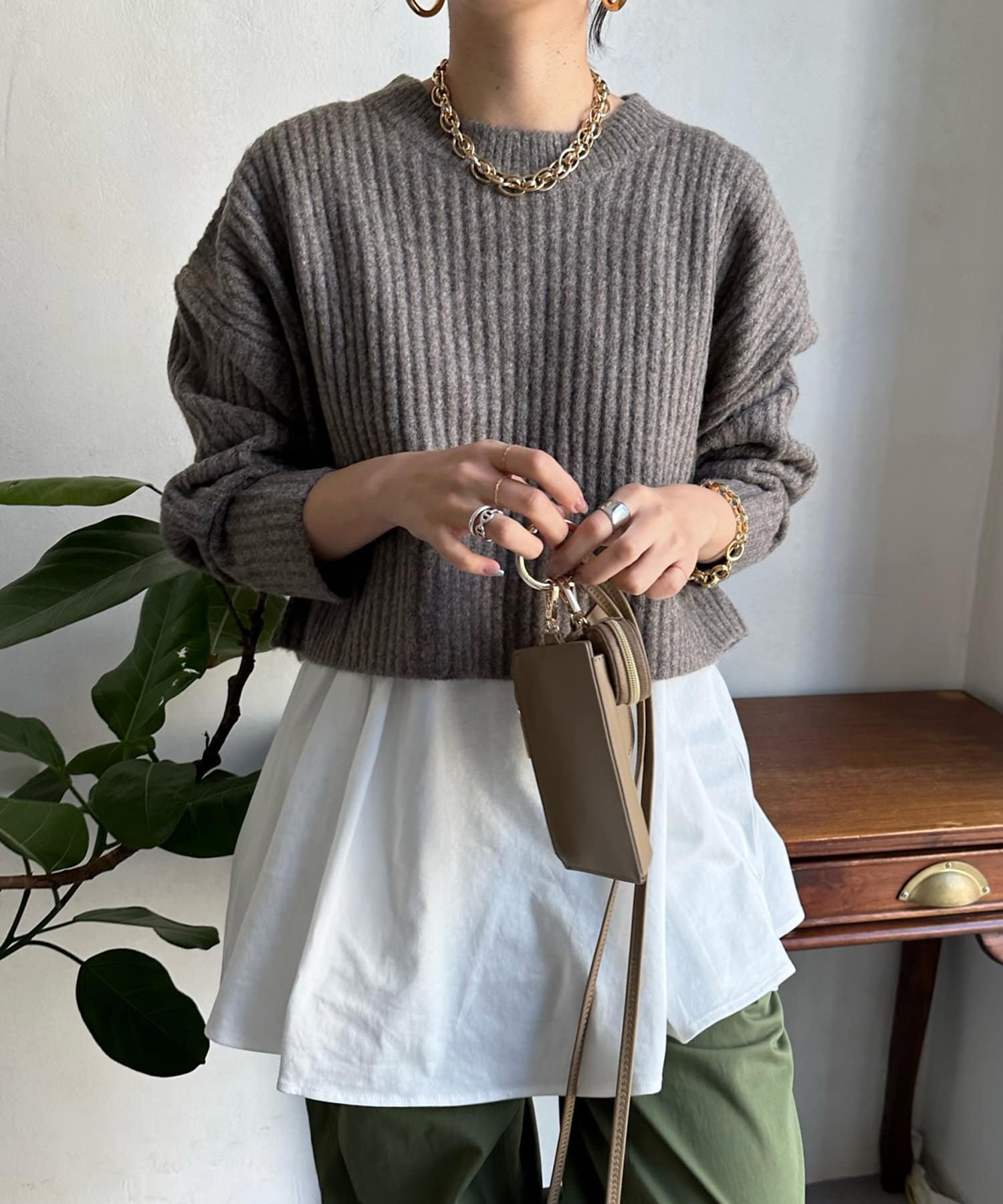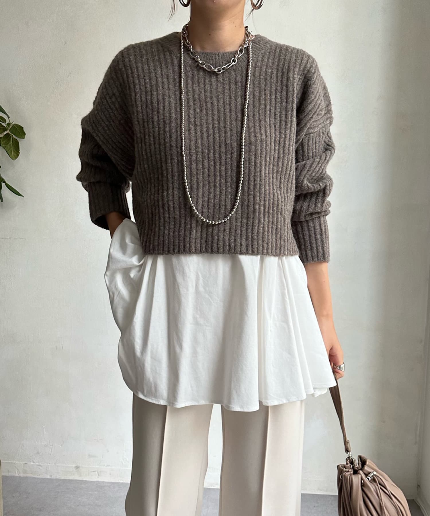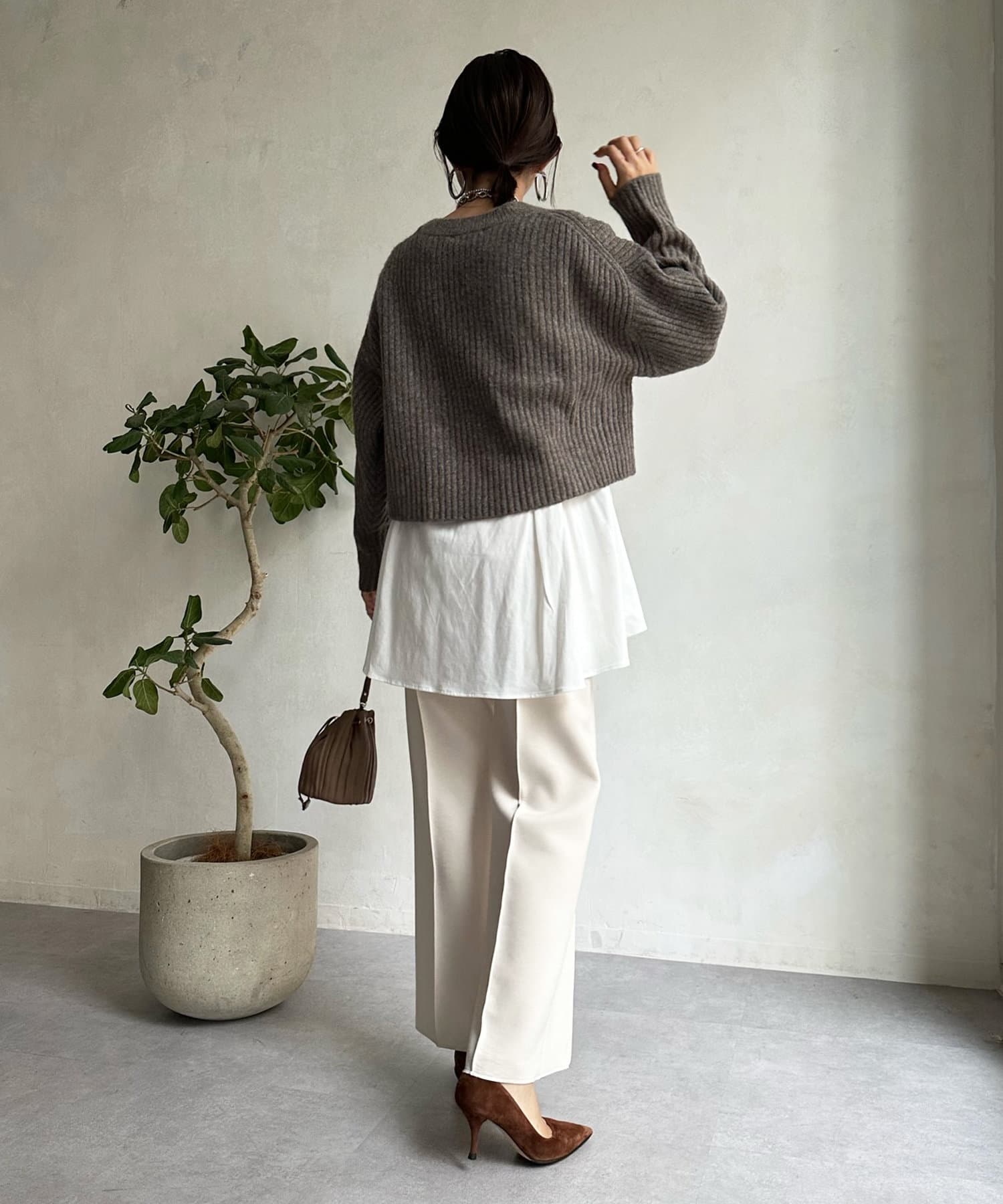 ショート丈のニットはサマ見えするトレンド感がありつつ、ヤクブレンドの素材で暖かさもキープ。