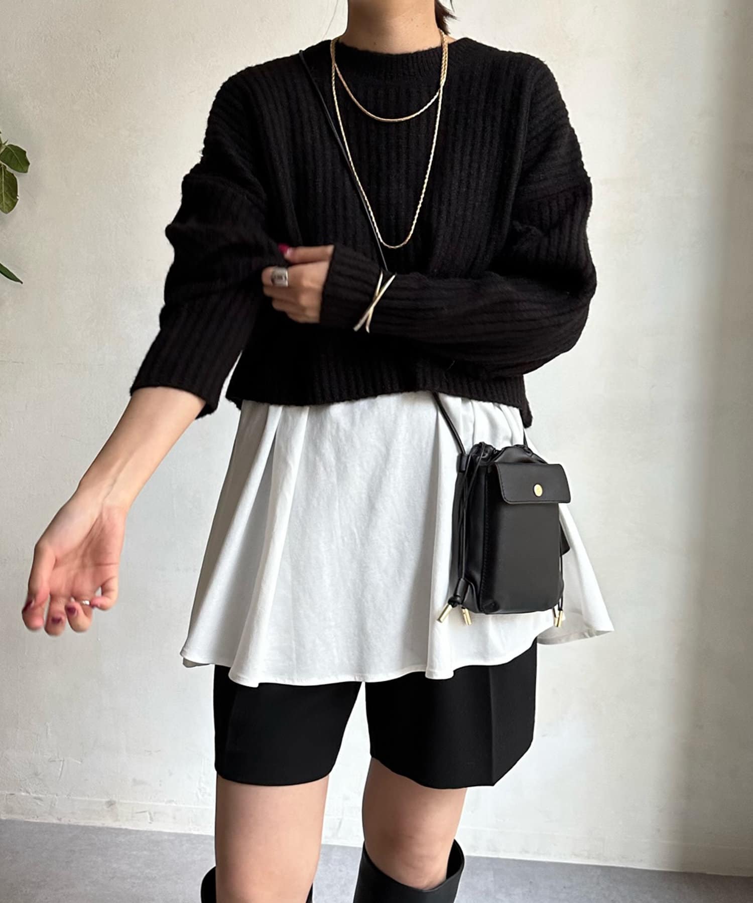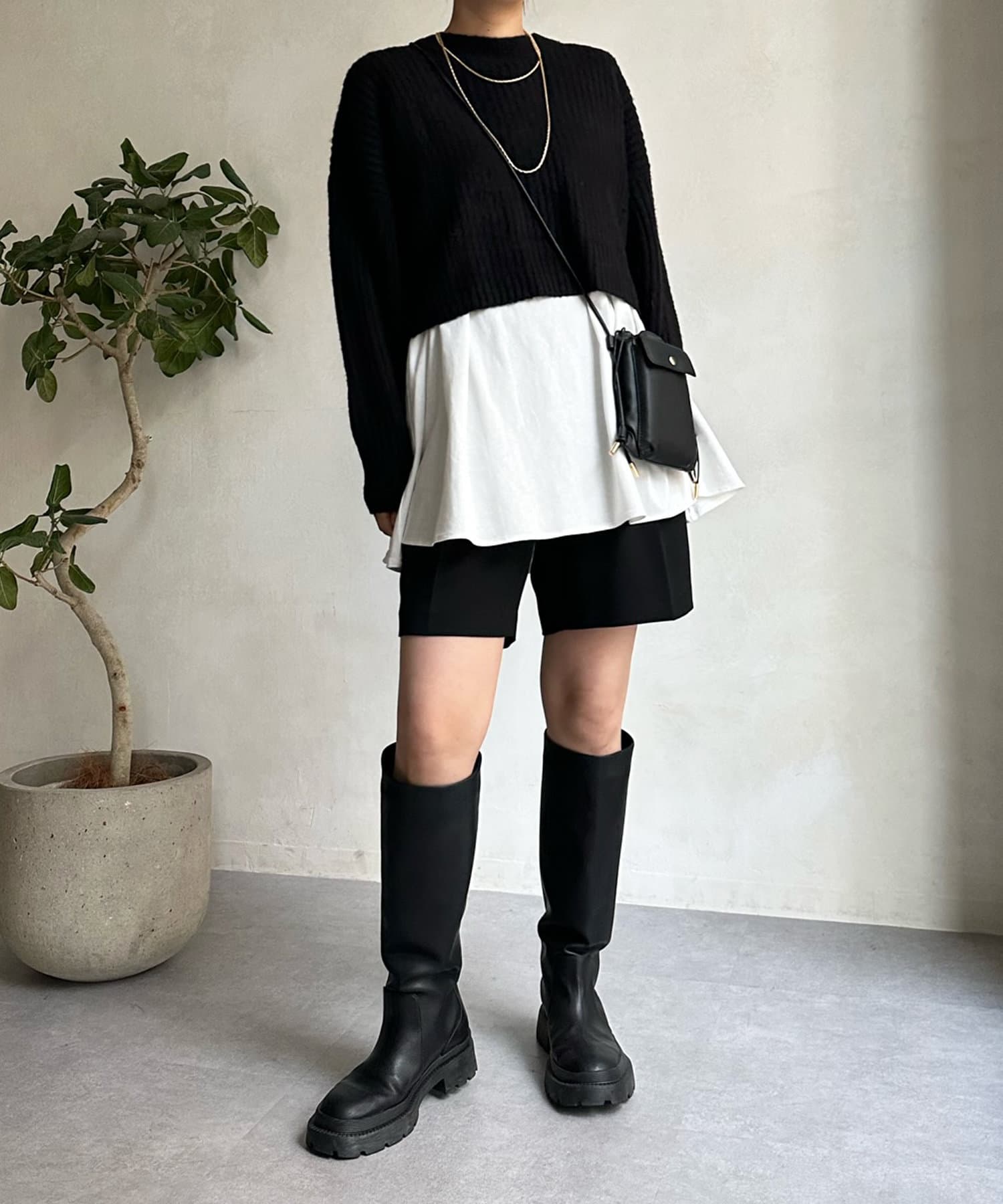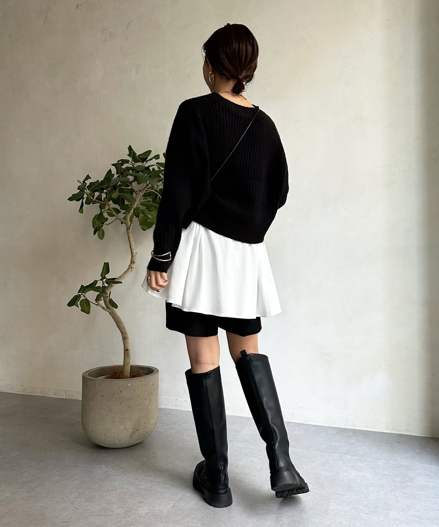 ショート丈のニットはサマ見えするトレンド感がありつつ、ヤクブレンドの素材で暖かさもキープ。