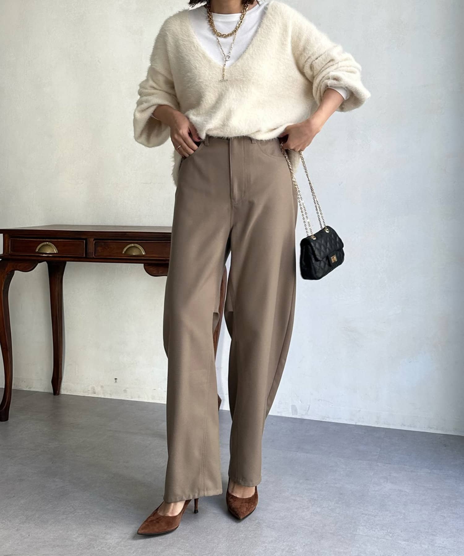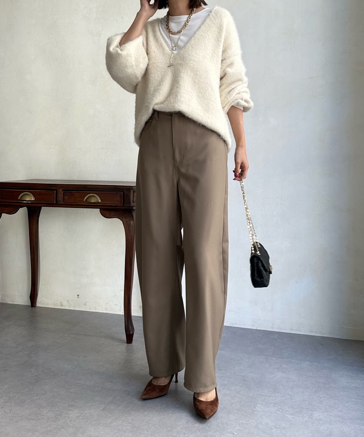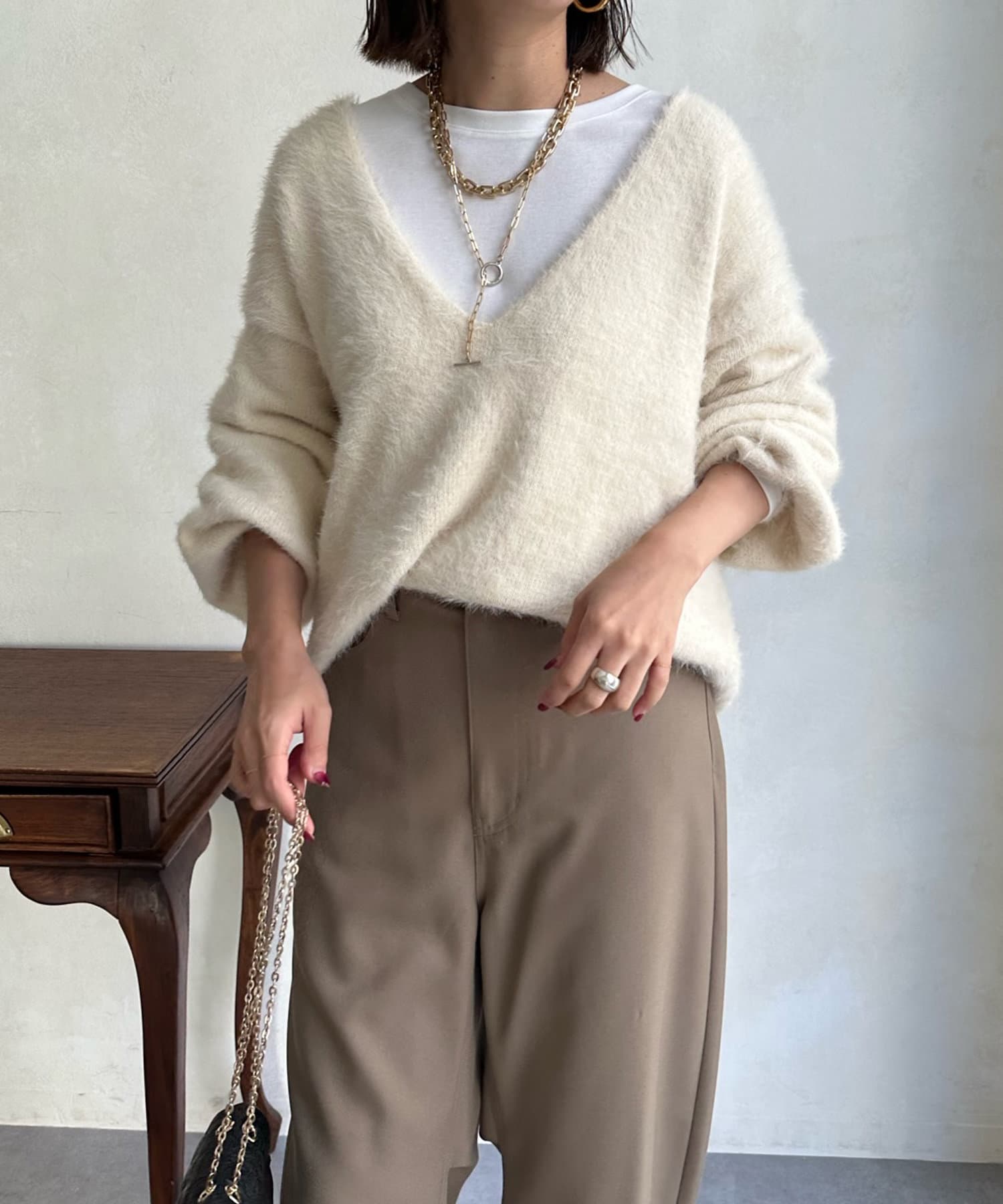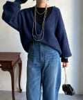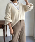 ゆるっと着られるサイジングながらも、お顔周りをすっきりと見せてくれる深Vネックがトレンドライクな印象に。カットソーなどをレイヤードして着られるので、着こなしの幅がぐっと広がります。