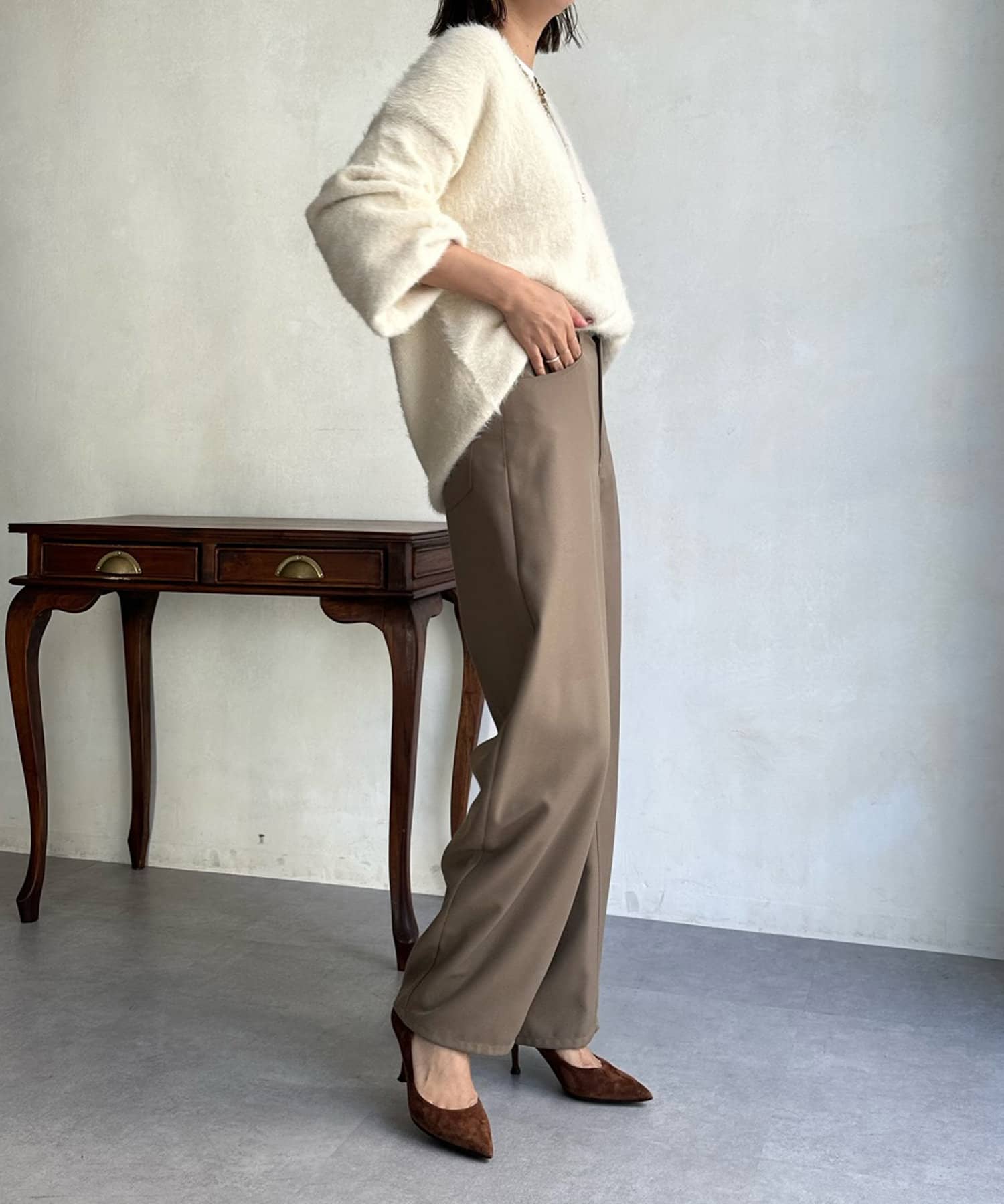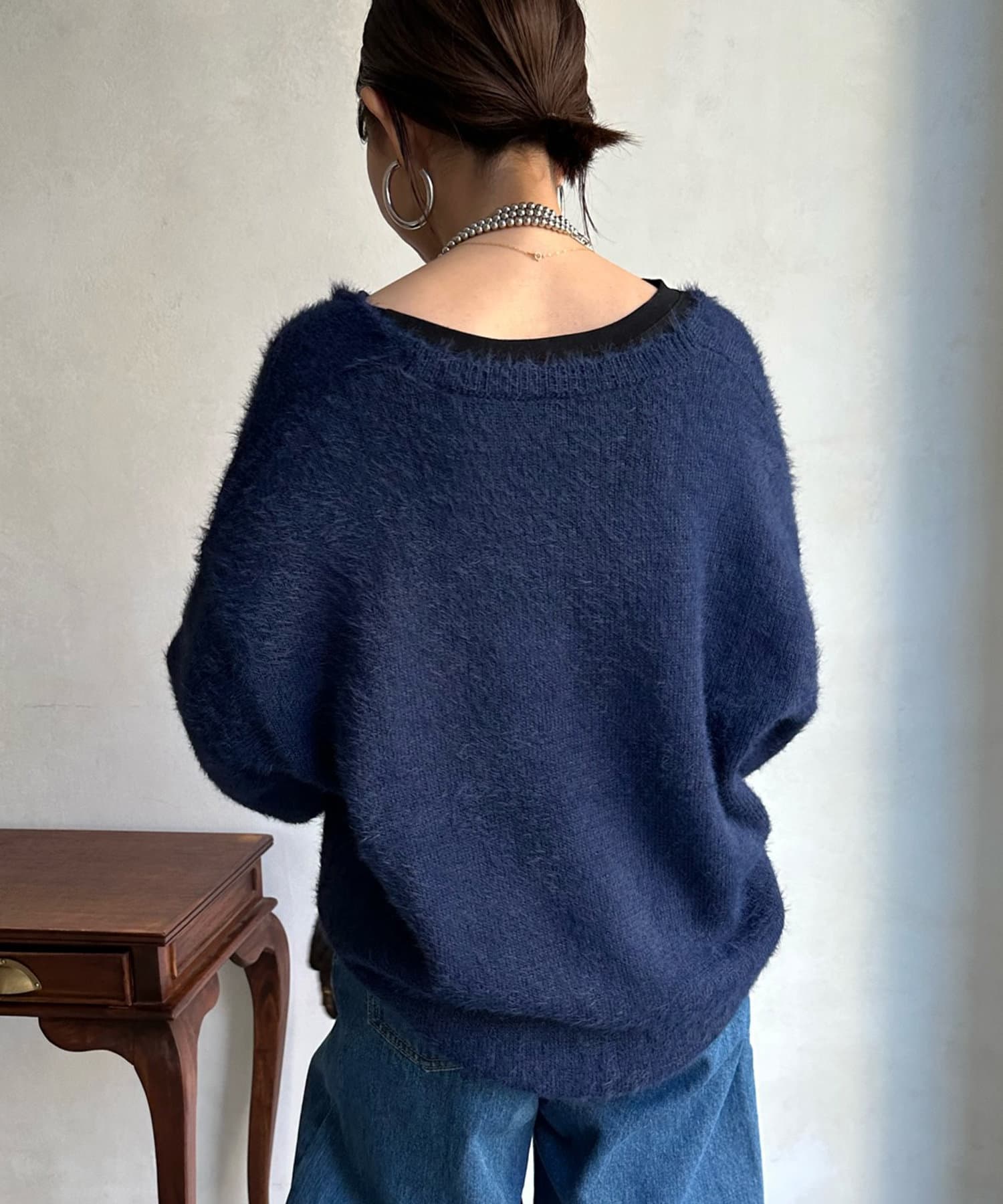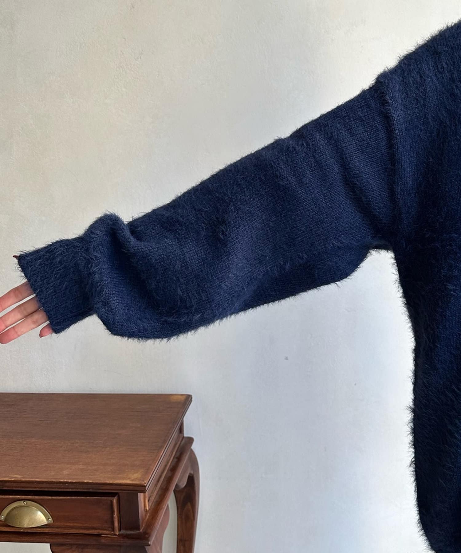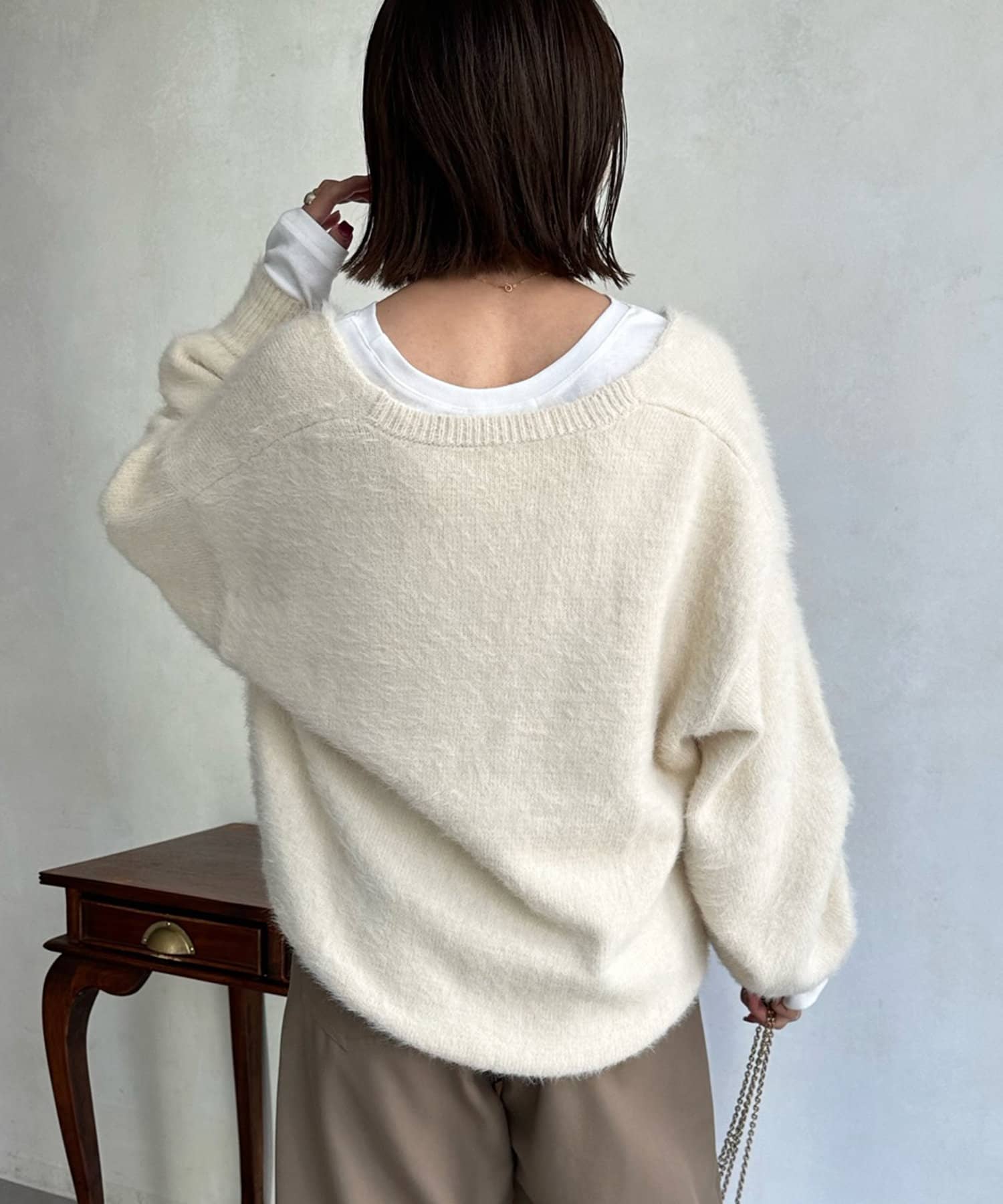 今らしくシーズンムードを高める、毛足感のある素材がポイントのニット。
