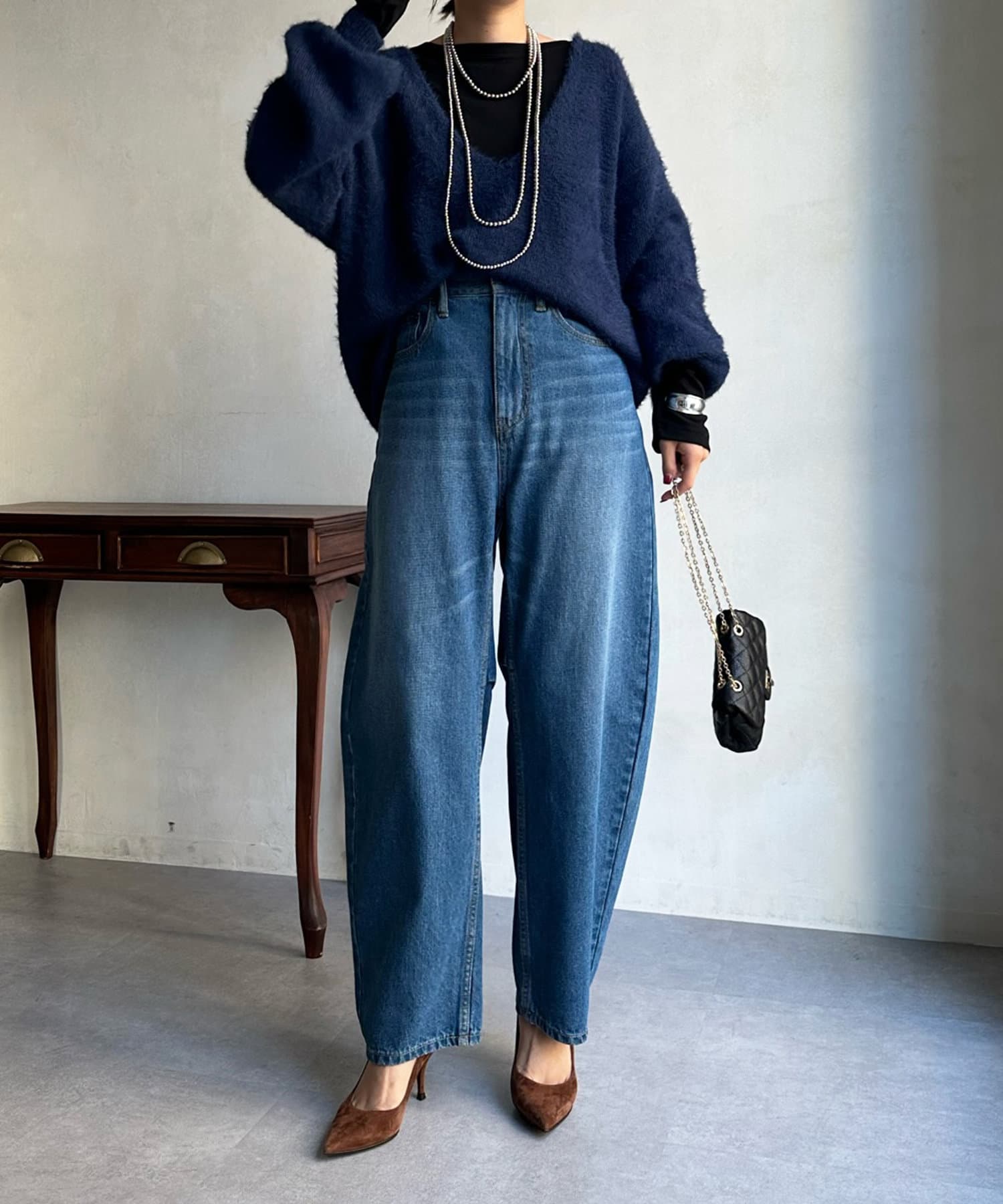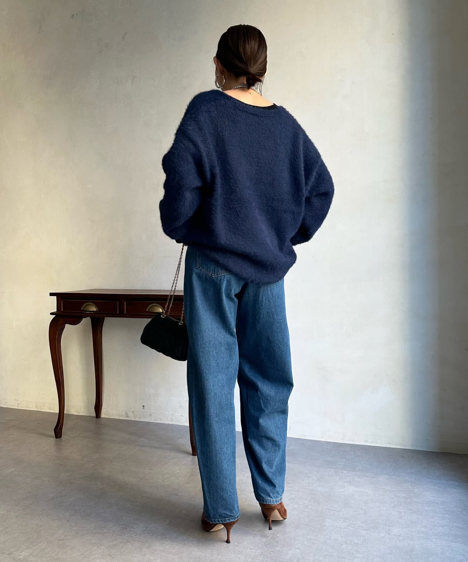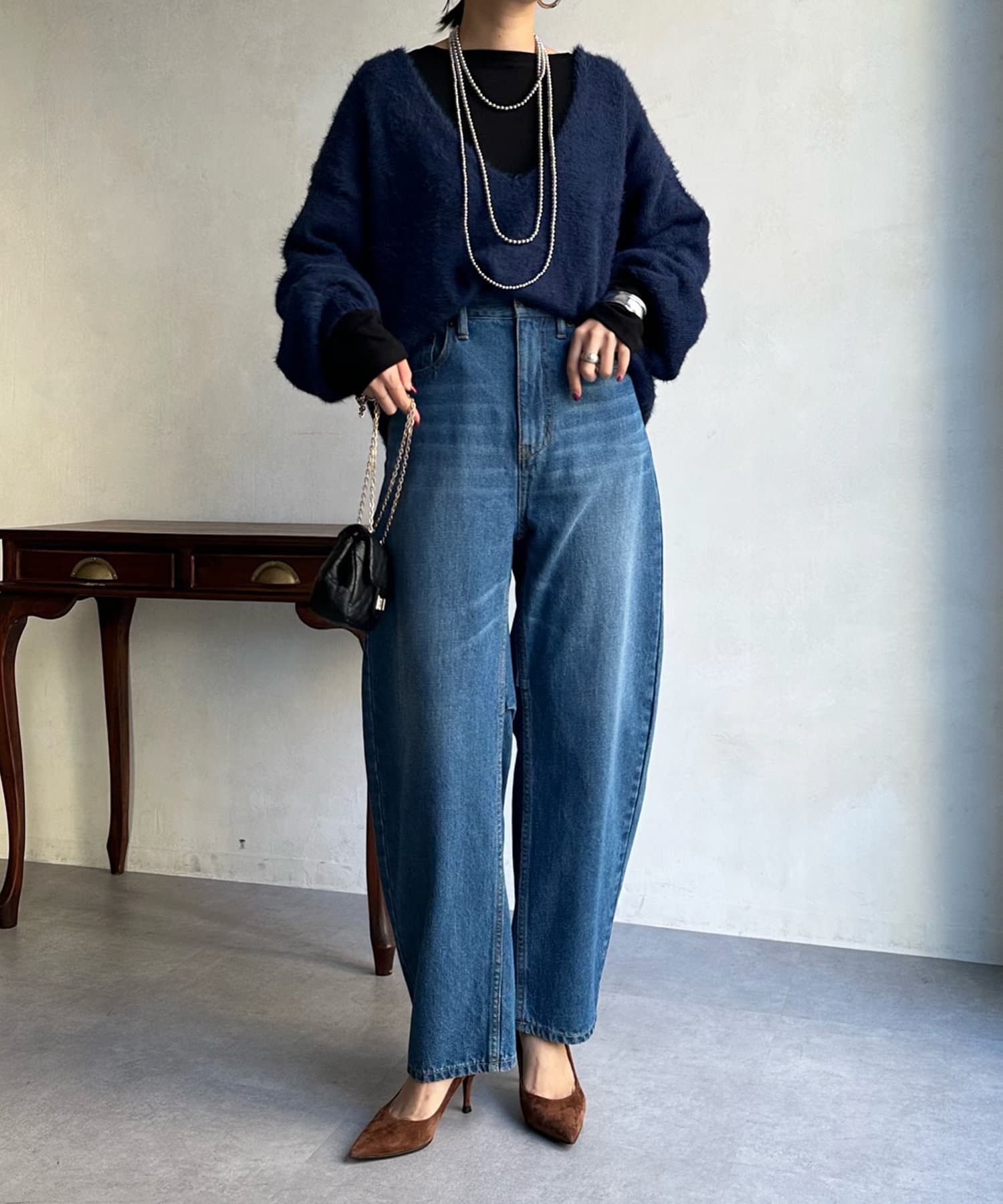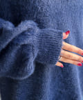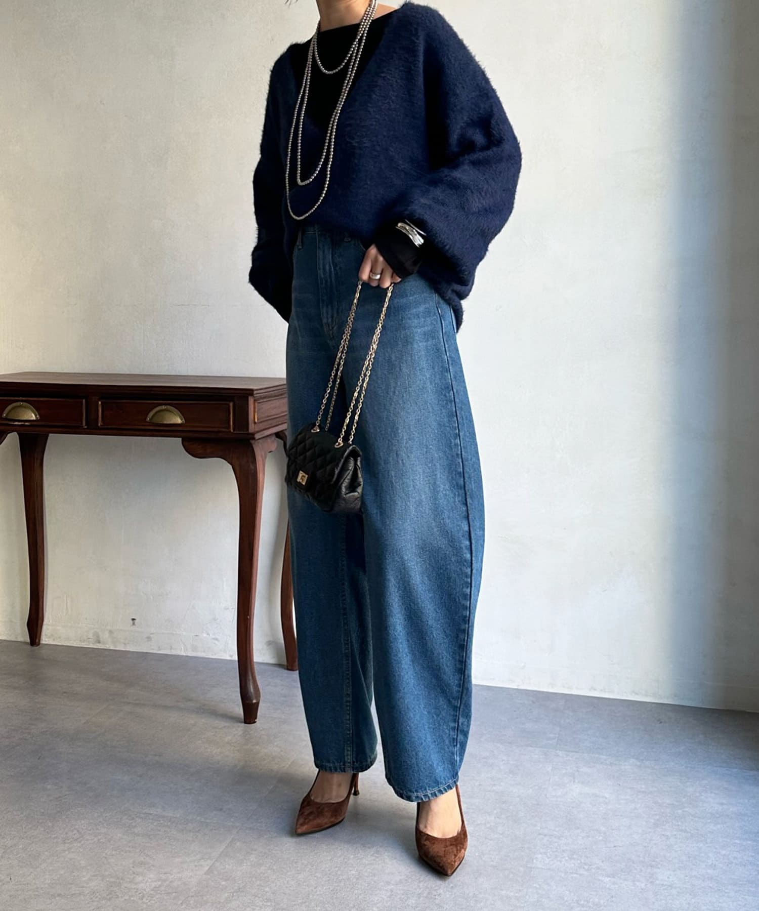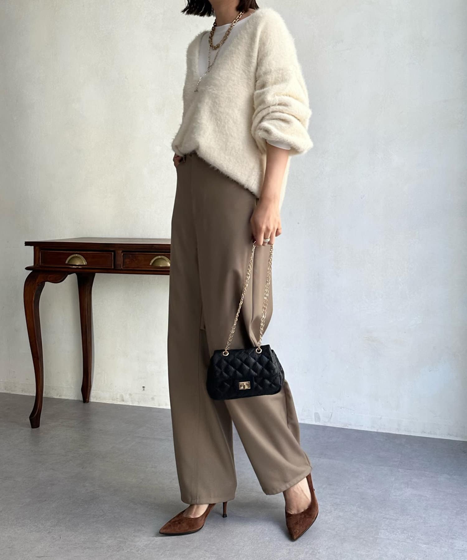 今らしくシーズンムードを高める、毛足感のある素材がポイントのニット。