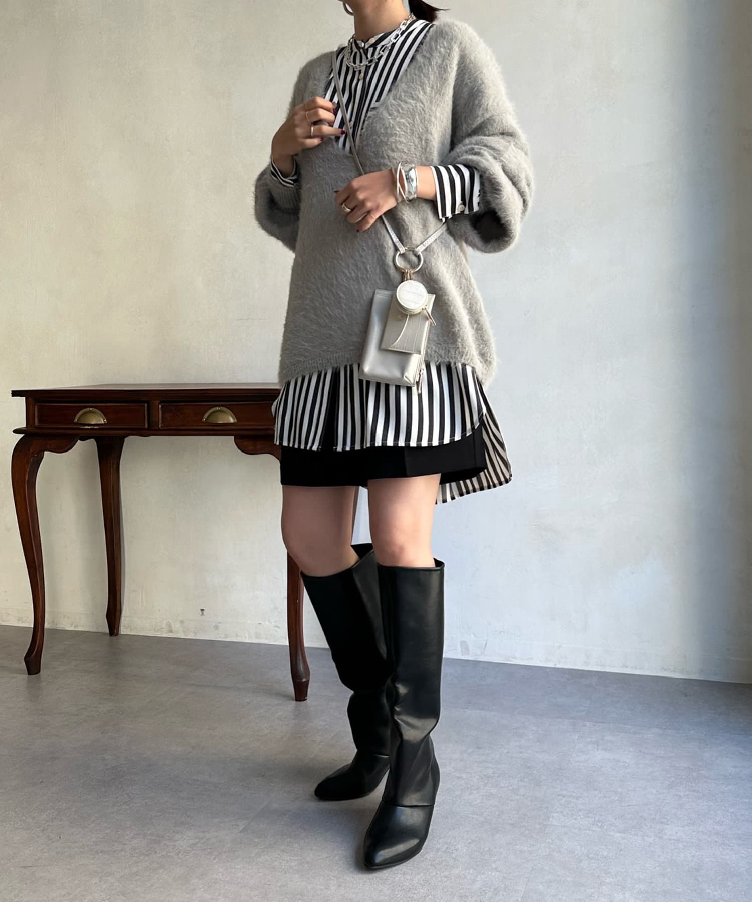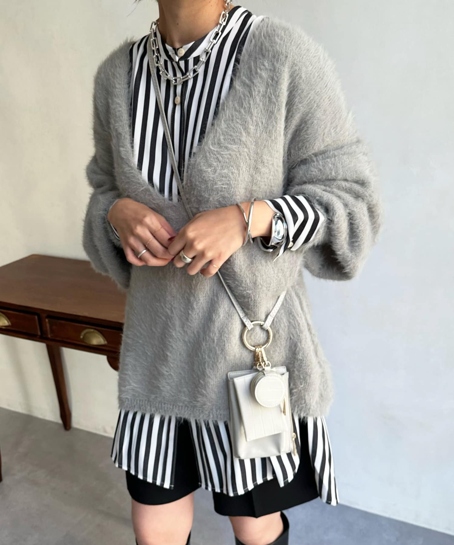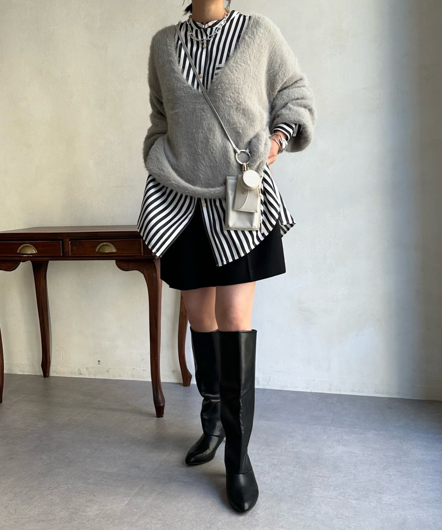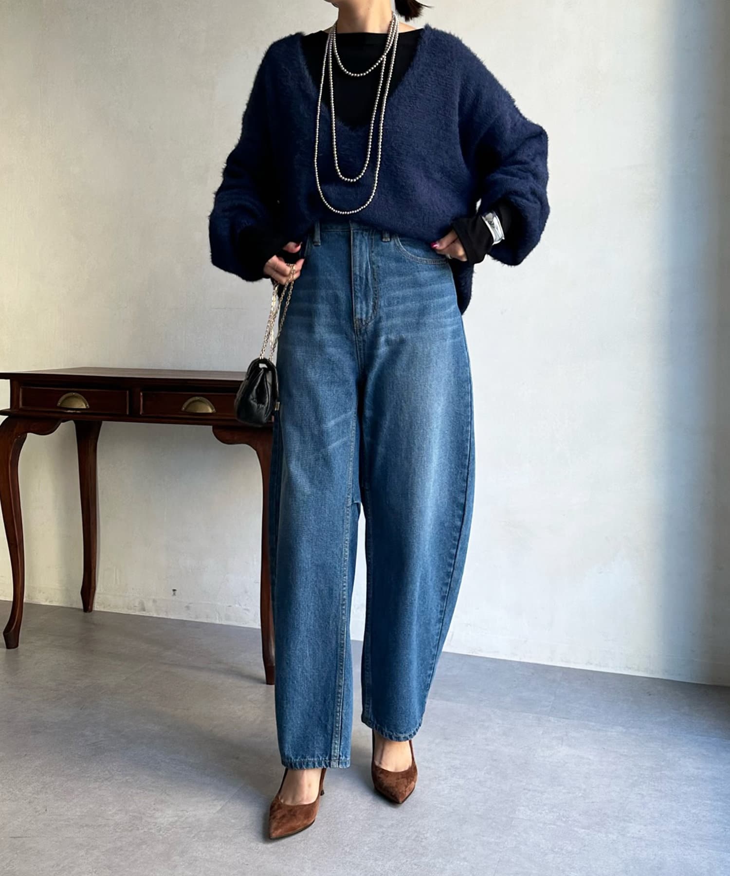 今らしくシーズンムードを高める、毛足感のある素材がポイントのニット。