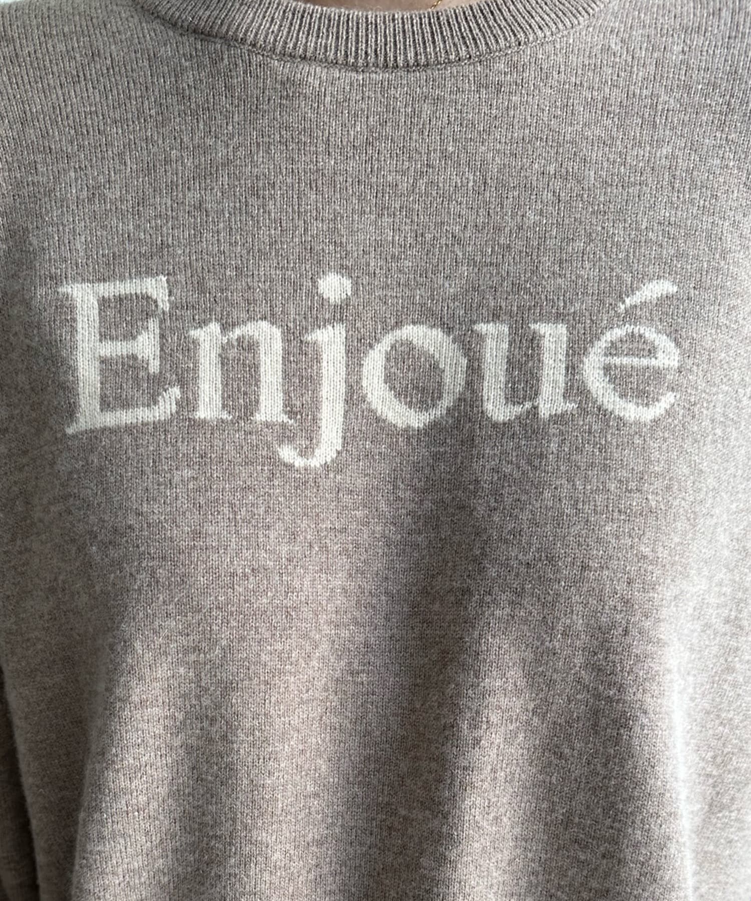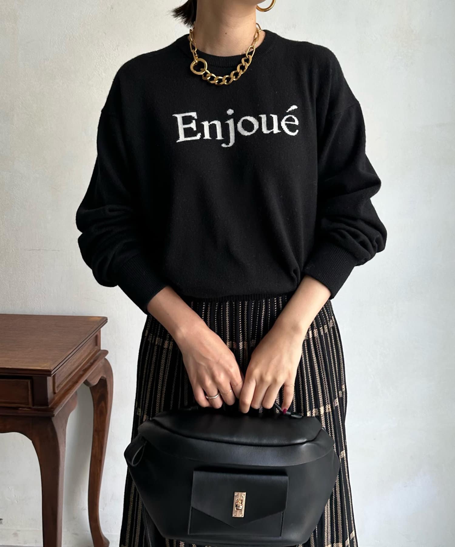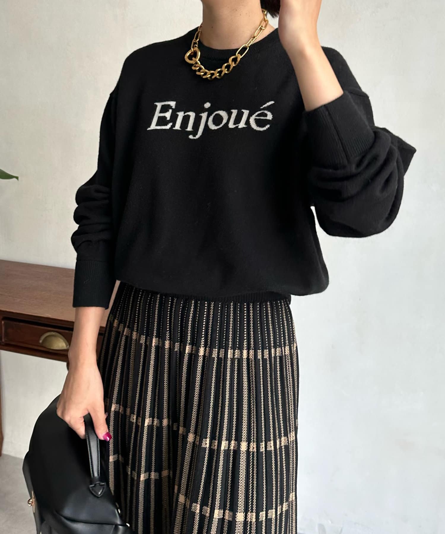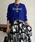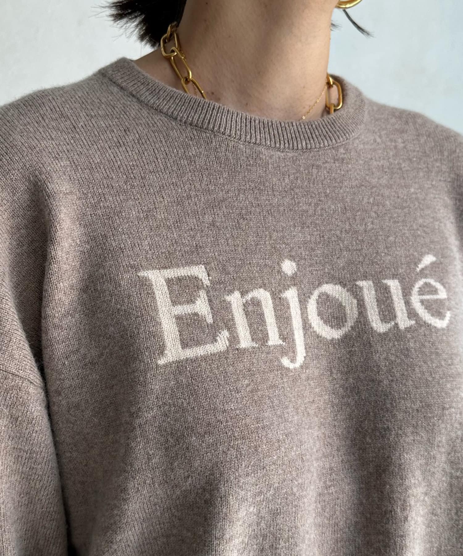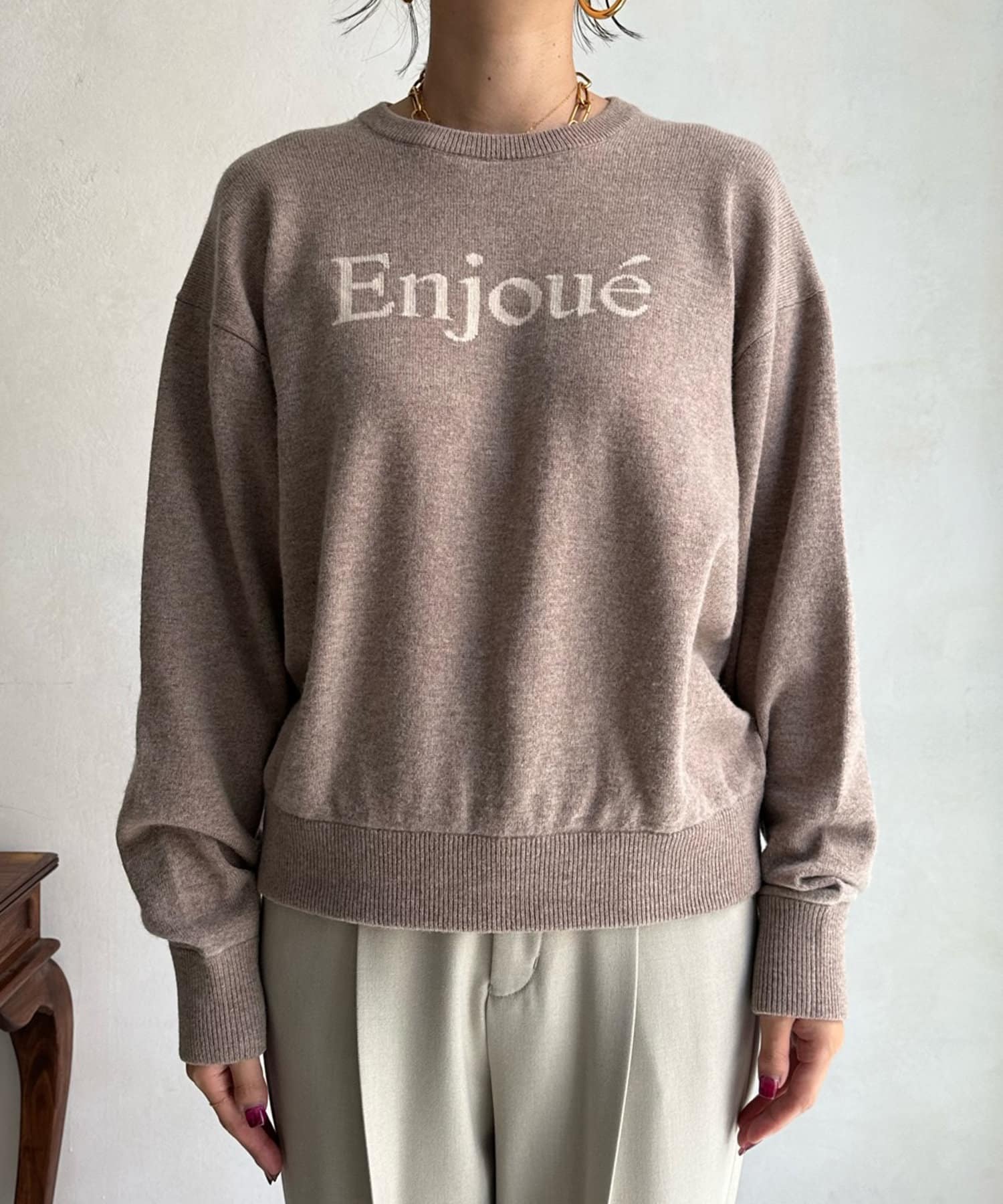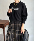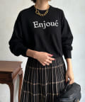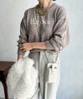 インターシャ編みでコーディネートしやすいシンプルなニットは、スウェットほどカジュアルにはなりすぎず、大人らしく着られるのがポイント。細字のロゴが控えめで、大人らしい印象に仕上げます。