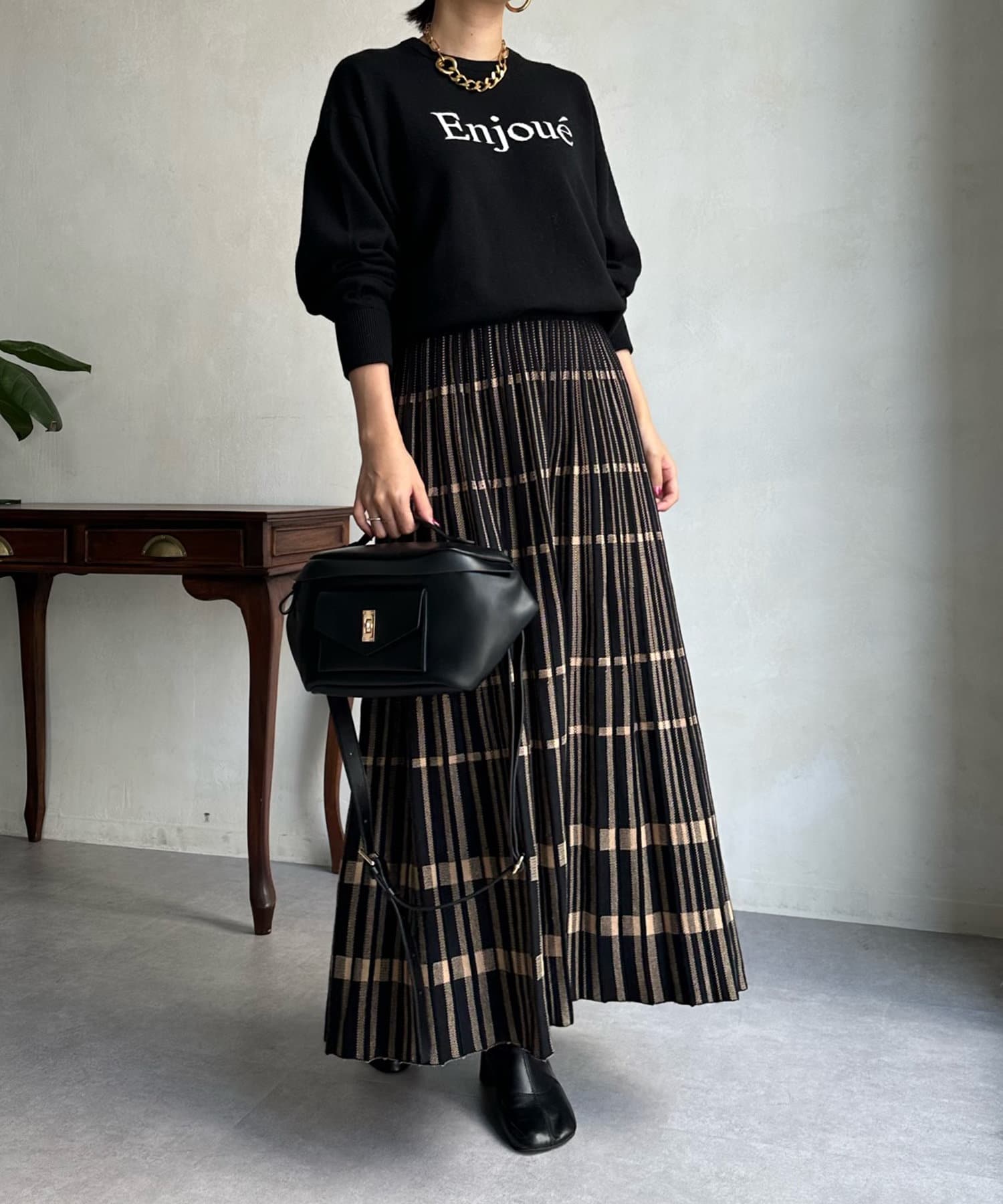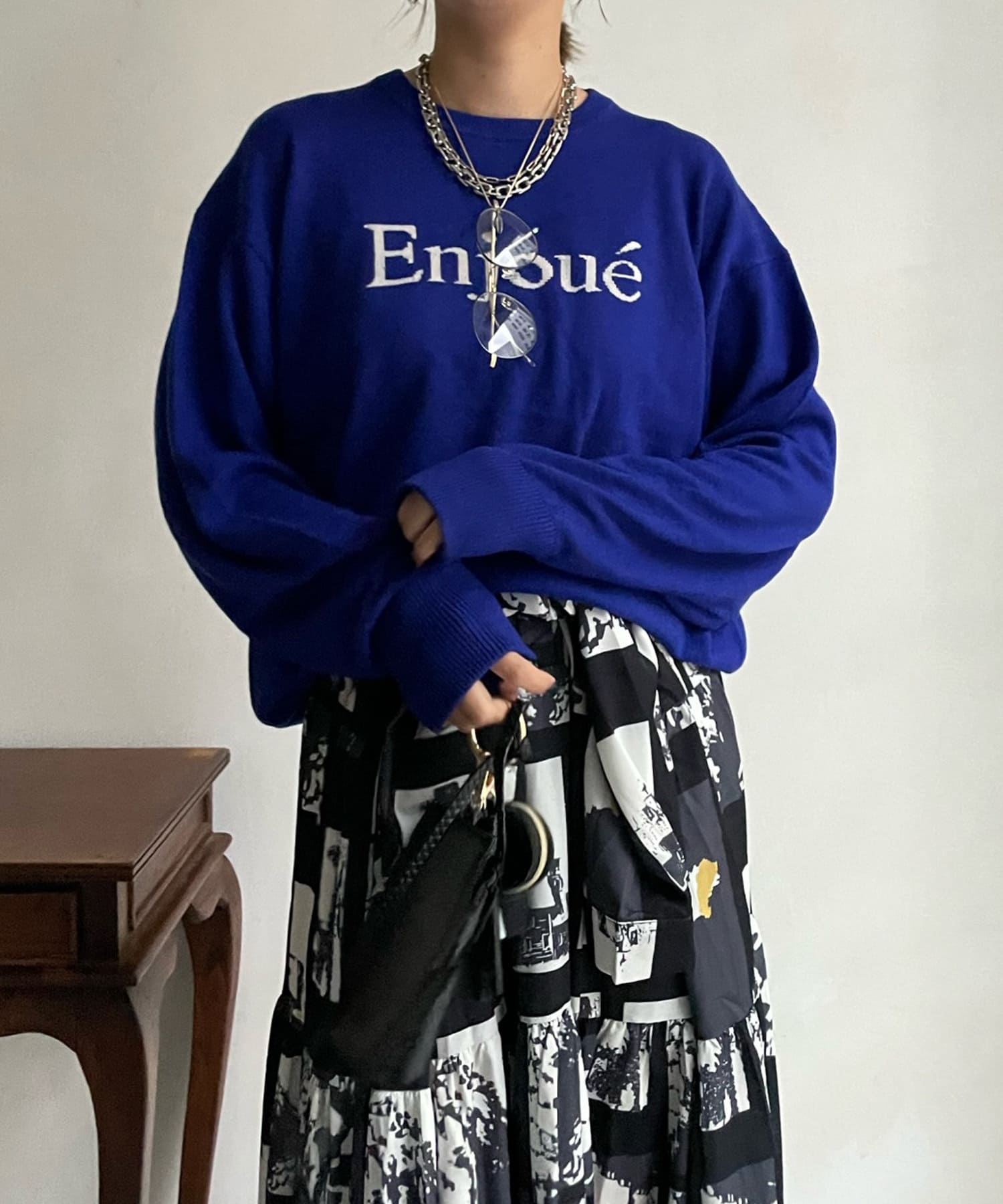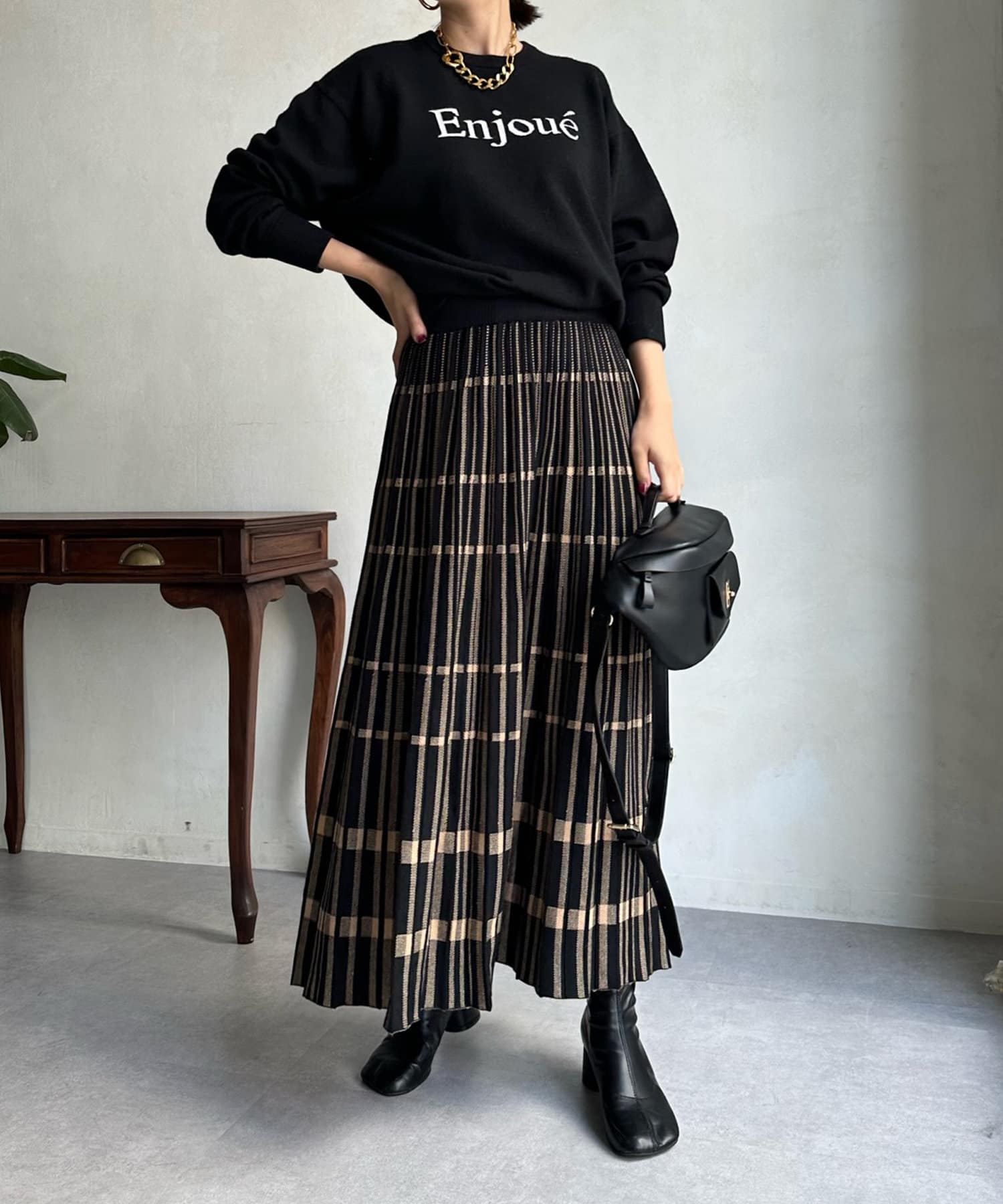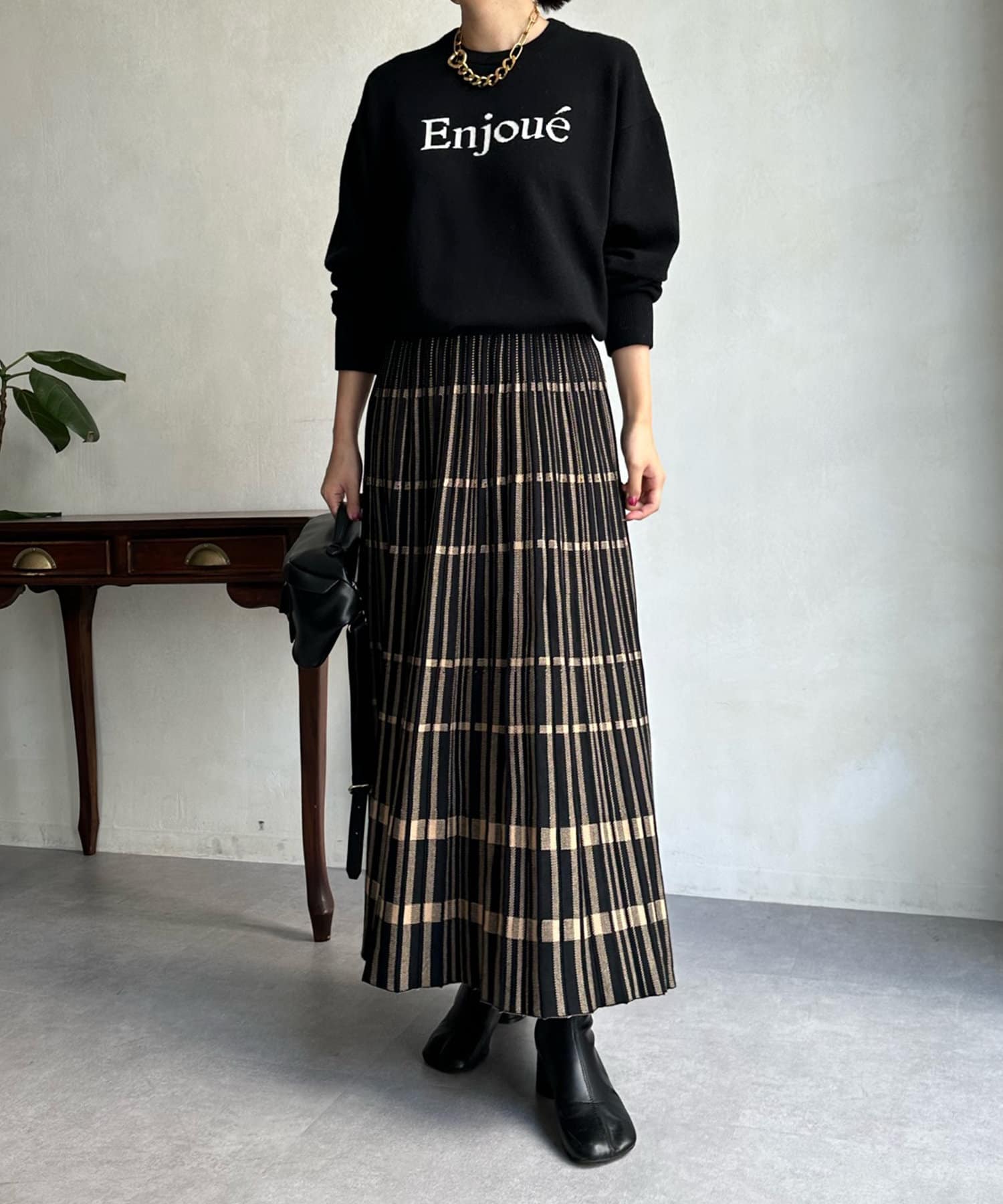 インターシャ編みでコーディネートしやすいシンプルなニットは、スウェットほどカジュアルにはなりすぎず、大人らしく着られるのがポイント。細字のロゴが控えめで、大人らしい印象に仕上げます。