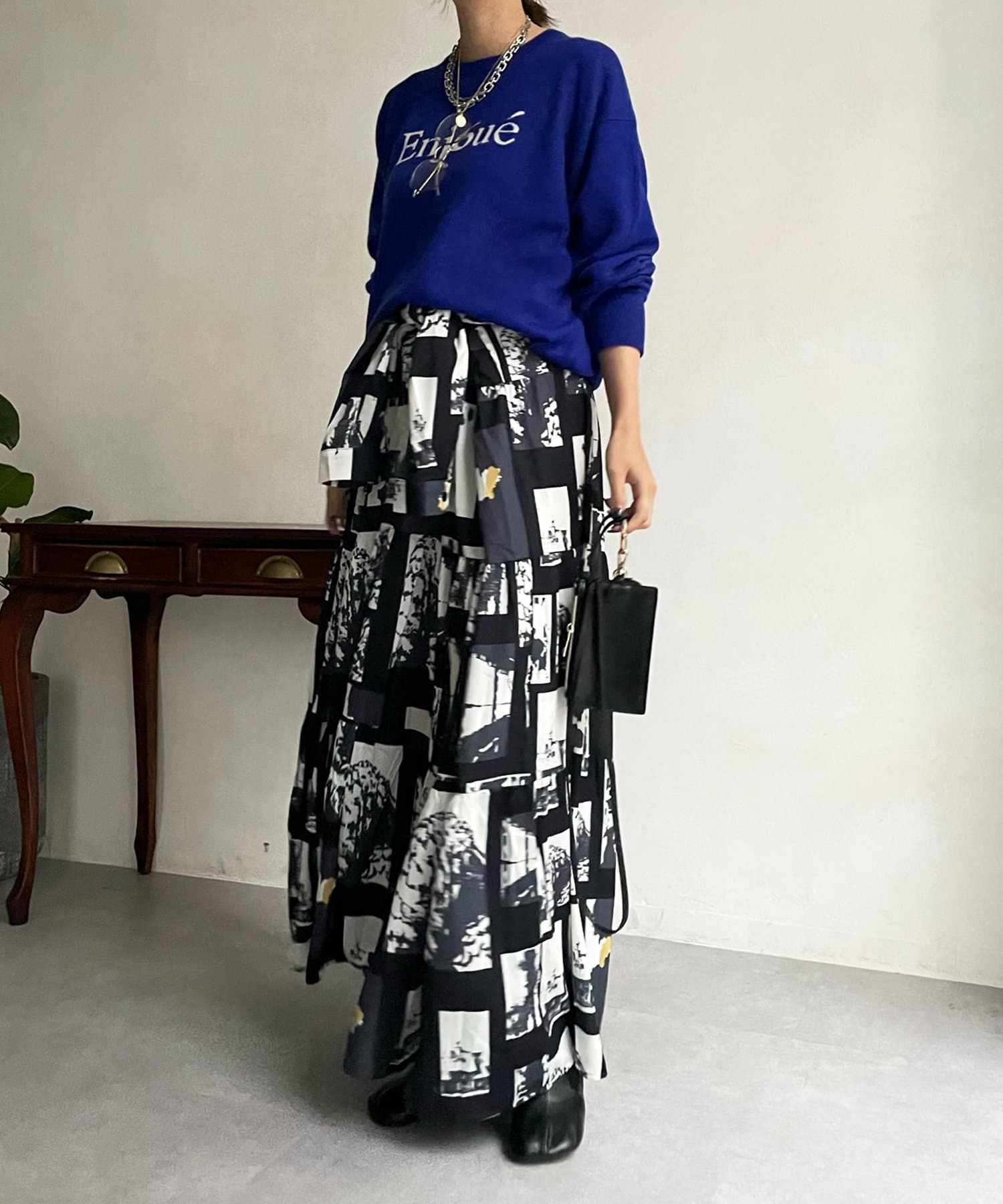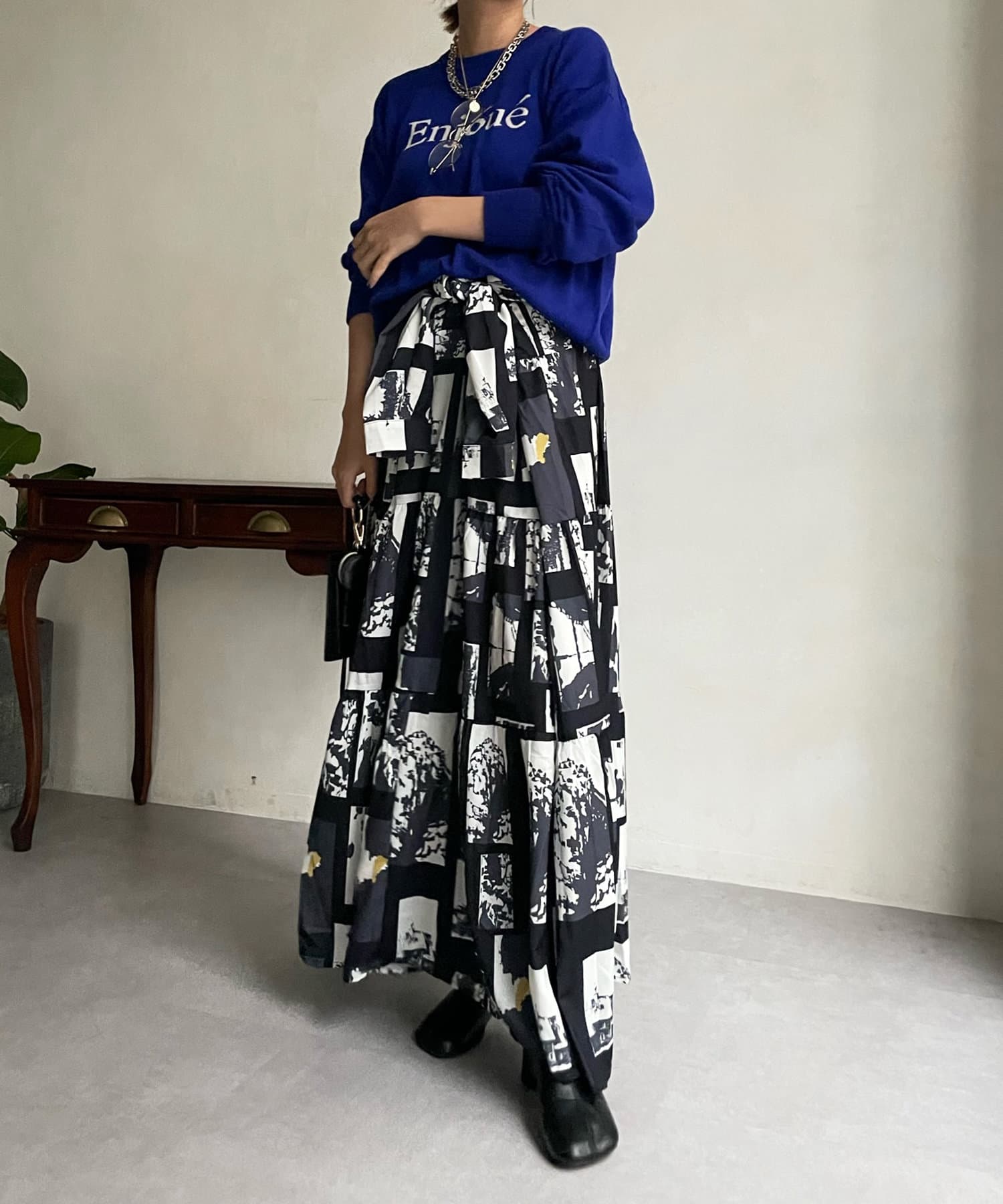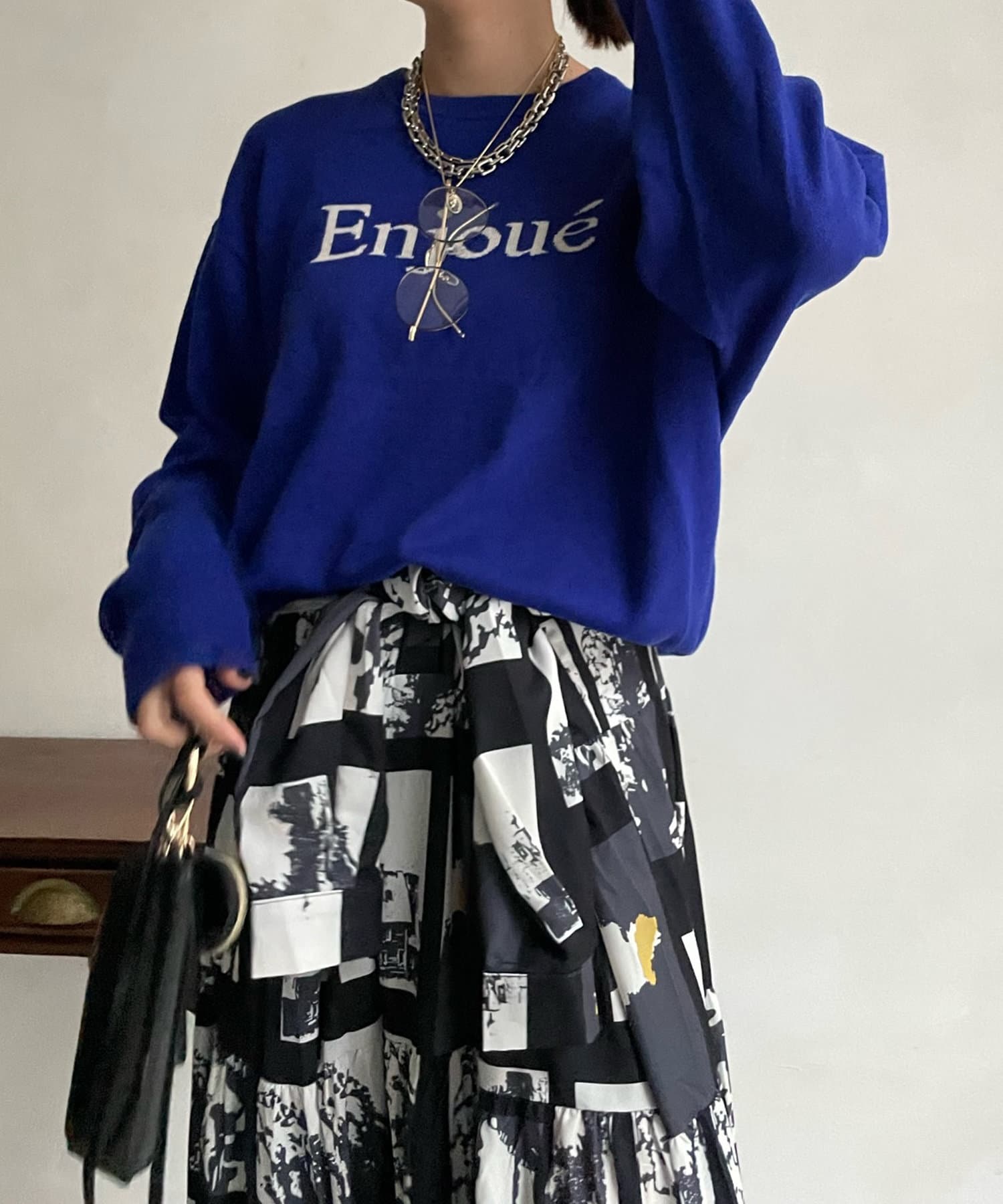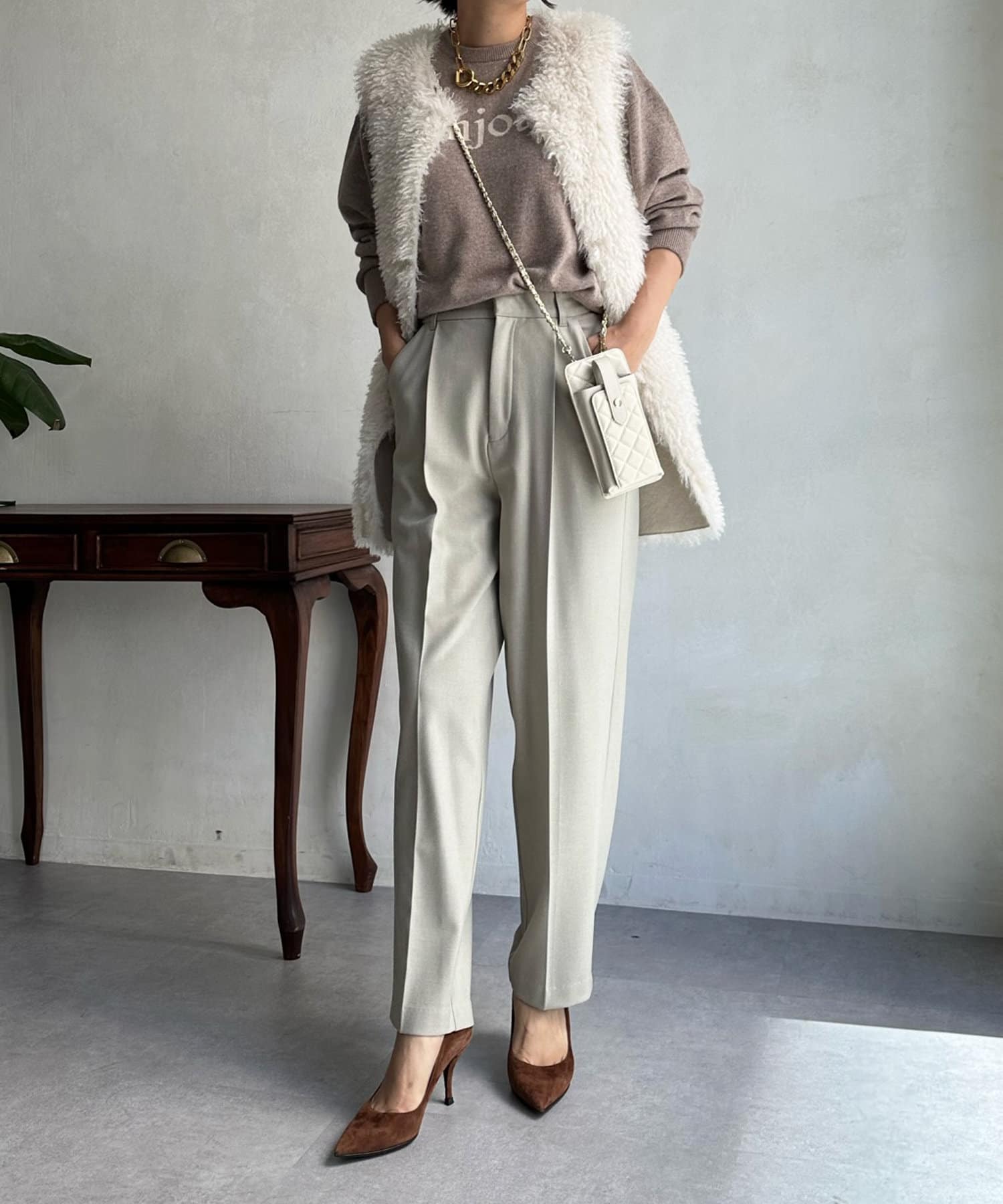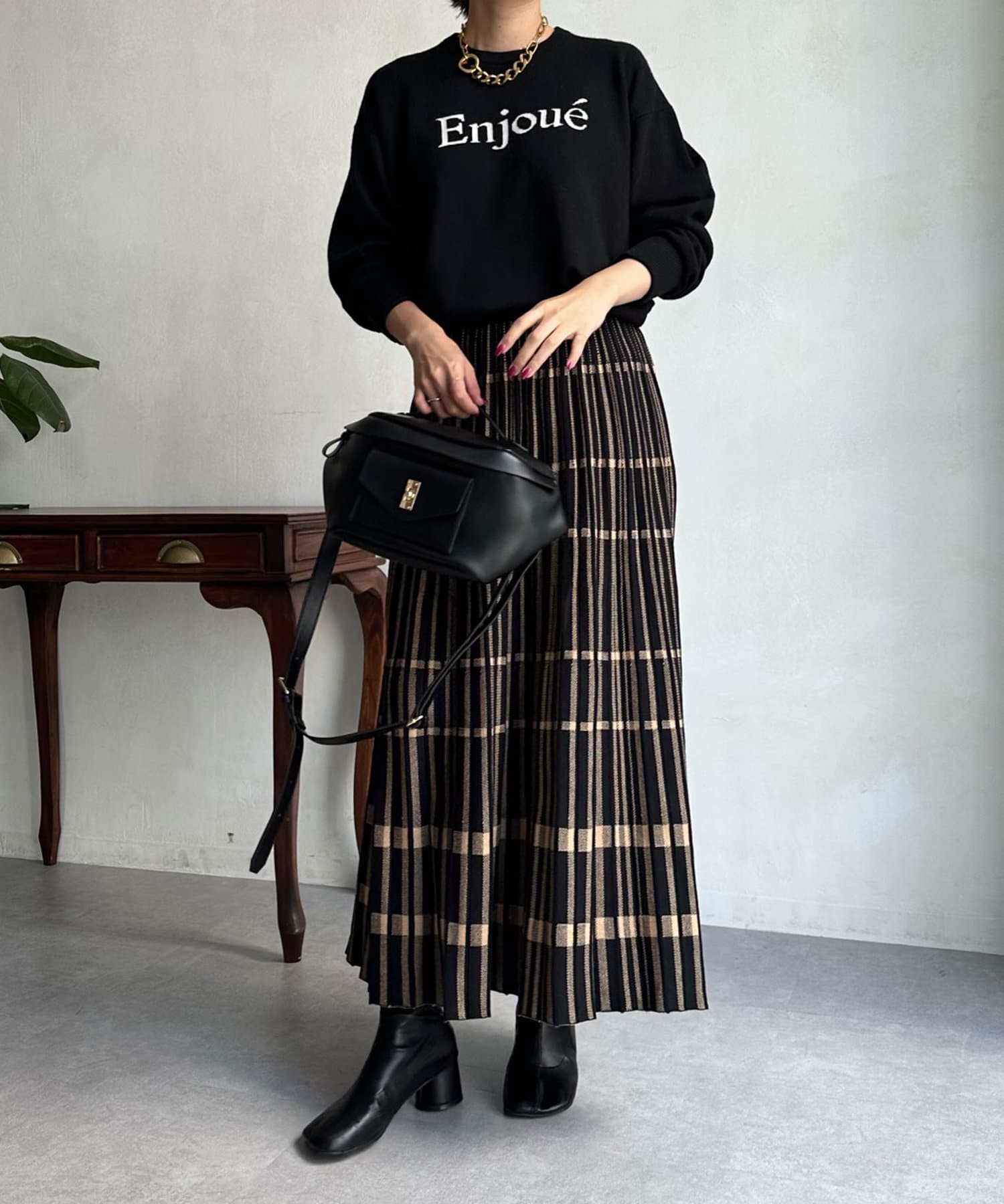 インターシャ編みでコーディネートしやすいシンプルなニットは、スウェットほどカジュアルにはなりすぎず、大人らしく着られるのがポイント。細字のロゴが控えめで、大人らしい印象に仕上げます。