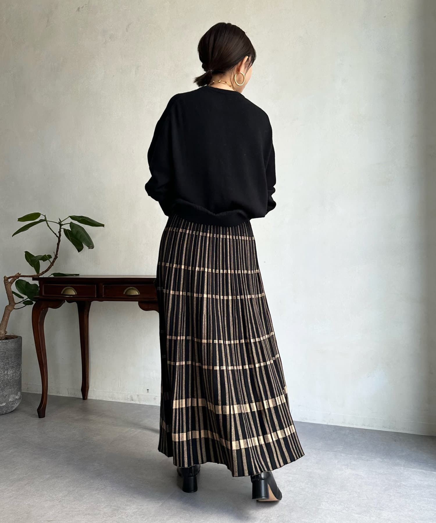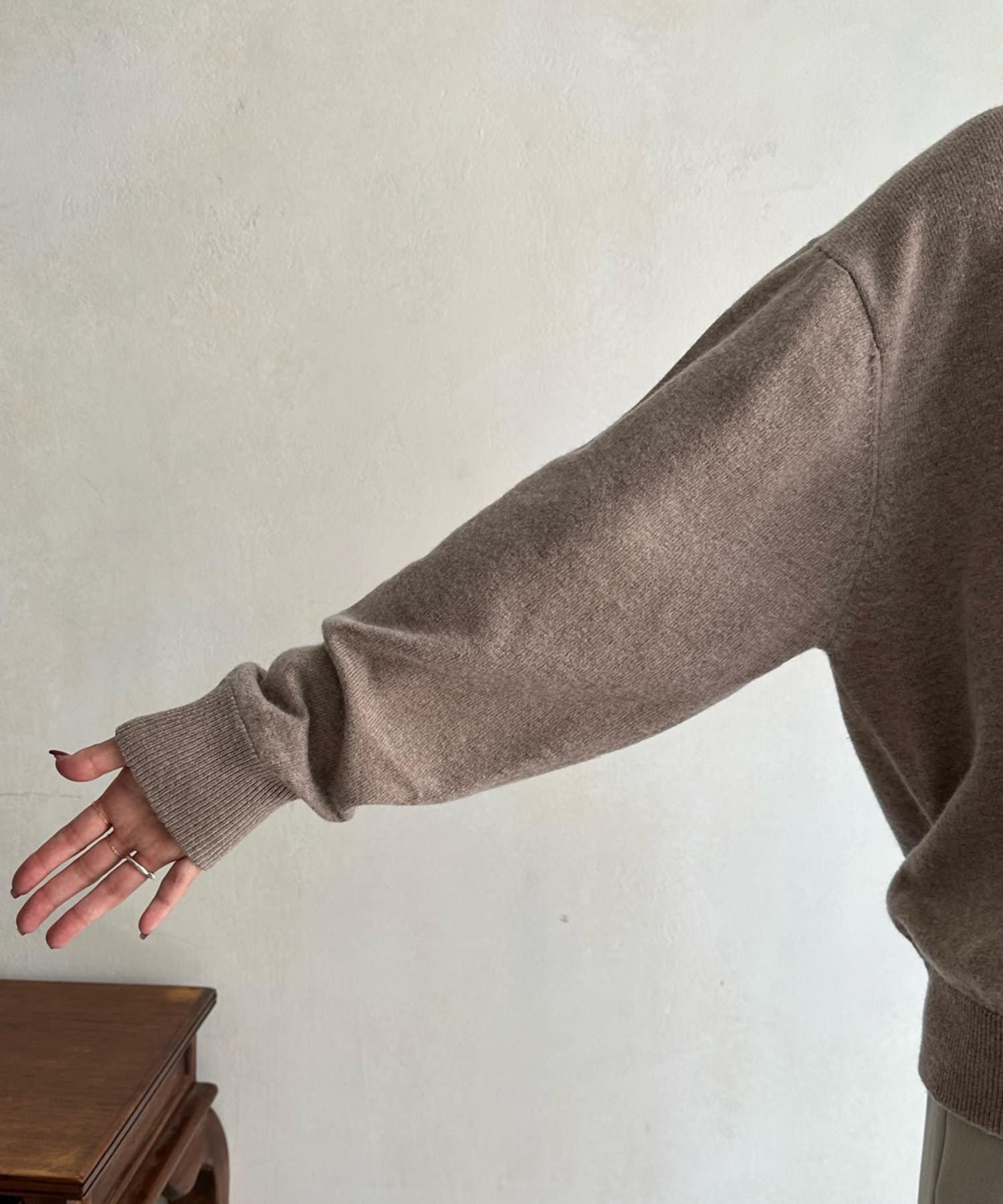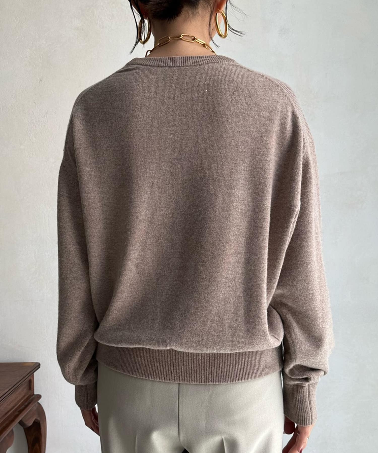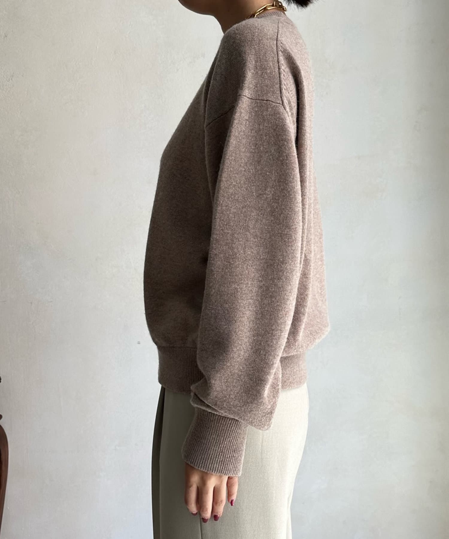 薄手ながら、カシミヤ混の素材なので暖かく着られる1着。コンパクトな丈感で、ボトムインのスタイルも楽しんでいただけます。