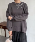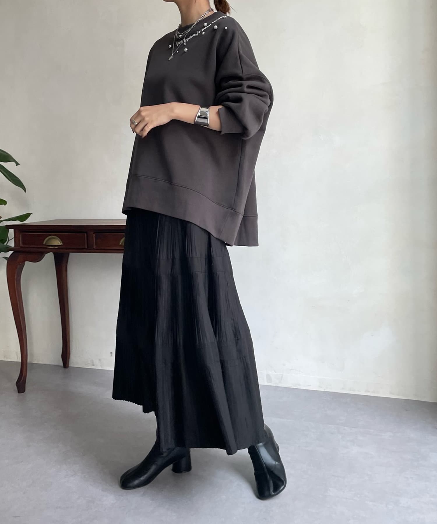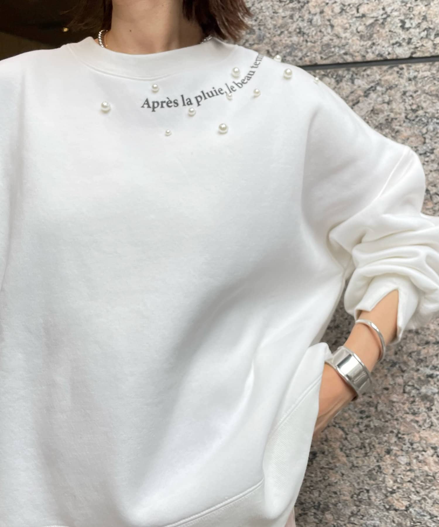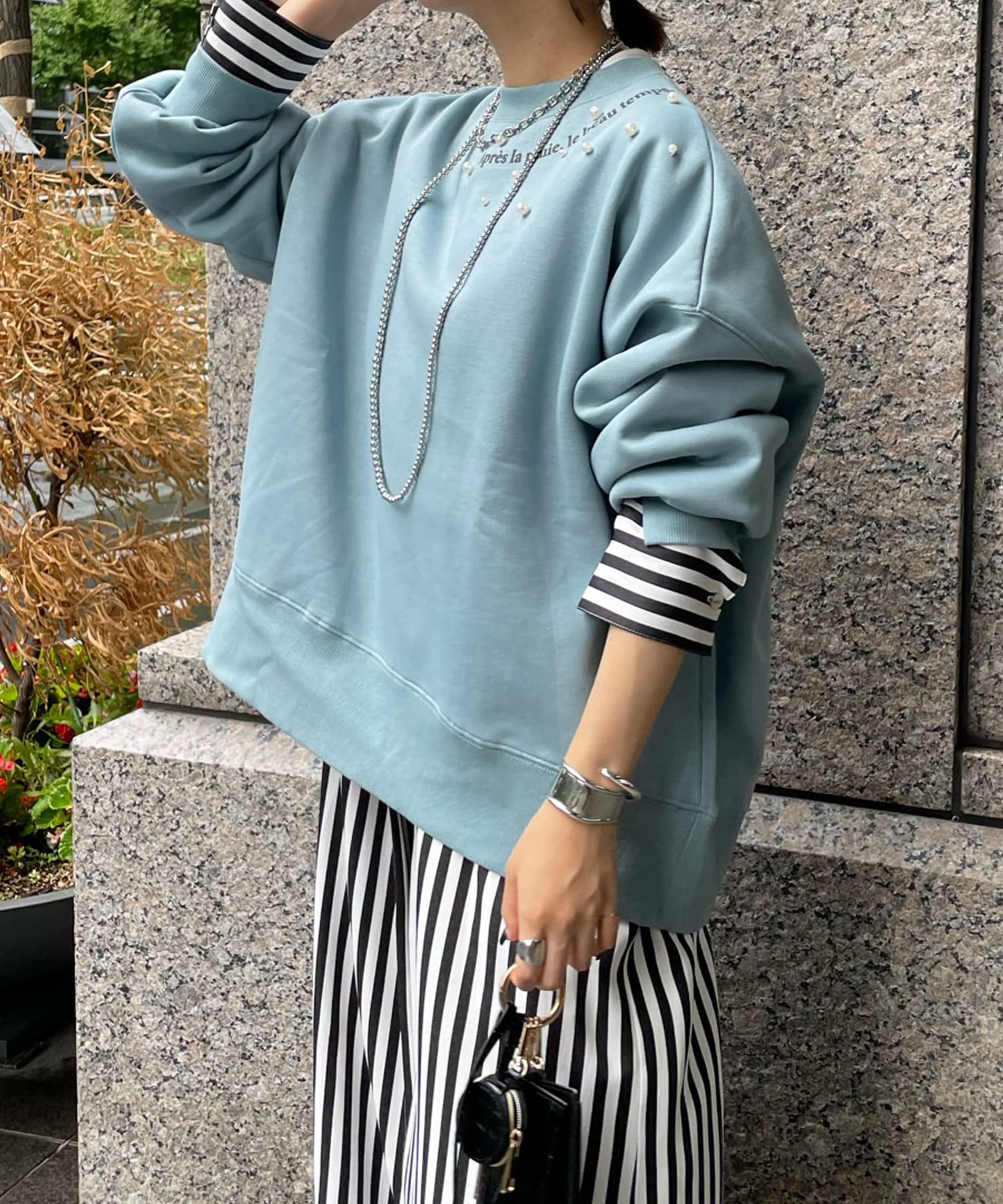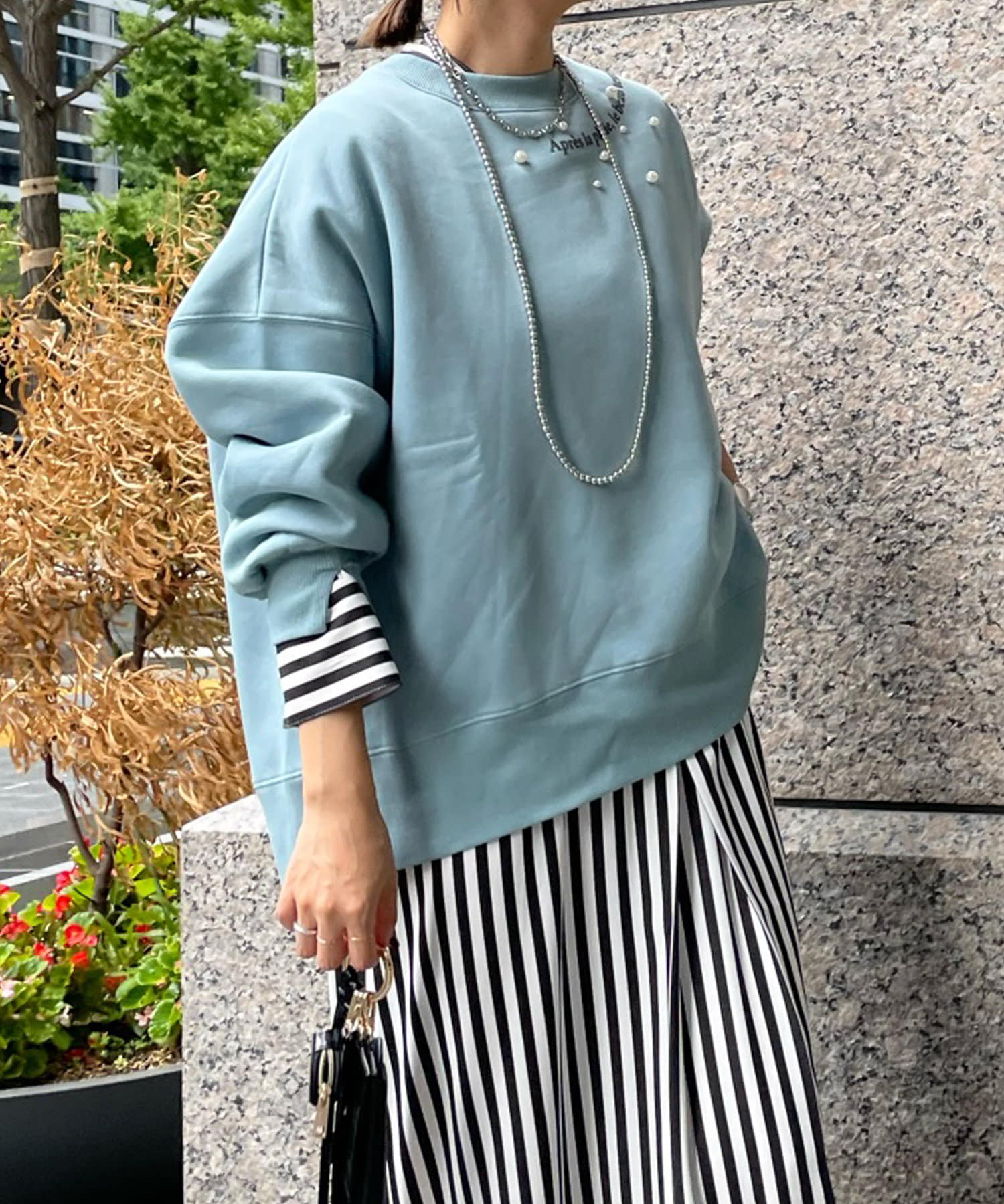 パール×プルオーバーの組み合わせがきれいめカジュアルな印象に!