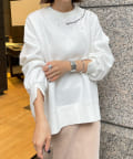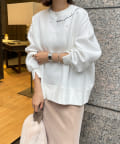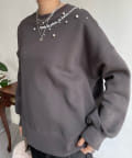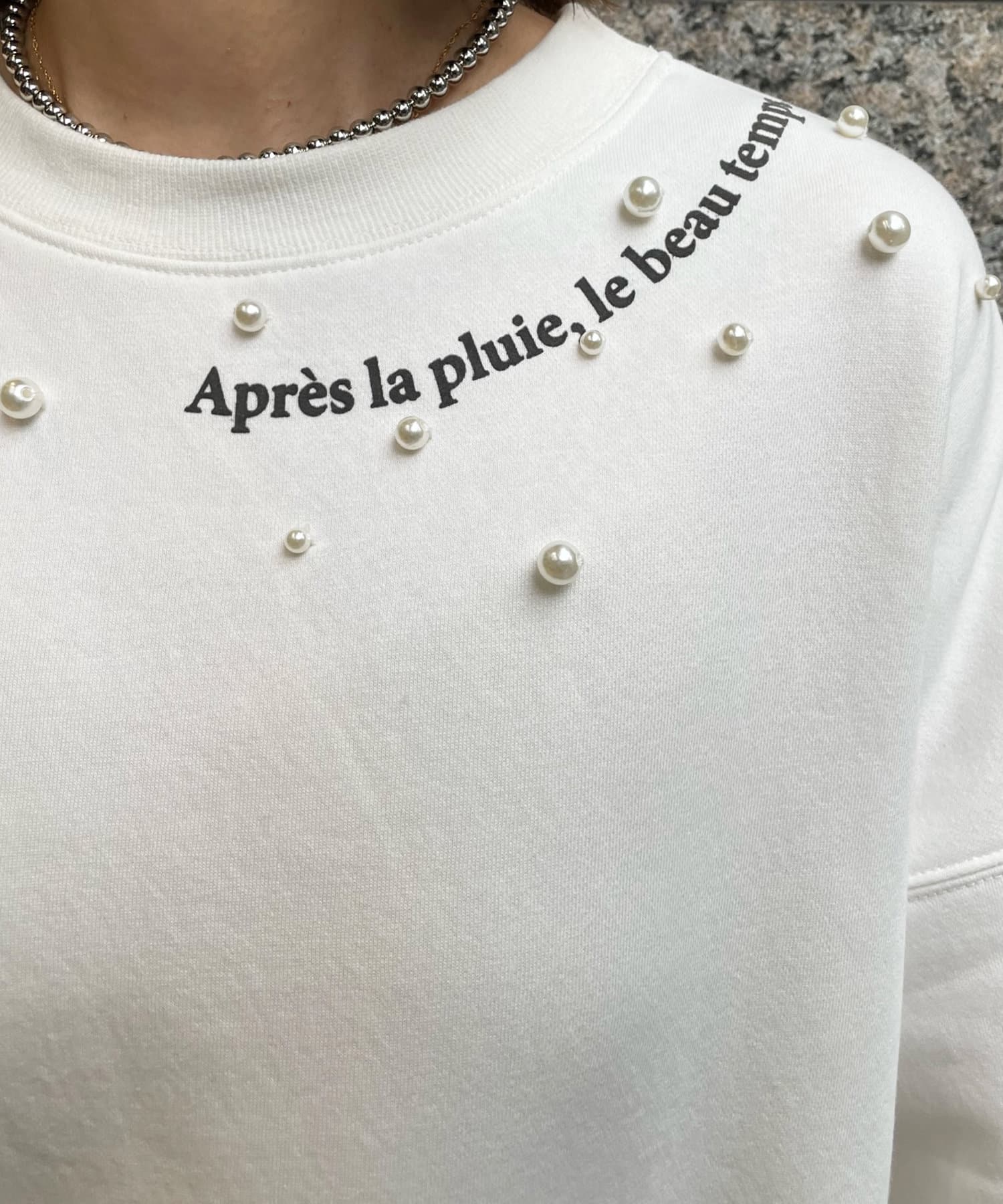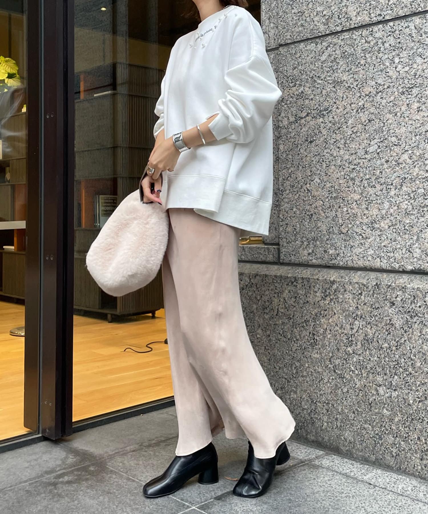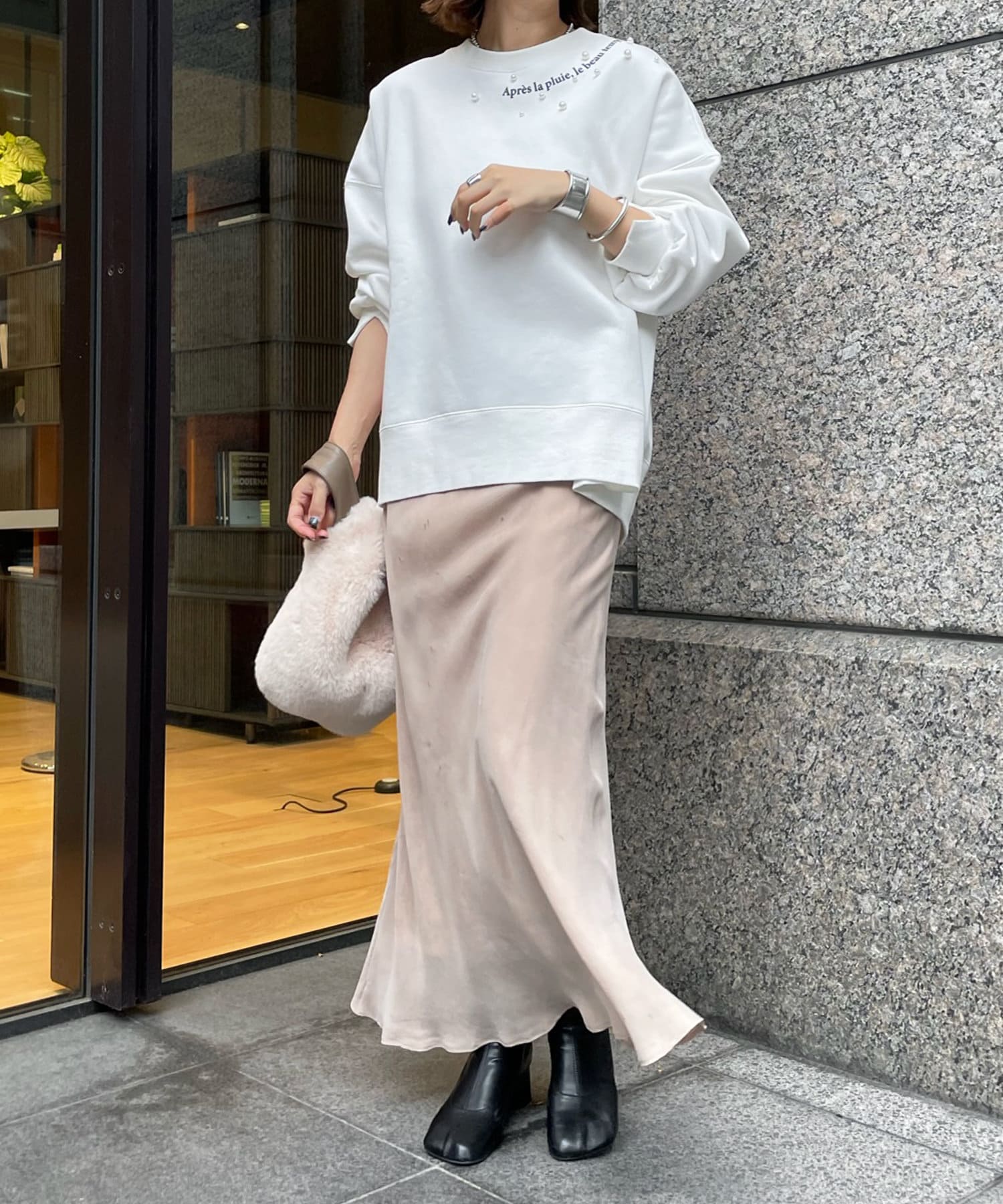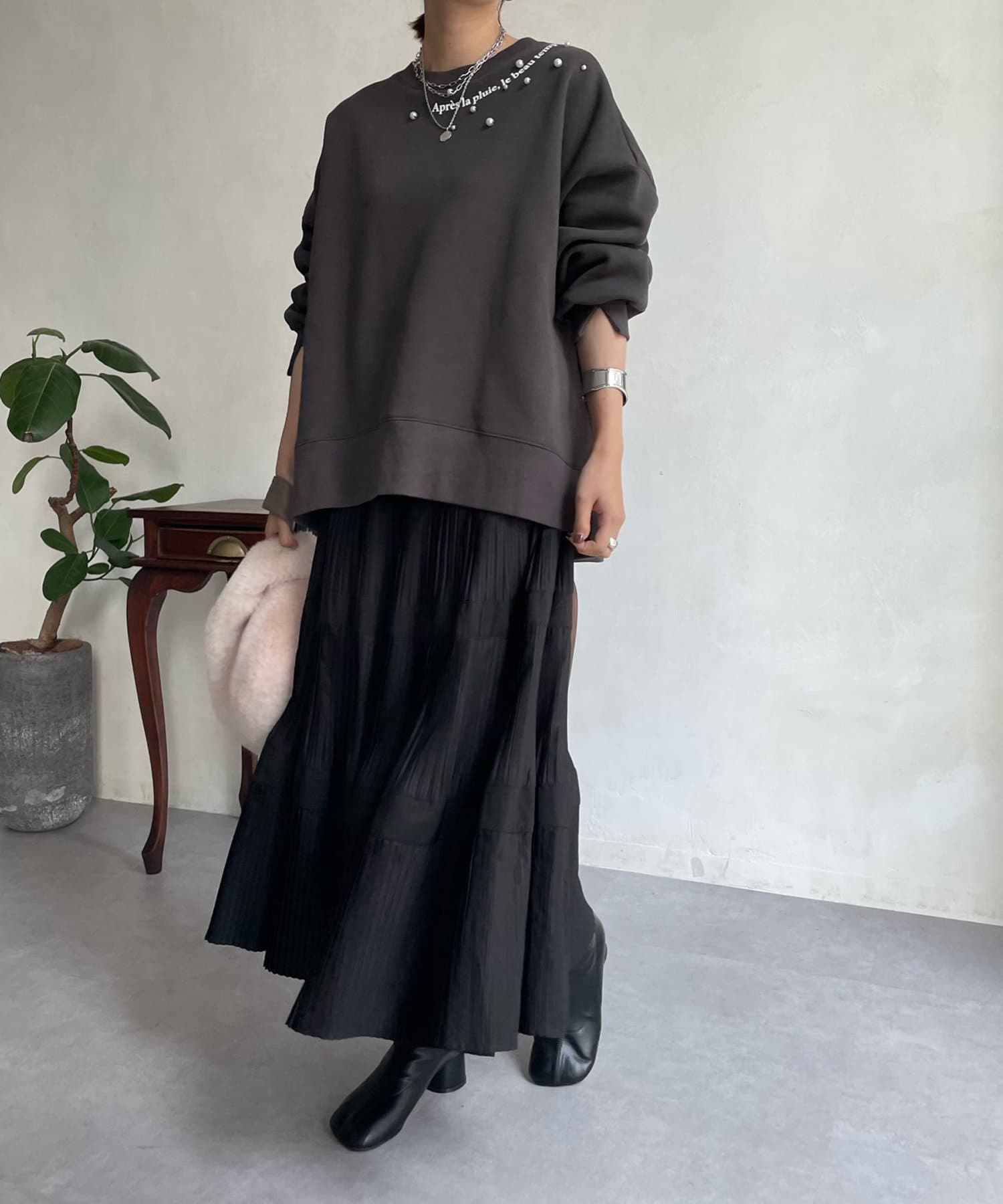 パール×プルオーバーの組み合わせがきれいめカジュアルな印象に!