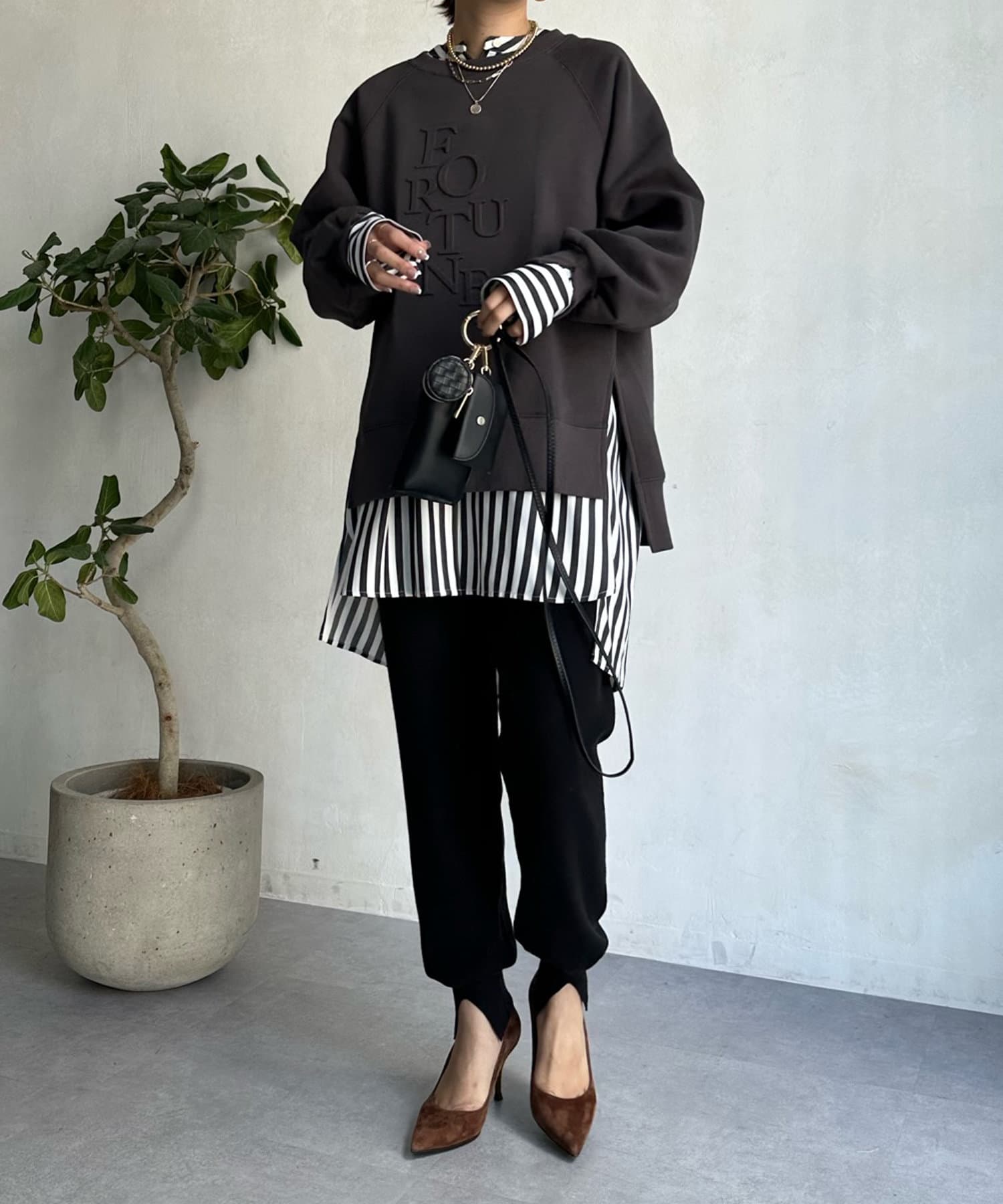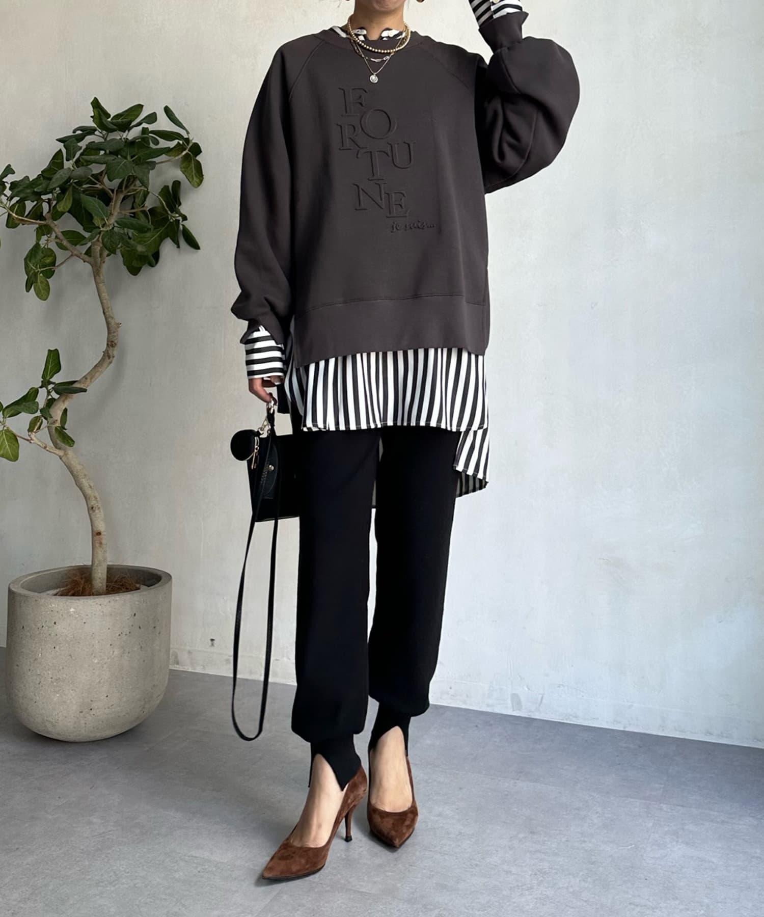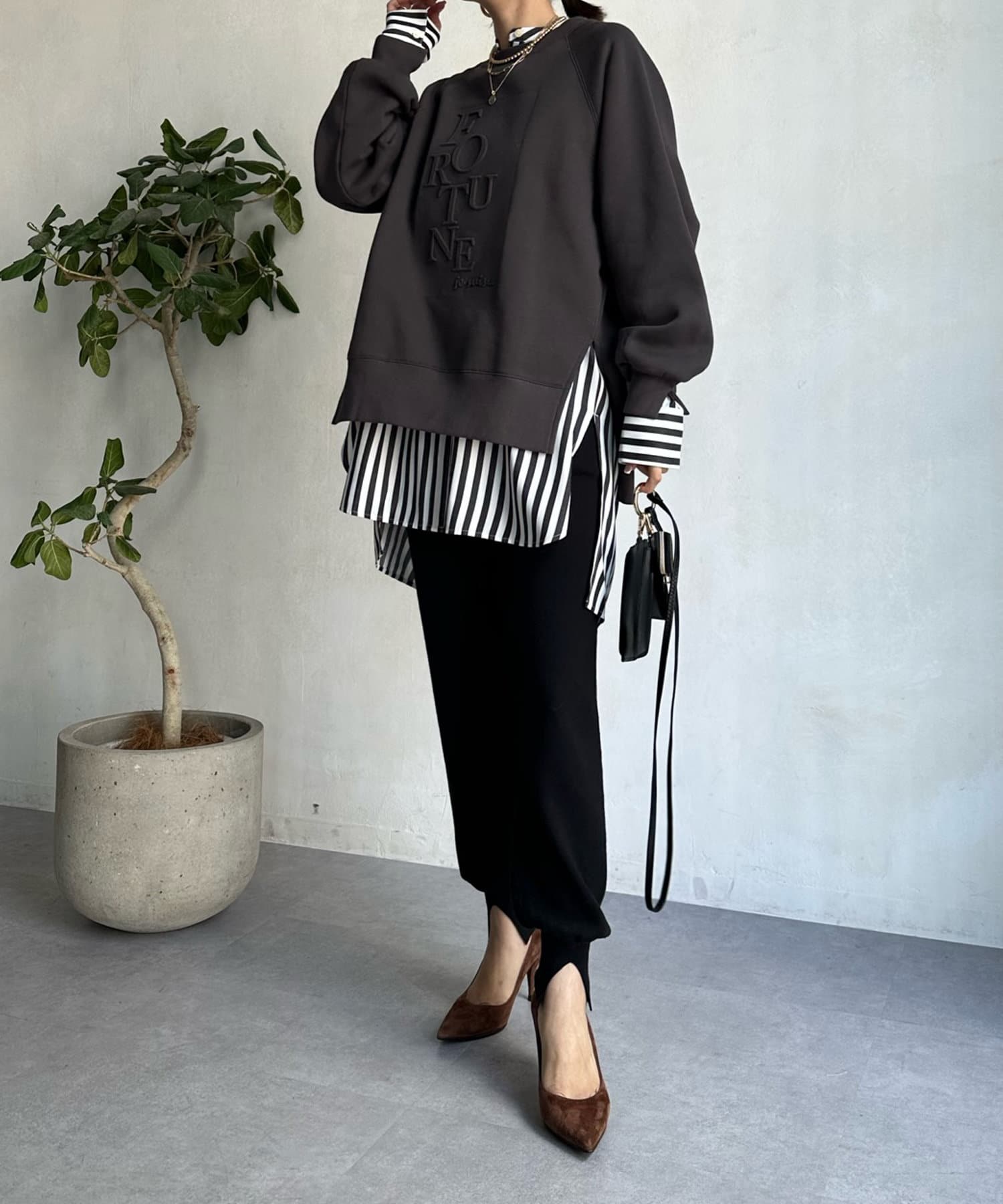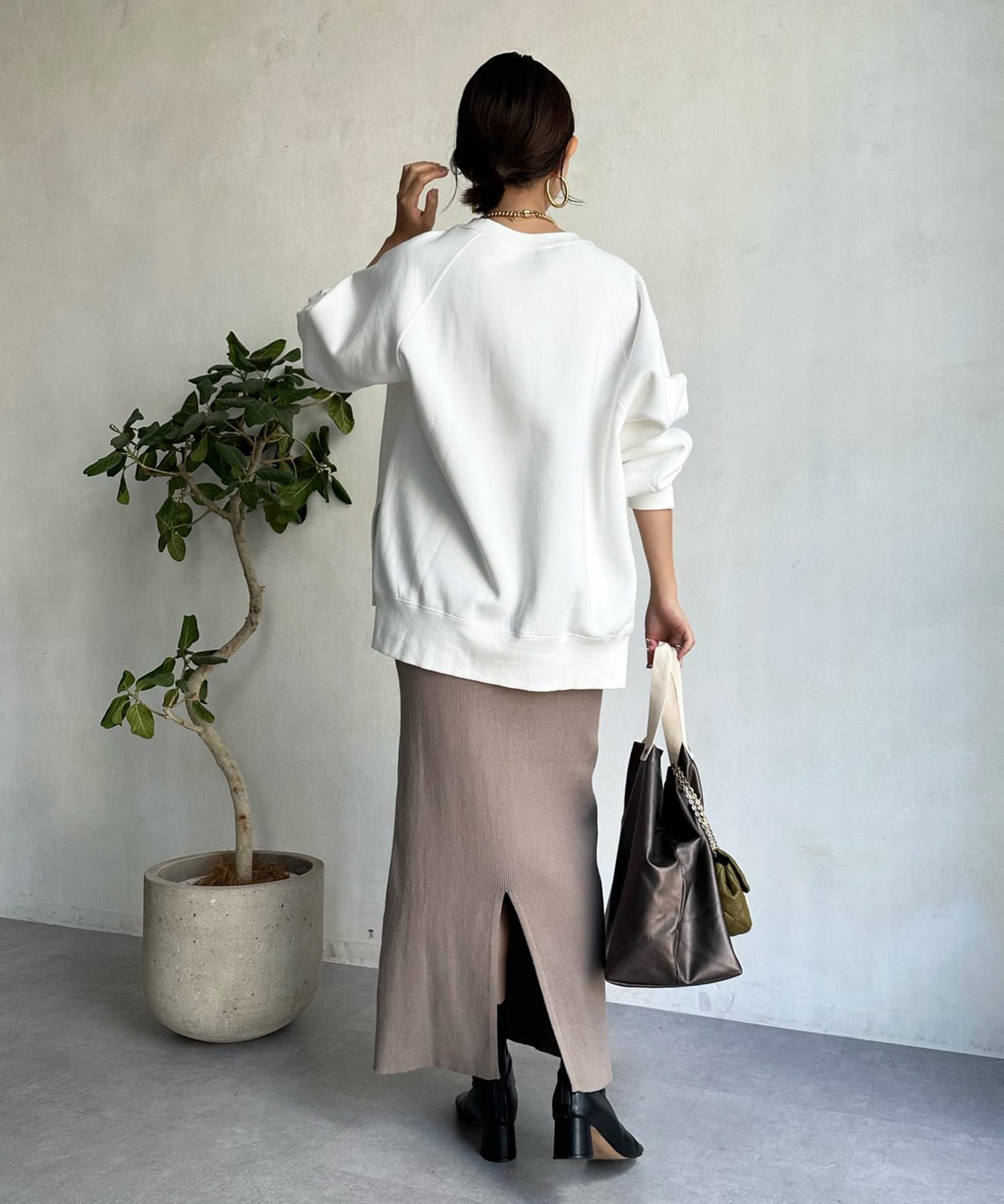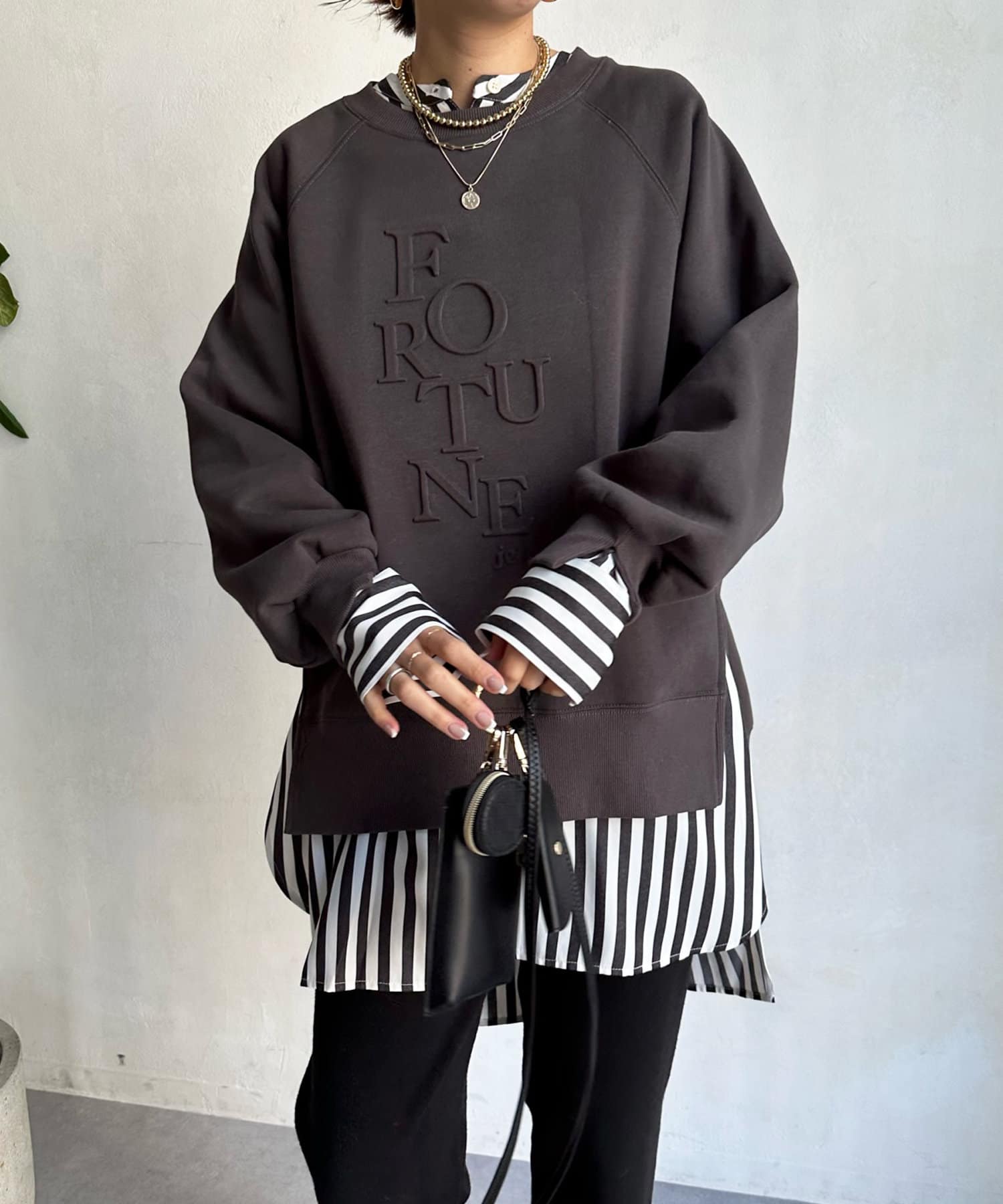程よくゆとりのあるシルエットで身体のラインを拾いにくく、また、袖口のスリットがさり気ないワンポイントとなってくれますよ。