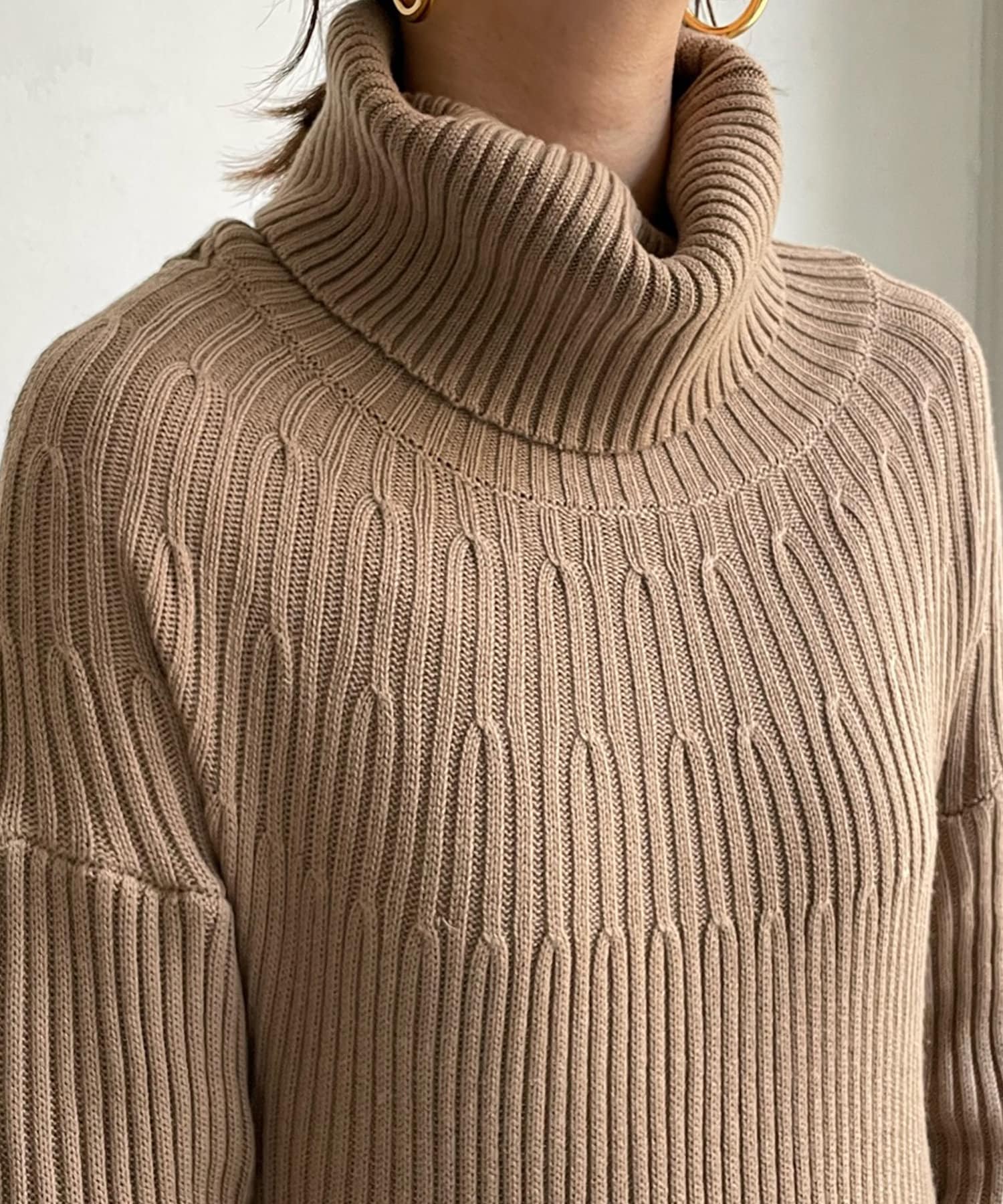 ネックラインは締め付け感のないタートル仕様に。折り返してボリューム感を出すと小顔効果にも期待大です。