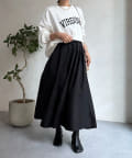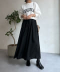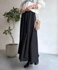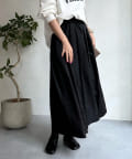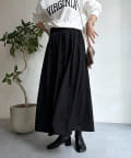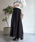 厚手のタフタのような生地感があり、トップスに少しラメ入りのニットなどを合わせれば、ゴージャスな装いになりそうです。ウェストは総ゴムですが、ちょっと硬めというか厚手のしっかりしたゴムなので、ガシッと締めらるような感じです。
