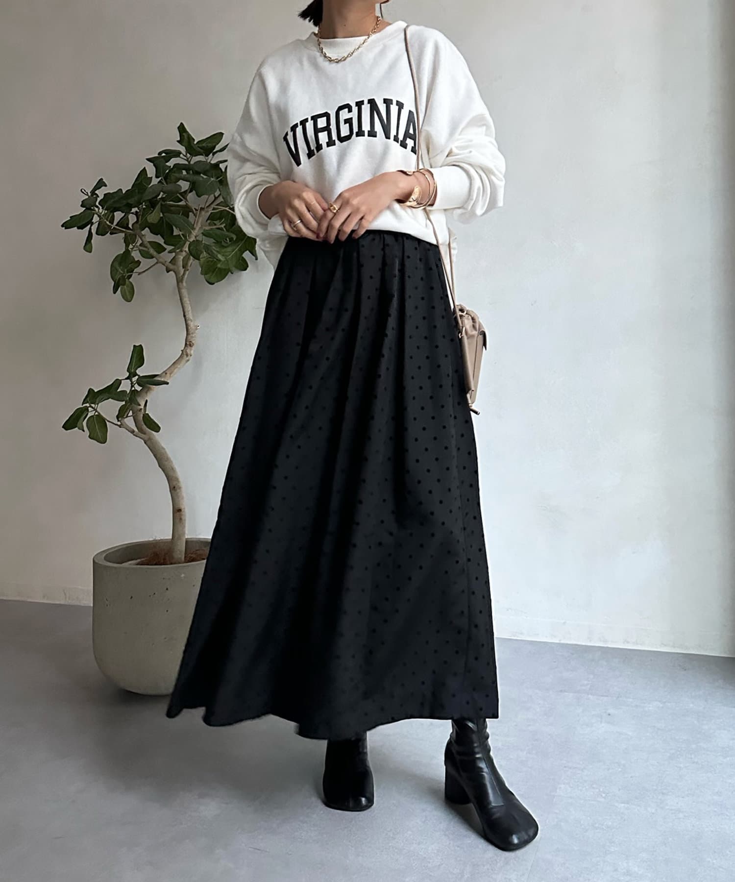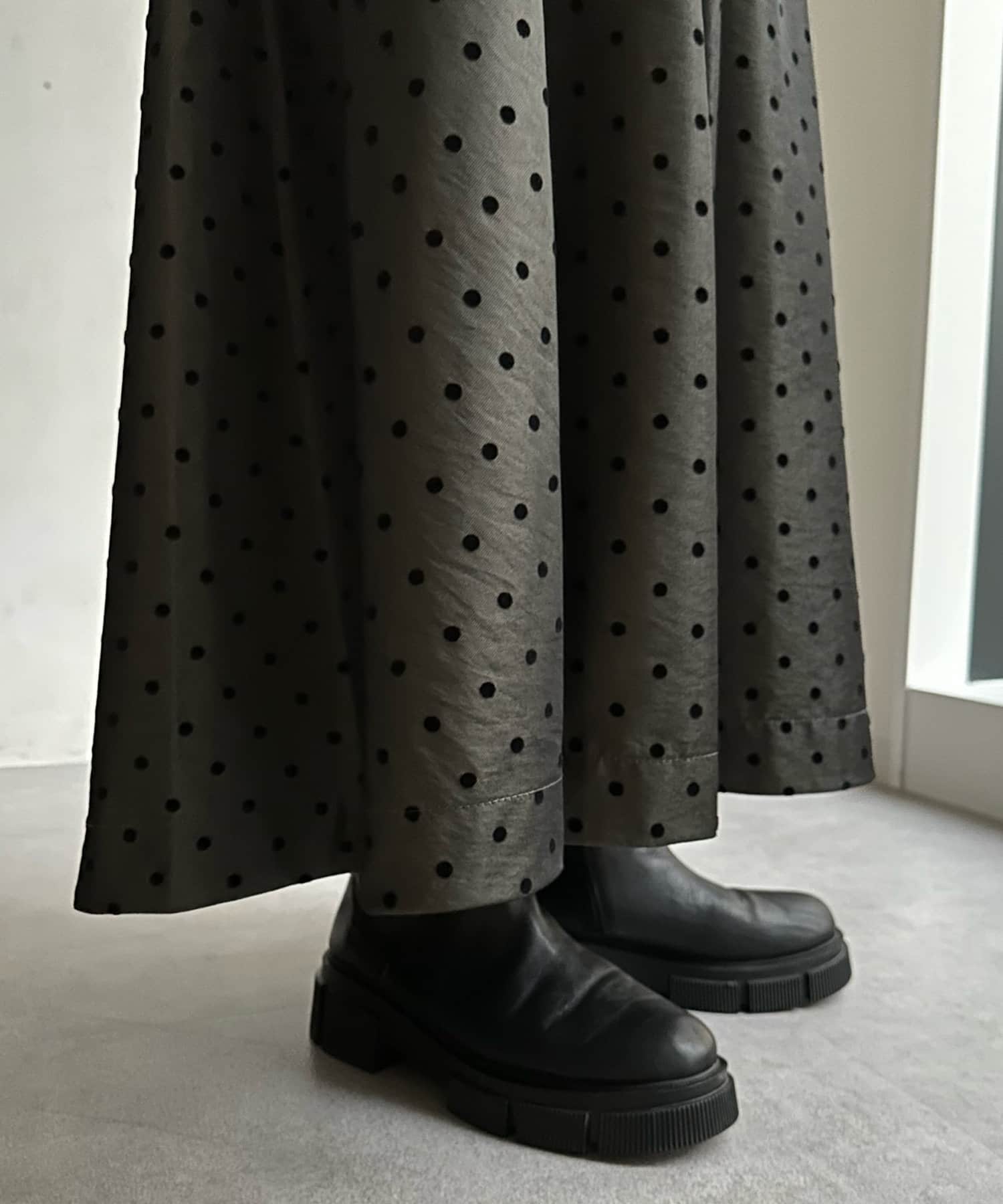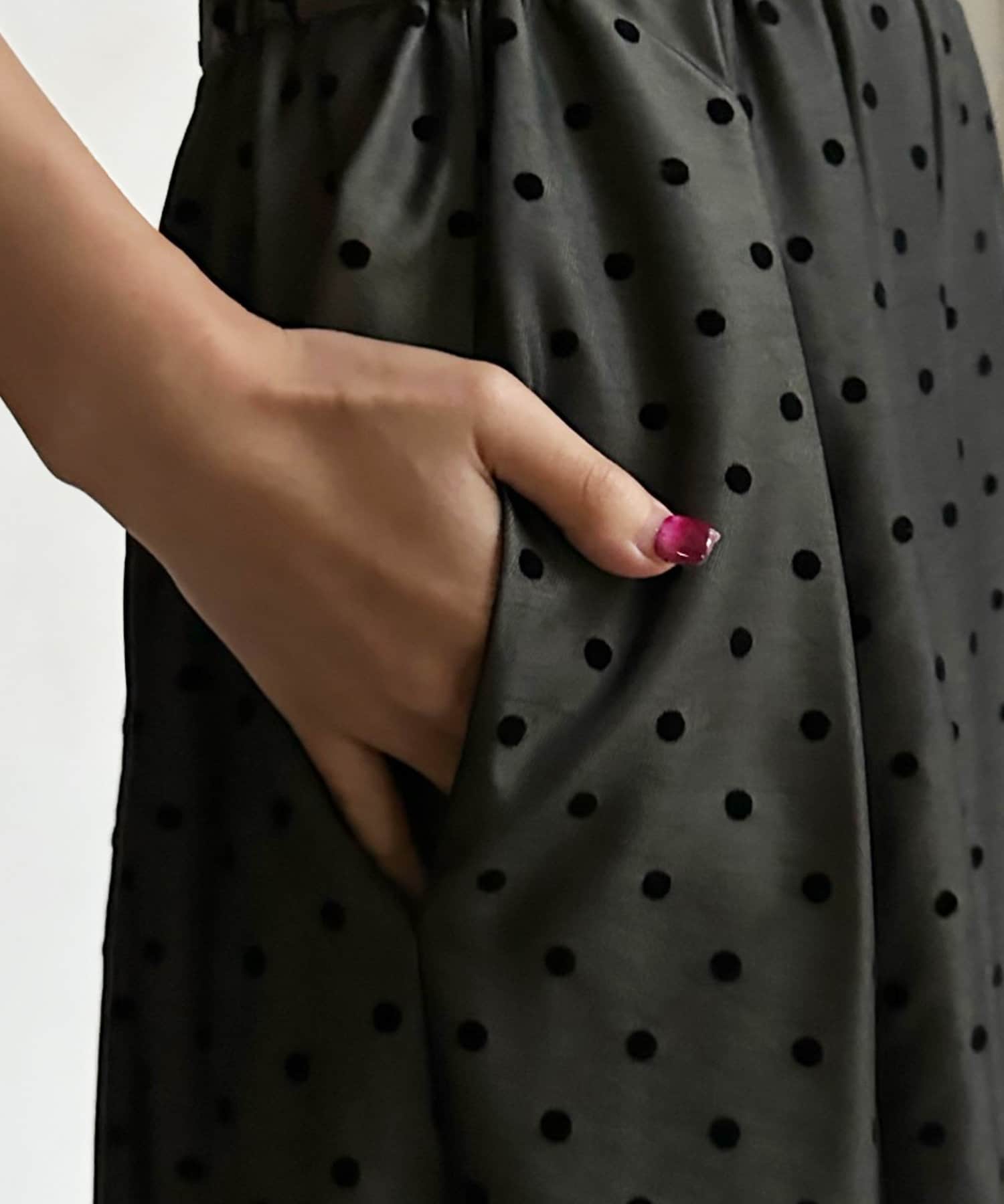 フロッキープリントで施した表面感のあるドット柄がスタイリングに華やかさをプラスします。