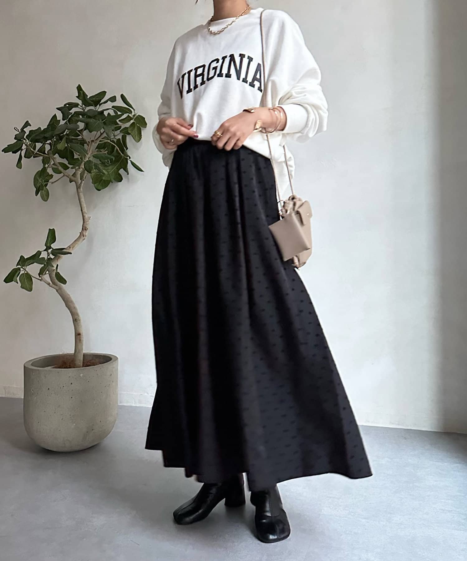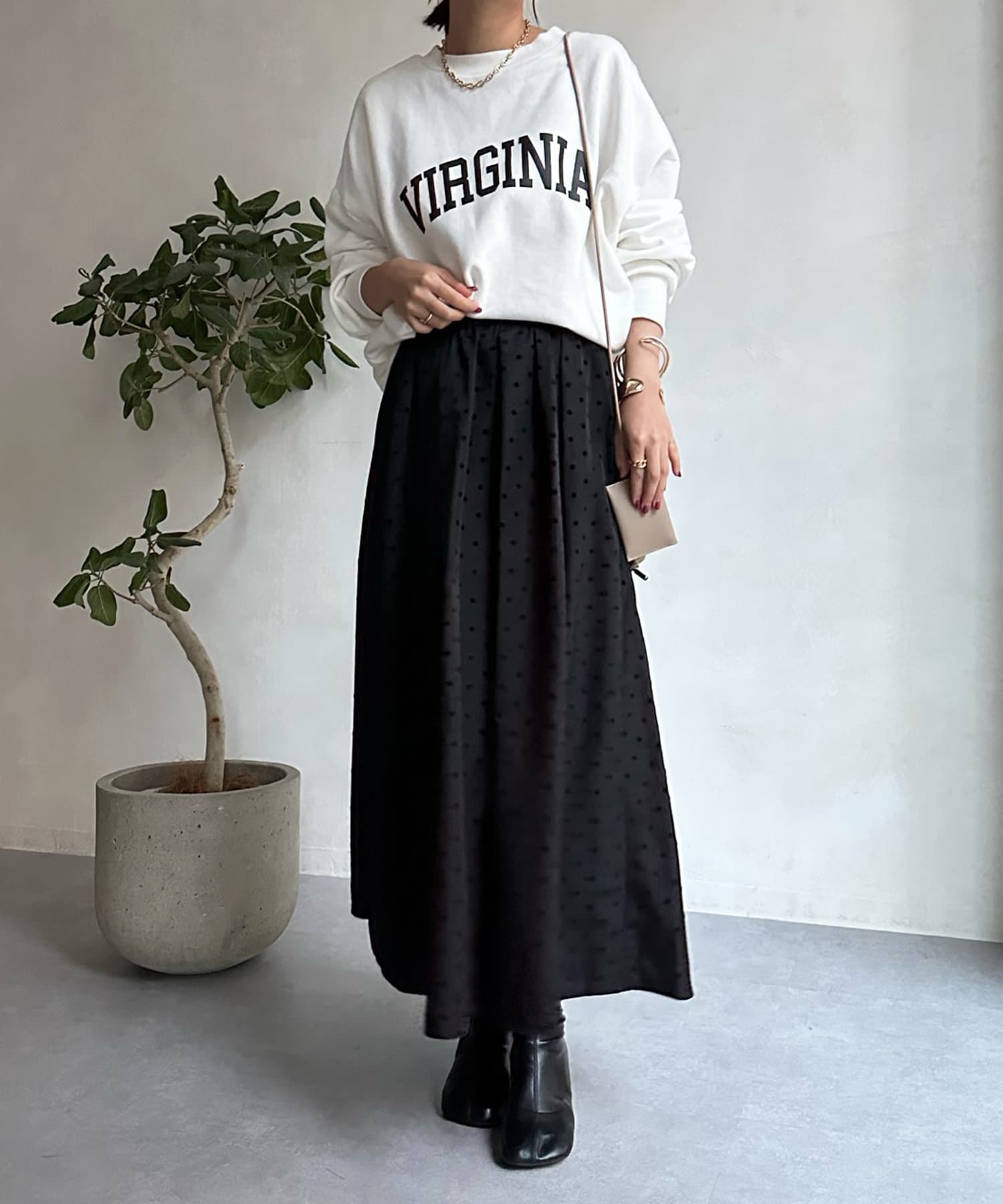 スウェットなどと合わせてカジュアルに、また、きれいめなアイテムと合わせてちょっとしたお食事会なども。合わせるアイテム次第で、幅広いシーンに対応可能なアイテムです。