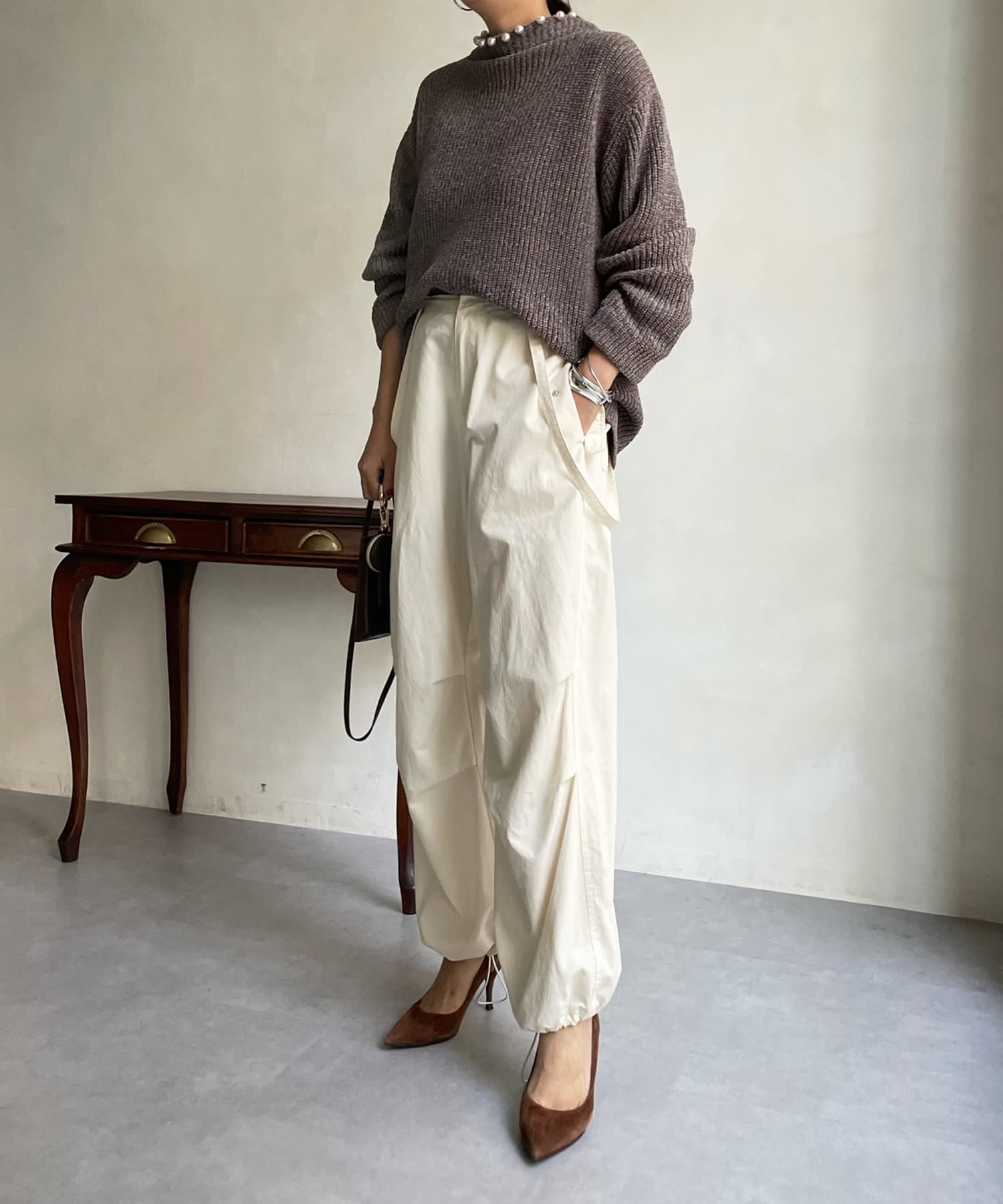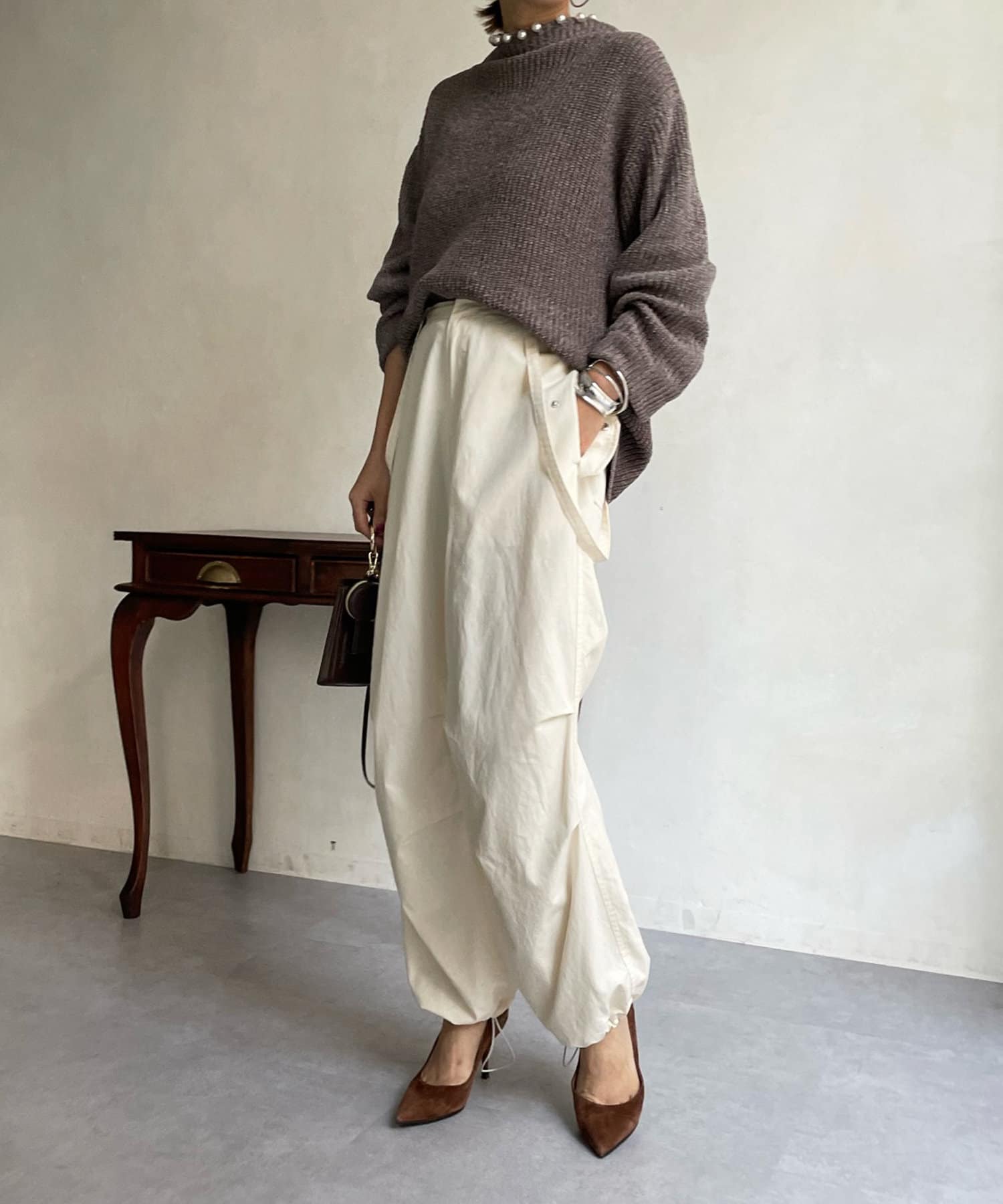 スタンドネックにあしらったパールのパーツが、お顔周りを華やかに見せてくれるアクセントとなってくれます。